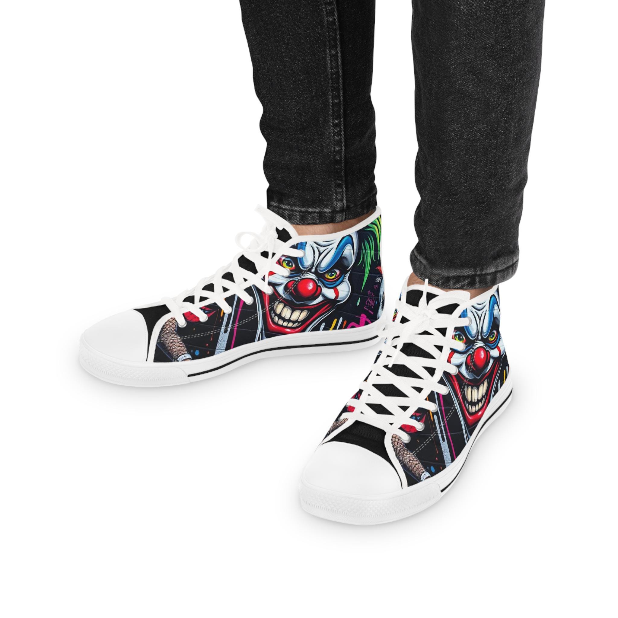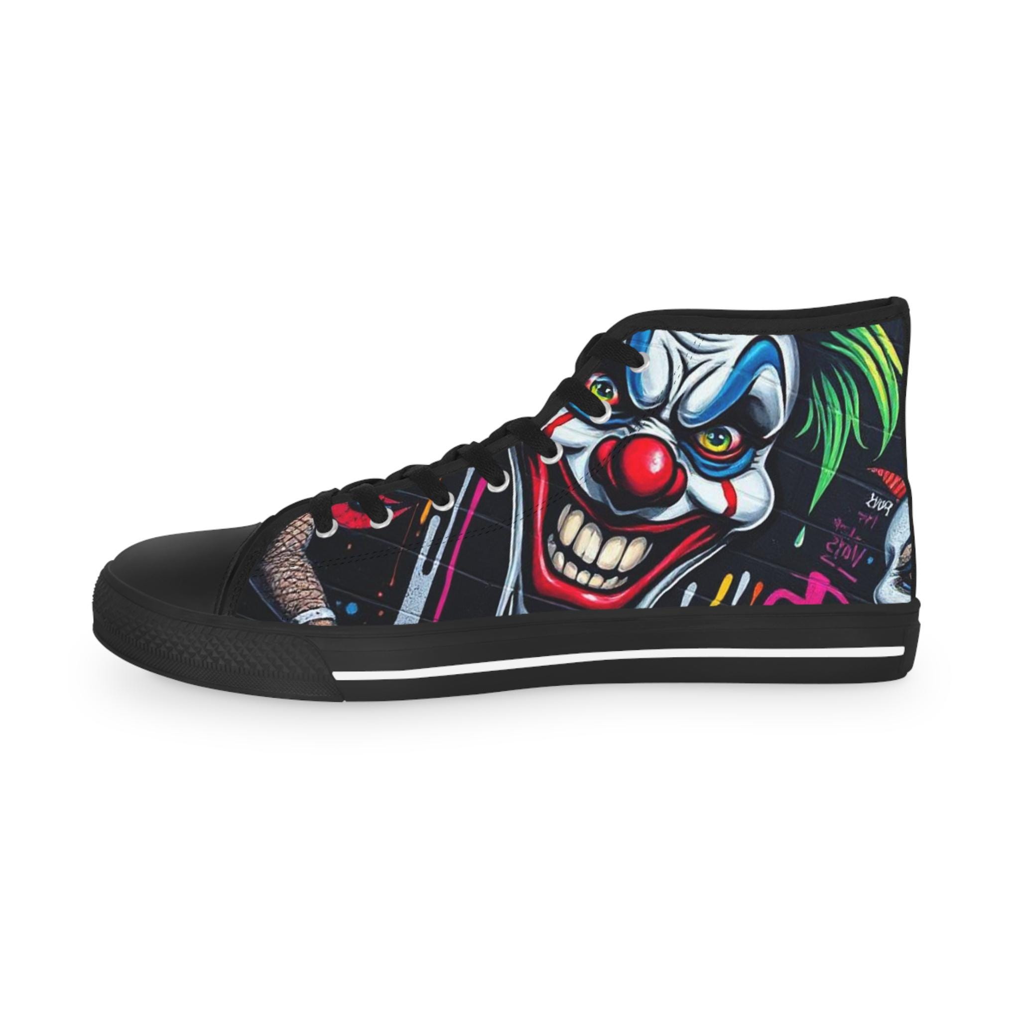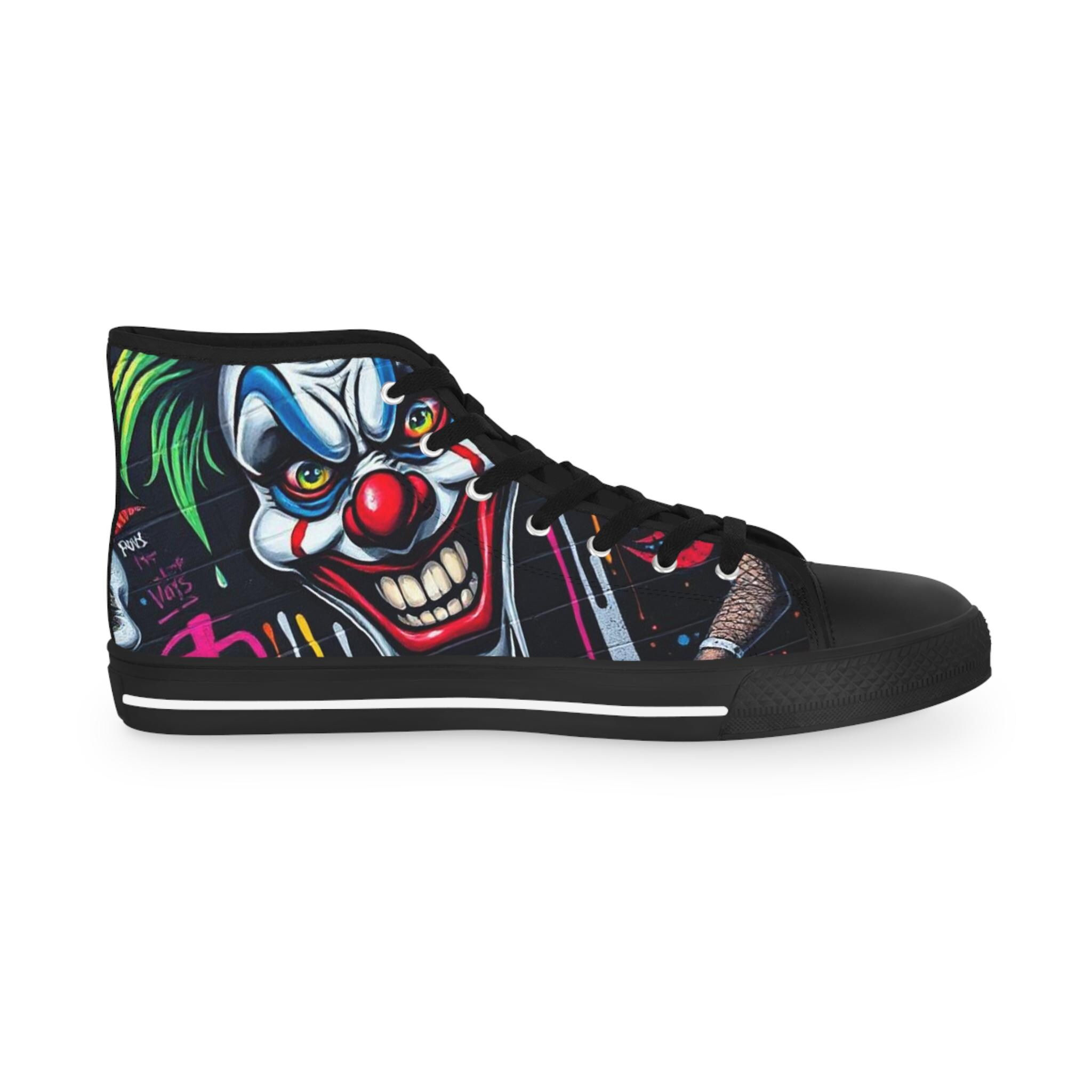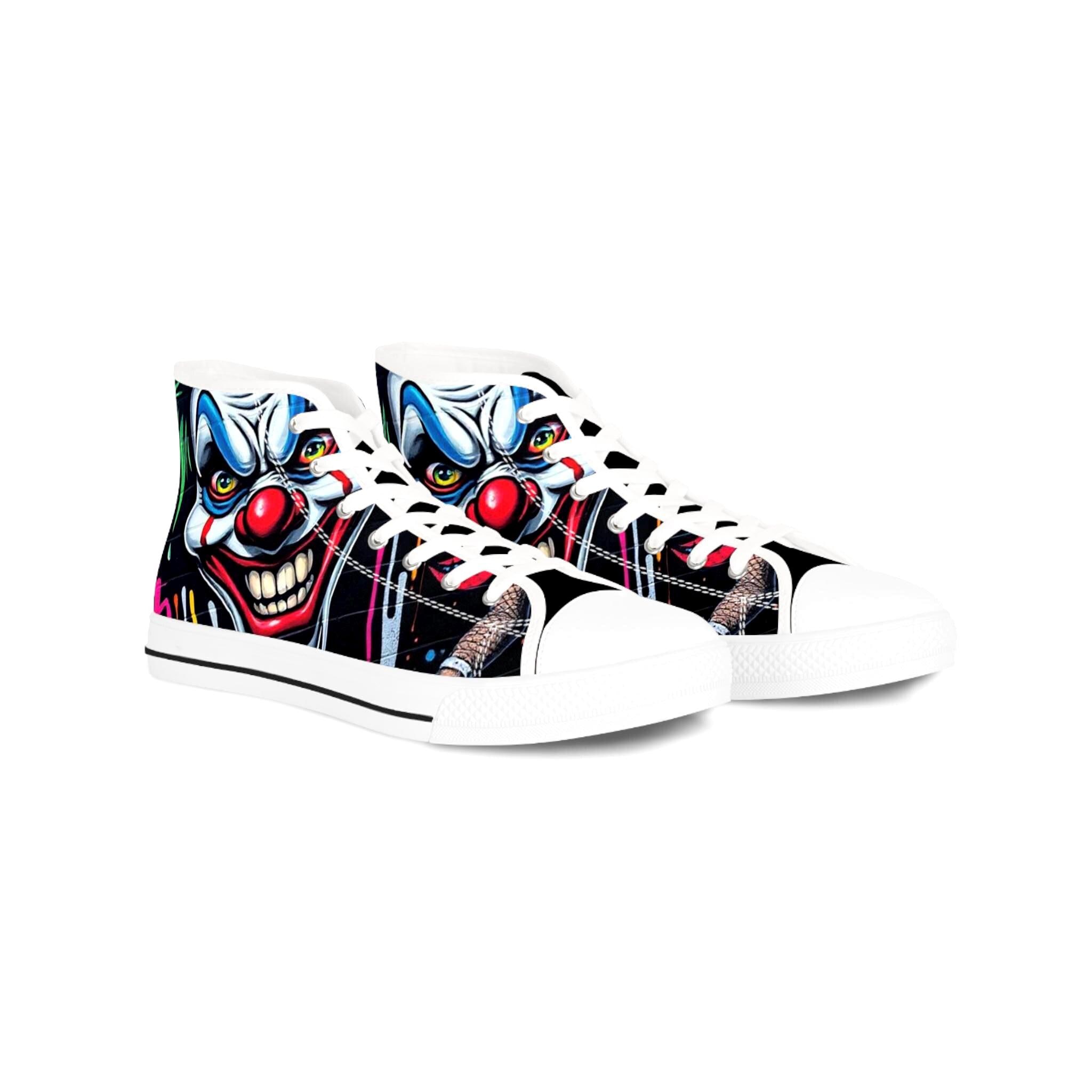 These high-top sneakers bring bold, in-your-face flair to every step. The full-wrap design features a menacing clown face rendered in vivid color—sharp blues, blood-red accents, and shadowed details that peek from the sides and tongue. Built on a breathable polyester canvas with PU leather trims and a pleather toe cap, they balance striking street style with durable construction. EVA memory-foam insoles cushion and absorb shock, while a sturdy rubber outsole keeps traction steady. Metal eyelets and a classic lace-up profile add a familiar, tough look that complements the edgy artwork. Wear them to stand out at late-night shows, skate sessions, or when you want your footwear to do the talking.