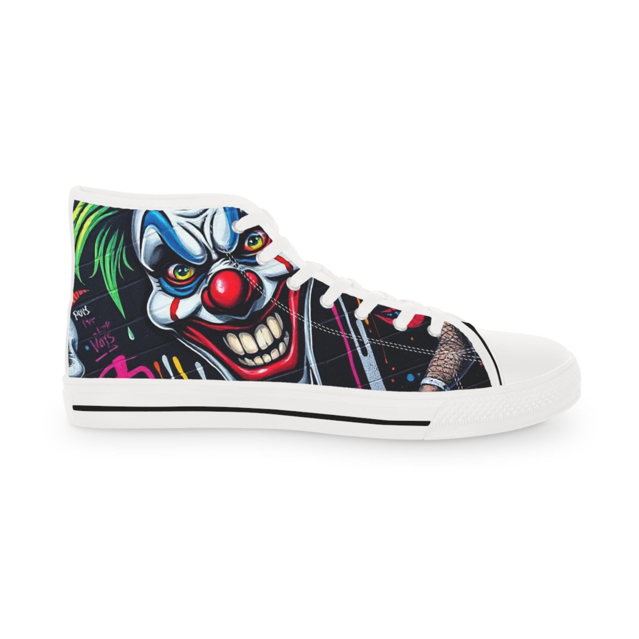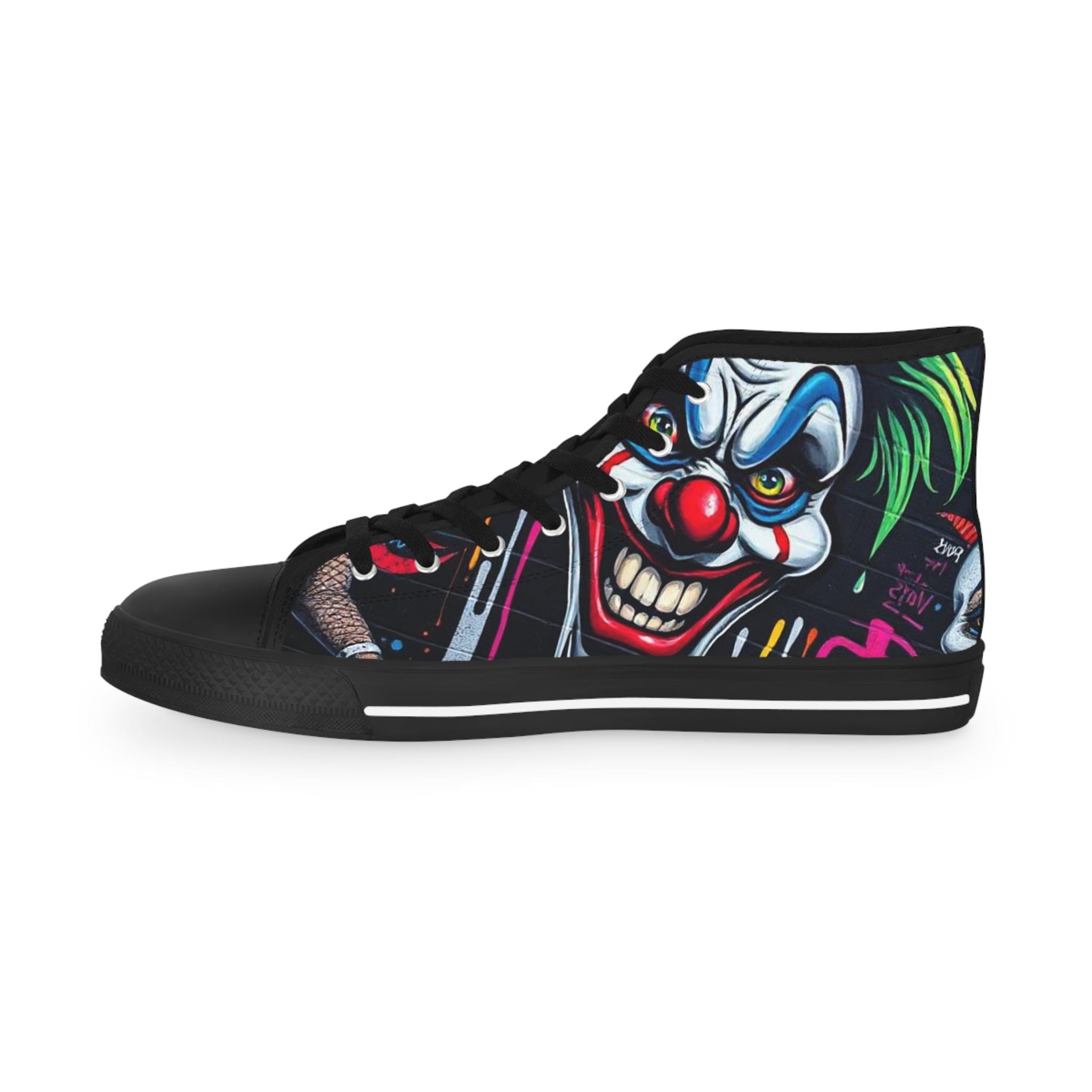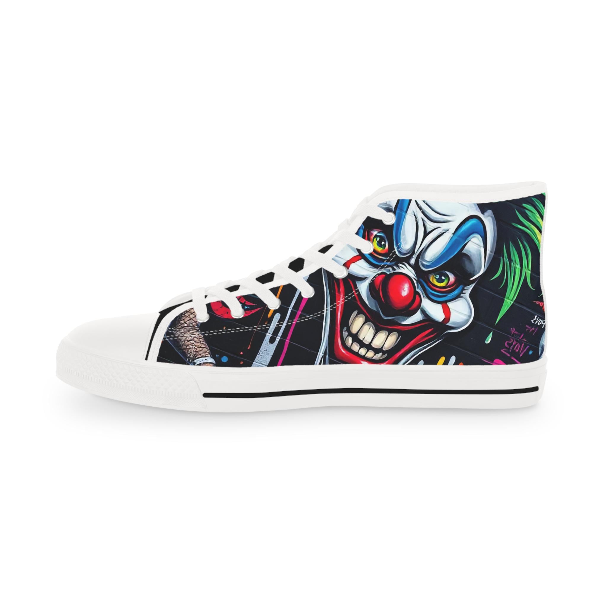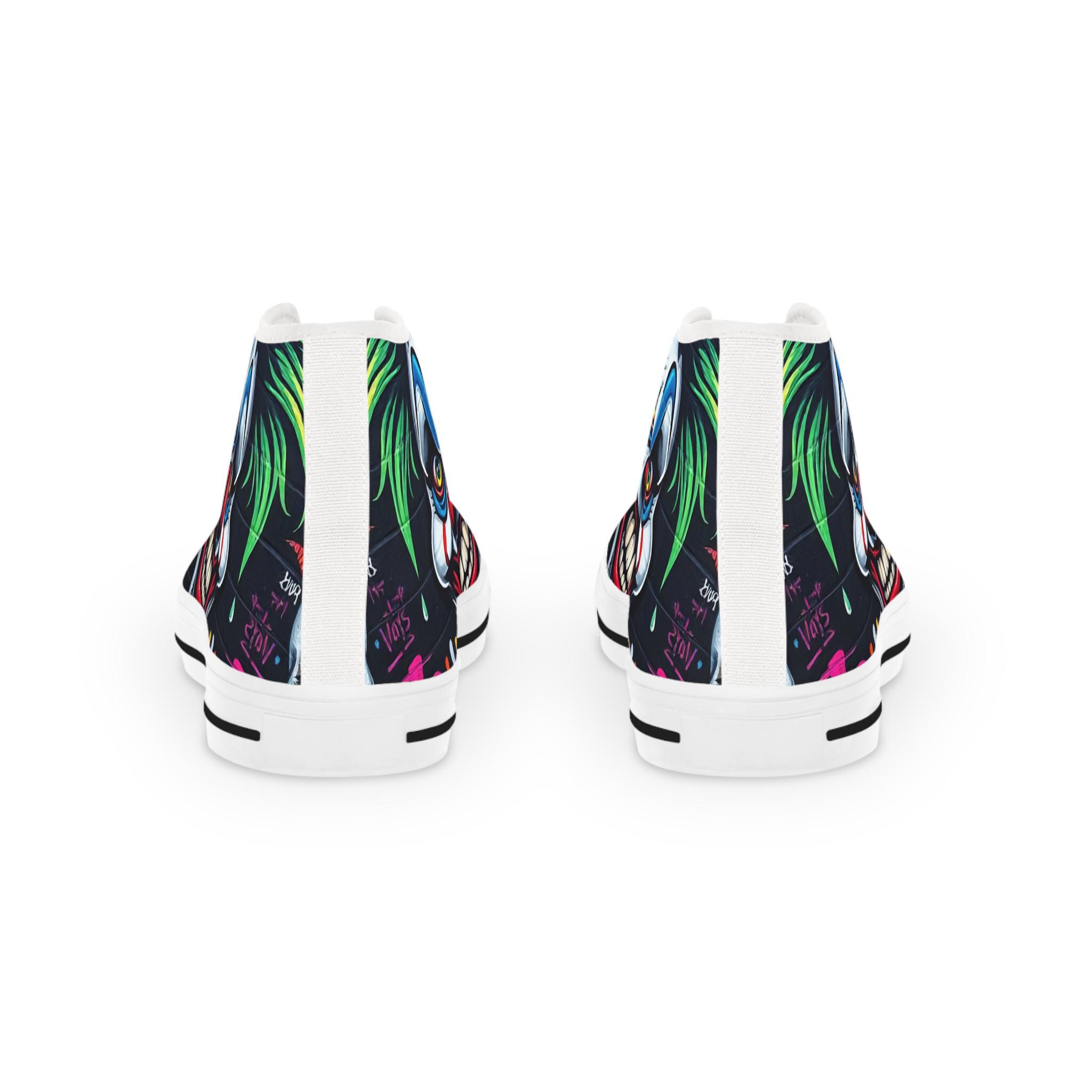 These high-top sneakers bring bold, in-your-face flair to every step. The full-wrap design features a menacing clown face rendered in vivid color—sharp blues, blood-red accents, and shadowed details that peek from the sides and tongue. Built on a breathable polyester canvas with PU leather trims and a pleather toe cap, they balance striking street style with durable construction. EVA memory-foam insoles cushion and absorb shock, while a sturdy rubber outsole keeps traction steady. Metal eyelets and a classic lace-up profile add a familiar, tough look that complements the edgy artwork. Wear them to stand out at late-night shows, skate sessions, or when you want your footwear to do the talking.