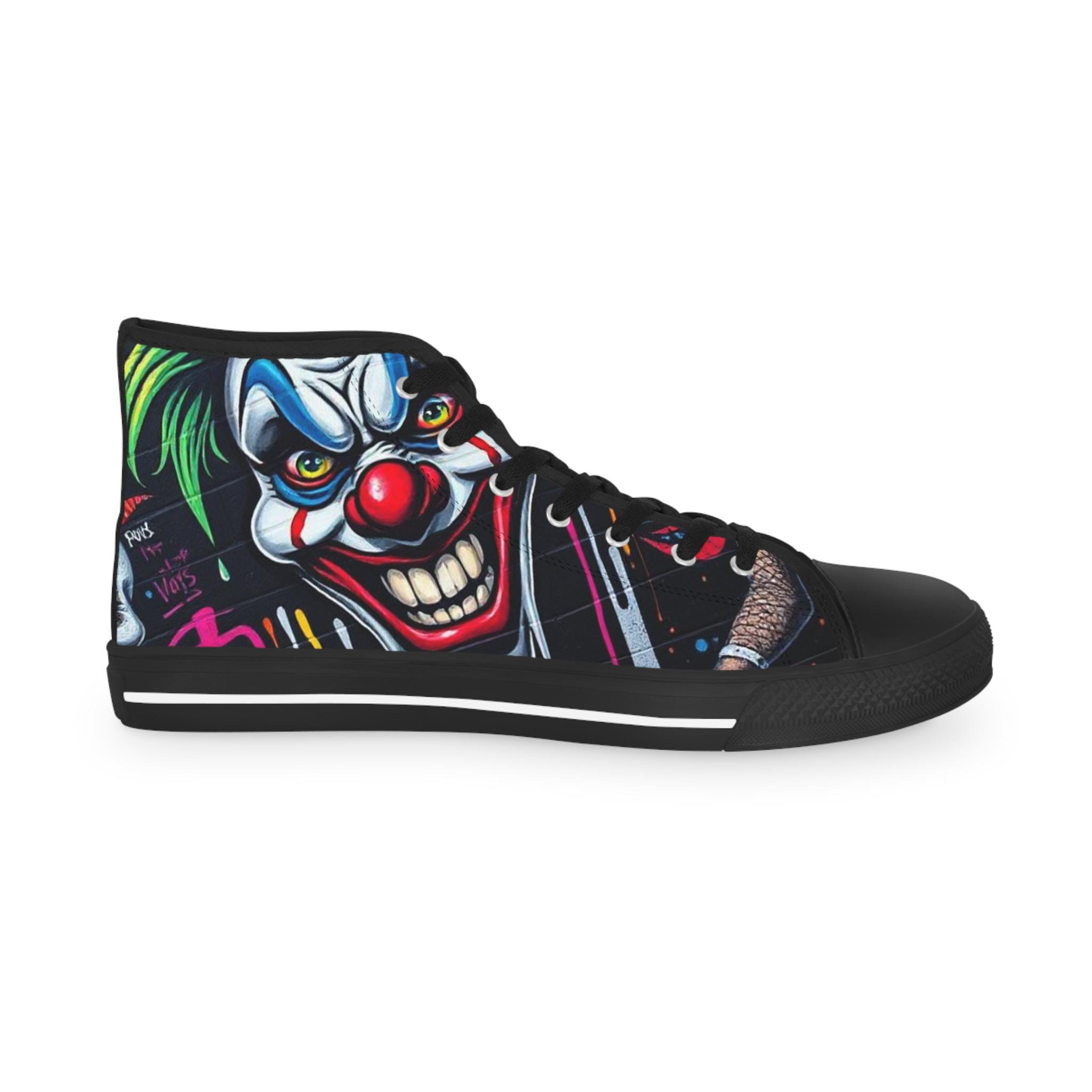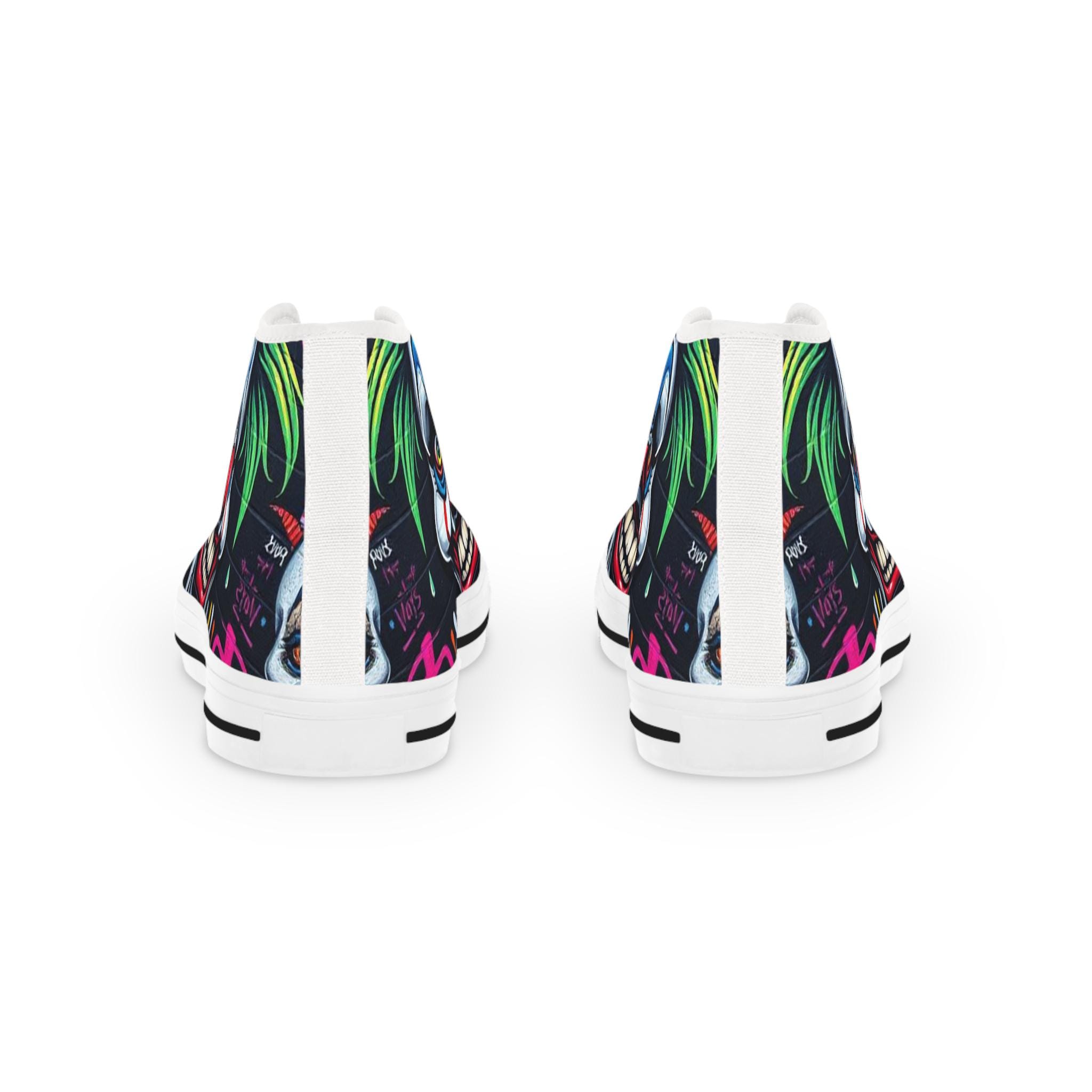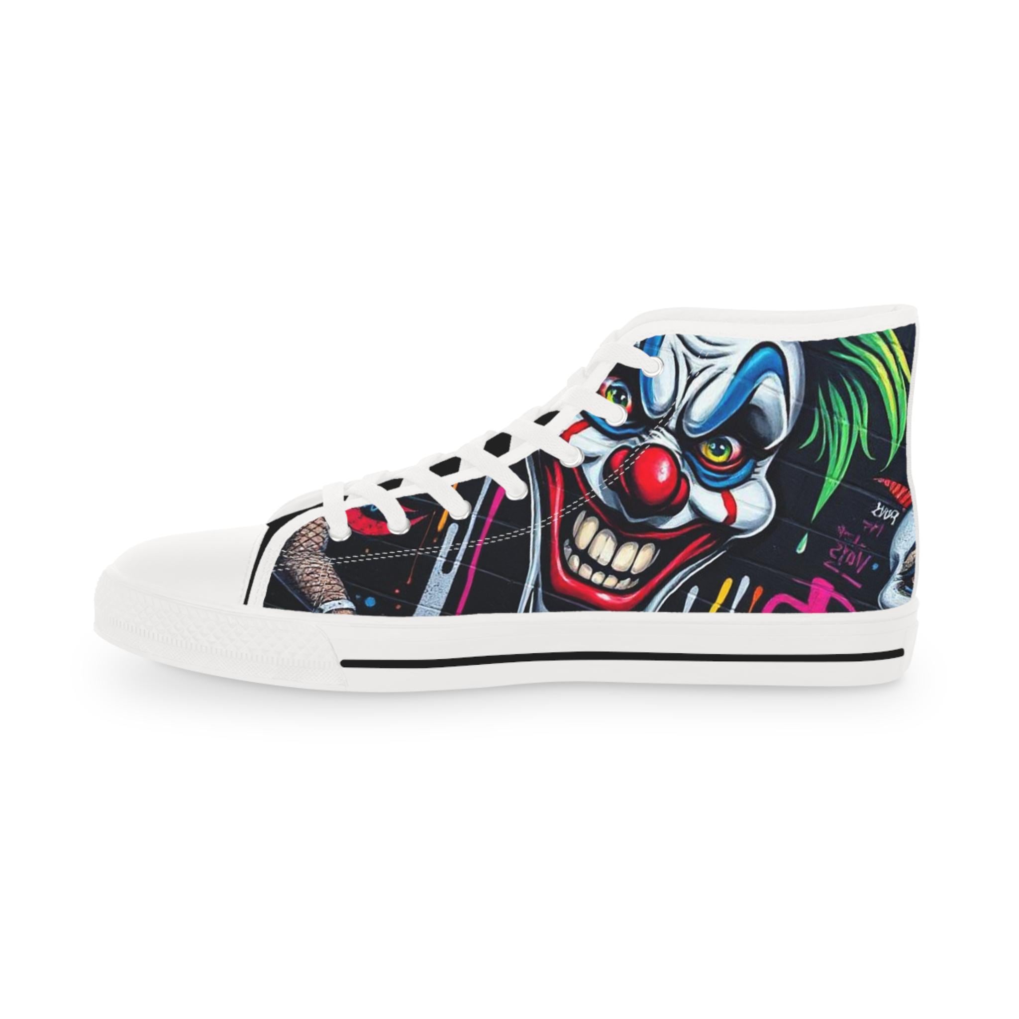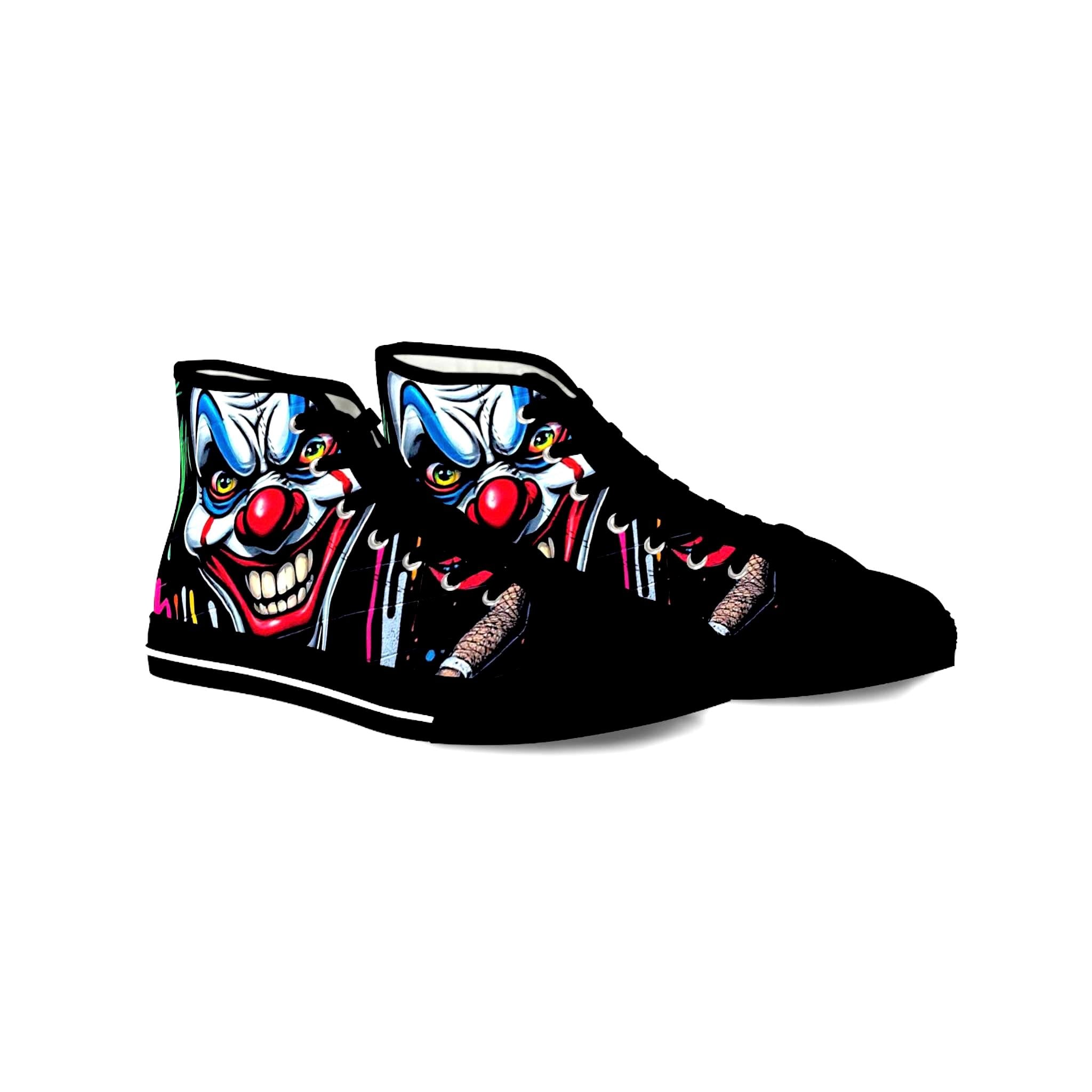 These high-top sneakers bring bold, in-your-face flair to every step. The full-wrap design features a menacing clown face rendered in vivid color—sharp blues, blood-red accents, and shadowed details that peek from the sides and tongue. Built on a breathable polyester canvas with PU leather trims and a pleather toe cap, they balance striking street style with durable construction. EVA memory-foam insoles cushion and absorb shock, while a sturdy rubber outsole keeps traction steady. Metal eyelets and a classic lace-up profile add a familiar, tough look that complements the edgy artwork. Wear them to stand out at late-night shows, skate sessions, or when you want your footwear to do the talking.
