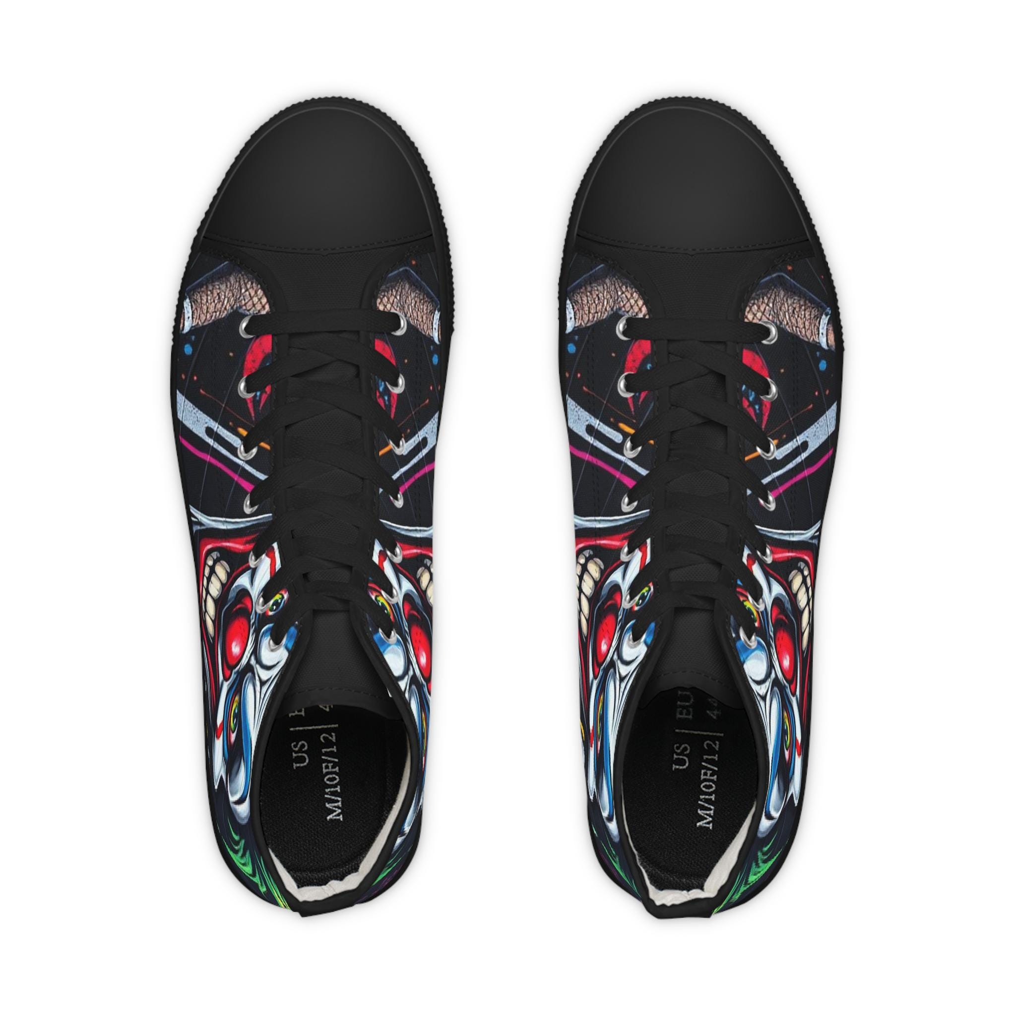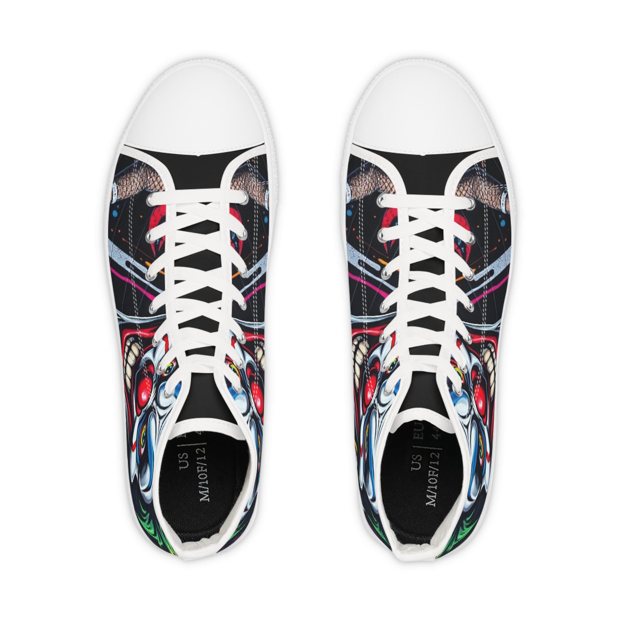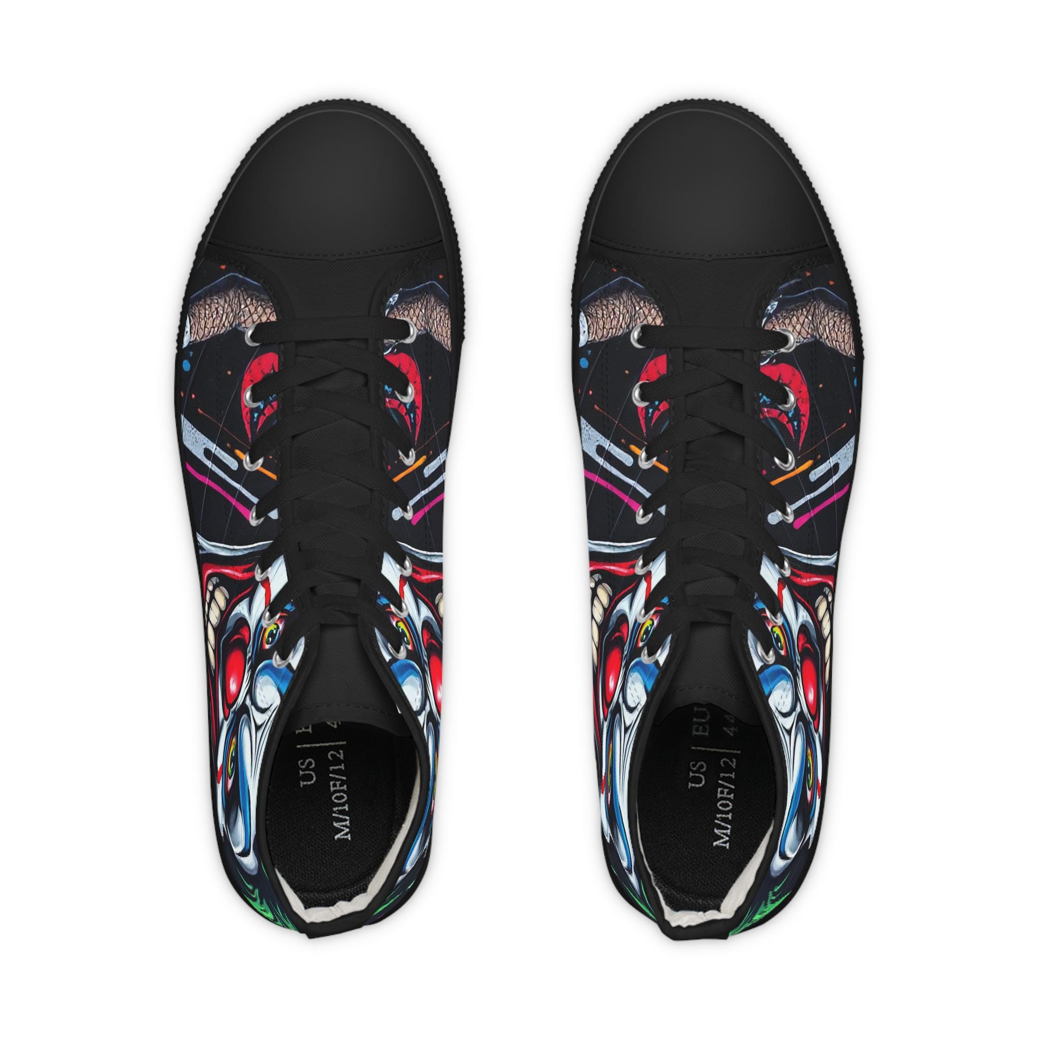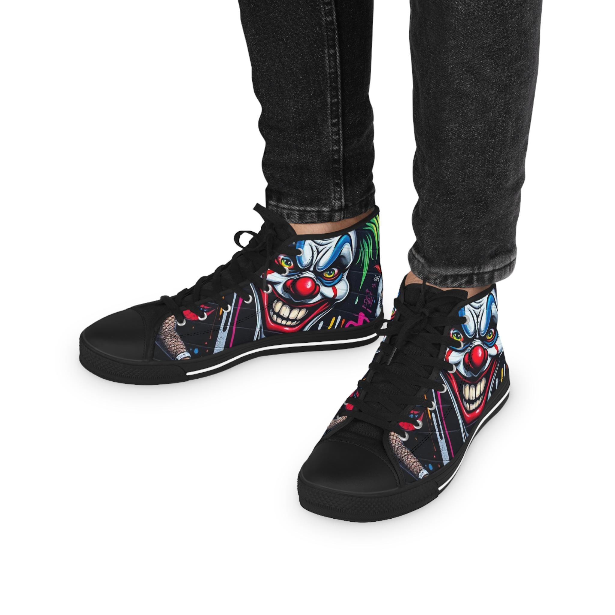 These high-top sneakers bring bold, in-your-face flair to every step. The full-wrap design features a menacing clown face rendered in vivid color—sharp blues, blood-red accents, and shadowed details that peek from the sides and tongue. Built on a breathable polyester canvas with PU leather trims and a pleather toe cap, they balance striking street style with durable construction. EVA memory-foam insoles cushion and absorb shock, while a sturdy rubber outsole keeps traction steady. Metal eyelets and a classic lace-up profile add a familiar, tough look that complements the edgy artwork. Wear them to stand out at late-night shows, skate sessions, or when you want your footwear to do the talking.