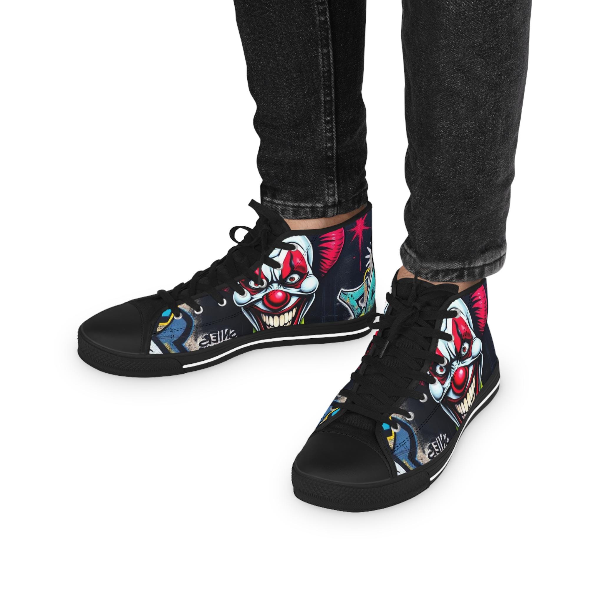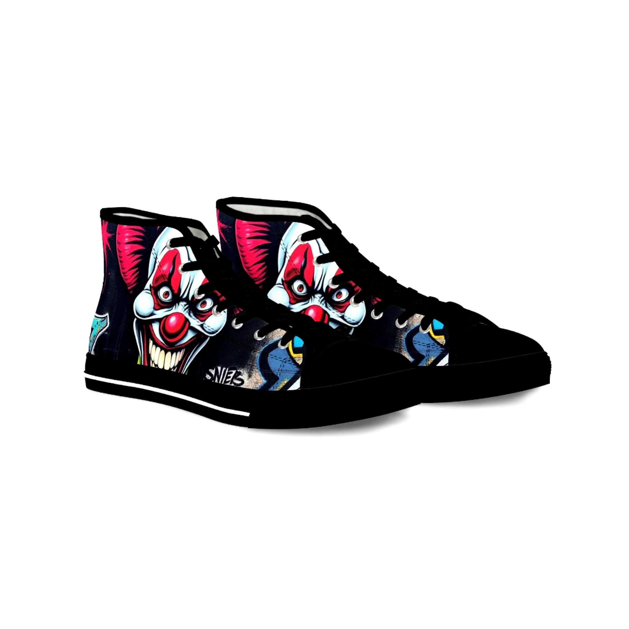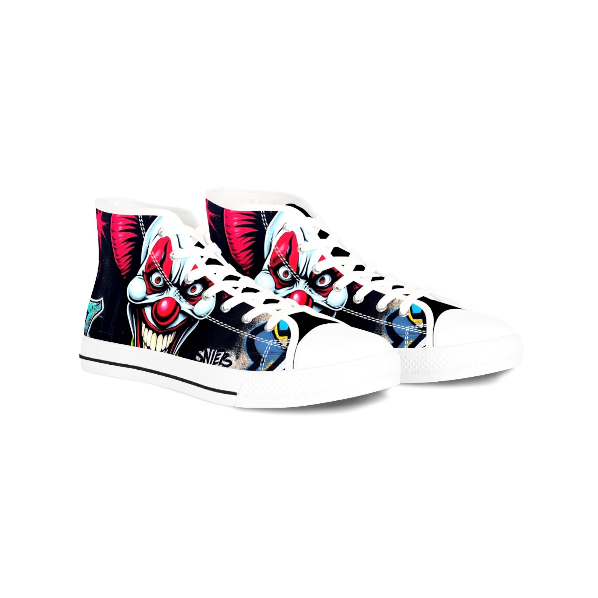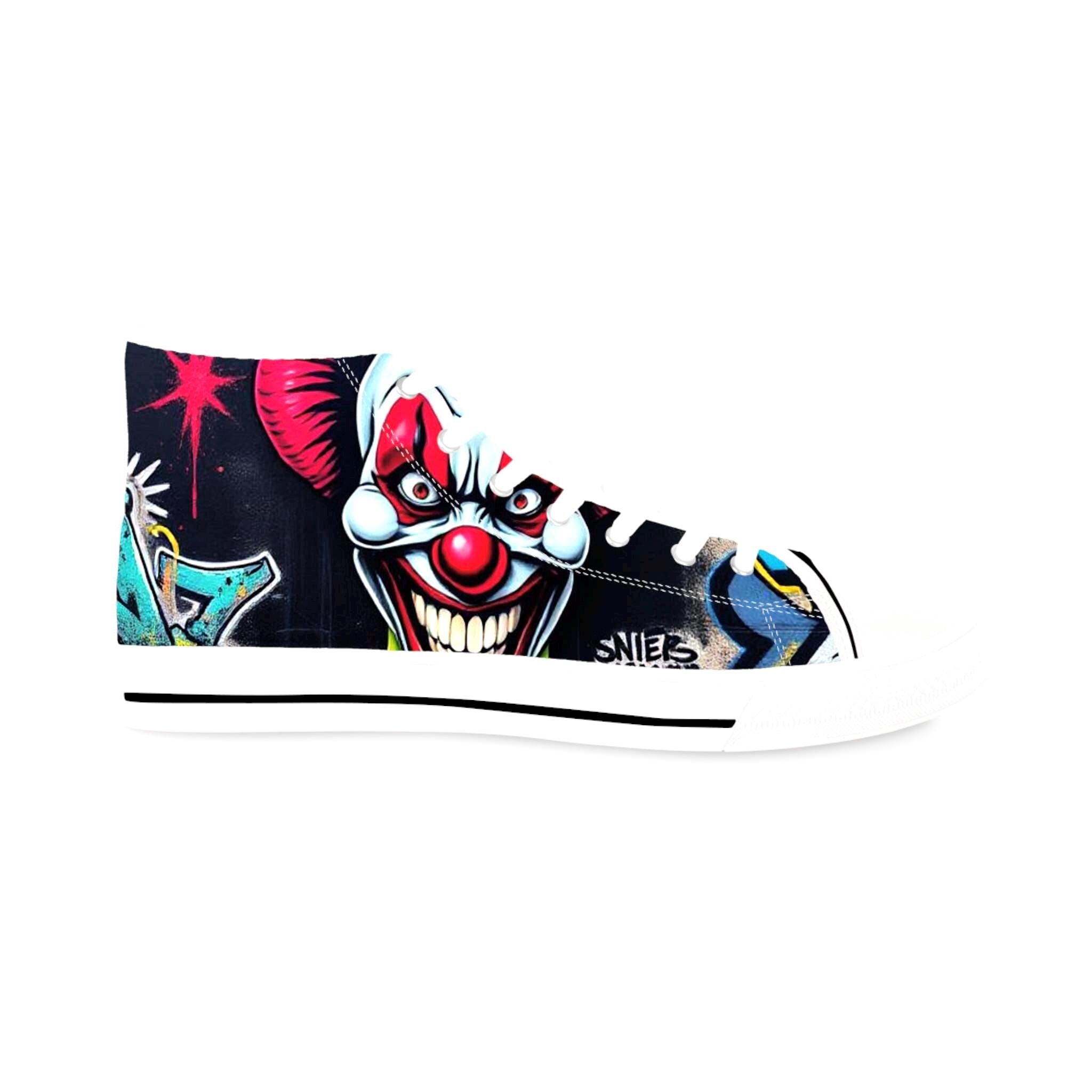 These high-top sneakers bring bold street energy to every step. The wraparound graphic features a sinister, detailed clown illustration in deep blacks, reds, and cool blues — a look that reads equal parts punk and carnival night. Built on a lightweight polyester canvas with PU accents and a pleather toe cap, they balance edgy style with practical reinforcement where it counts. Cushioned EVA memory-foam insoles absorb shock on long days out, and a durable rubber outsole keeps the grip steady through crowded streets and late-night wanderings. Wear them with dark denim, a worn leather jacket, or layered festival looks to amplify a rebellious, art-driven vibe.