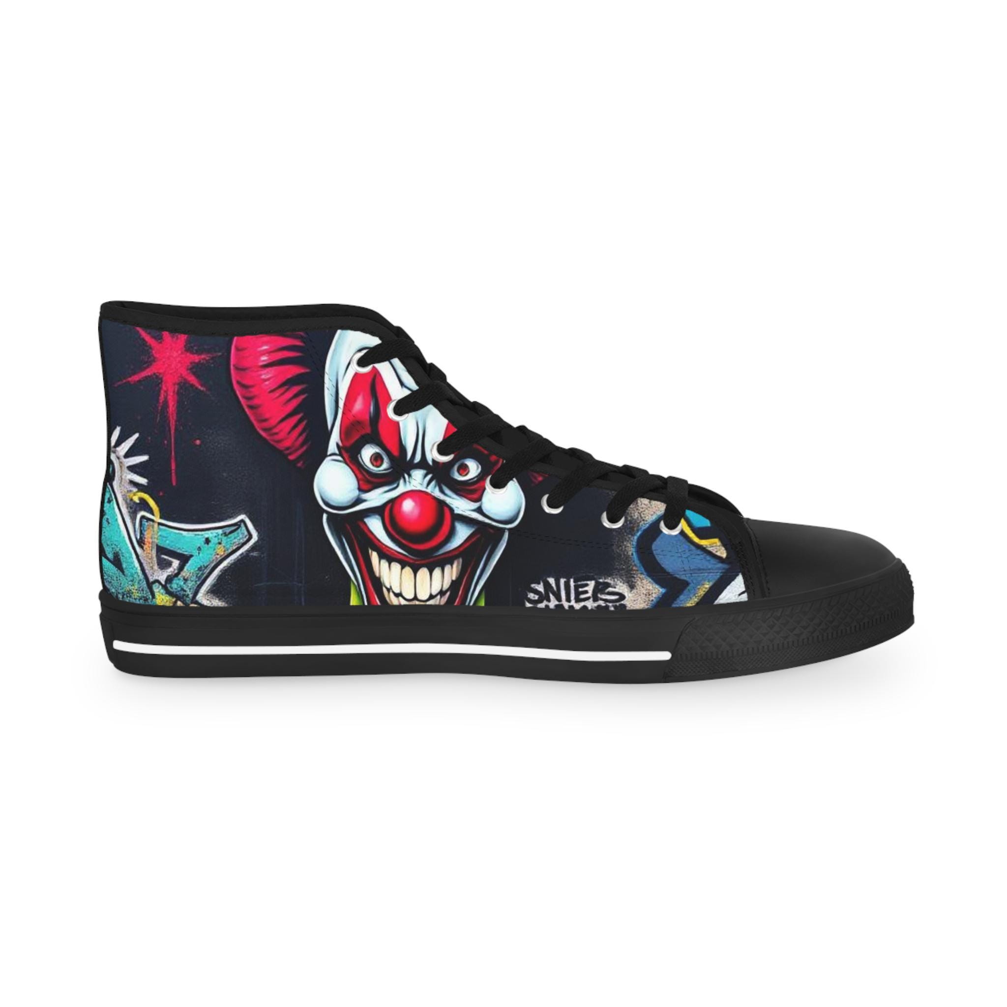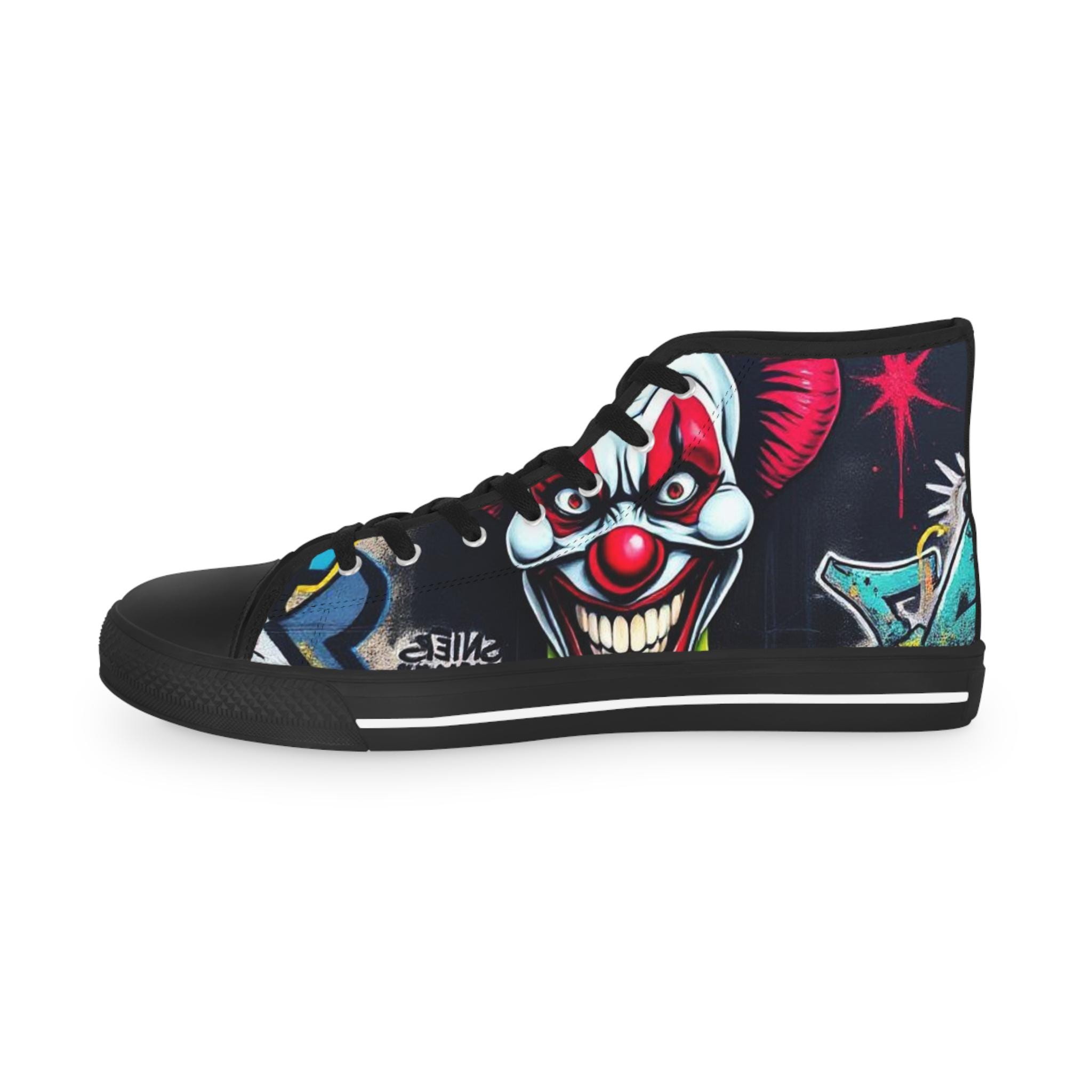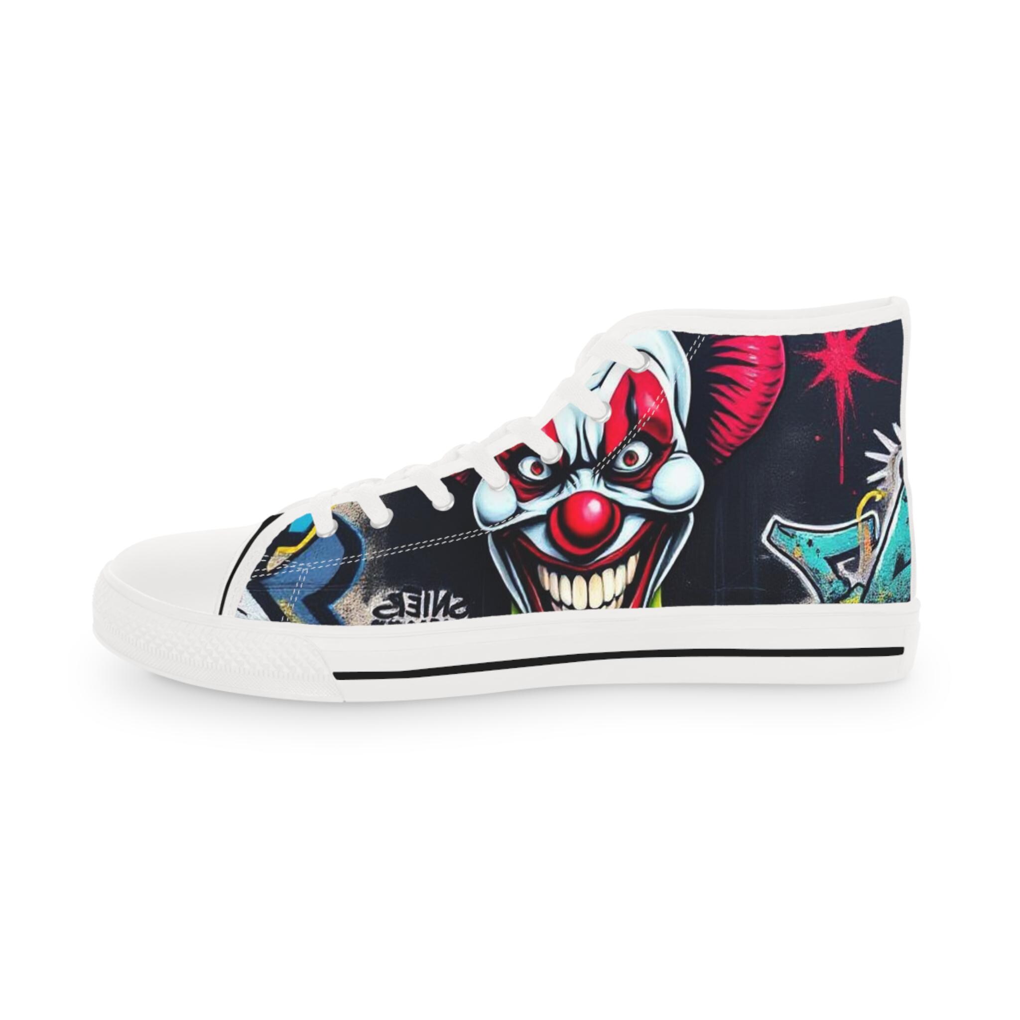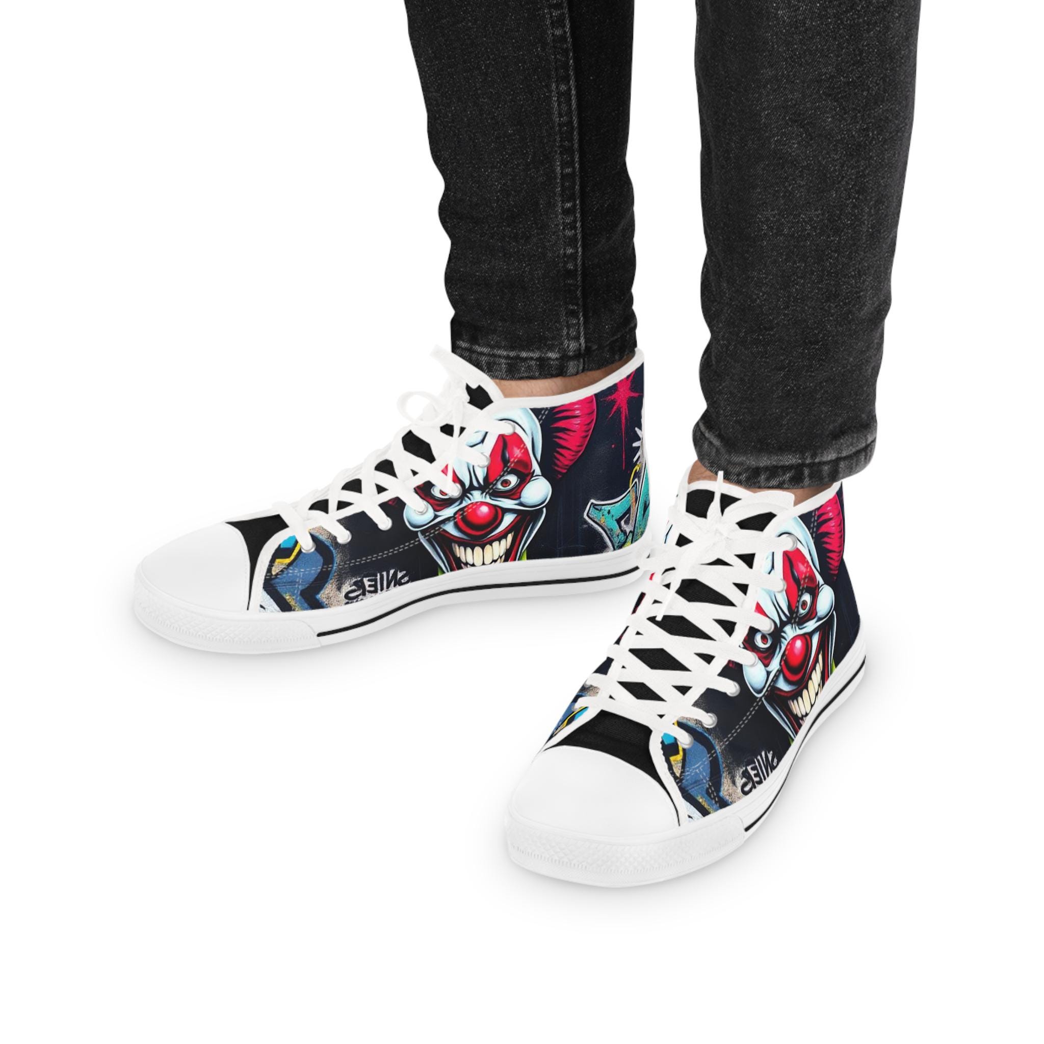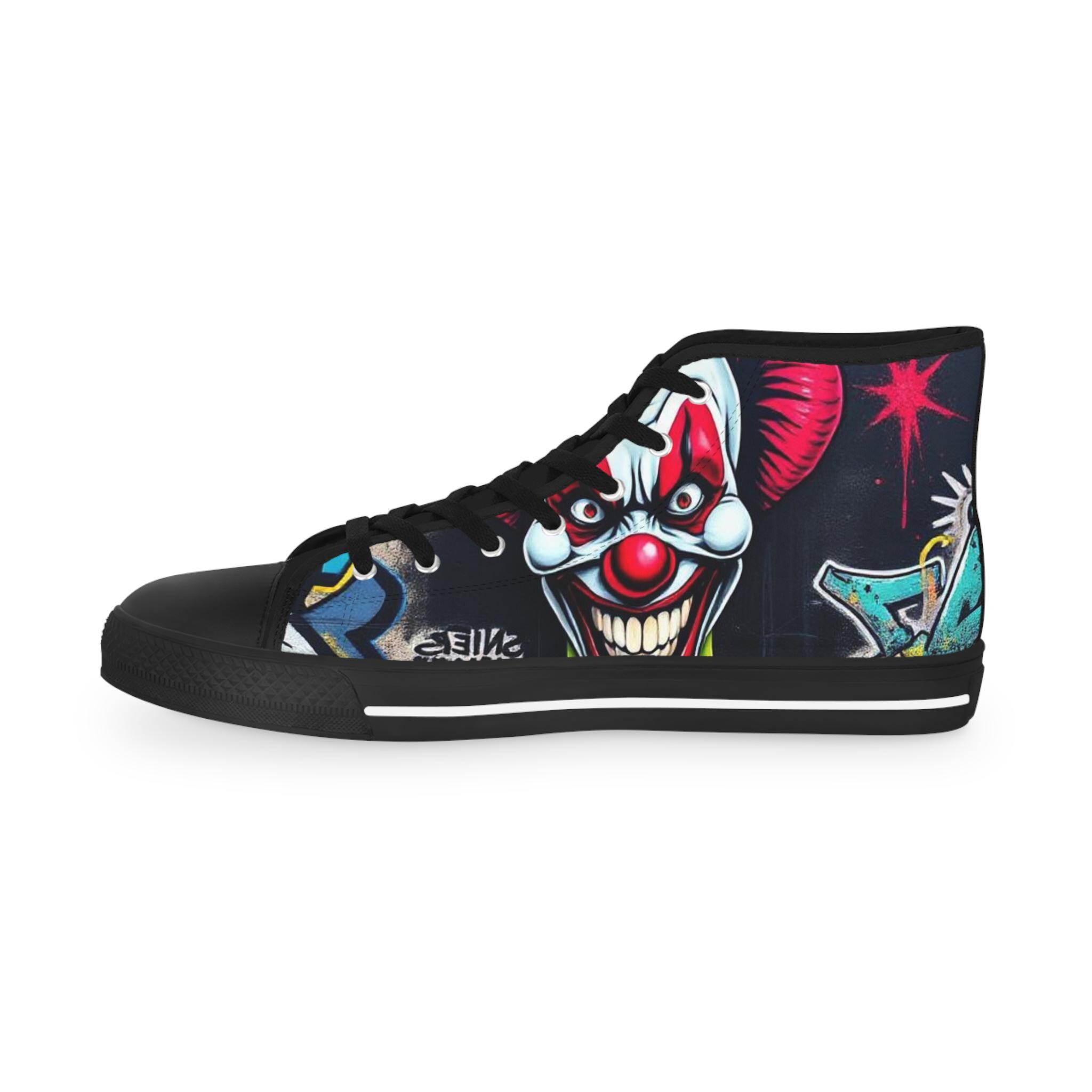 These high-top sneakers bring bold street energy to every step. The wraparound graphic features a sinister, detailed clown illustration in deep blacks, reds, and cool blues — a look that reads equal parts punk and carnival night. Built on a lightweight polyester canvas with PU accents and a pleather toe cap, they balance edgy style with practical reinforcement where it counts. Cushioned EVA memory-foam insoles absorb shock on long days out, and a durable rubber outsole keeps the grip steady through crowded streets and late-night wanderings. Wear them with dark denim, a worn leather jacket, or layered festival looks to amplify a rebellious, art-driven vibe.