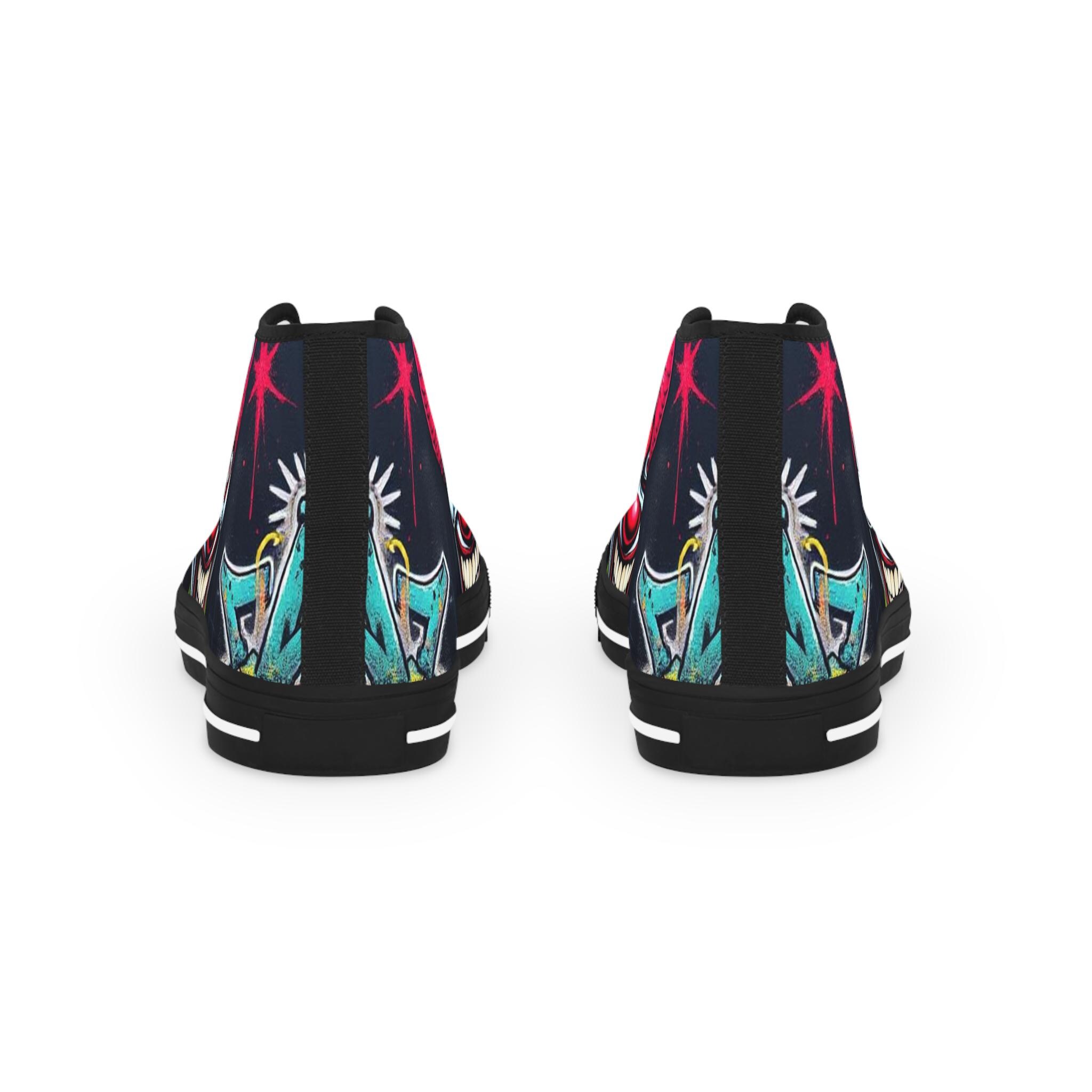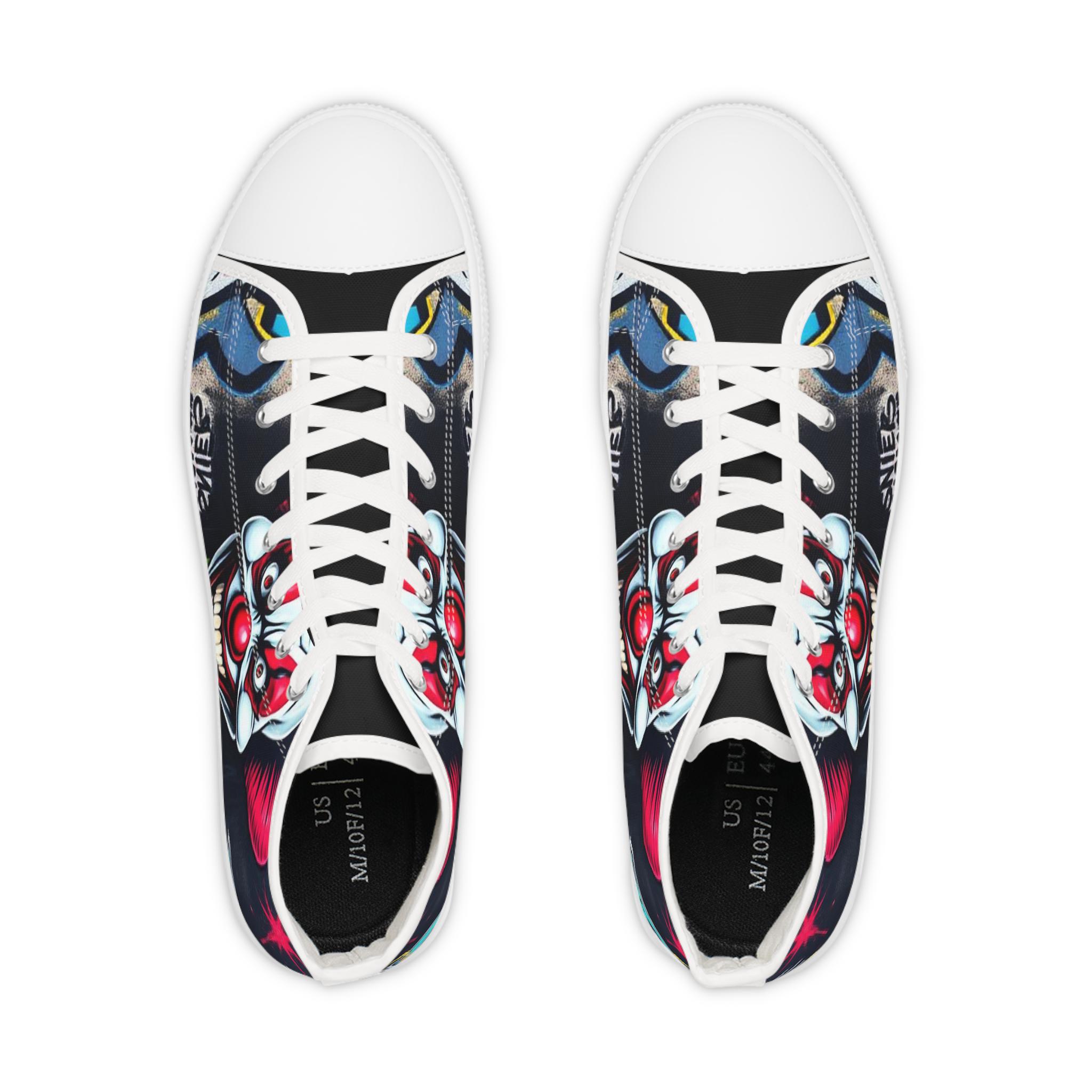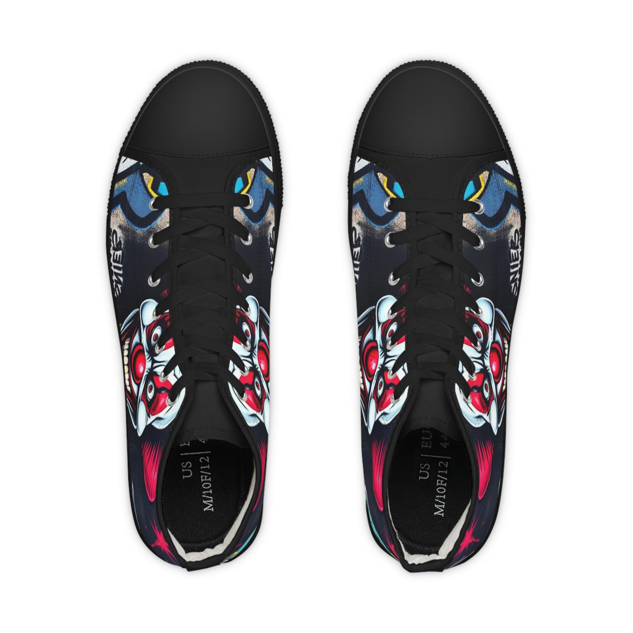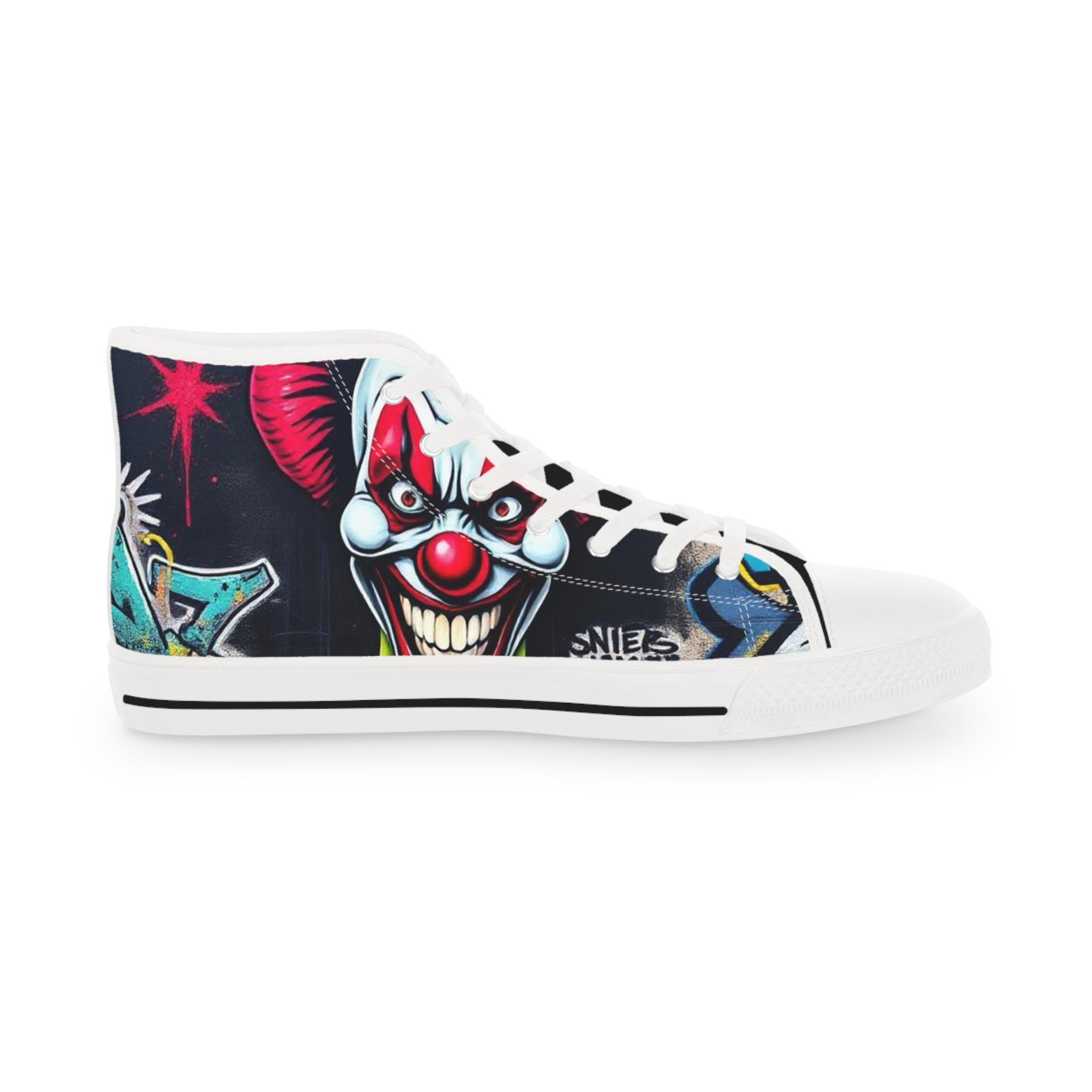 These high-top sneakers bring bold street energy to every step. The wraparound graphic features a sinister, detailed clown illustration in deep blacks, reds, and cool blues — a look that reads equal parts punk and carnival night. Built on a lightweight polyester canvas with PU accents and a pleather toe cap, they balance edgy style with practical reinforcement where it counts. Cushioned EVA memory-foam insoles absorb shock on long days out, and a durable rubber outsole keeps the grip steady through crowded streets and late-night wanderings. Wear them with dark denim, a worn leather jacket, or layered festival looks to amplify a rebellious, art-driven vibe.