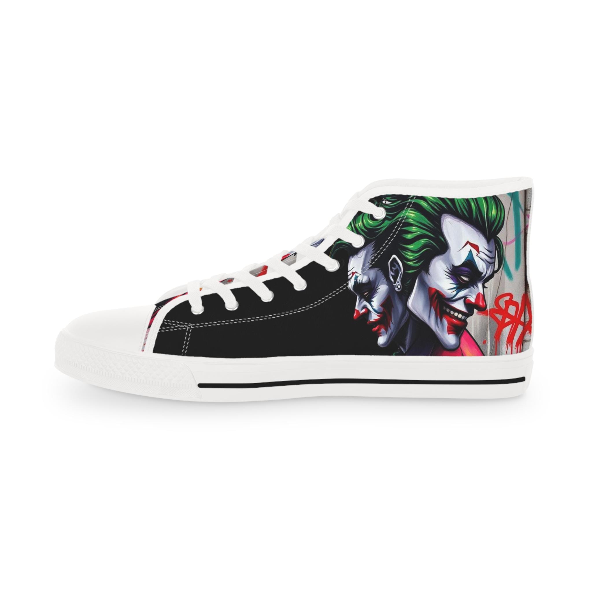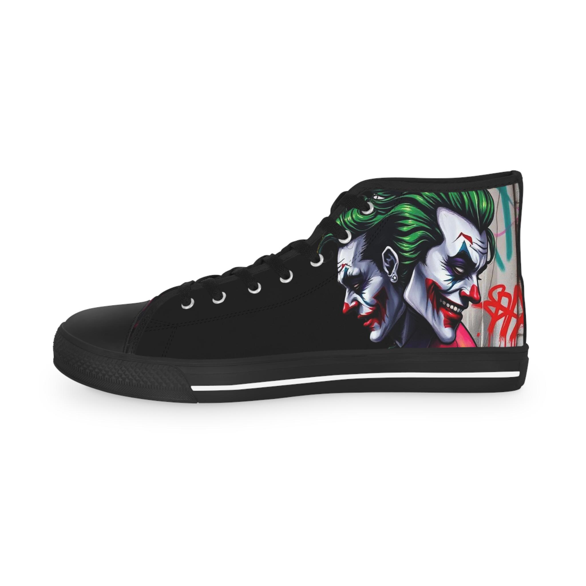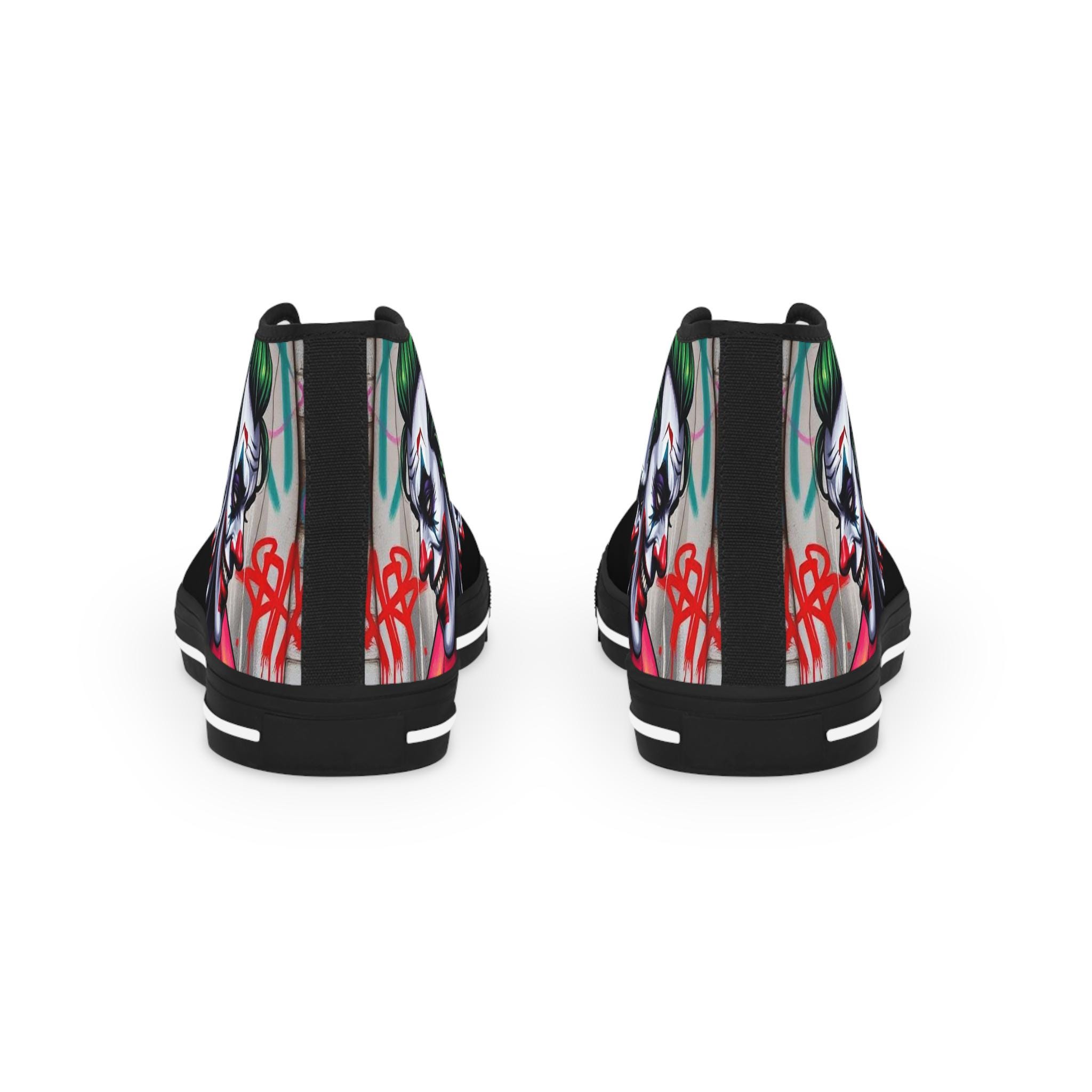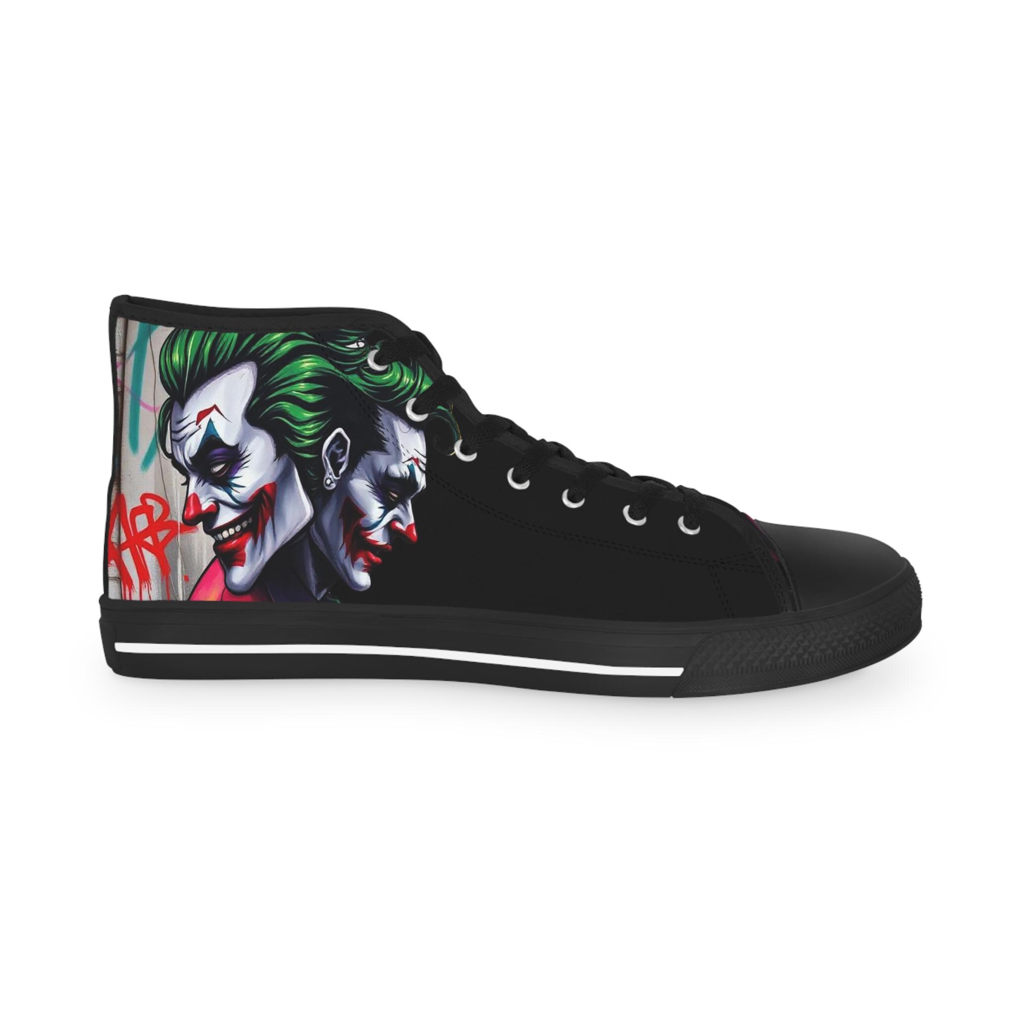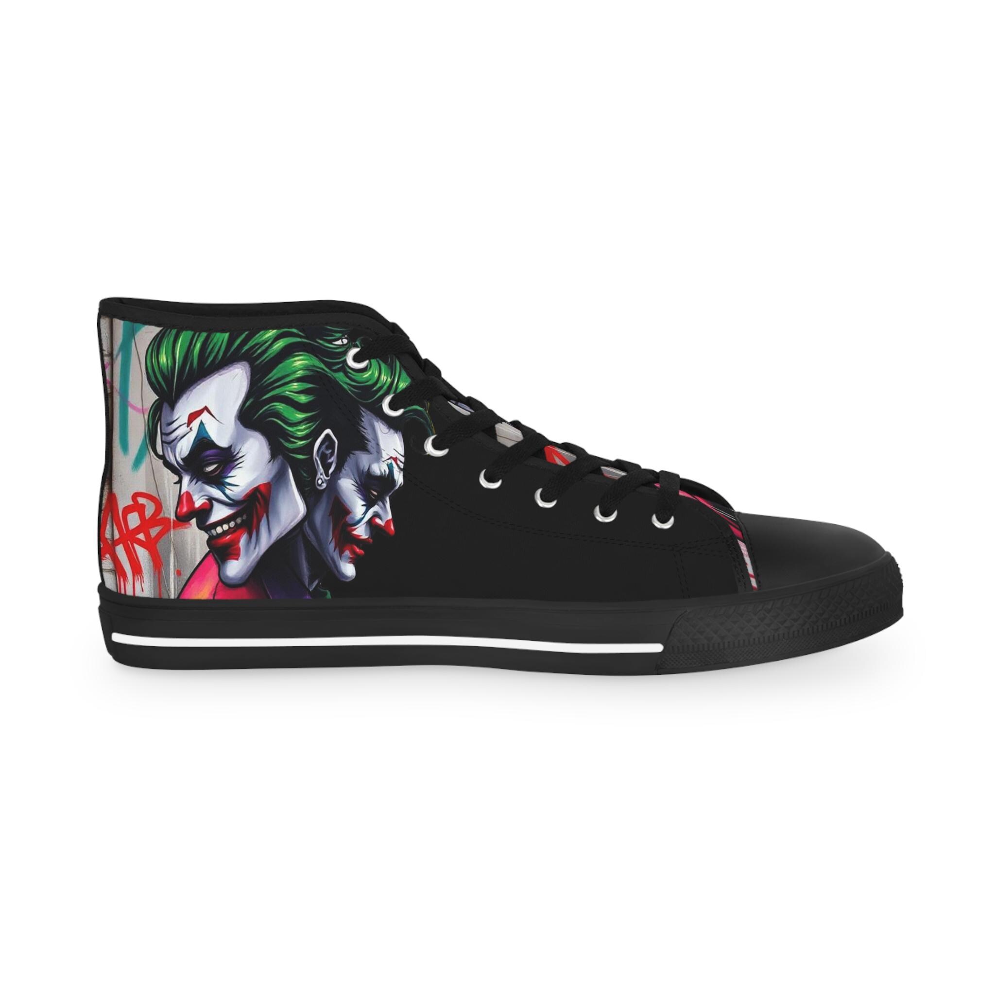 These high-top sneakers bring bold, streetwise energy to every step. The graphic wraparound print features a dark, theatrical character with vivid green hair and pale features, set against deep black panels and pops of magenta at the toe — a look that reads like comic-book mischief turned wearable. Built on a breathable polyester canvas with PU leather accents, they sit on lightweight EVA insoles with memory foam cushioning for shock absorption and lasting comfort. Metal eyelets, a pleather-covered toe cap, and a durable rubber outsole add toughness for everyday wear. Lace them up for nights out, convention floors, or when you want your footwear to do the talking.