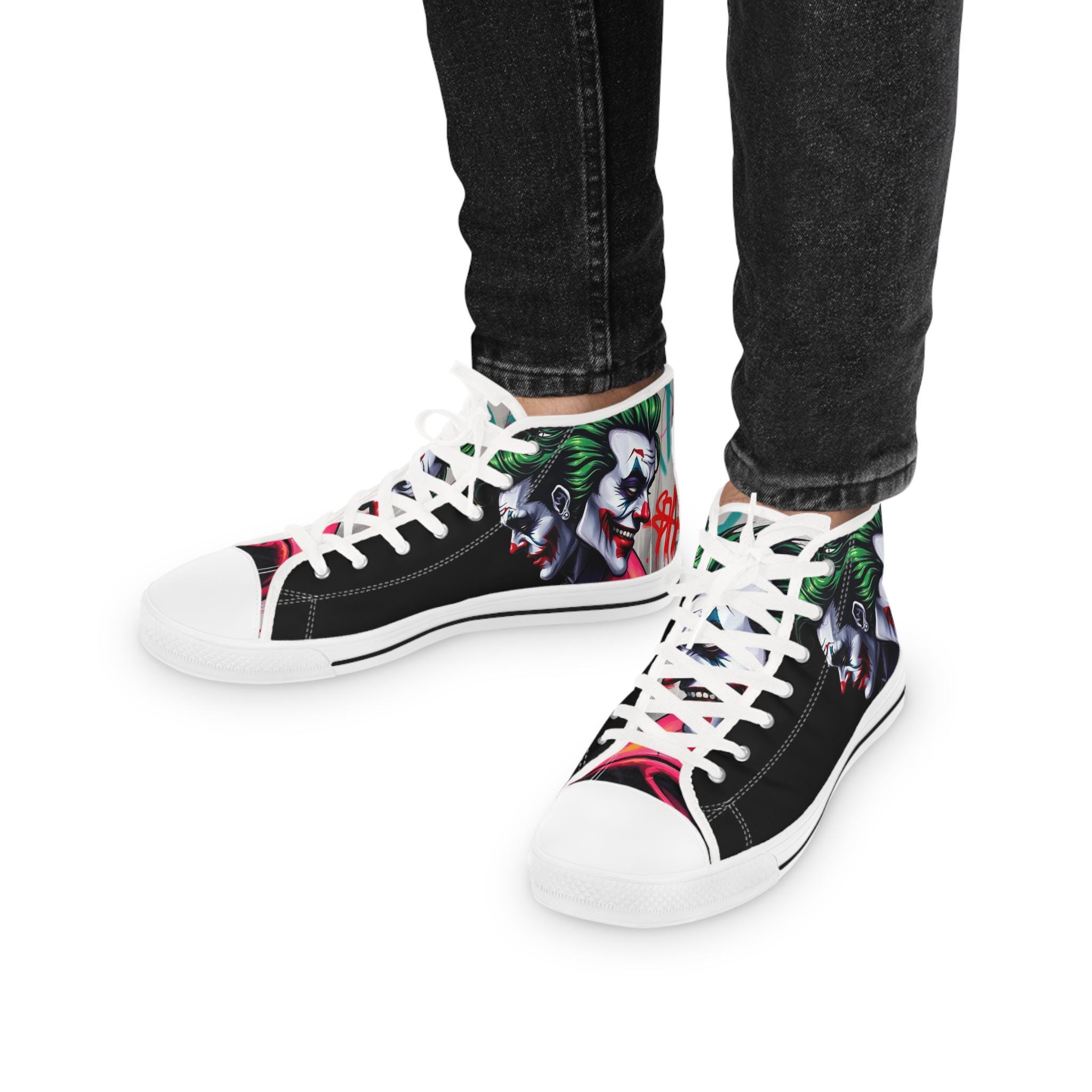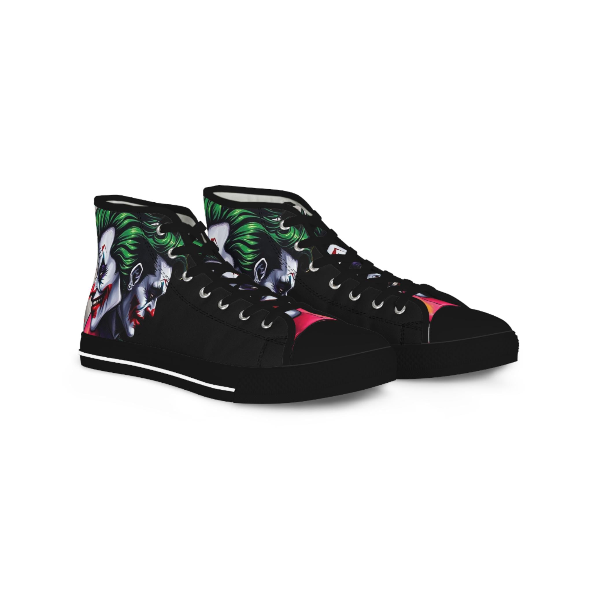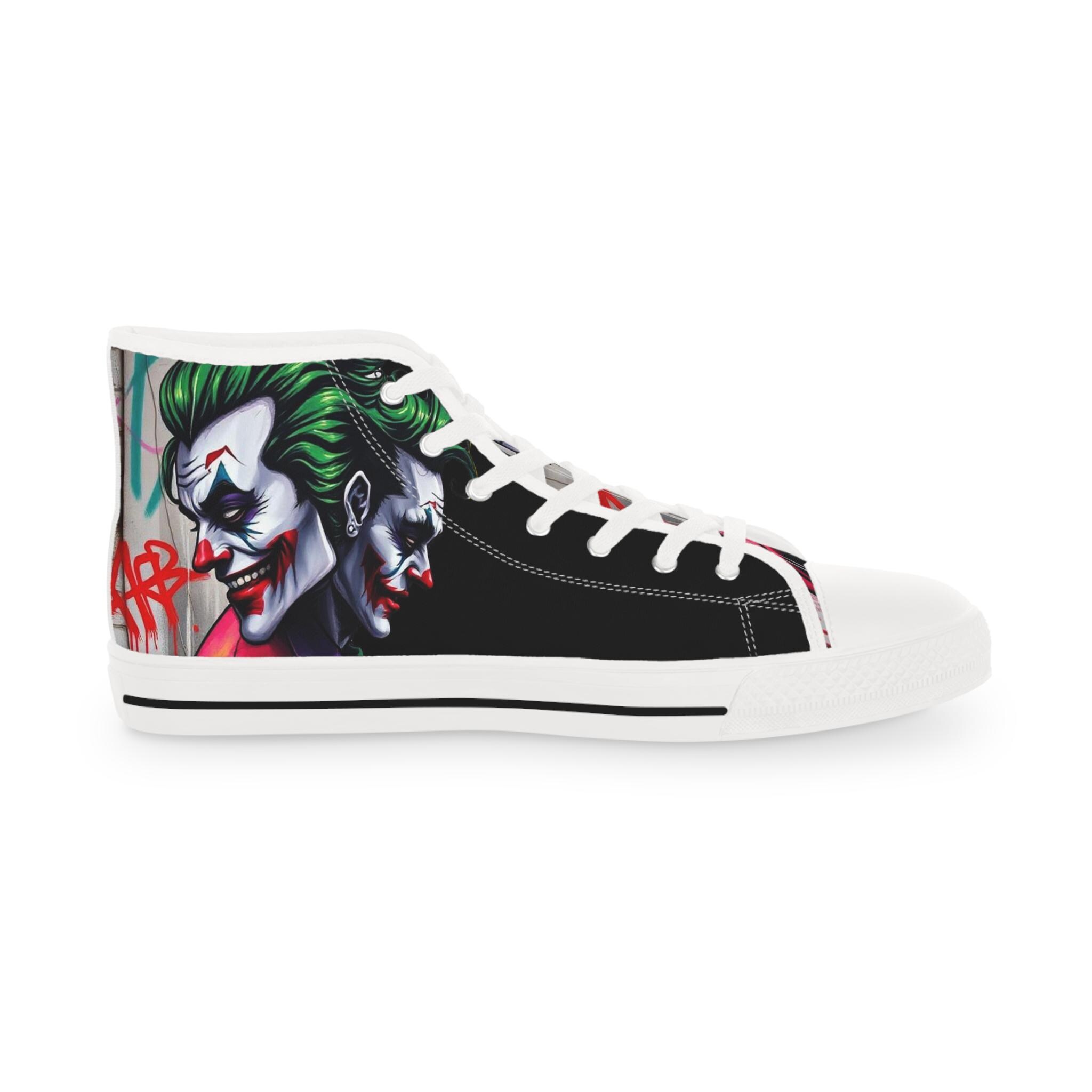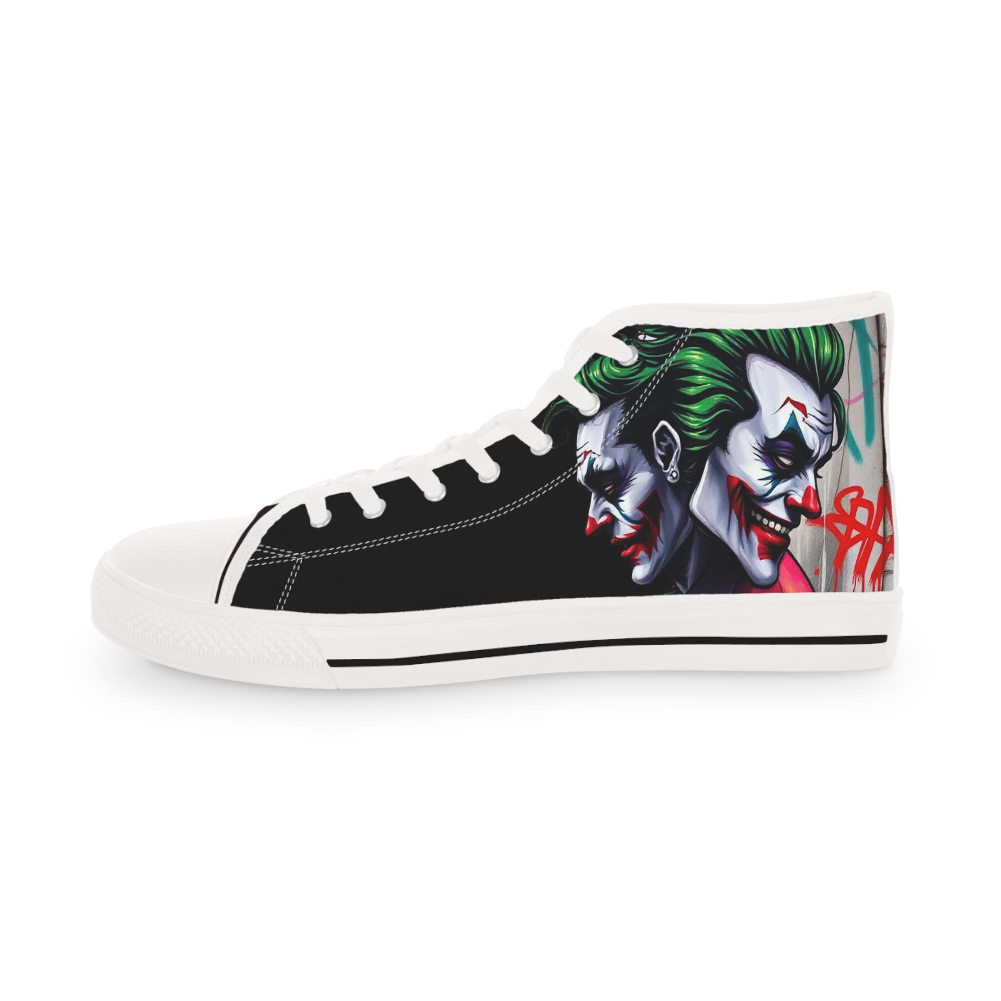 These high-top sneakers bring bold, streetwise energy to every step. The graphic wraparound print features a dark, theatrical character with vivid green hair and pale features, set against deep black panels and pops of magenta at the toe — a look that reads like comic-book mischief turned wearable. Built on a breathable polyester canvas with PU leather accents, they sit on lightweight EVA insoles with memory foam cushioning for shock absorption and lasting comfort. Metal eyelets, a pleather-covered toe cap, and a durable rubber outsole add toughness for everyday wear. Lace them up for nights out, convention floors, or when you want your footwear to do the talking.