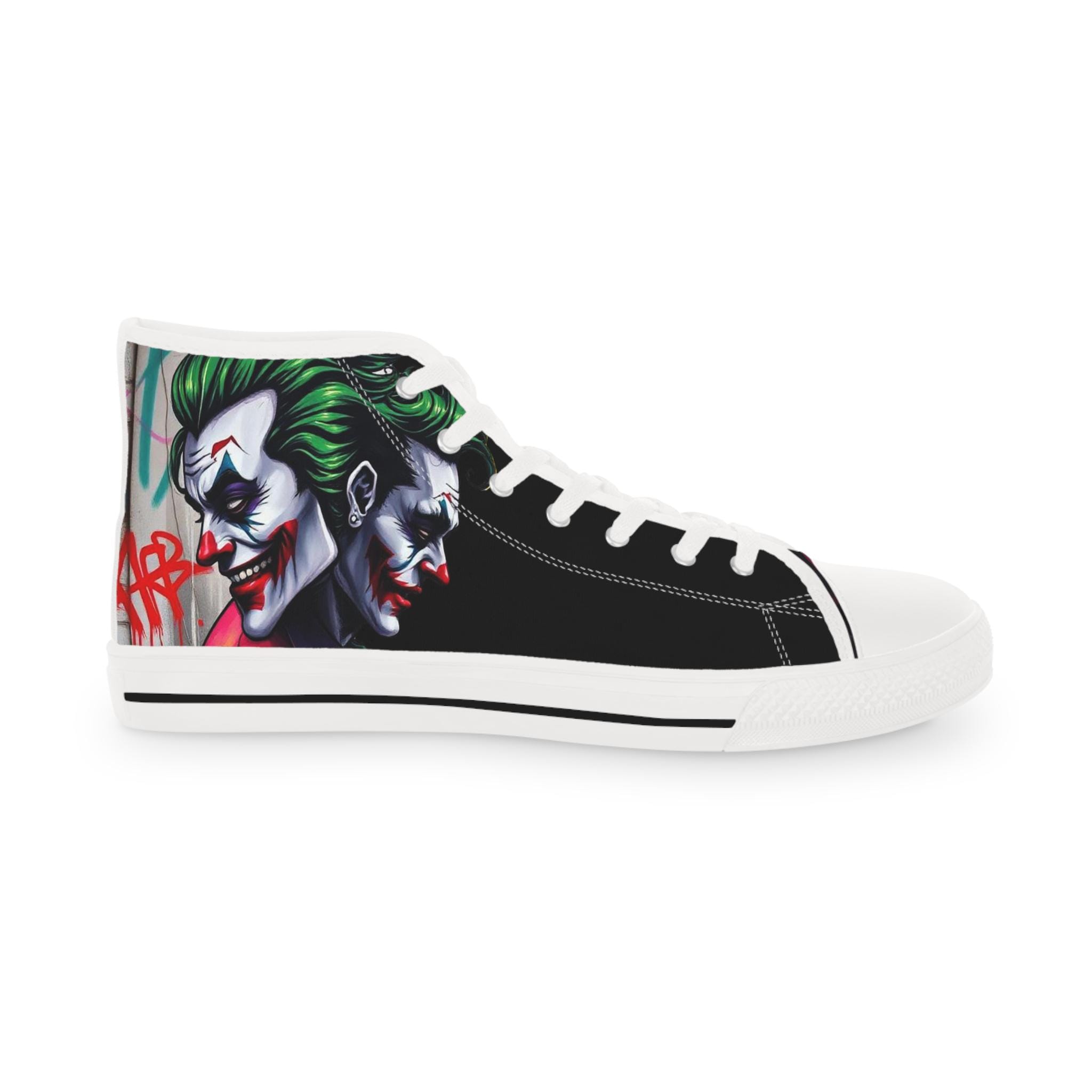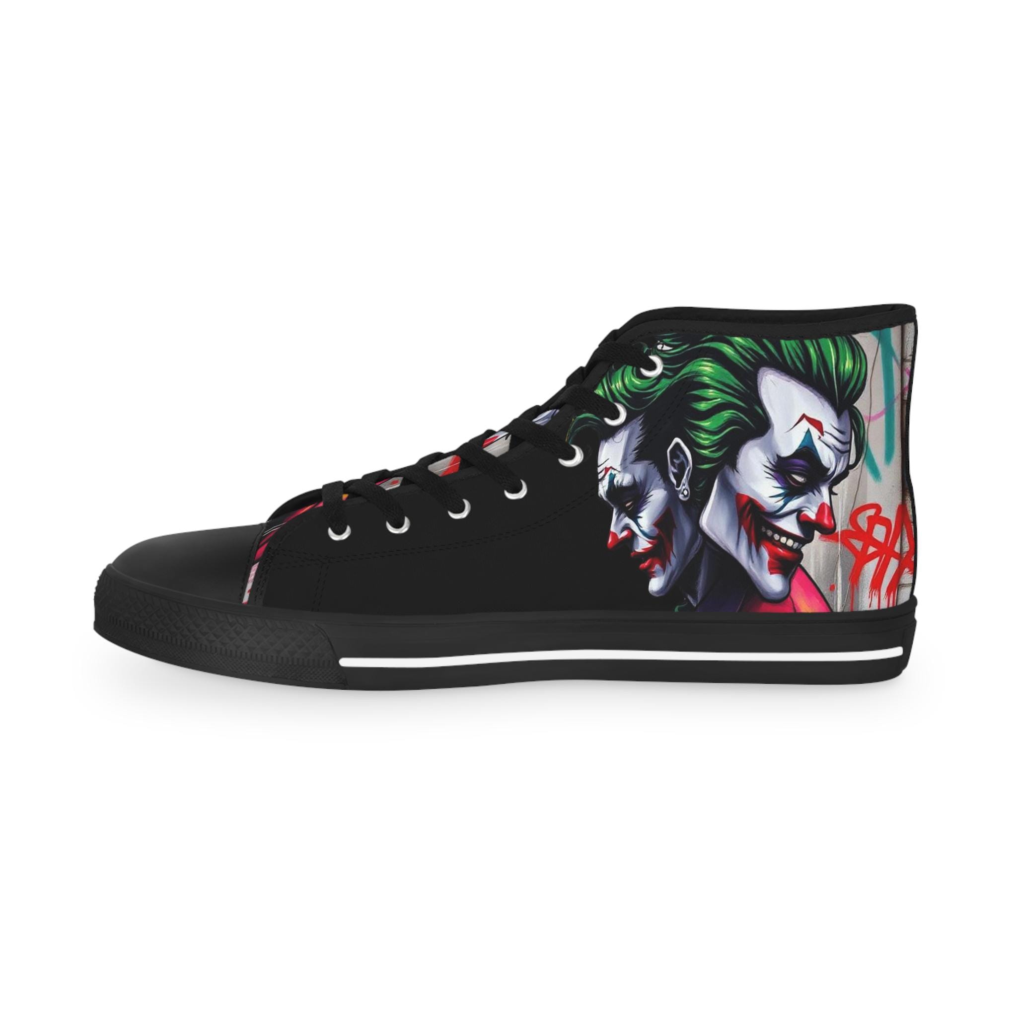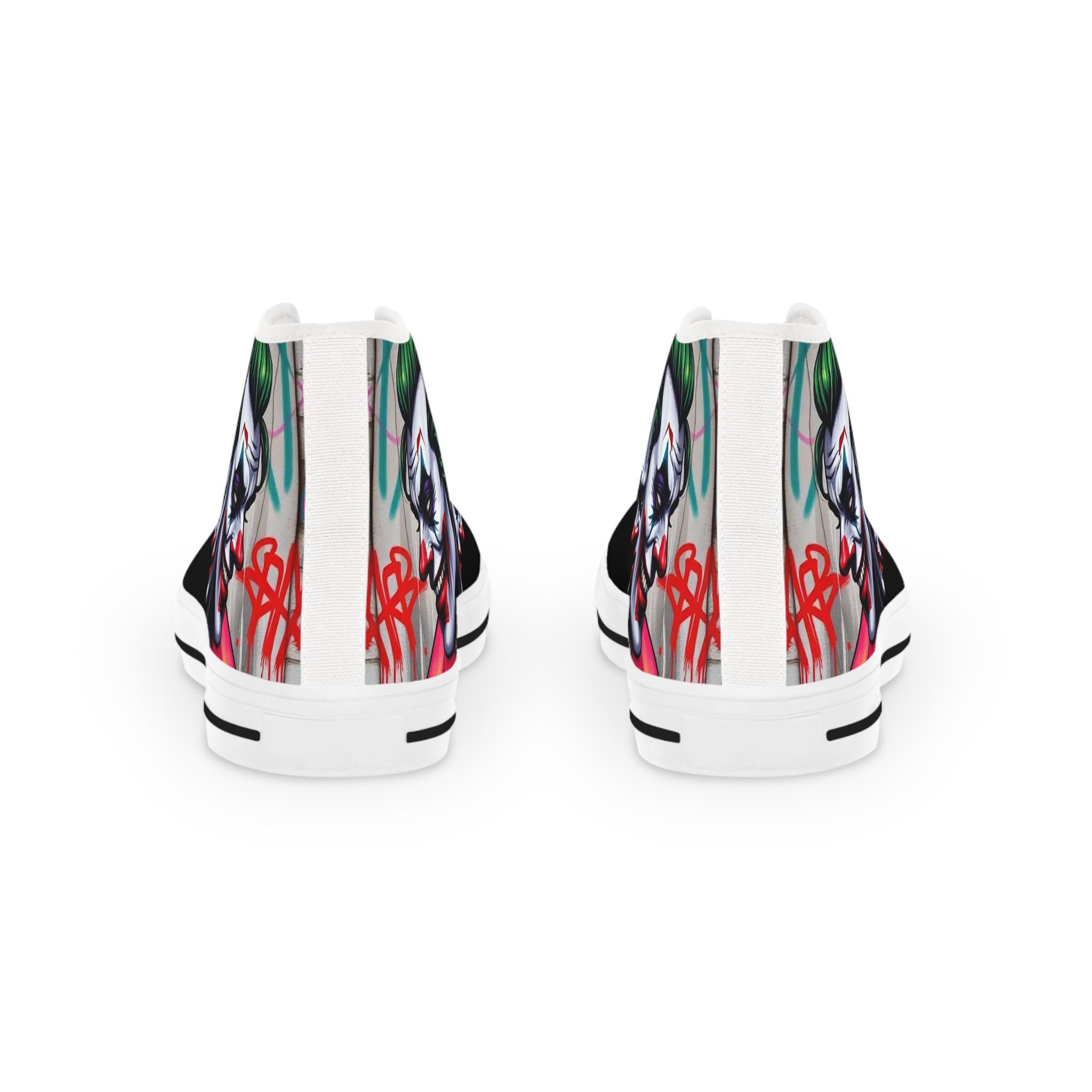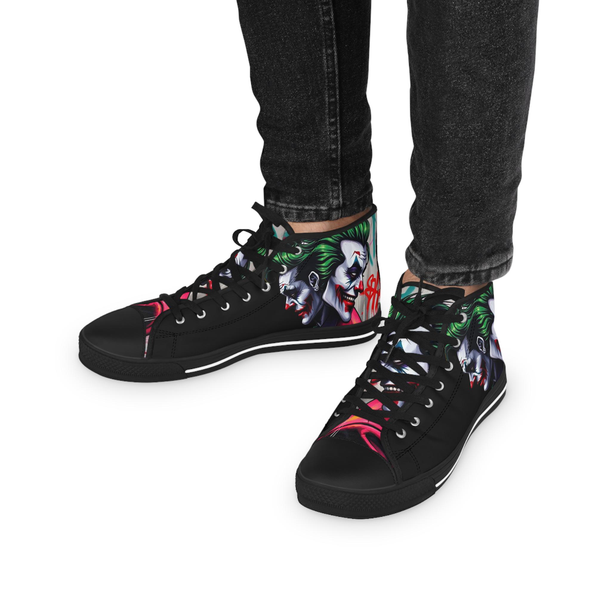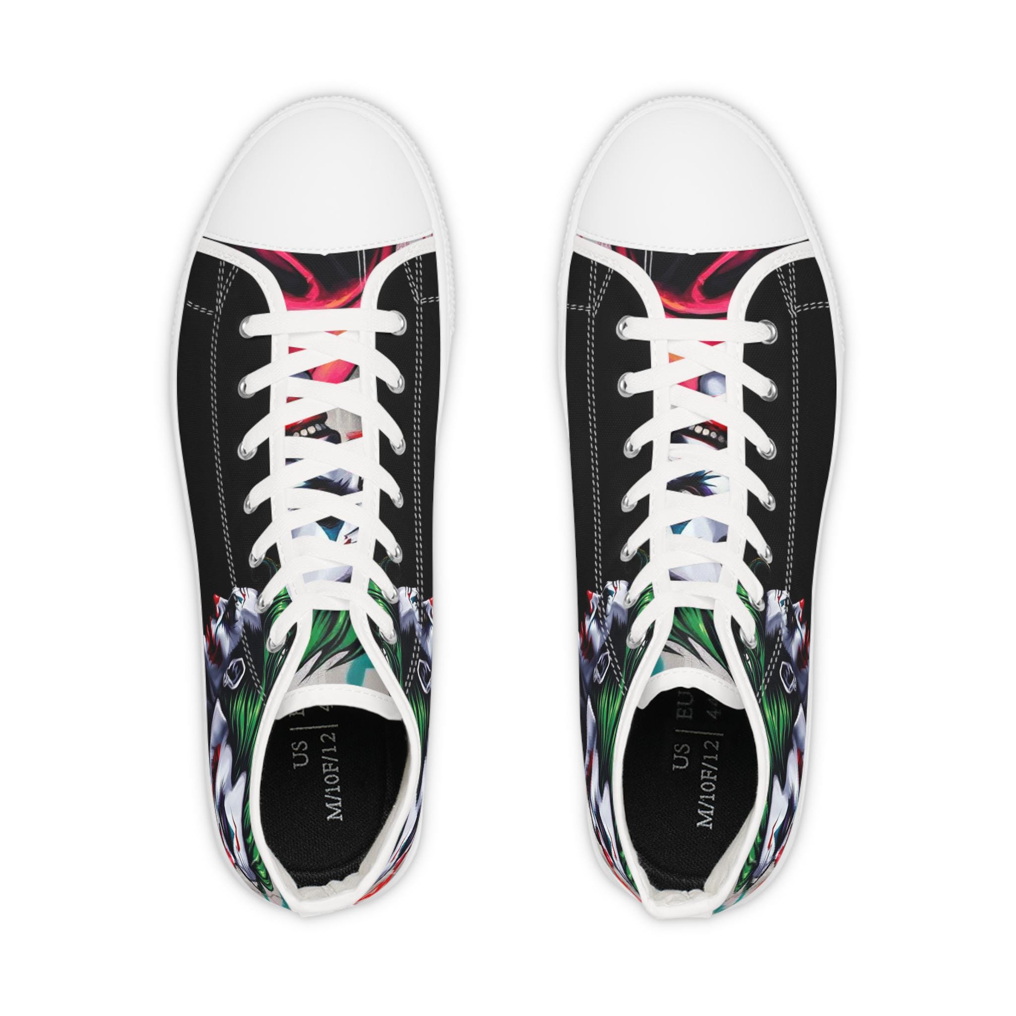 These high-top sneakers bring bold, streetwise energy to every step. The graphic wraparound print features a dark, theatrical character with vivid green hair and pale features, set against deep black panels and pops of magenta at the toe — a look that reads like comic-book mischief turned wearable. Built on a breathable polyester canvas with PU leather accents, they sit on lightweight EVA insoles with memory foam cushioning for shock absorption and lasting comfort. Metal eyelets, a pleather-covered toe cap, and a durable rubber outsole add toughness for everyday wear. Lace them up for nights out, convention floors, or when you want your footwear to do the talking.