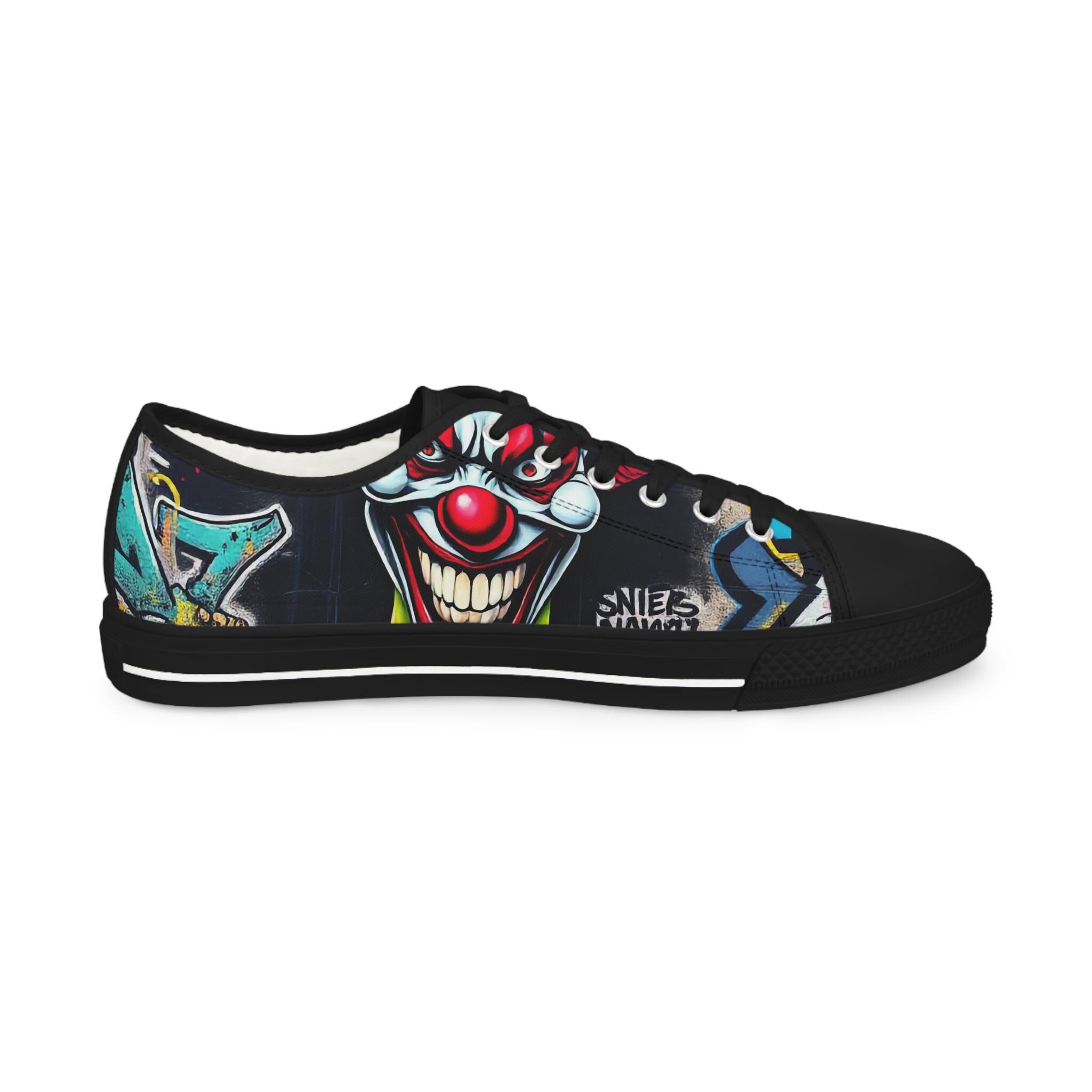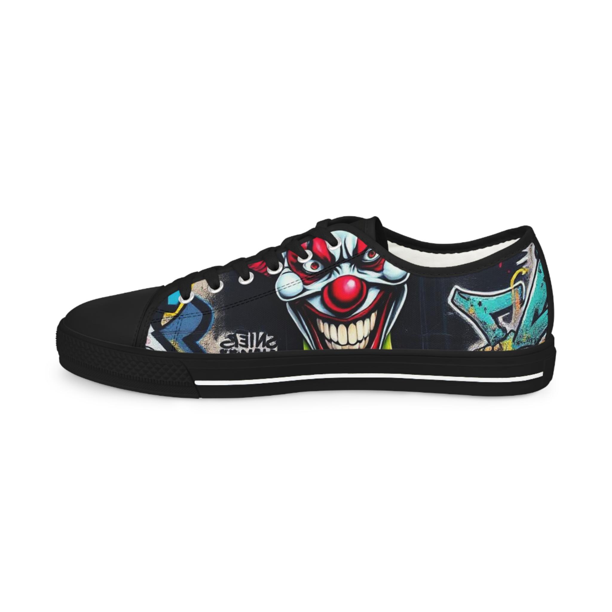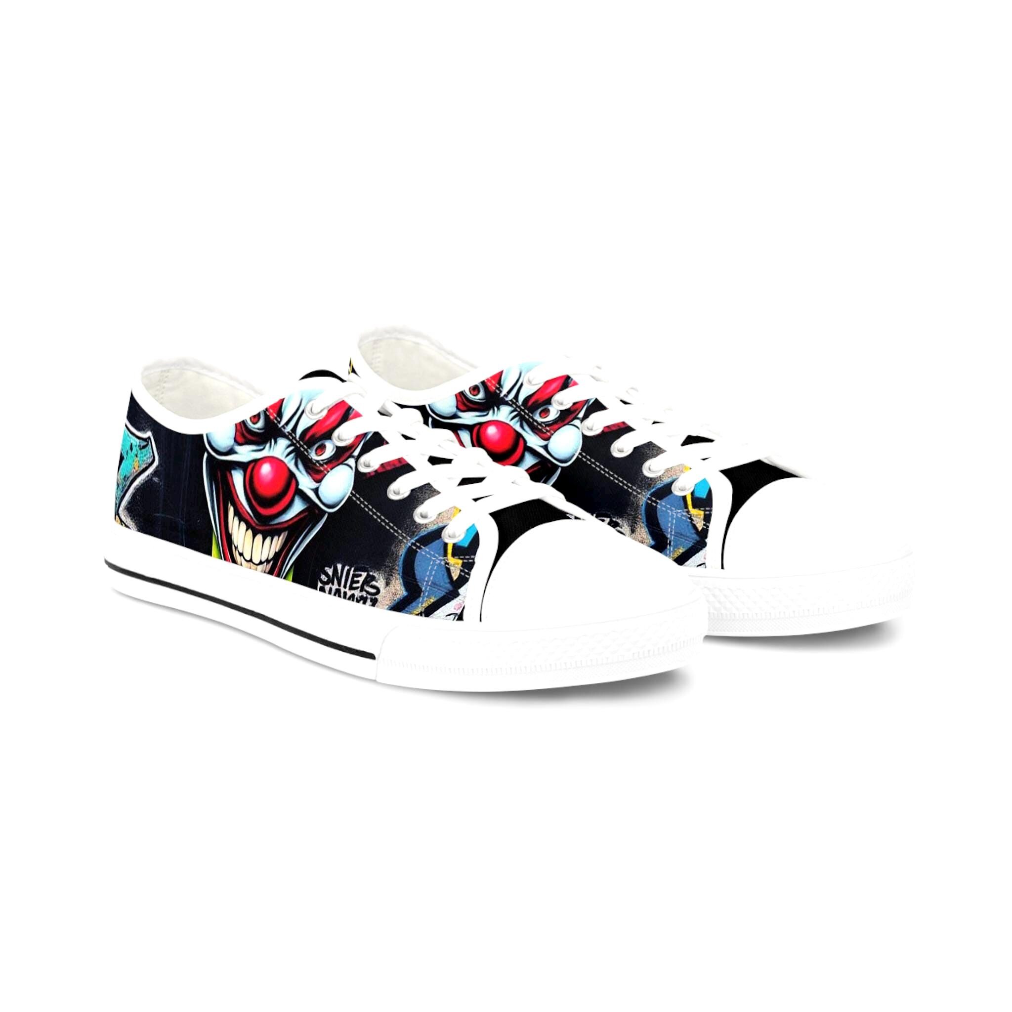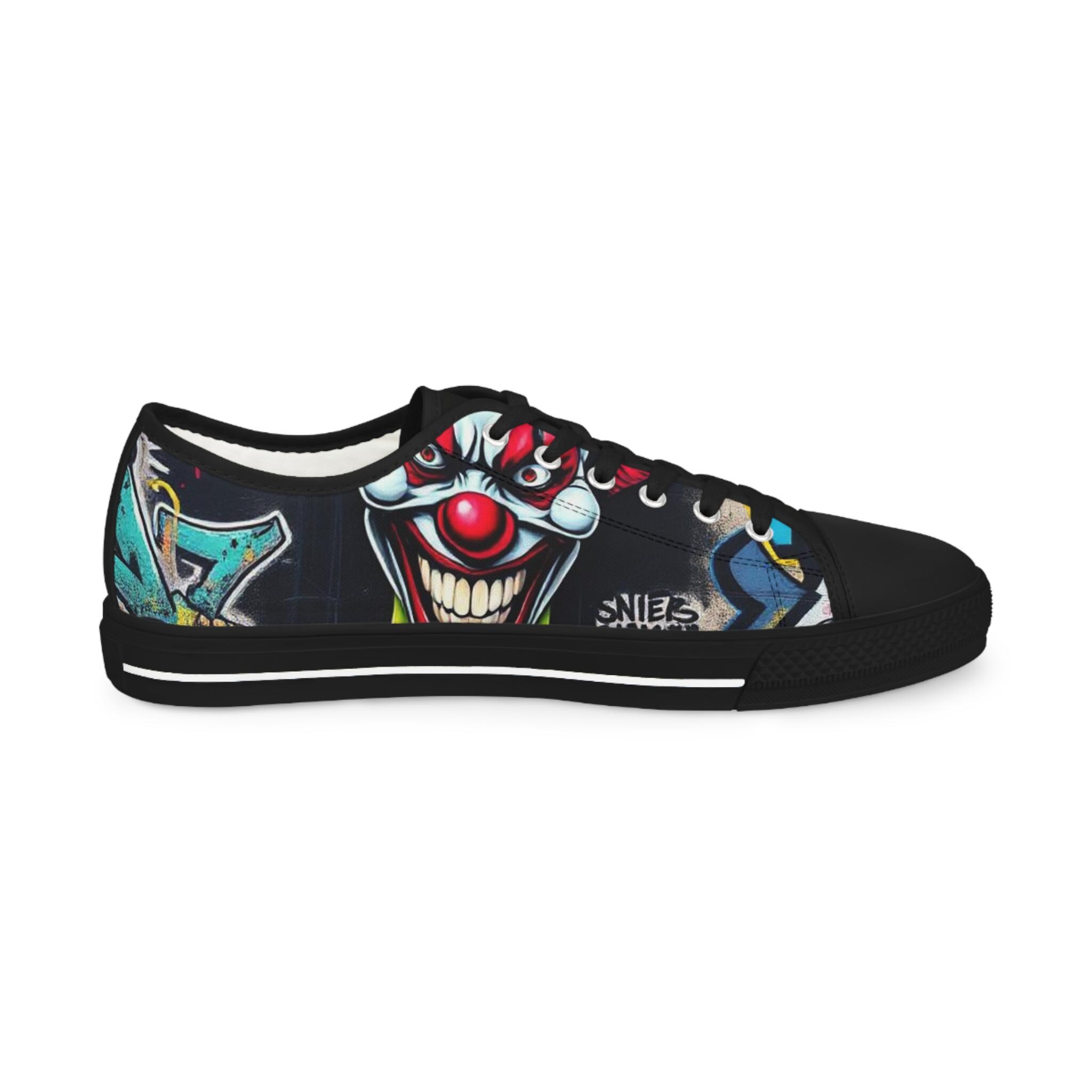 Low-top canvas sneakers that wear like a statement. Dark, detailed clown artwork wraps the sides and tongue, giving these shoes an edgy, streetwise vibe that suits nights out, skate sessions, or adding attitude to an everyday outfit. The padded memory-foam insole and EVA shock layer keep each step surprisingly cushioned, while pleather-reinforced toes and metal eyelets add long-wearing toughness. They run slightly large — size down if you prefer a snug fit. These sneakers pair well with slim jeans, graphic tees, and layered outerwear for an effortlessly bold look.