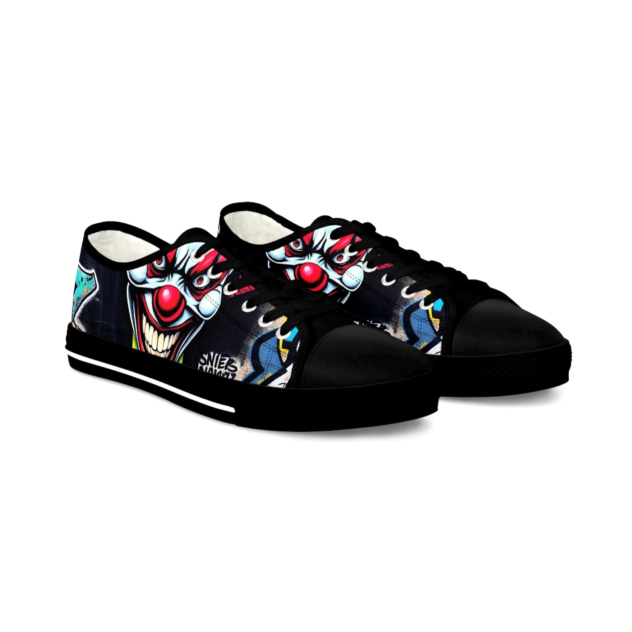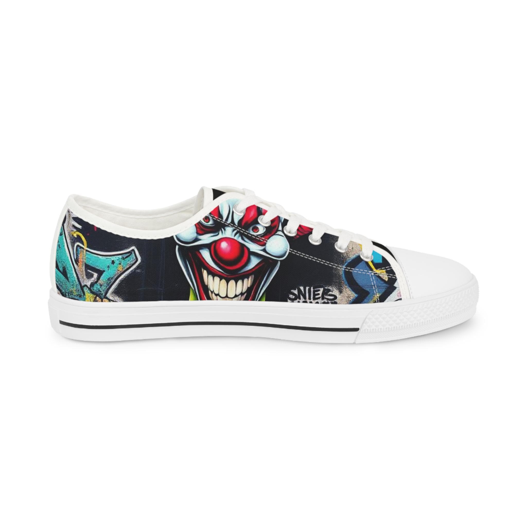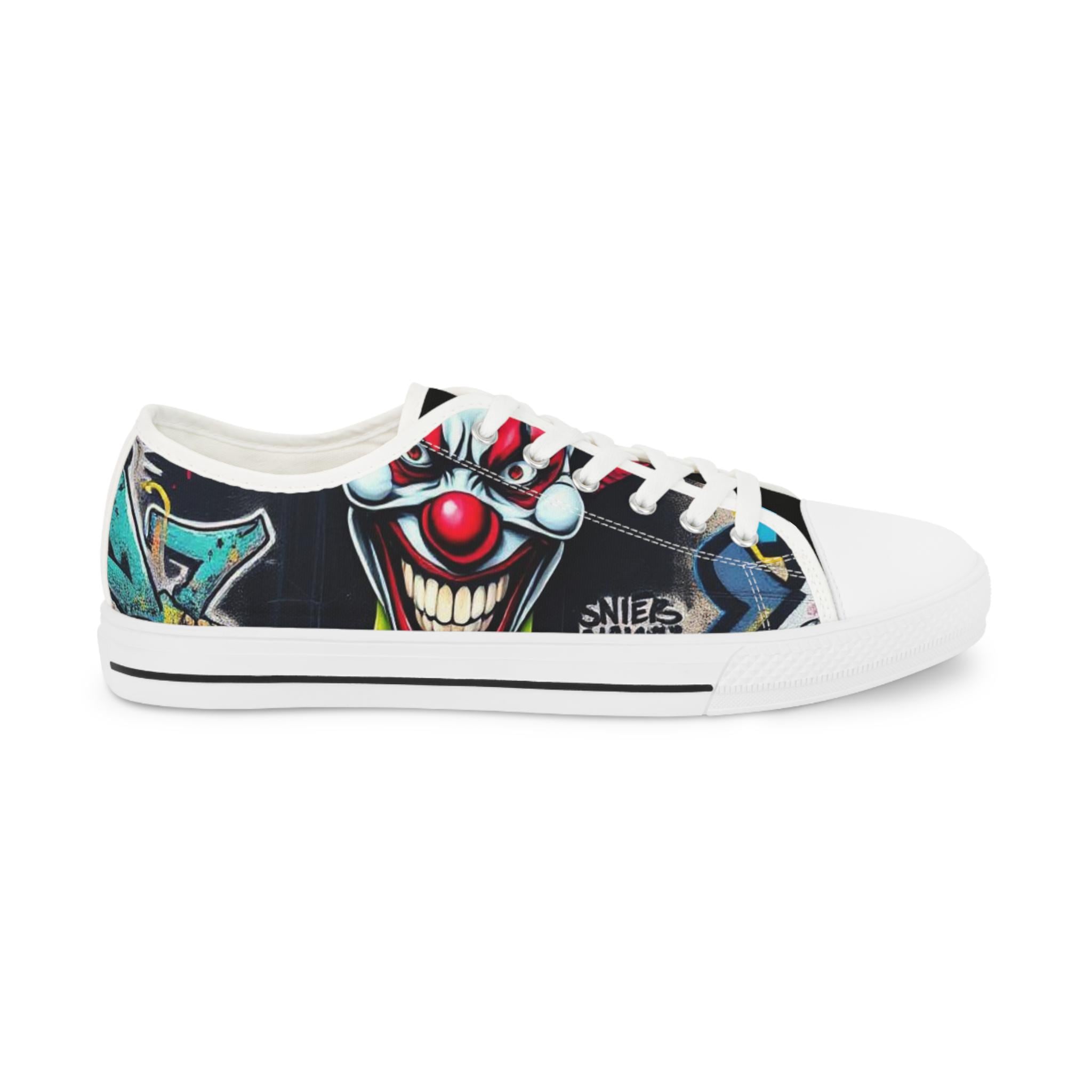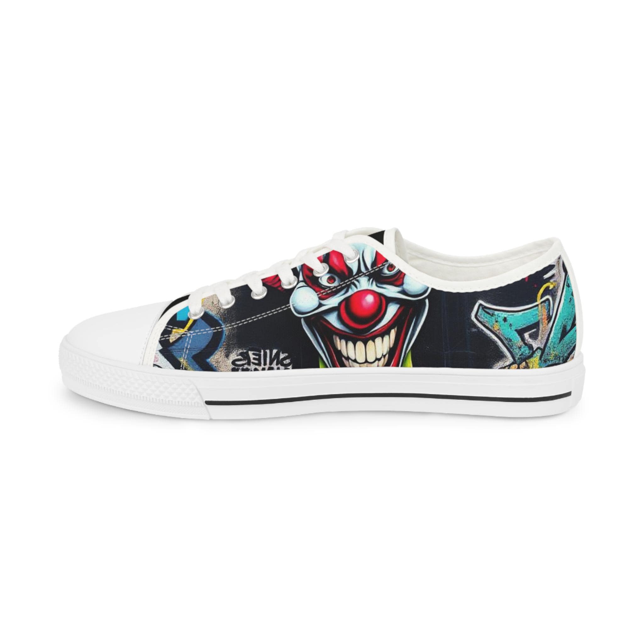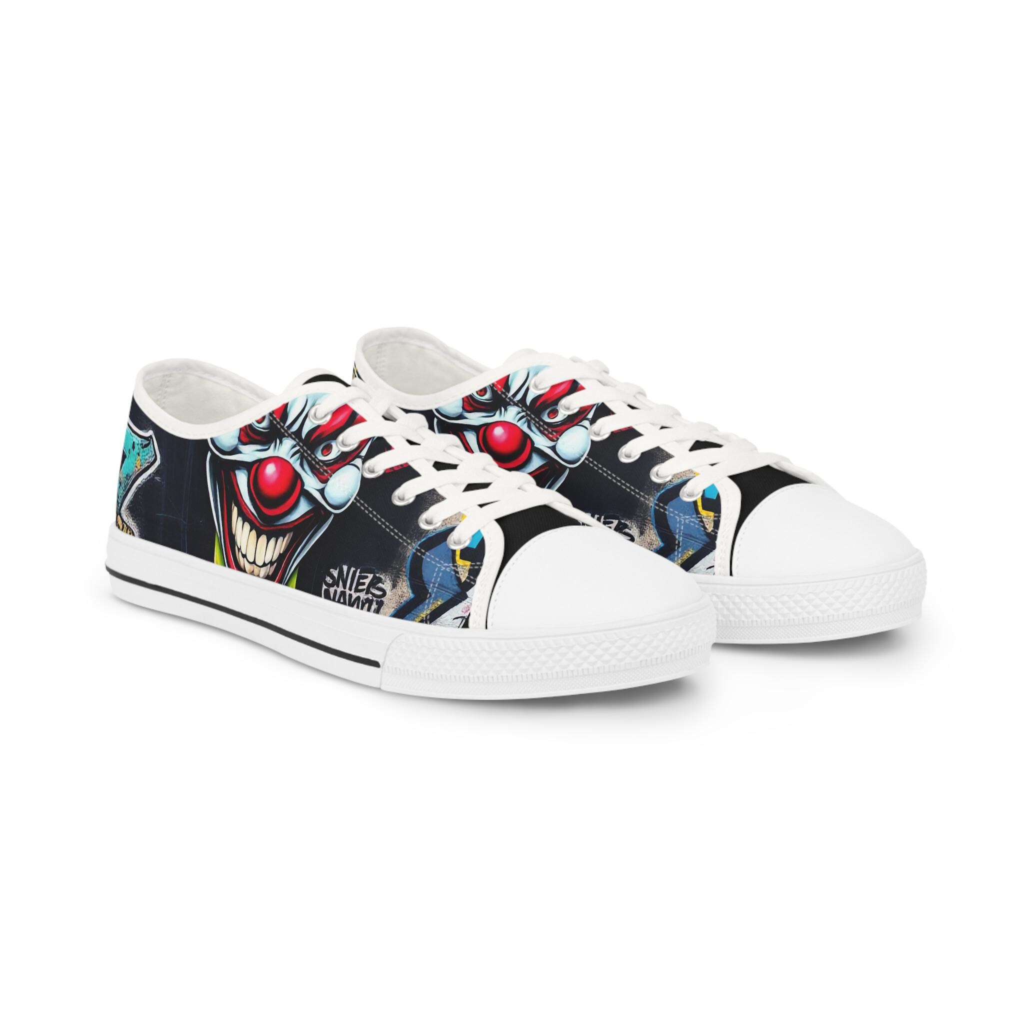 Low-top canvas sneakers that wear like a statement. Dark, detailed clown artwork wraps the sides and tongue, giving these shoes an edgy, streetwise vibe that suits nights out, skate sessions, or adding attitude to an everyday outfit. The padded memory-foam insole and EVA shock layer keep each step surprisingly cushioned, while pleather-reinforced toes and metal eyelets add long-wearing toughness. They run slightly large — size down if you prefer a snug fit. These sneakers pair well with slim jeans, graphic tees, and layered outerwear for an effortlessly bold look.