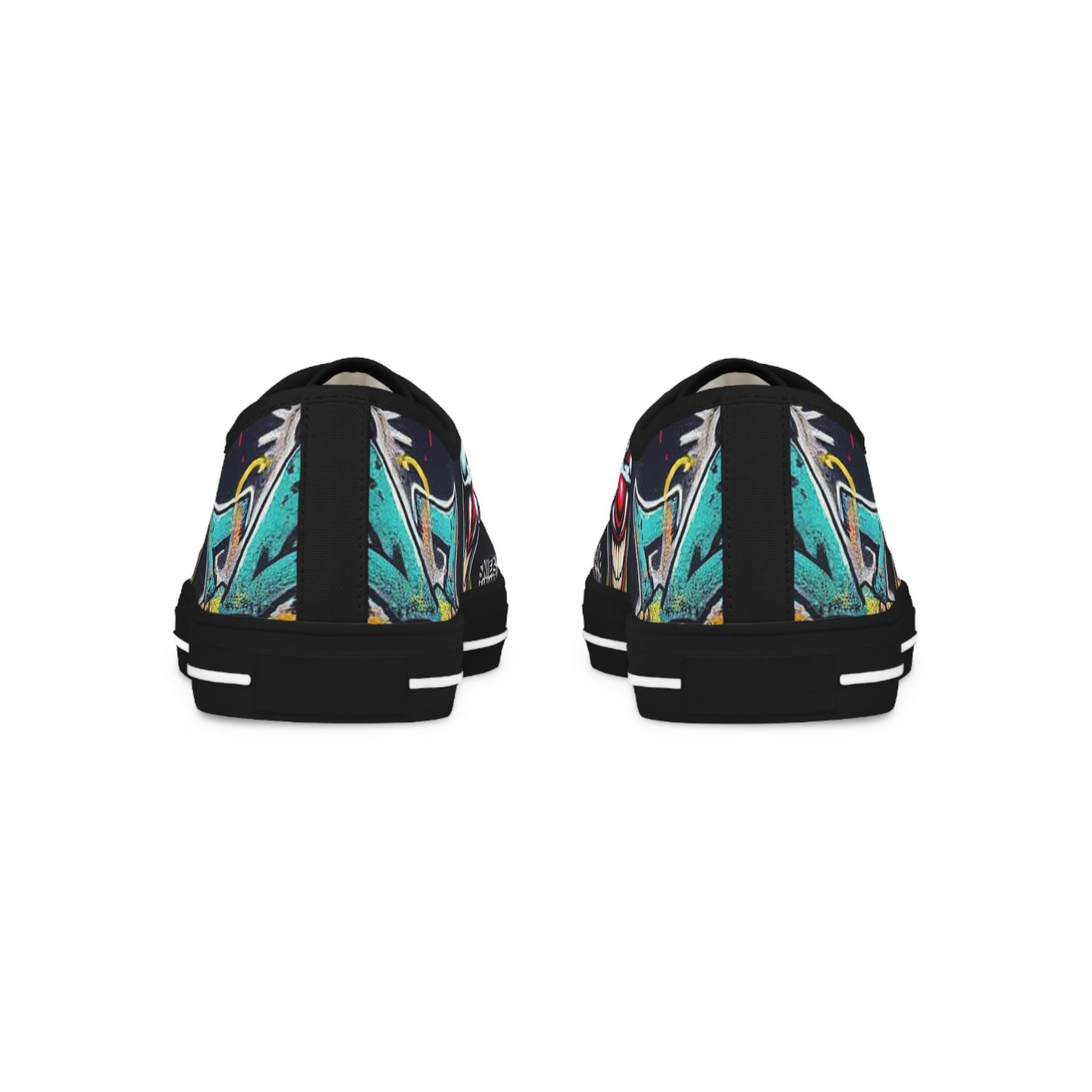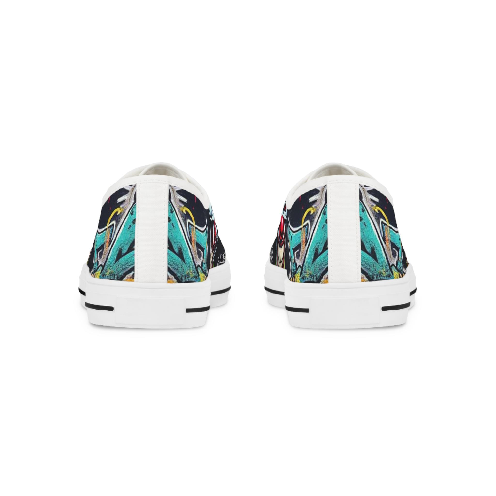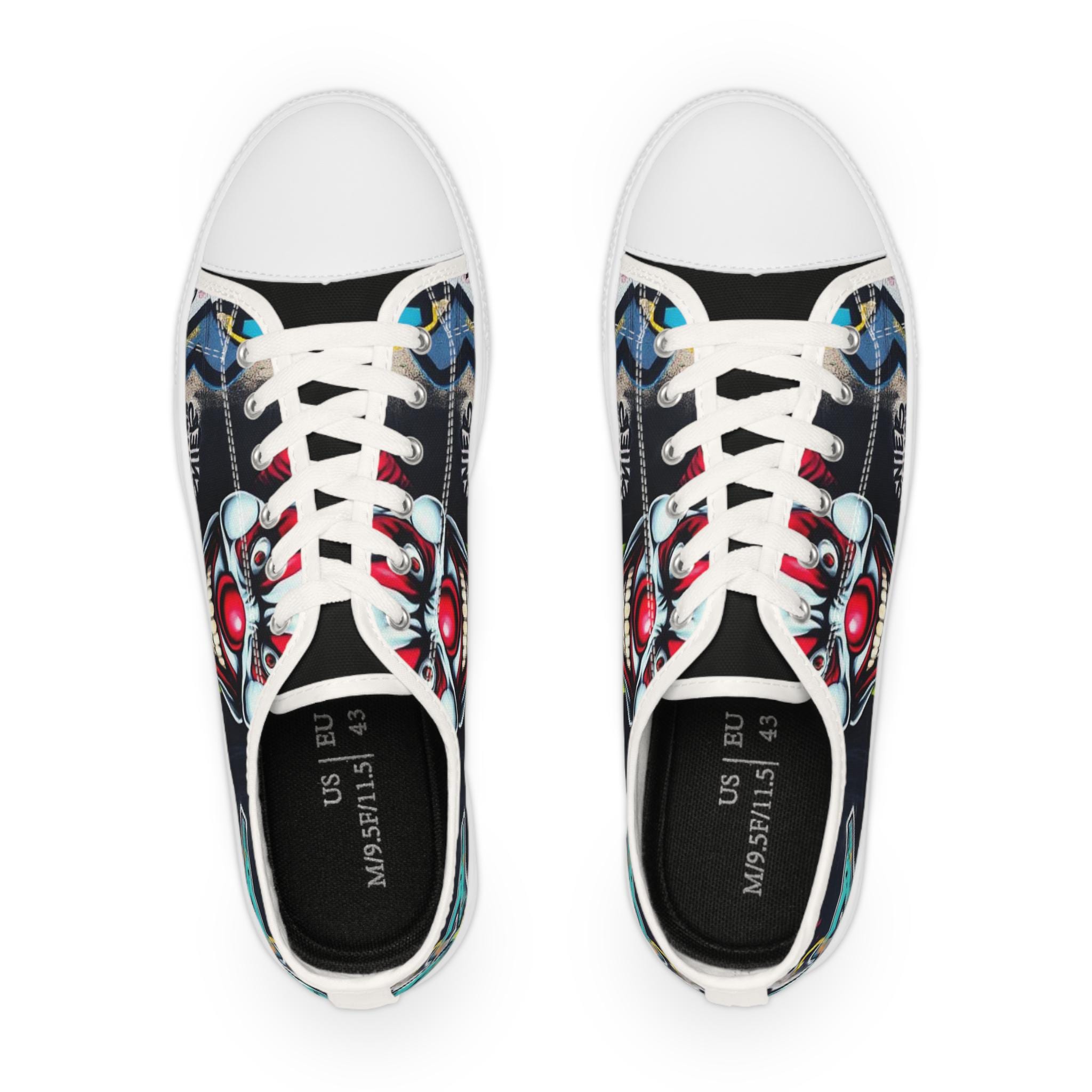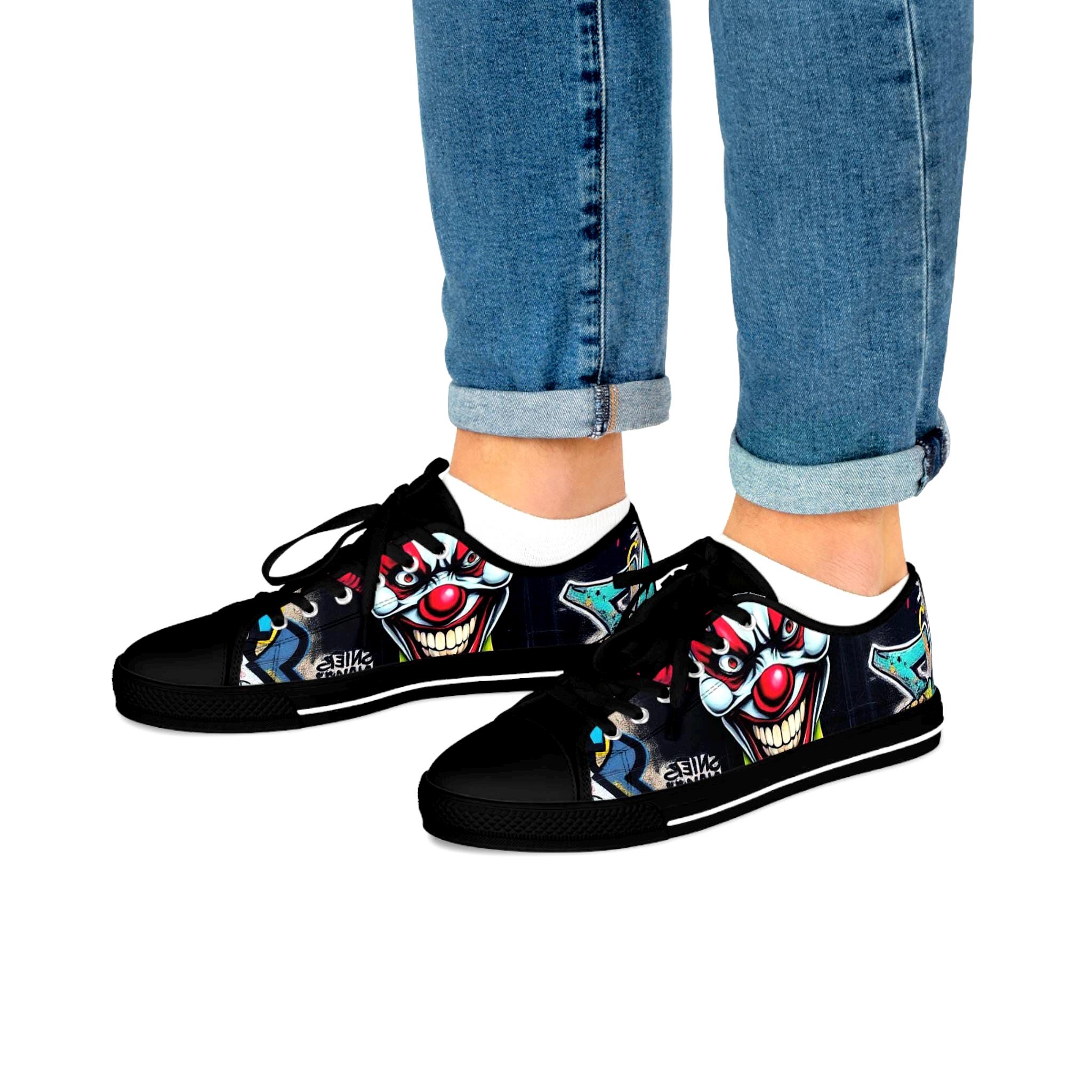 Low-top canvas sneakers that wear like a statement. Dark, detailed clown artwork wraps the sides and tongue, giving these shoes an edgy, streetwise vibe that suits nights out, skate sessions, or adding attitude to an everyday outfit. The padded memory-foam insole and EVA shock layer keep each step surprisingly cushioned, while pleather-reinforced toes and metal eyelets add long-wearing toughness. They run slightly large — size down if you prefer a snug fit. These sneakers pair well with slim jeans, graphic tees, and layered outerwear for an effortlessly bold look.