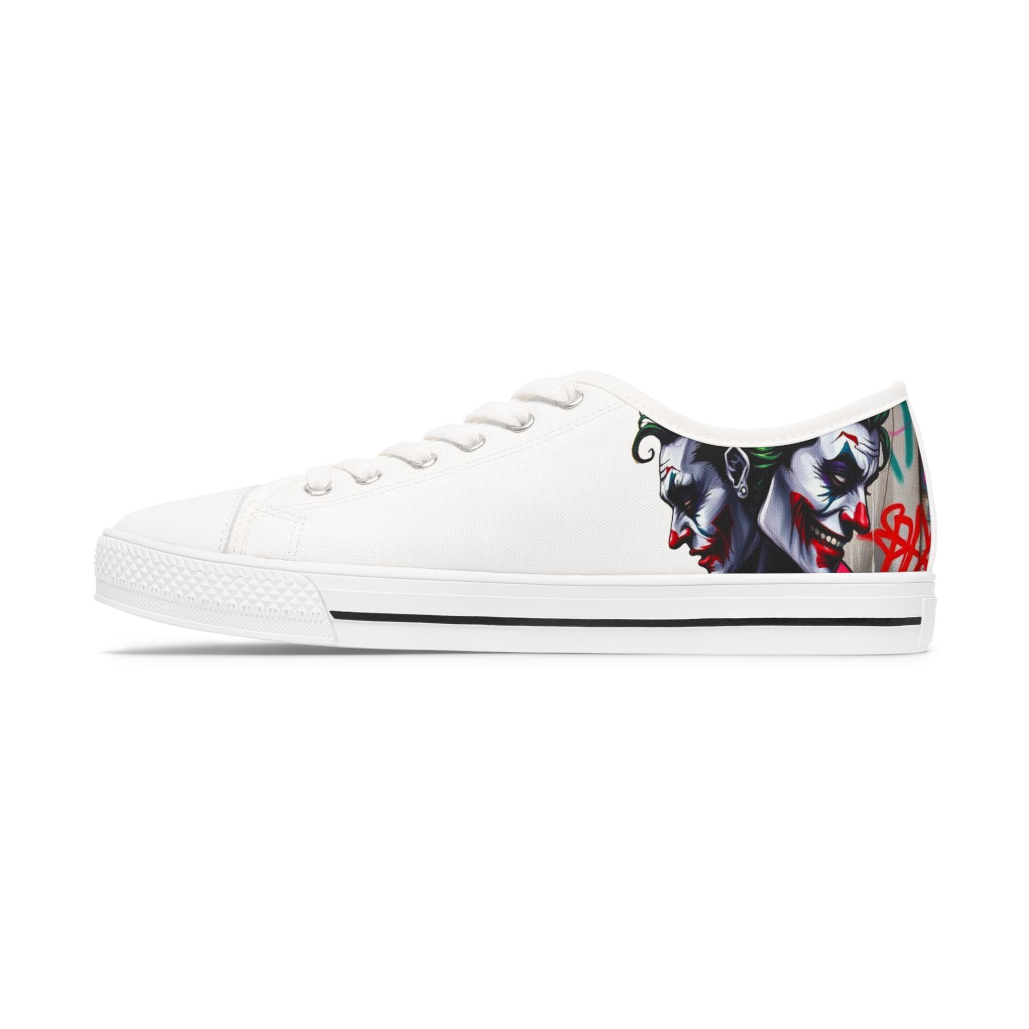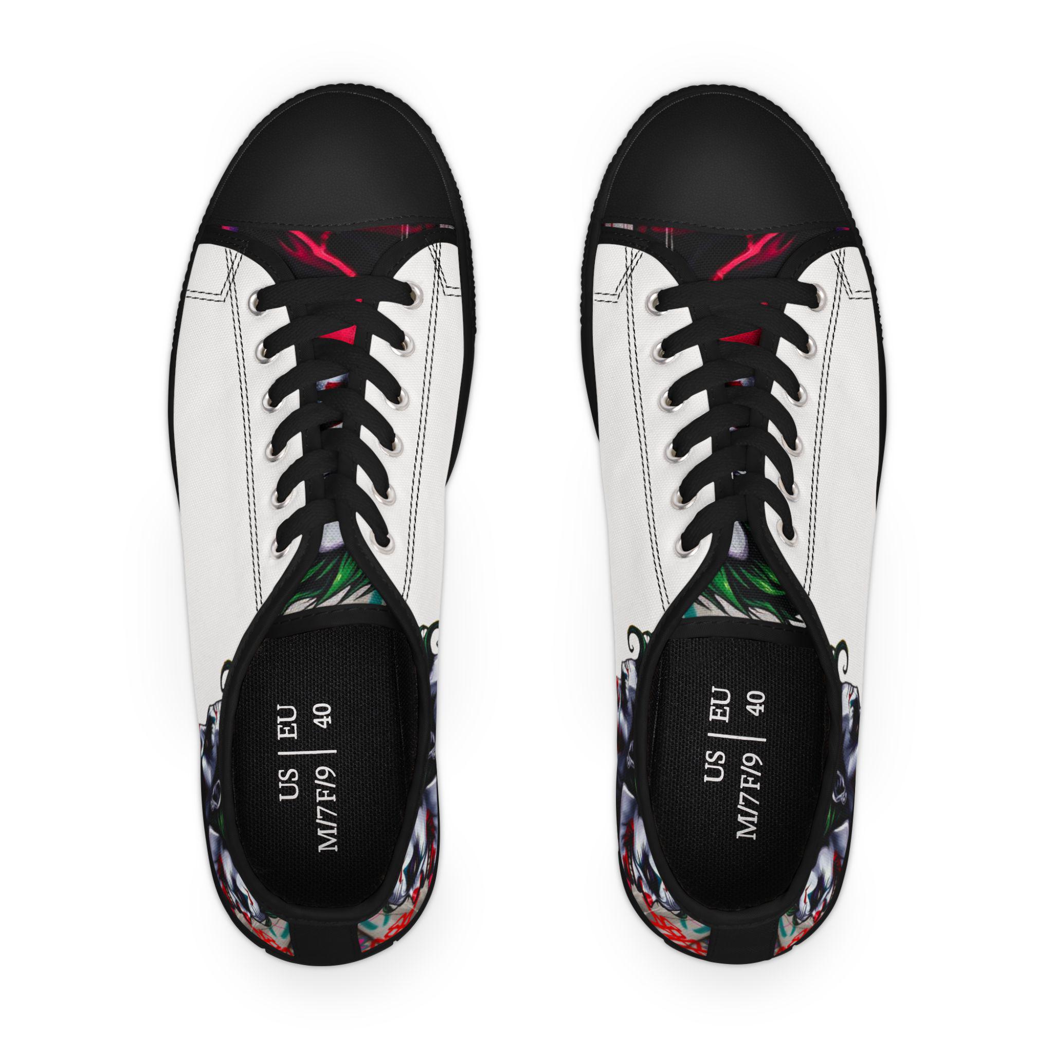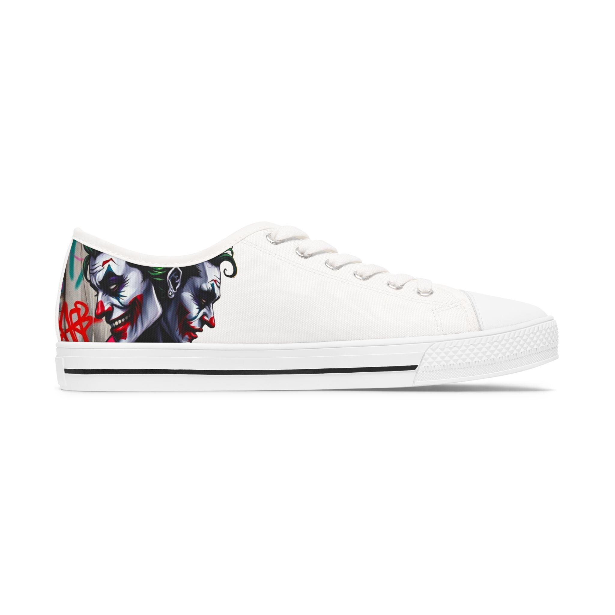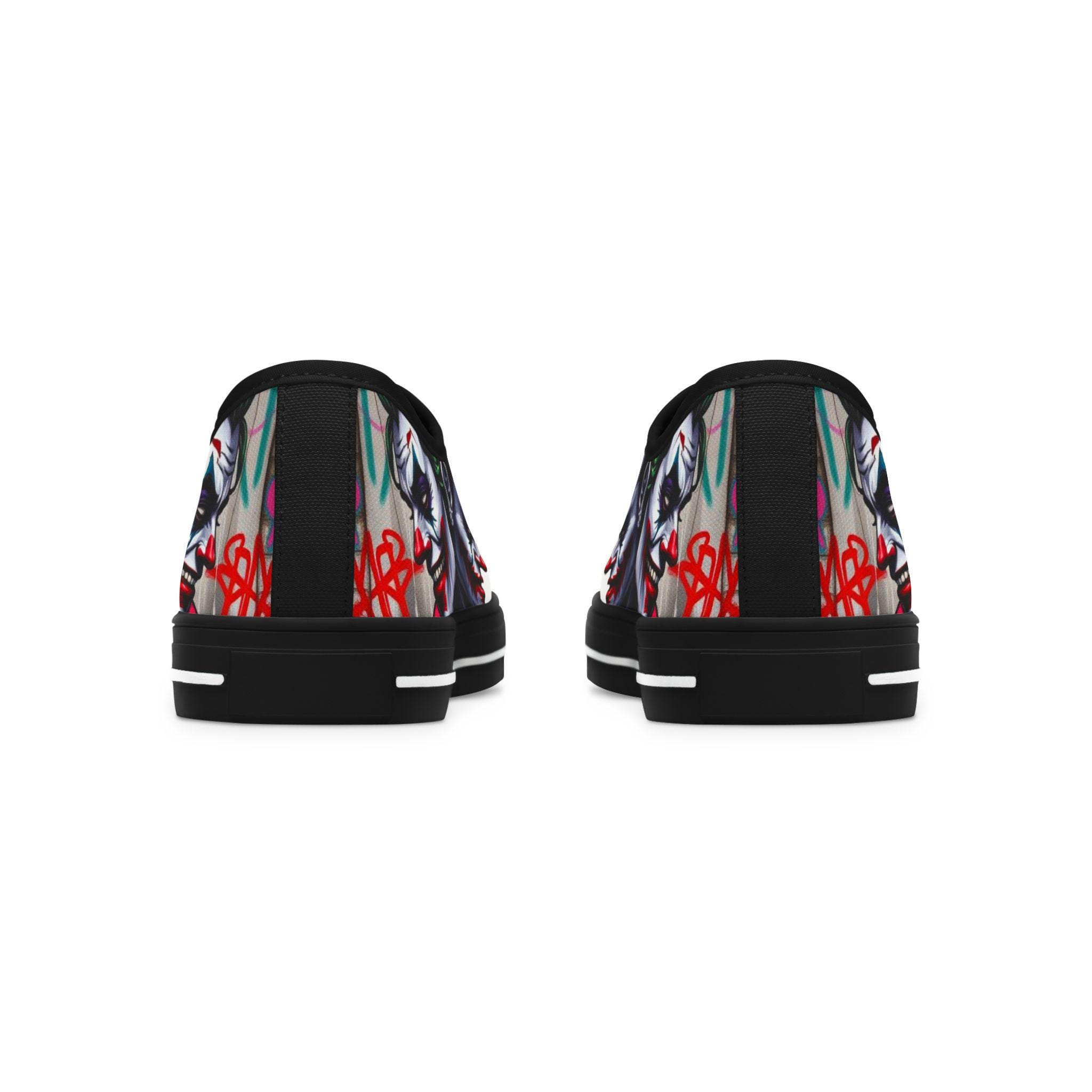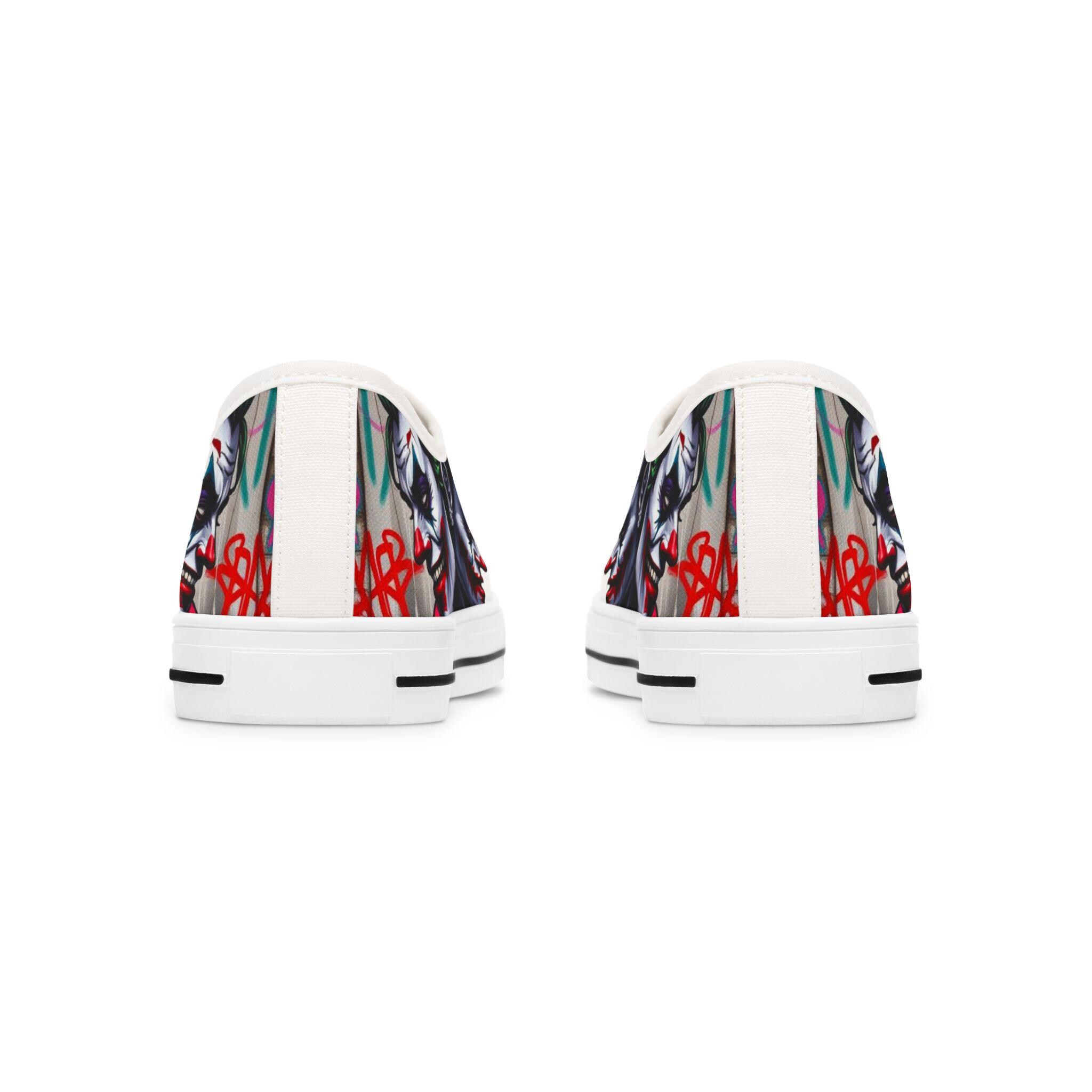 These low-top canvas sneakers carry an edgy, streetwise energy — subtle from afar, bold up close. Smooth white polyester canvas wraps the foot with breathable comfort, while the black pleather toe and metal eyelets add durable, urban detailing. Memory foam insoles and EVA shock-absorbing layers cushion every step, so you can wander city blocks or stand at shows without your feet complaining. The artwork prints wrap around the sides and tongue, letting a moody, graffiti-inspired character peek out when you walk. Wear them with slim jeans, a leather jacket, or a band tee to lean into a rebellious, art-forward look.
