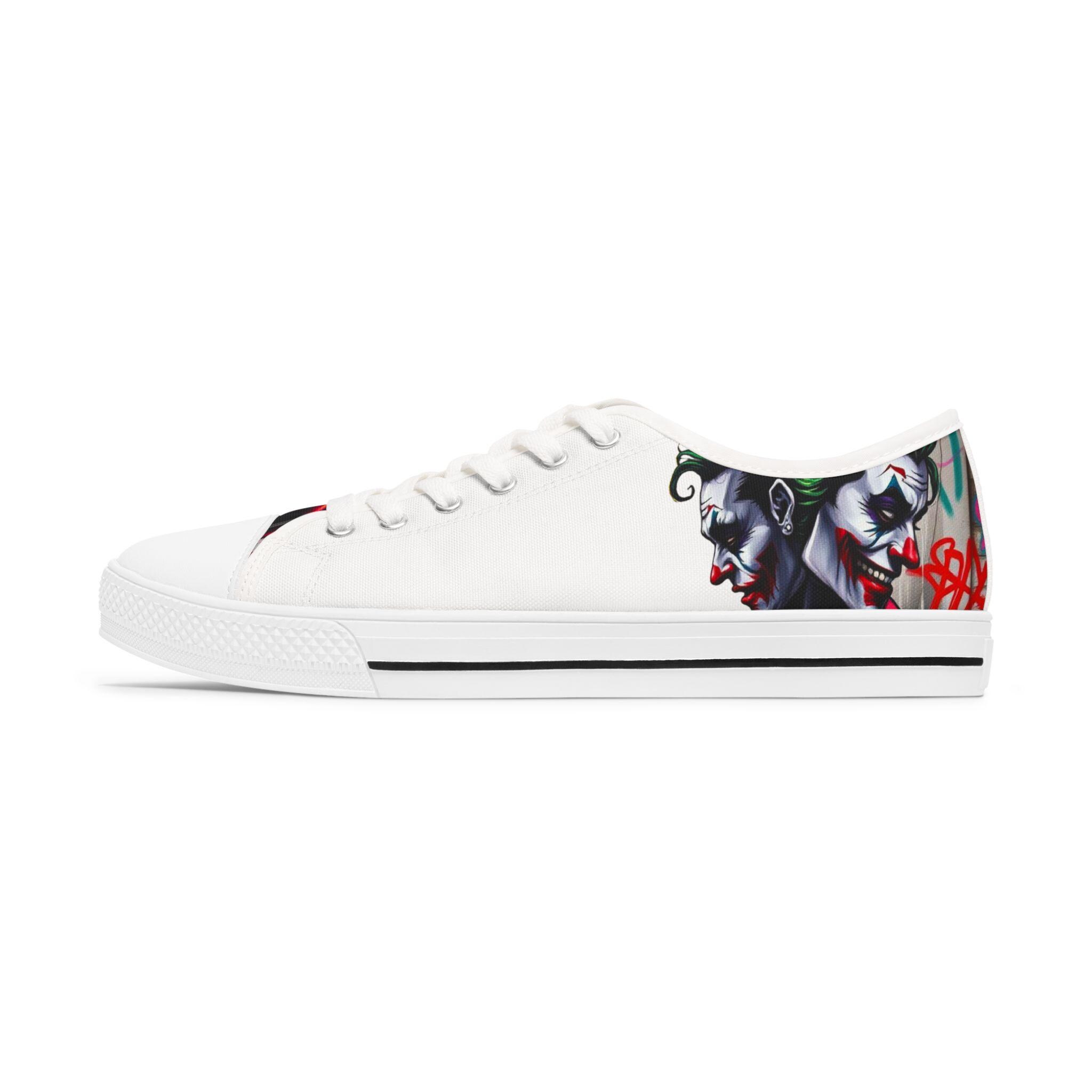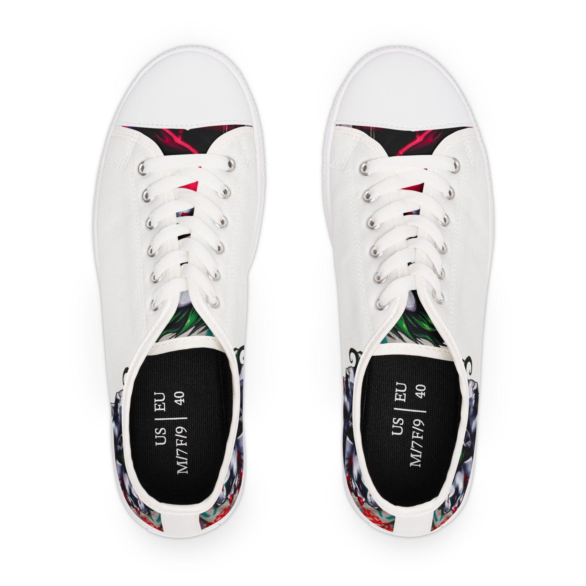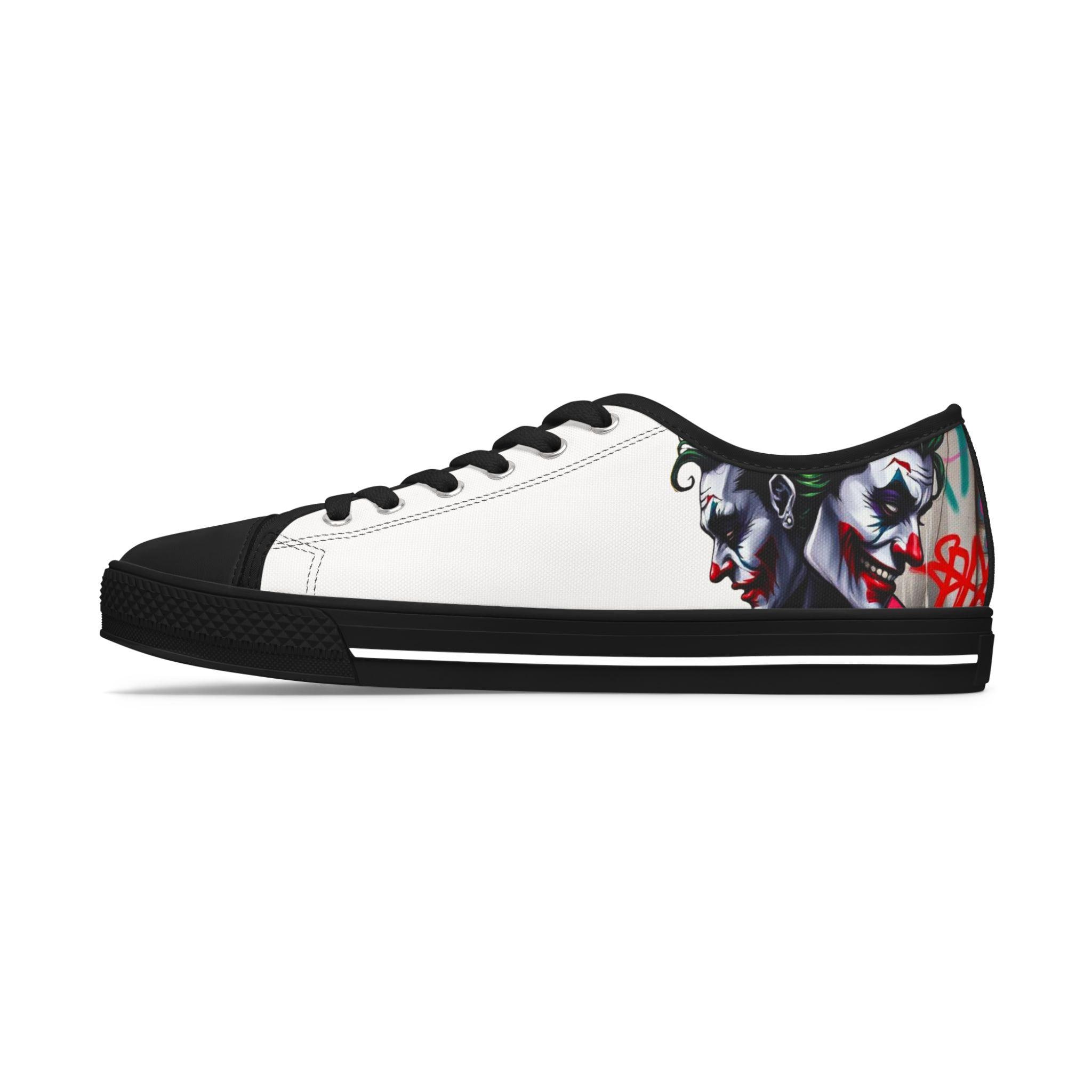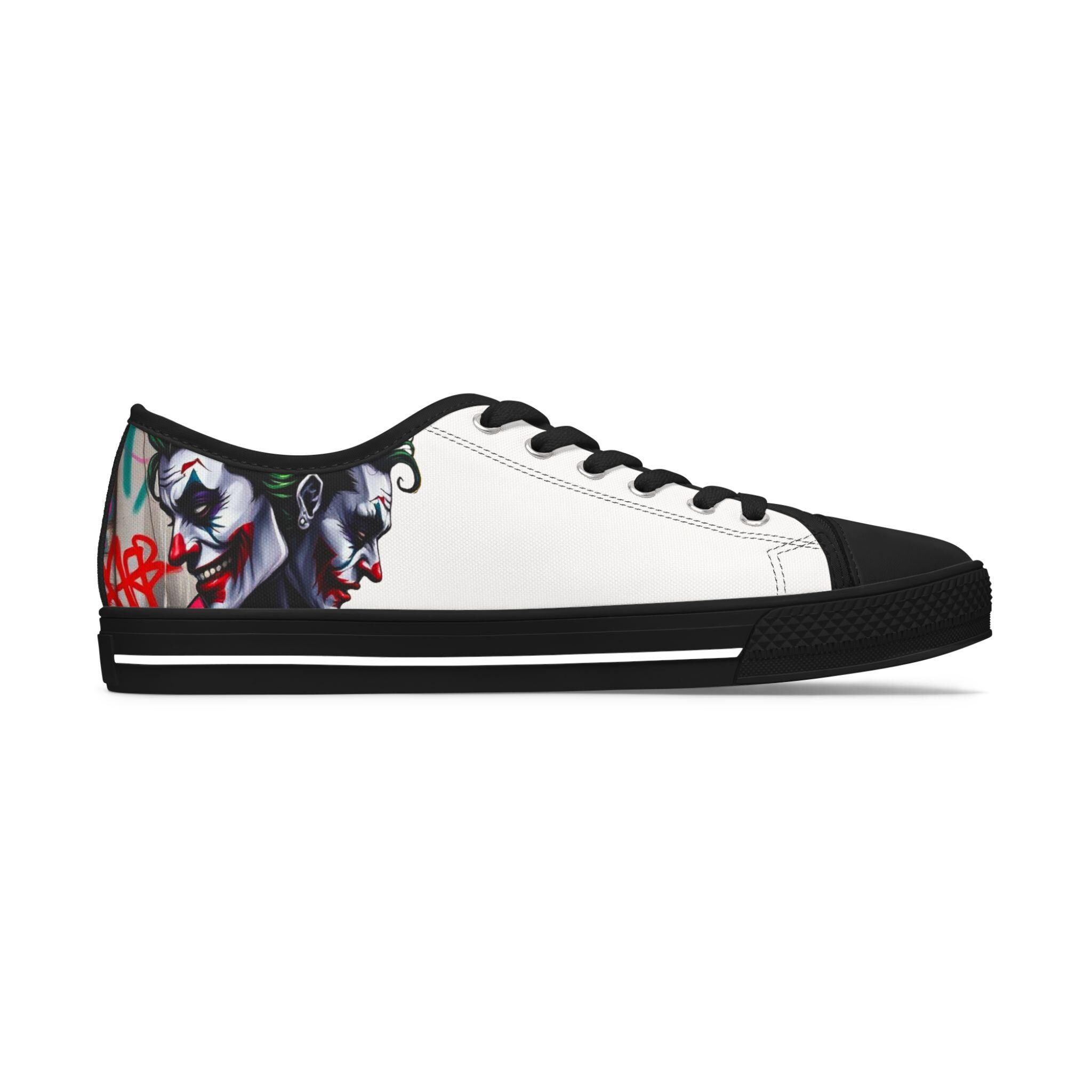 These low-top canvas sneakers carry an edgy, streetwise energy — subtle from afar, bold up close. Smooth white polyester canvas wraps the foot with breathable comfort, while the black pleather toe and metal eyelets add durable, urban detailing. Memory foam insoles and EVA shock-absorbing layers cushion every step, so you can wander city blocks or stand at shows without your feet complaining. The artwork prints wrap around the sides and tongue, letting a moody, graffiti-inspired character peek out when you walk. Wear them with slim jeans, a leather jacket, or a band tee to lean into a rebellious, art-forward look.