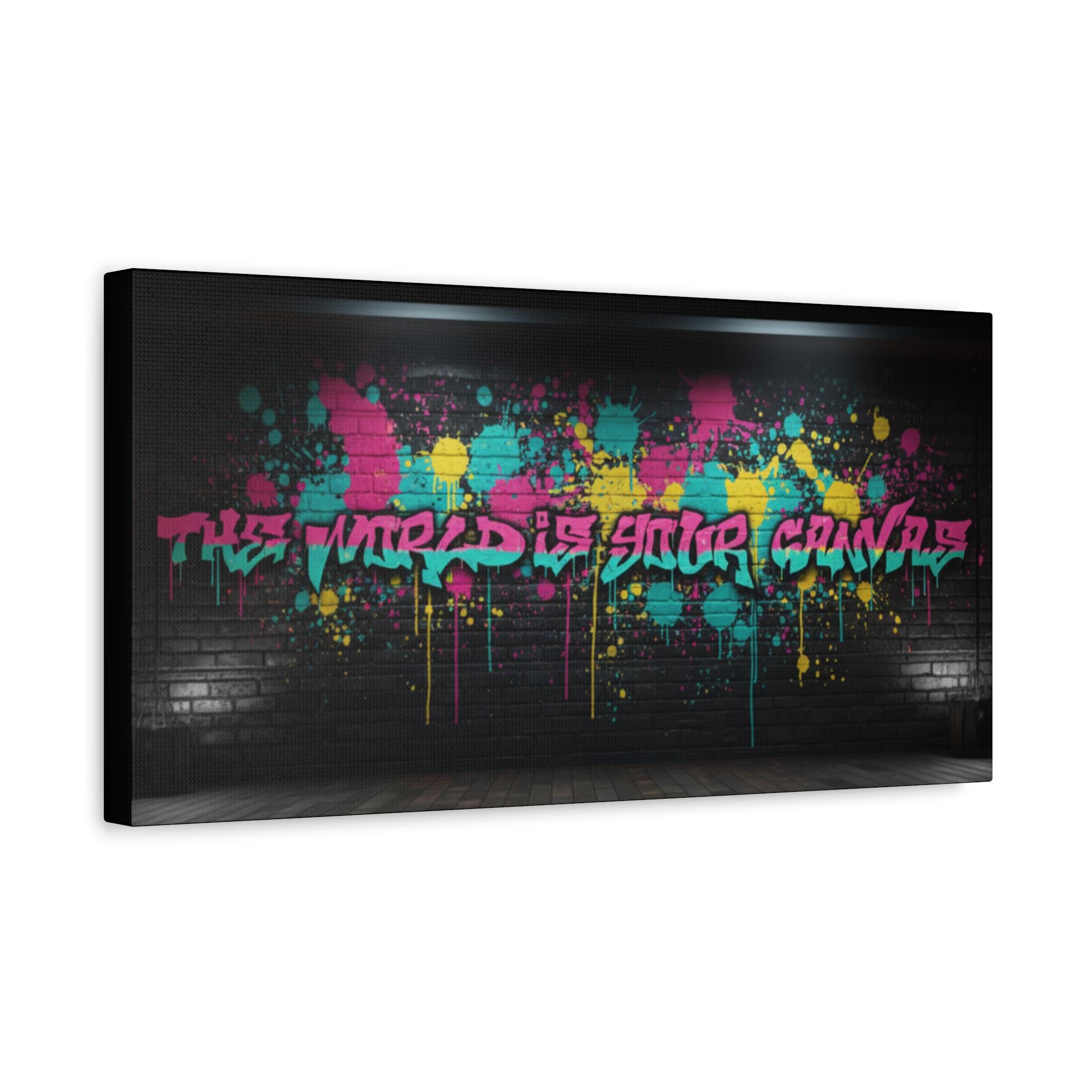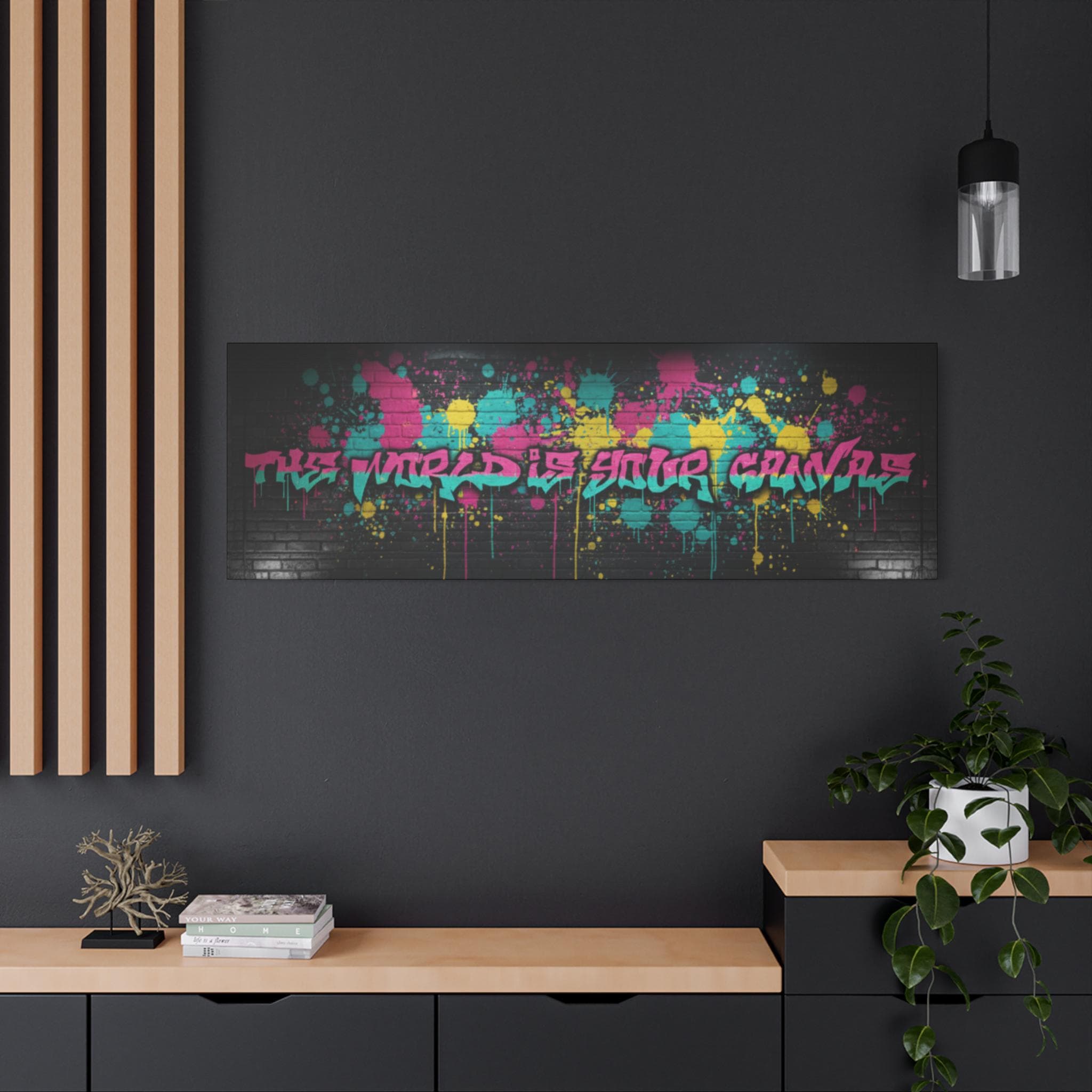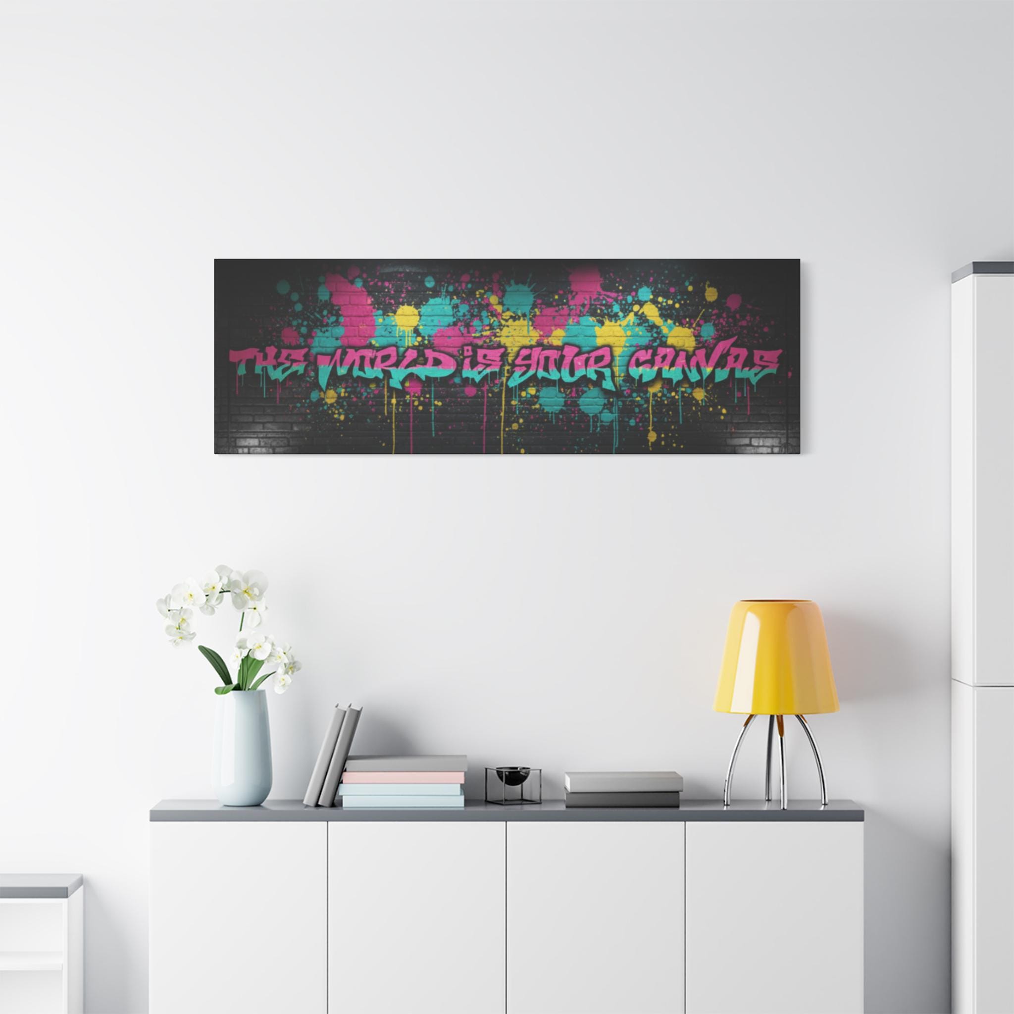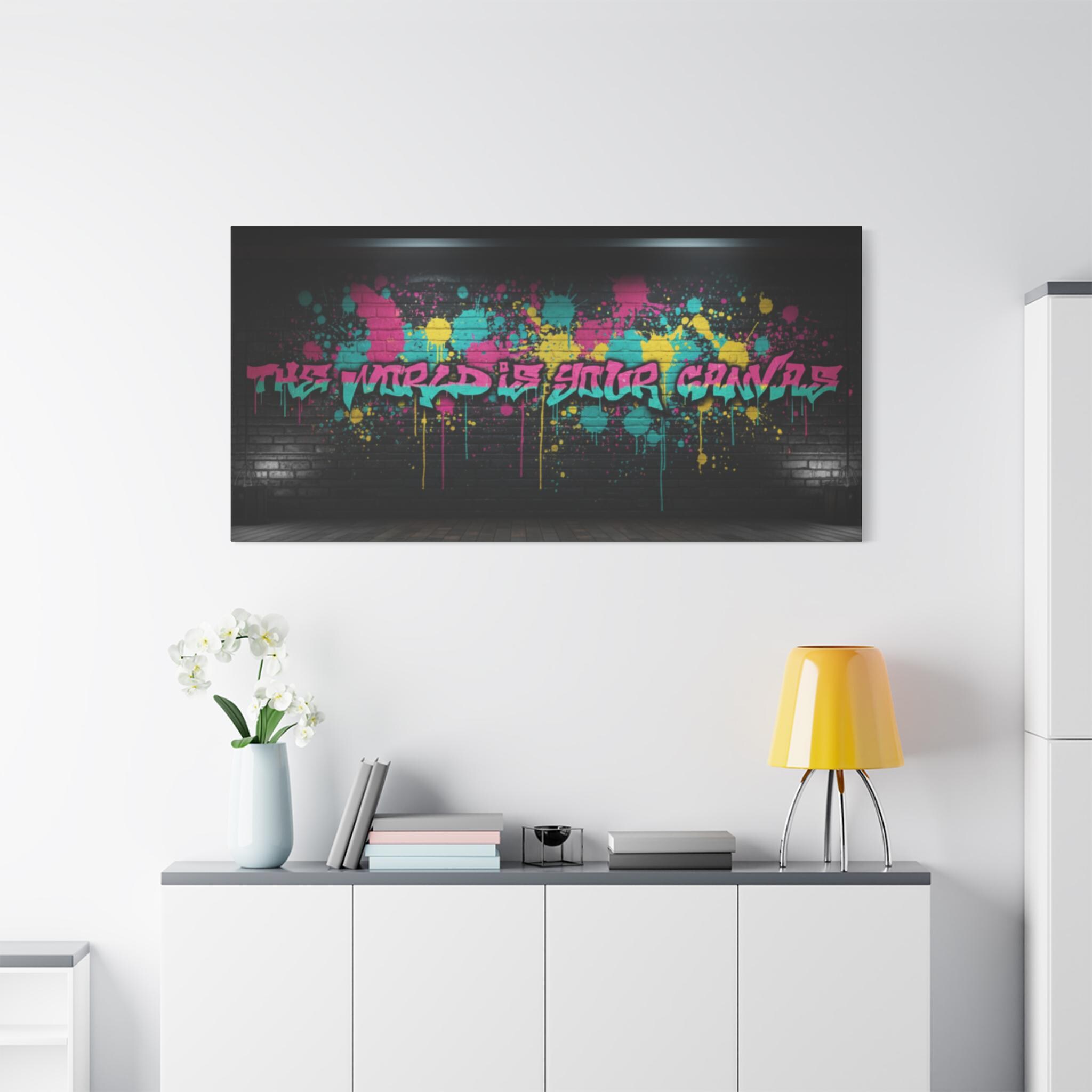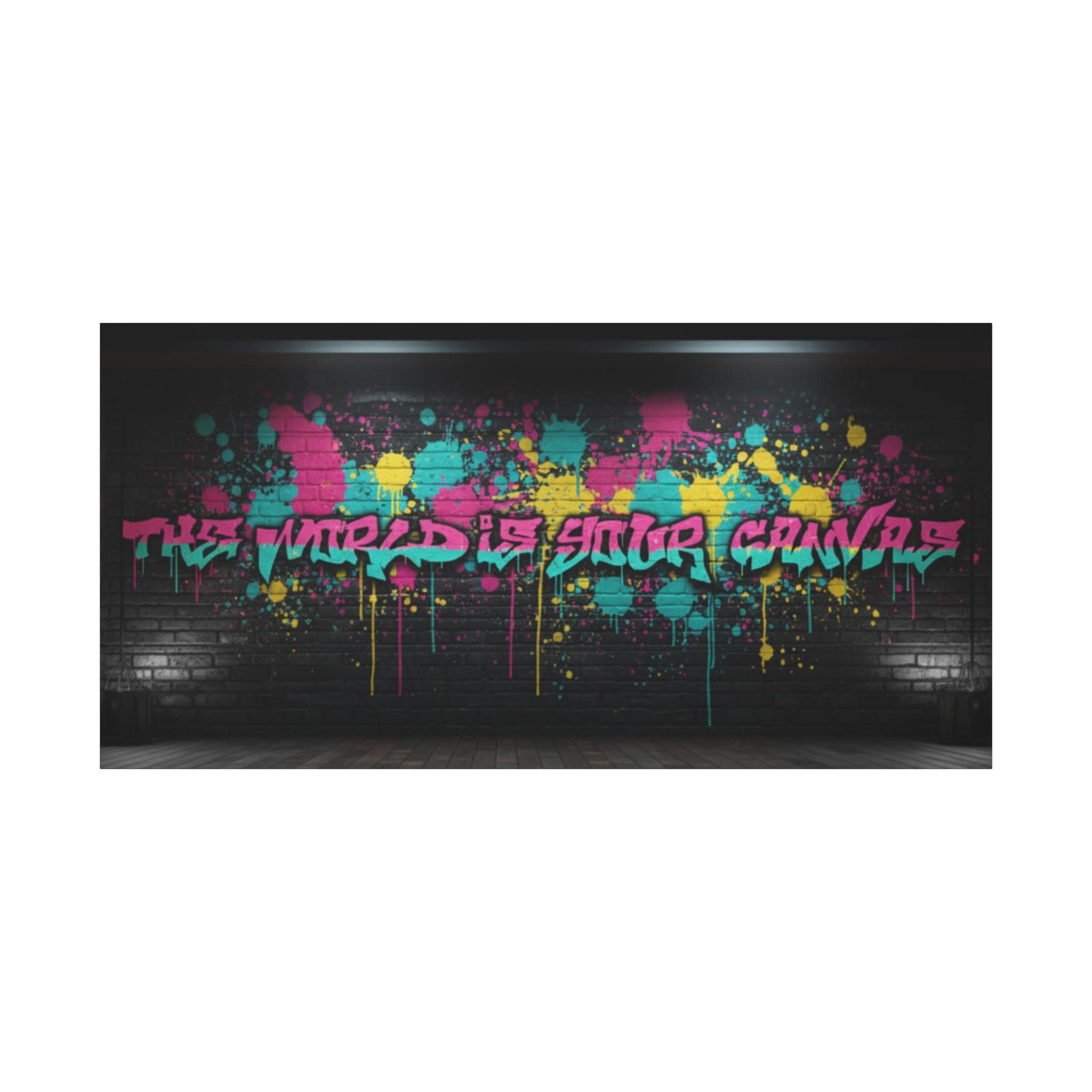 This stretched matte canvas brings raw street energy into your space with vivid splash colors and graffiti-style lettering against a moody brick backdrop. The 1.25" gallery edge gives it presence on the wall while the matte finish keeps glare low and colors deep. Imagine it anchoring a creative studio, music room, or loft—adding an urban pulse without shouting. The subtle texture of the canvas and the precise color reproduction make each paint drip and spray-pop feel tactile and alive. Hung above a console or behind a couch, it reads like a statement piece that belongs to someone who values bold design, late-night creativity, and the layered stories of city walls.