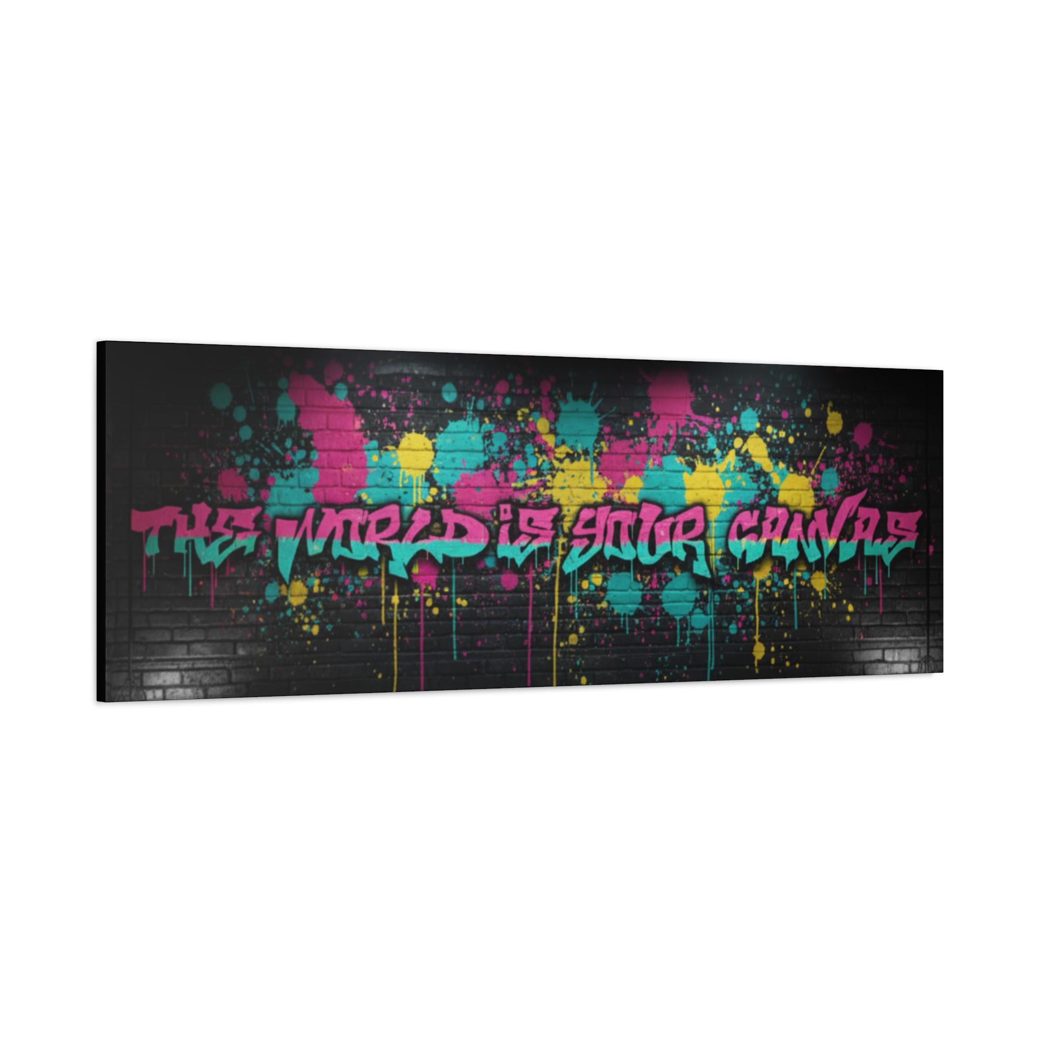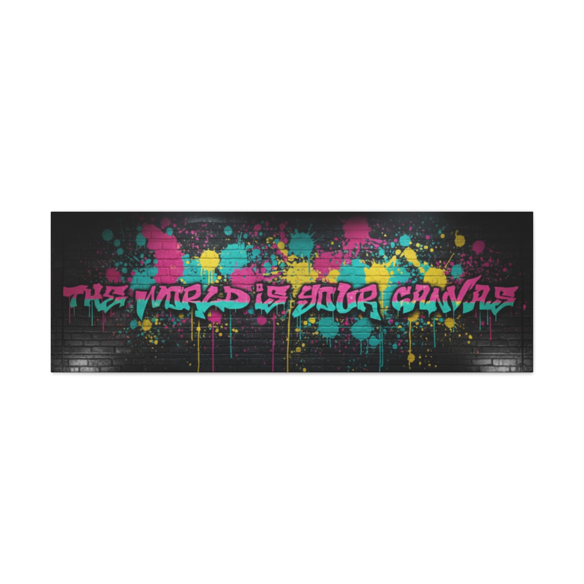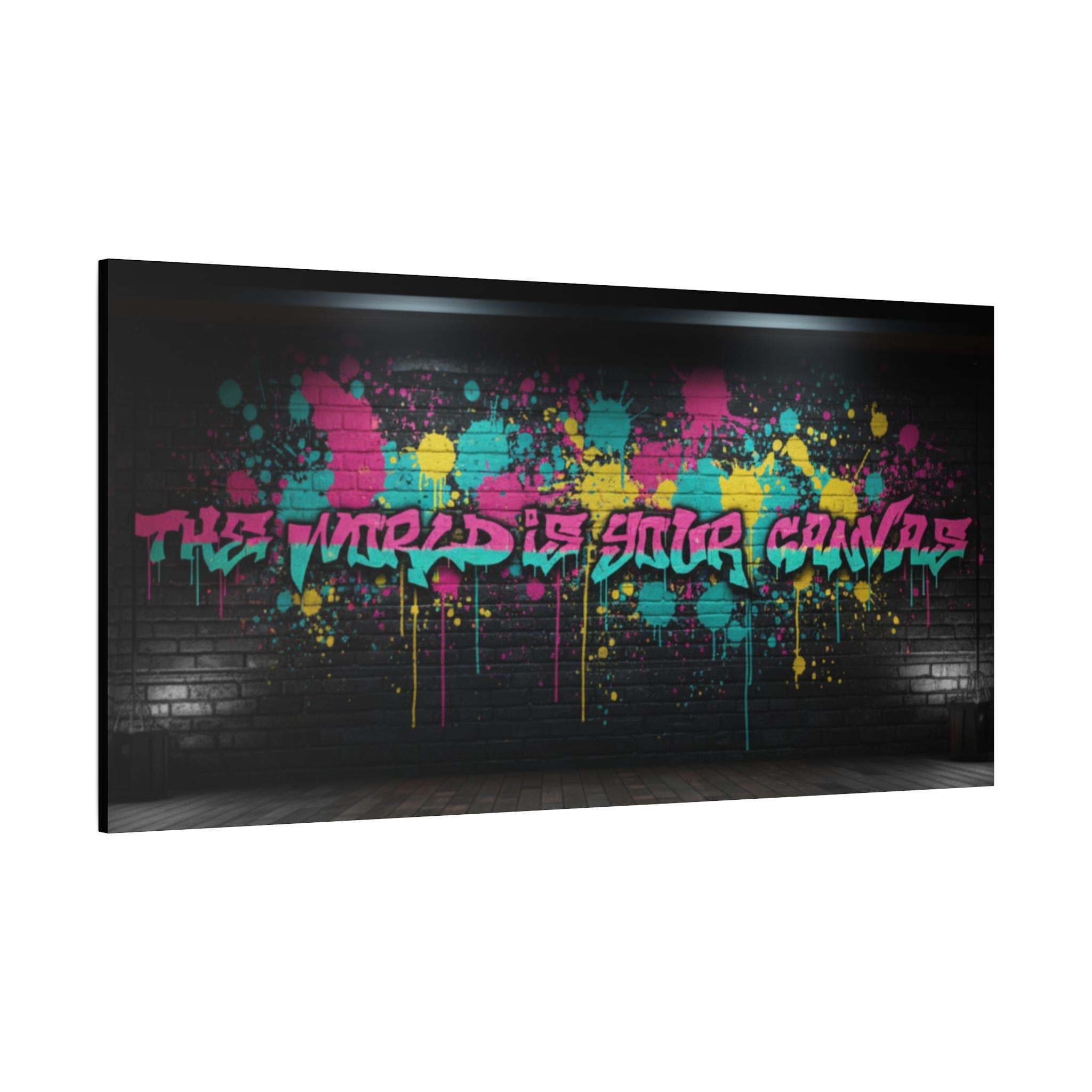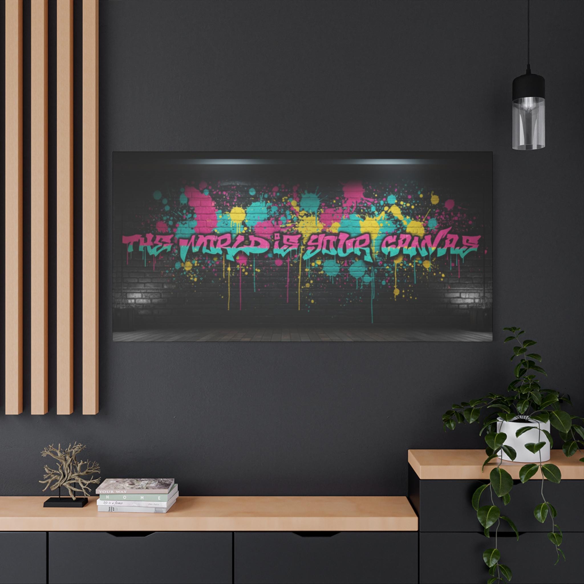 This stretched matte canvas brings raw street energy into your space with vivid splash colors and graffiti-style lettering against a moody brick backdrop. The 1.25" gallery edge gives it presence on the wall while the matte finish keeps glare low and colors deep. Imagine it anchoring a creative studio, music room, or loft—adding an urban pulse without shouting. The subtle texture of the canvas and the precise color reproduction make each paint drip and spray-pop feel tactile and alive. Hung above a console or behind a couch, it reads like a statement piece that belongs to someone who values bold design, late-night creativity, and the layered stories of city walls.