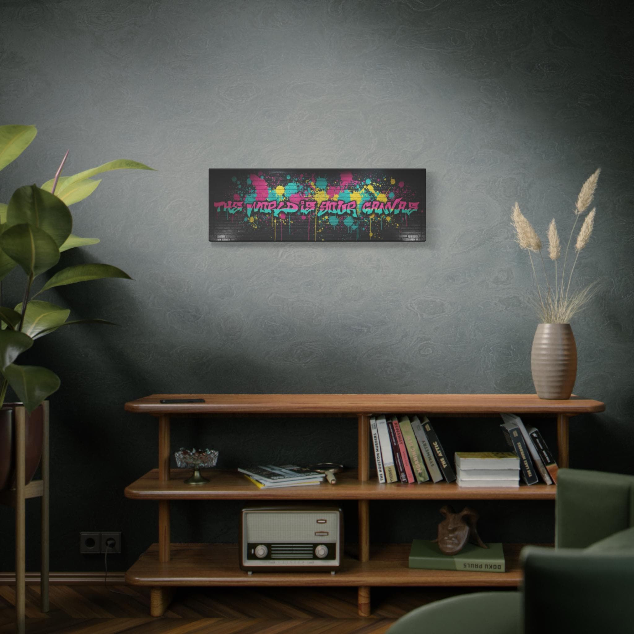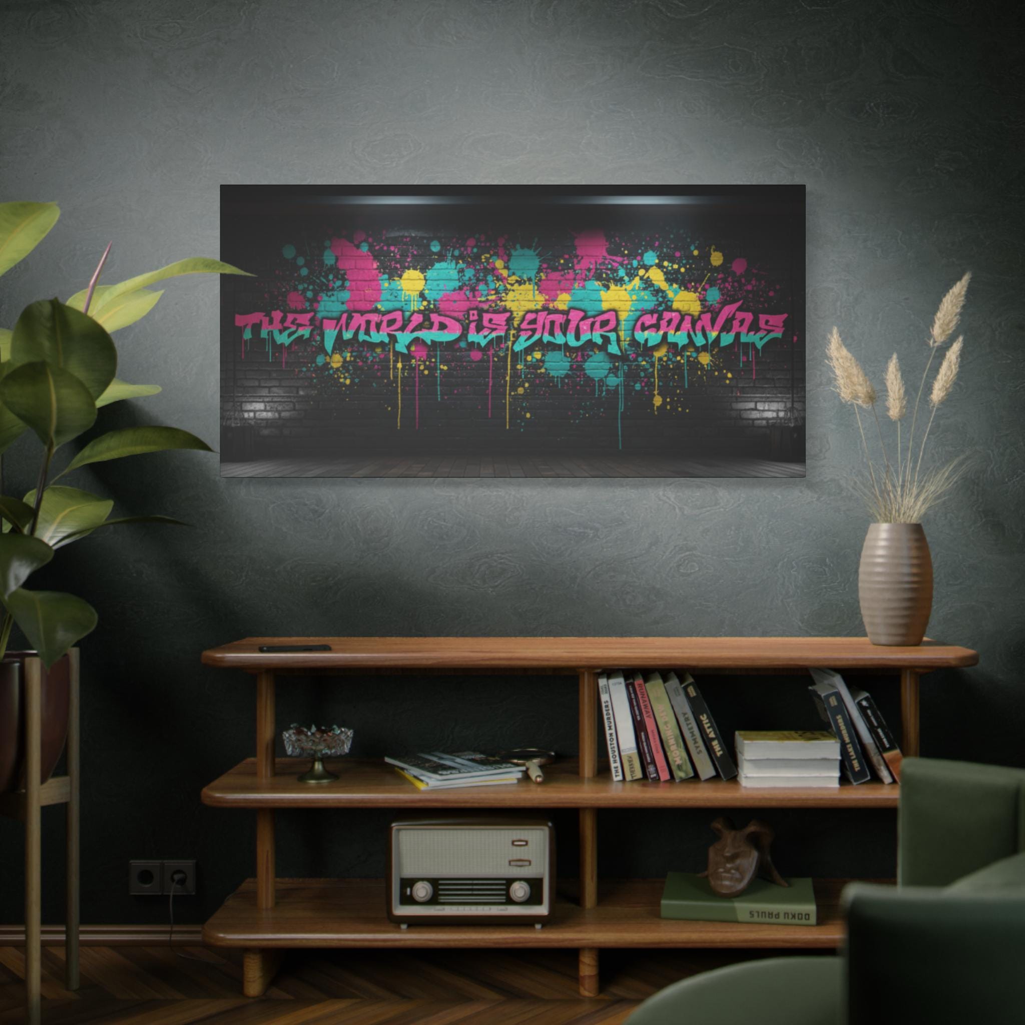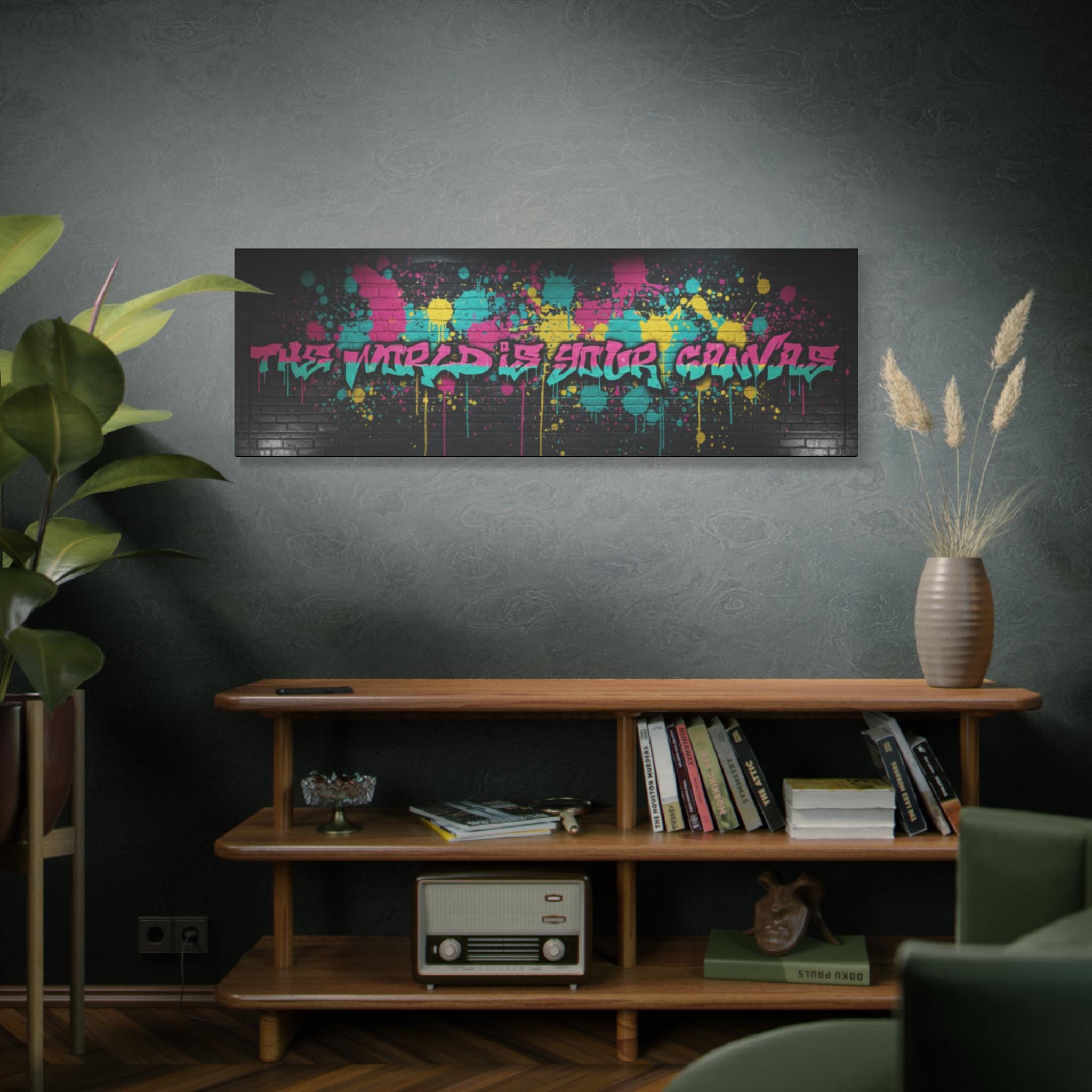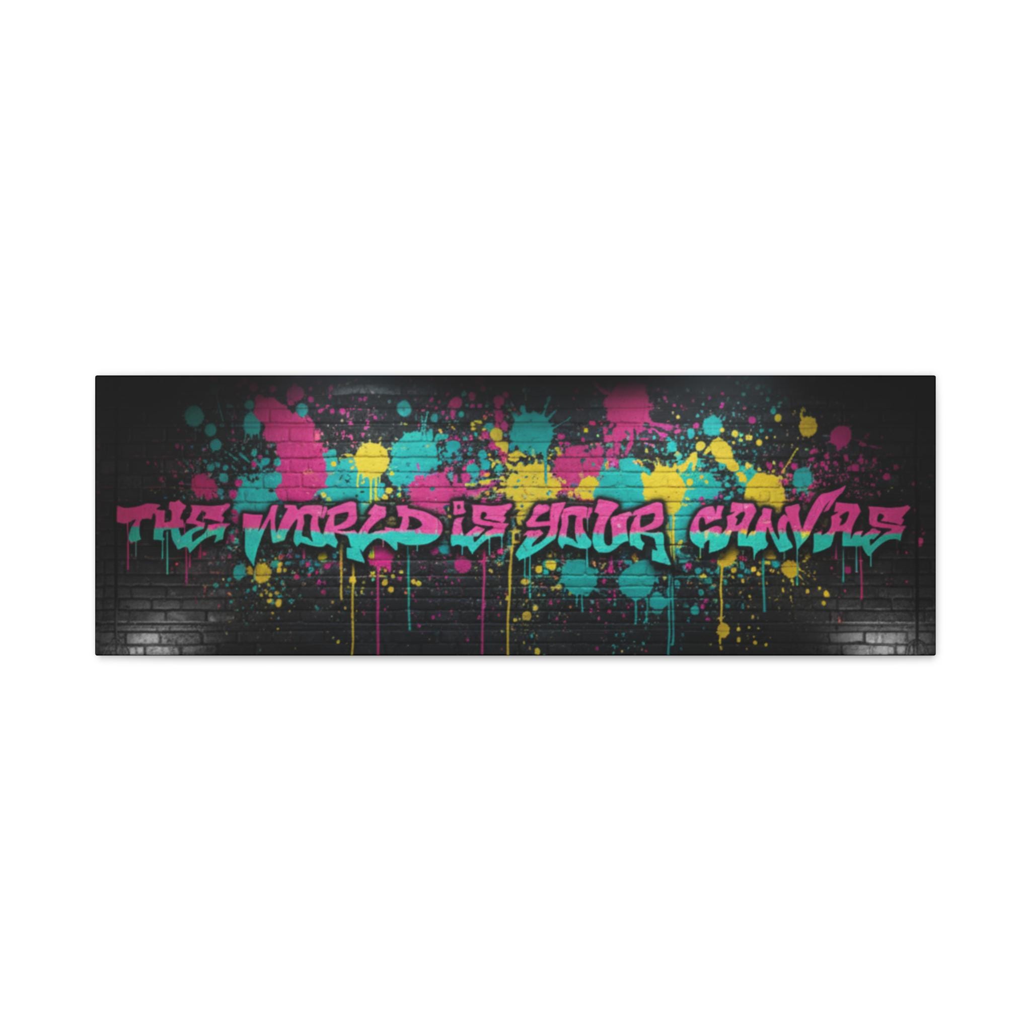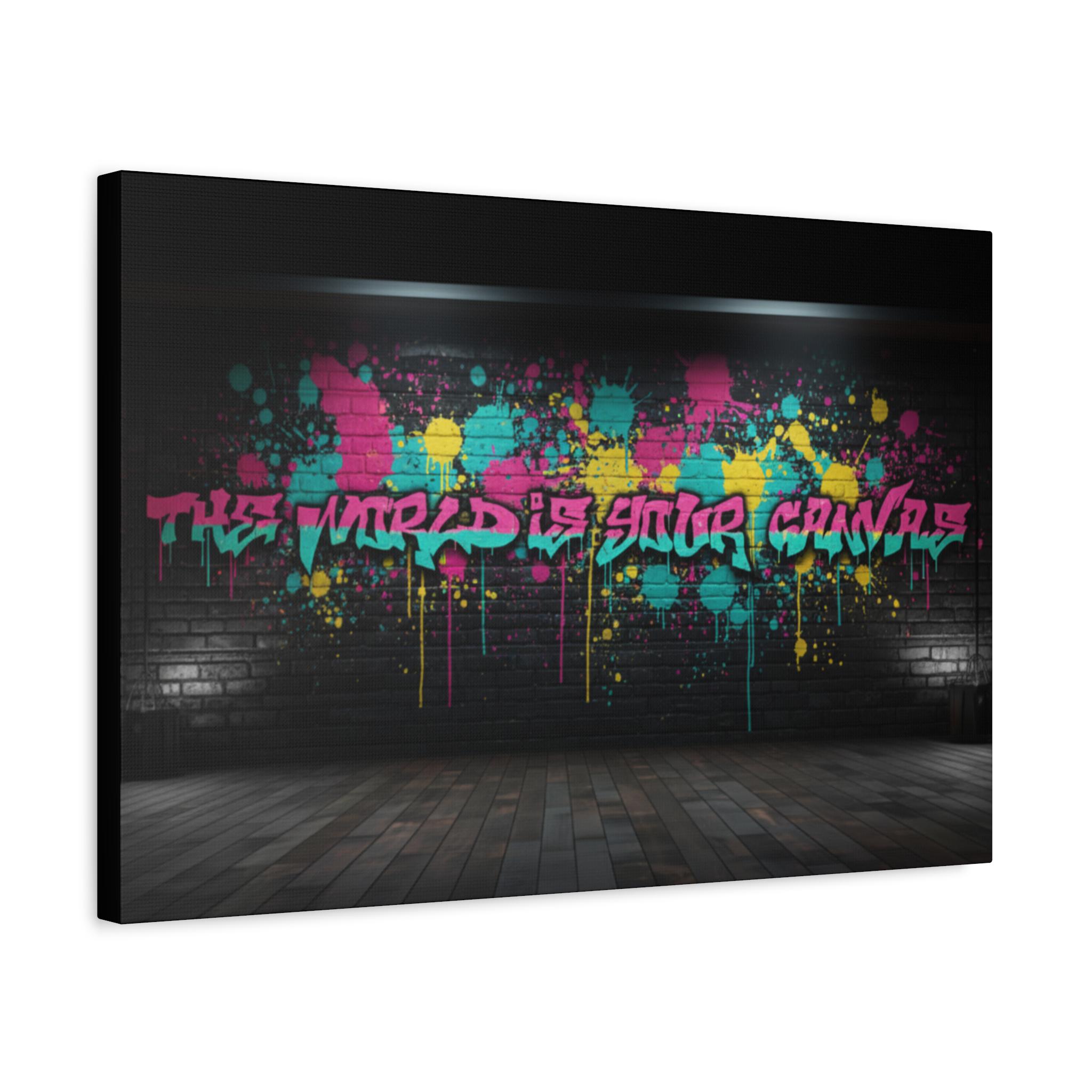 This stretched matte canvas brings raw street energy into your space with vivid splash colors and graffiti-style lettering against a moody brick backdrop. The 1.25" gallery edge gives it presence on the wall while the matte finish keeps glare low and colors deep. Imagine it anchoring a creative studio, music room, or loft—adding an urban pulse without shouting. The subtle texture of the canvas and the precise color reproduction make each paint drip and spray-pop feel tactile and alive. Hung above a console or behind a couch, it reads like a statement piece that belongs to someone who values bold design, late-night creativity, and the layered stories of city walls.