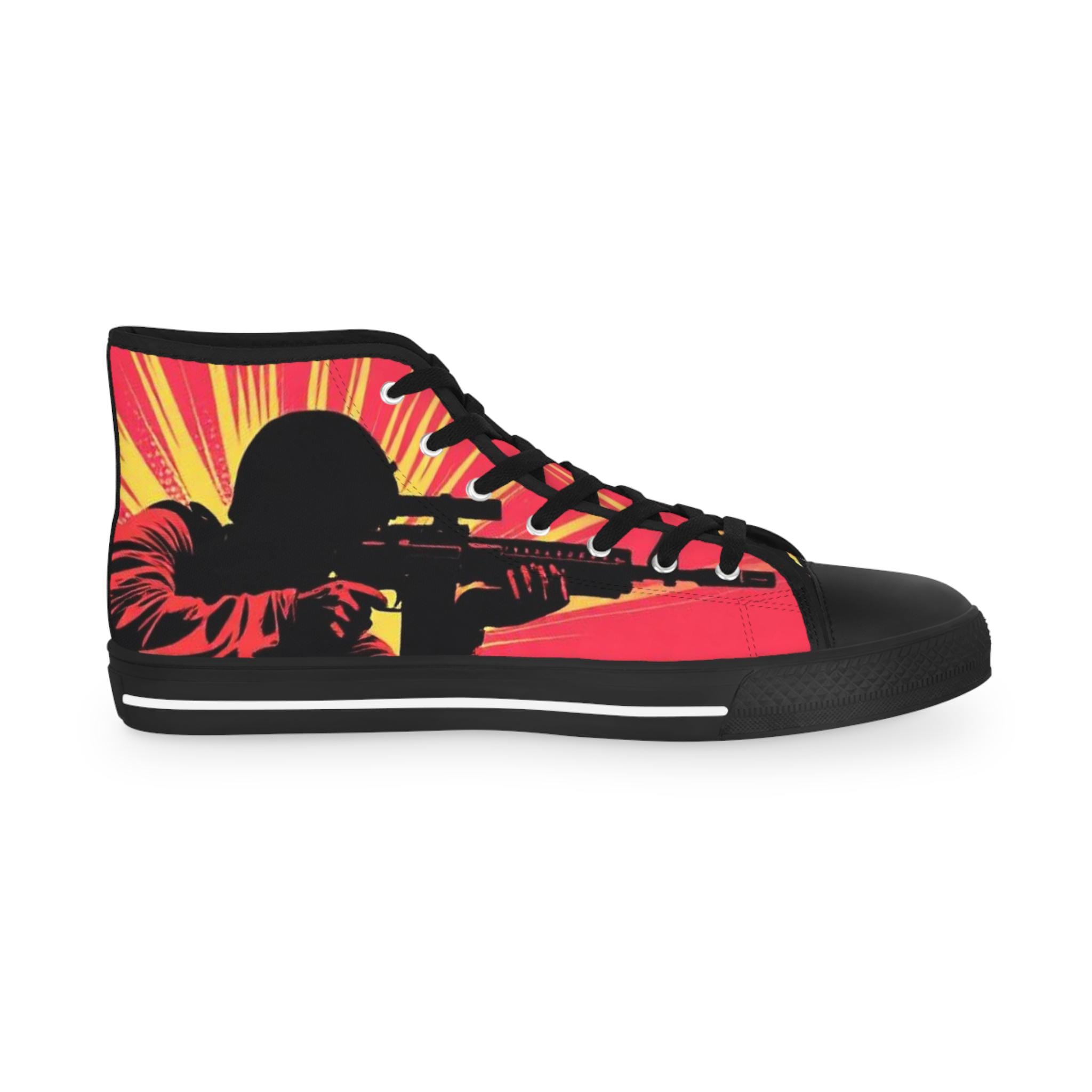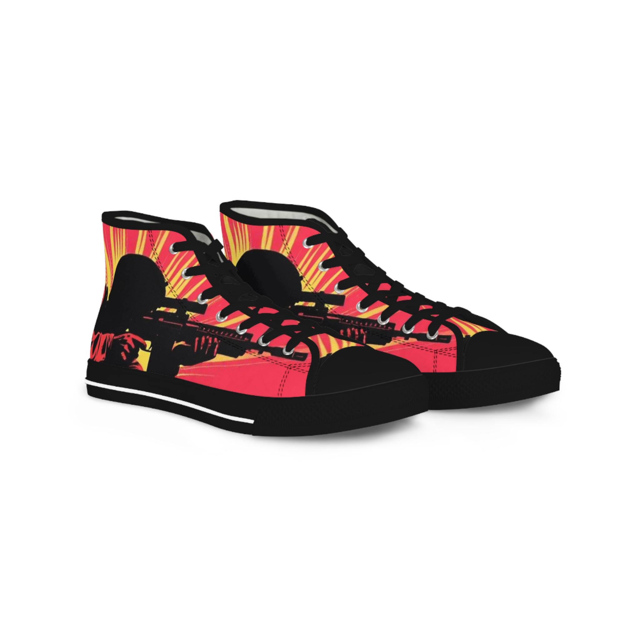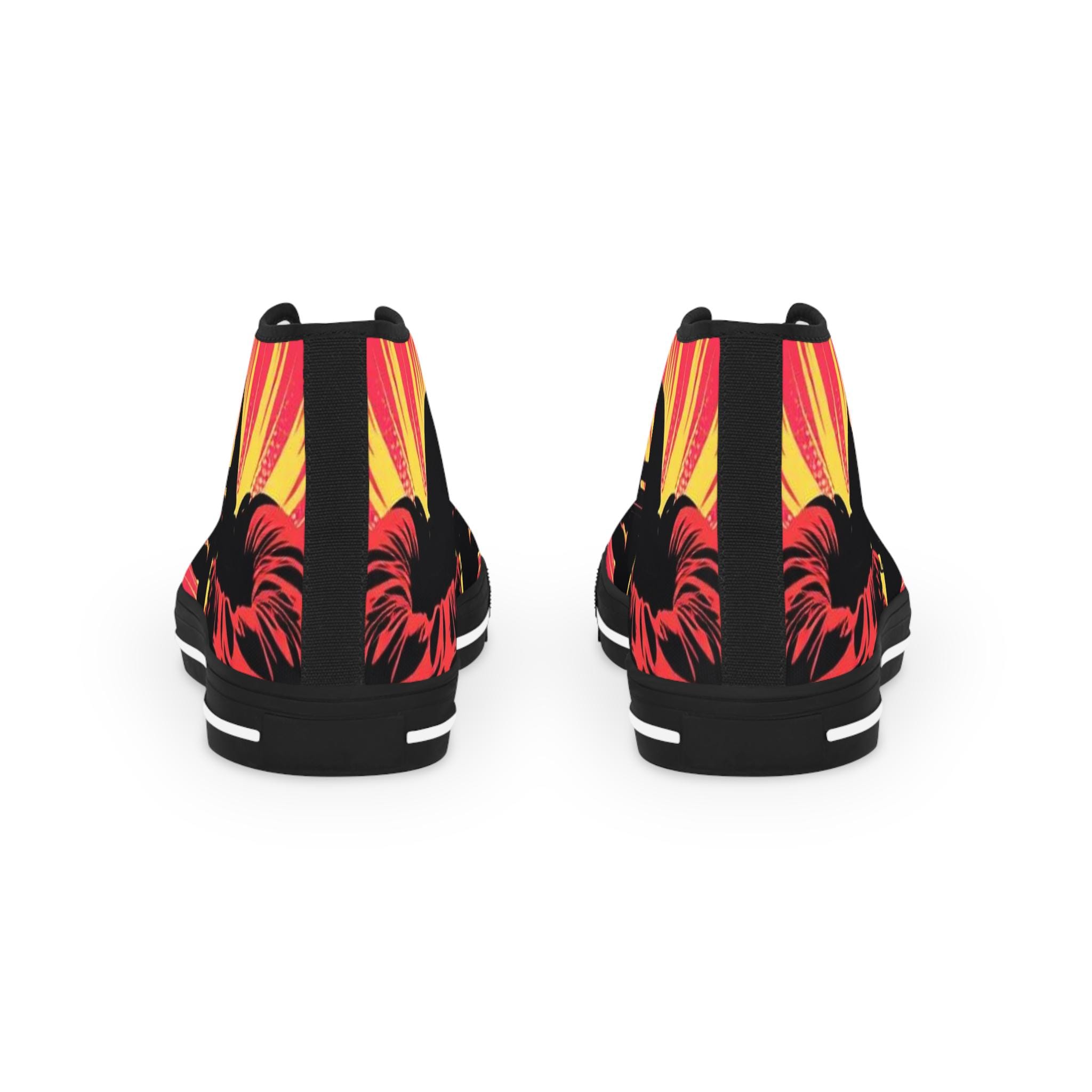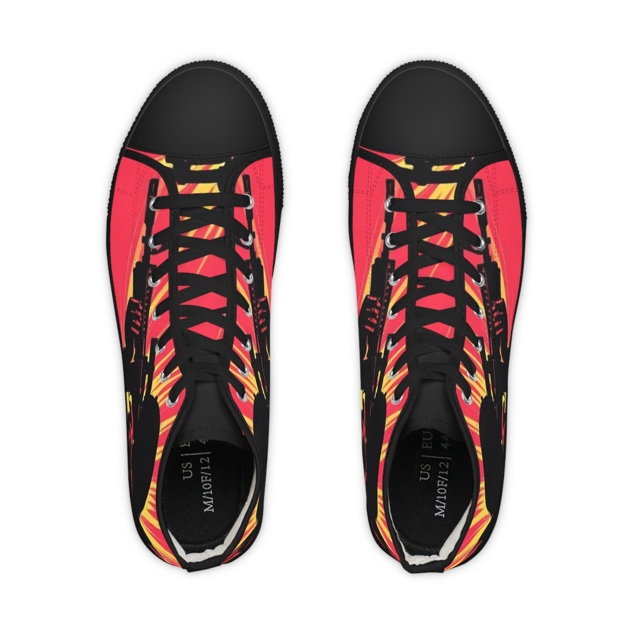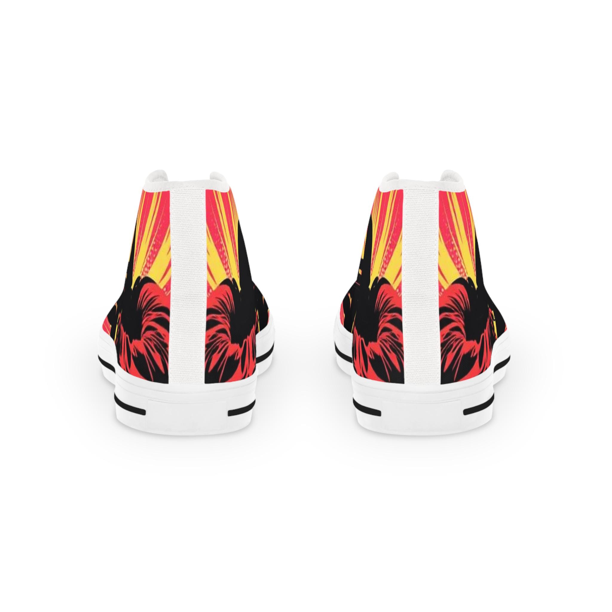 These high-top canvas sneakers carry bold, sunset energy—vivid reds and oranges burst behind a striking silhouetted figure for a street-ready look that stops traffic. The full wraparound print covers both sides and the tongue, turning every step into a statement. Built with breathable polyester canvas, a pleather-reinforced toe, and EVA memory foam insoles, they balance eye-catching style with lightweight, shock-absorbing comfort. Metal eyelets and a durable rubber outsole add lasting wear, while black and white accents keep the graphic grounded. Slip them on for late-night gigs, urban exploring, or days when you want your footwear to do the talking.