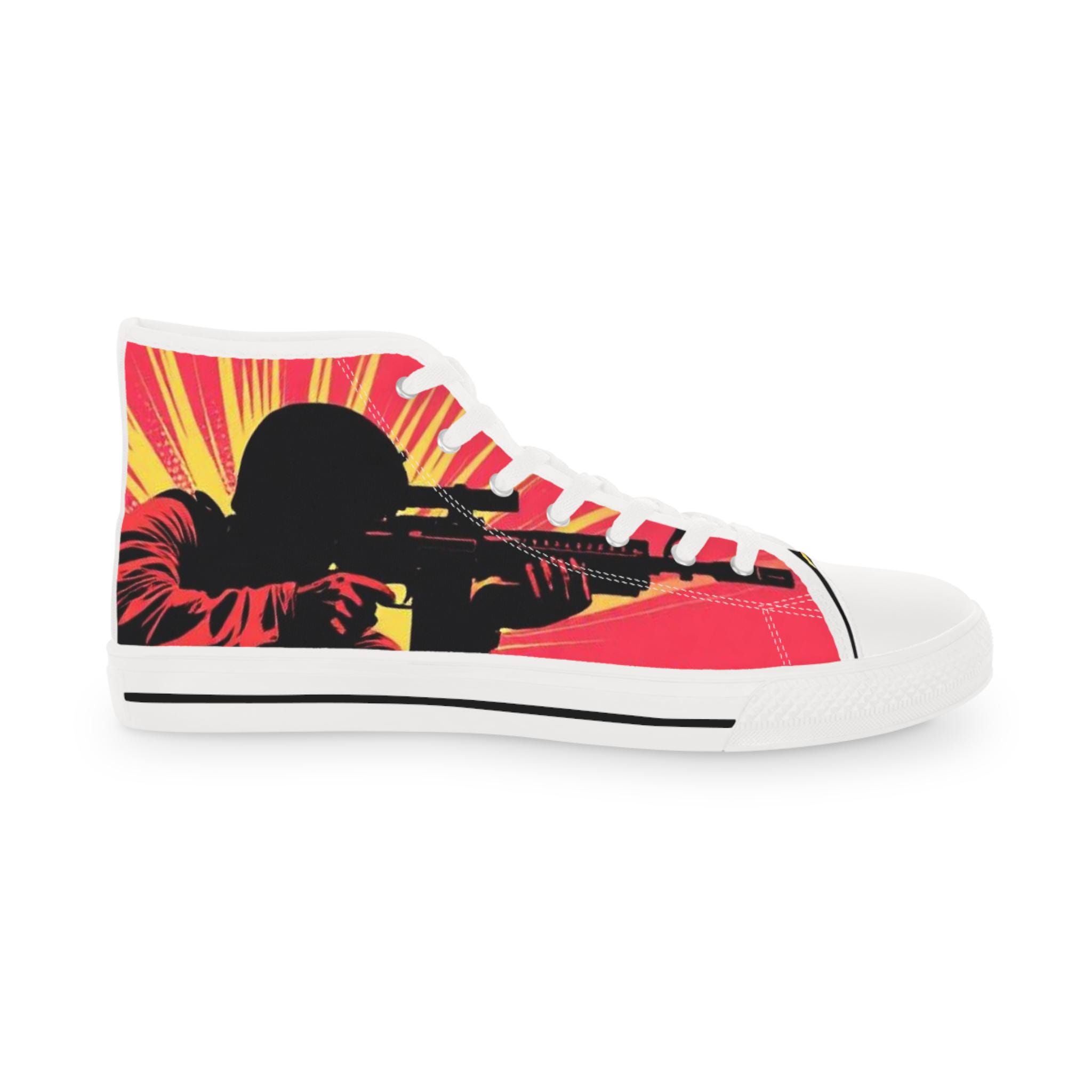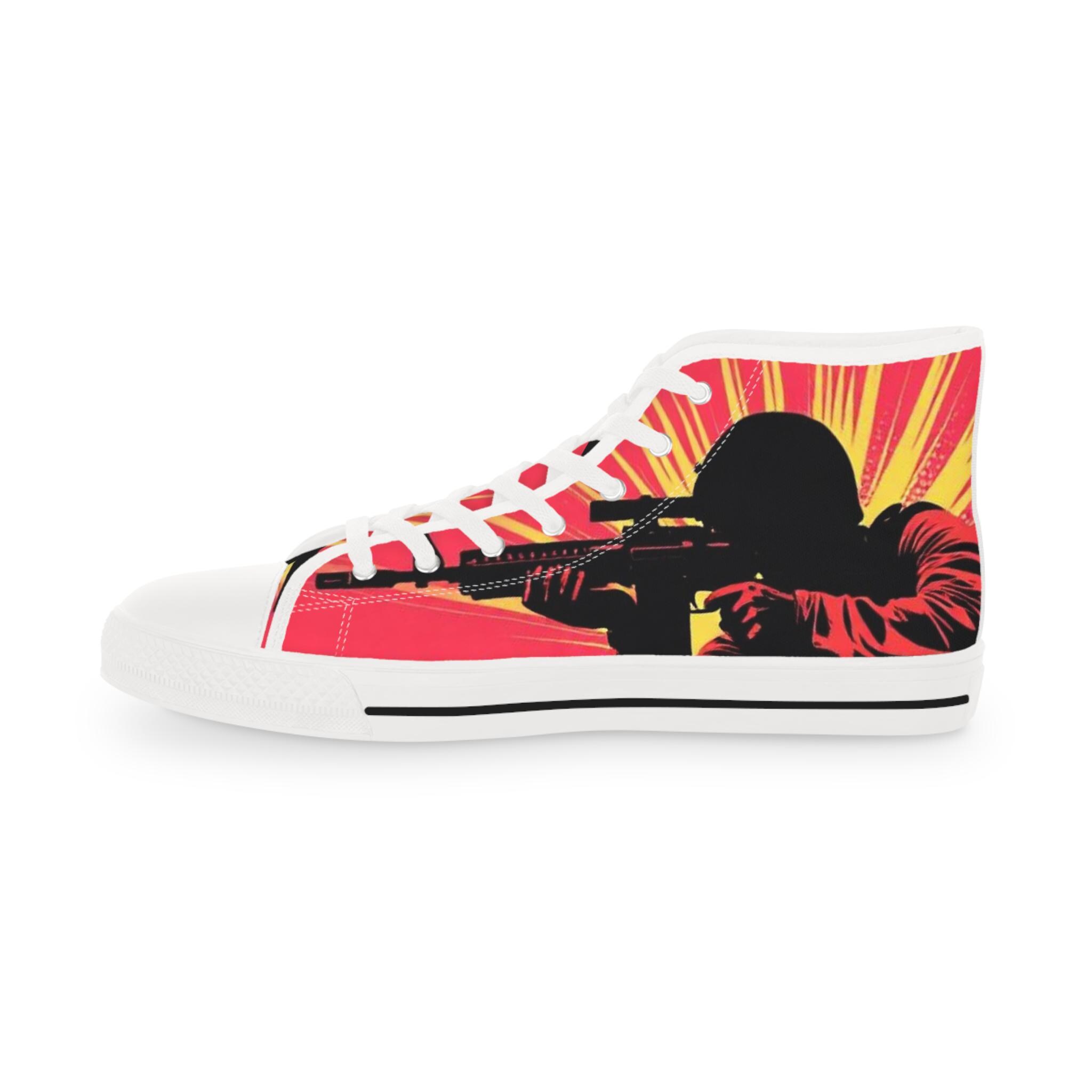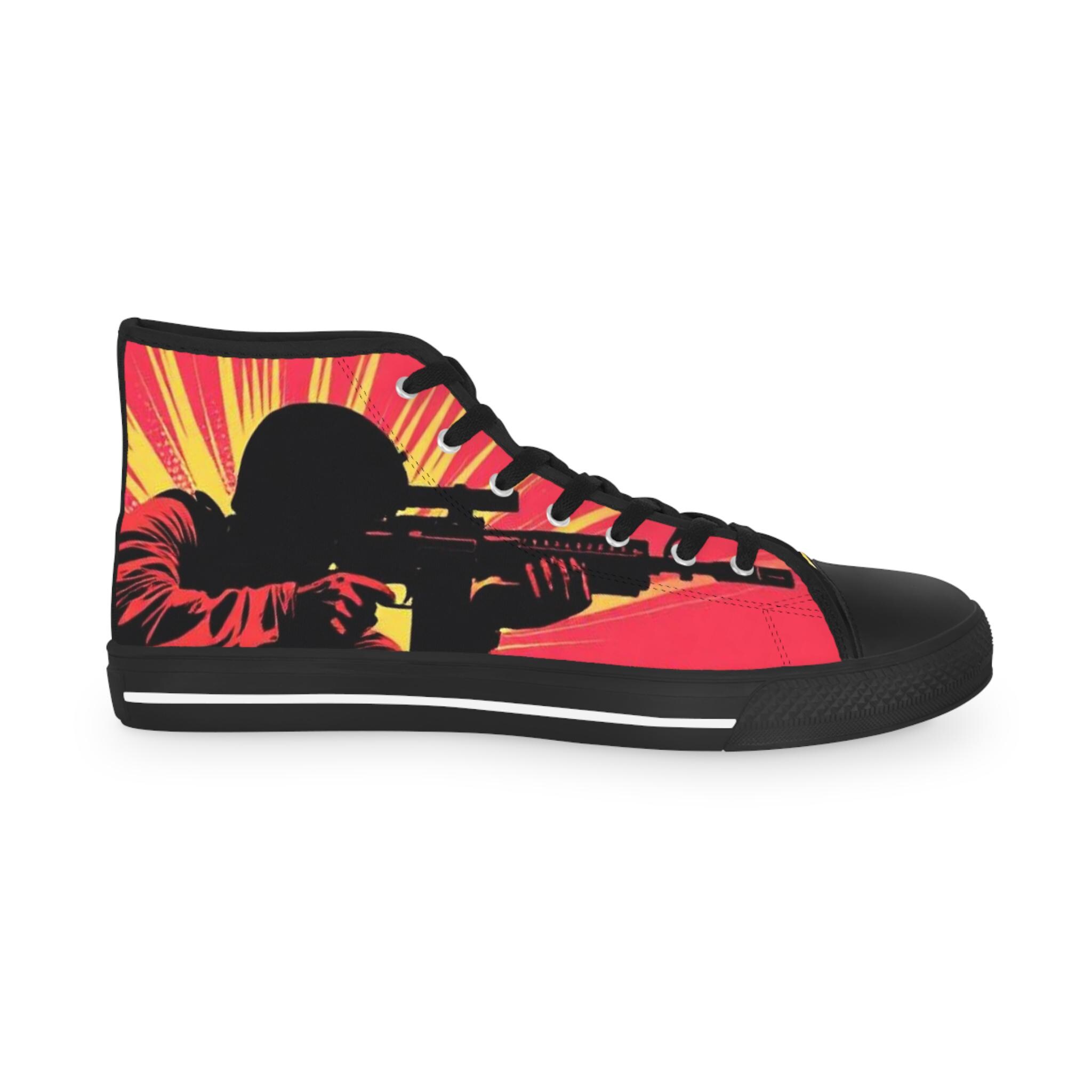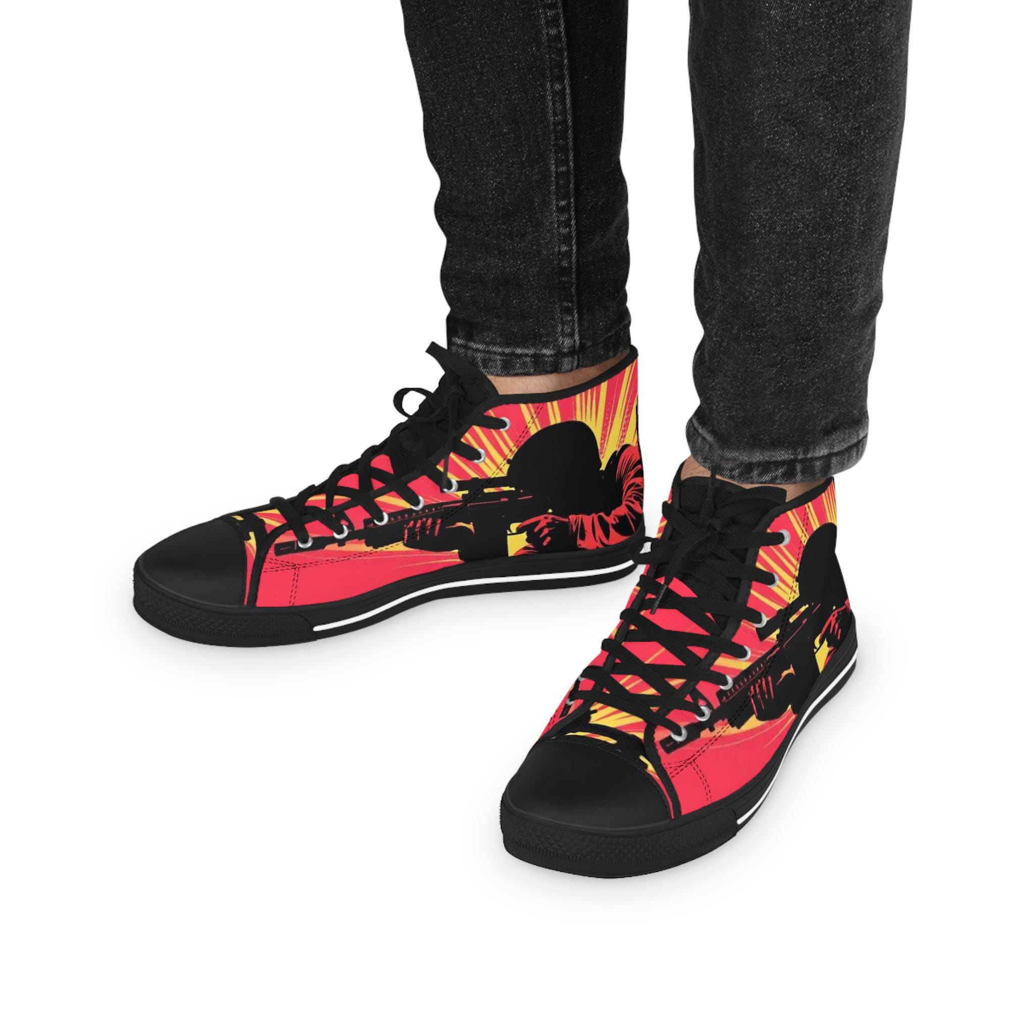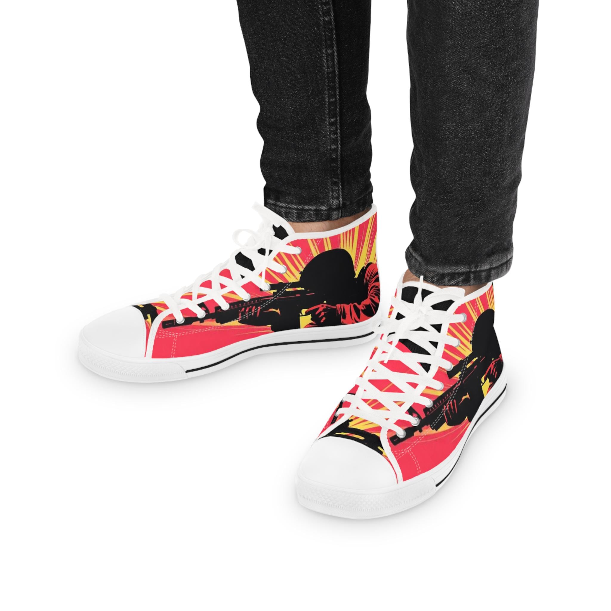 These high-top canvas sneakers carry bold, sunset energy—vivid reds and oranges burst behind a striking silhouetted figure for a street-ready look that stops traffic. The full wraparound print covers both sides and the tongue, turning every step into a statement. Built with breathable polyester canvas, a pleather-reinforced toe, and EVA memory foam insoles, they balance eye-catching style with lightweight, shock-absorbing comfort. Metal eyelets and a durable rubber outsole add lasting wear, while black and white accents keep the graphic grounded. Slip them on for late-night gigs, urban exploring, or days when you want your footwear to do the talking.