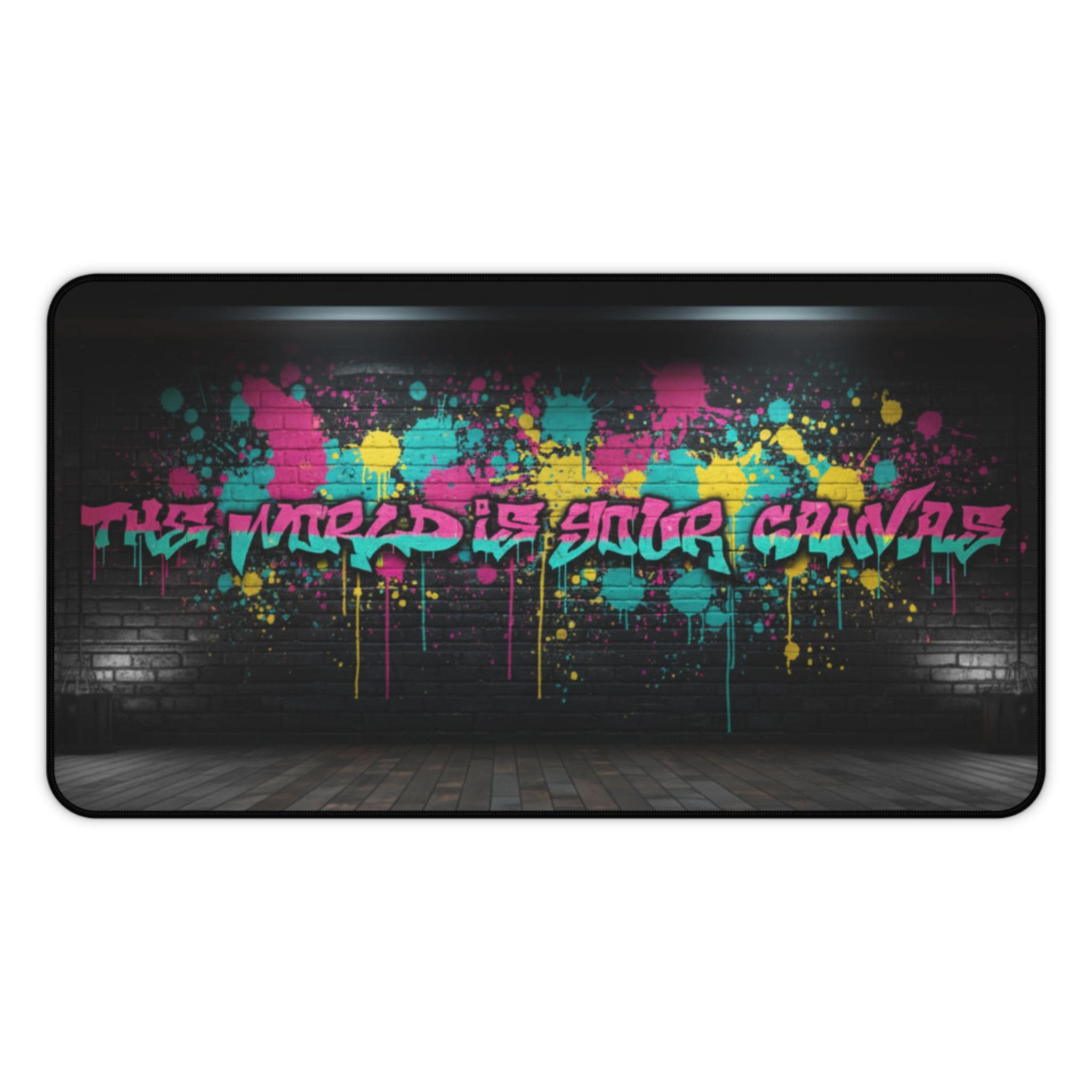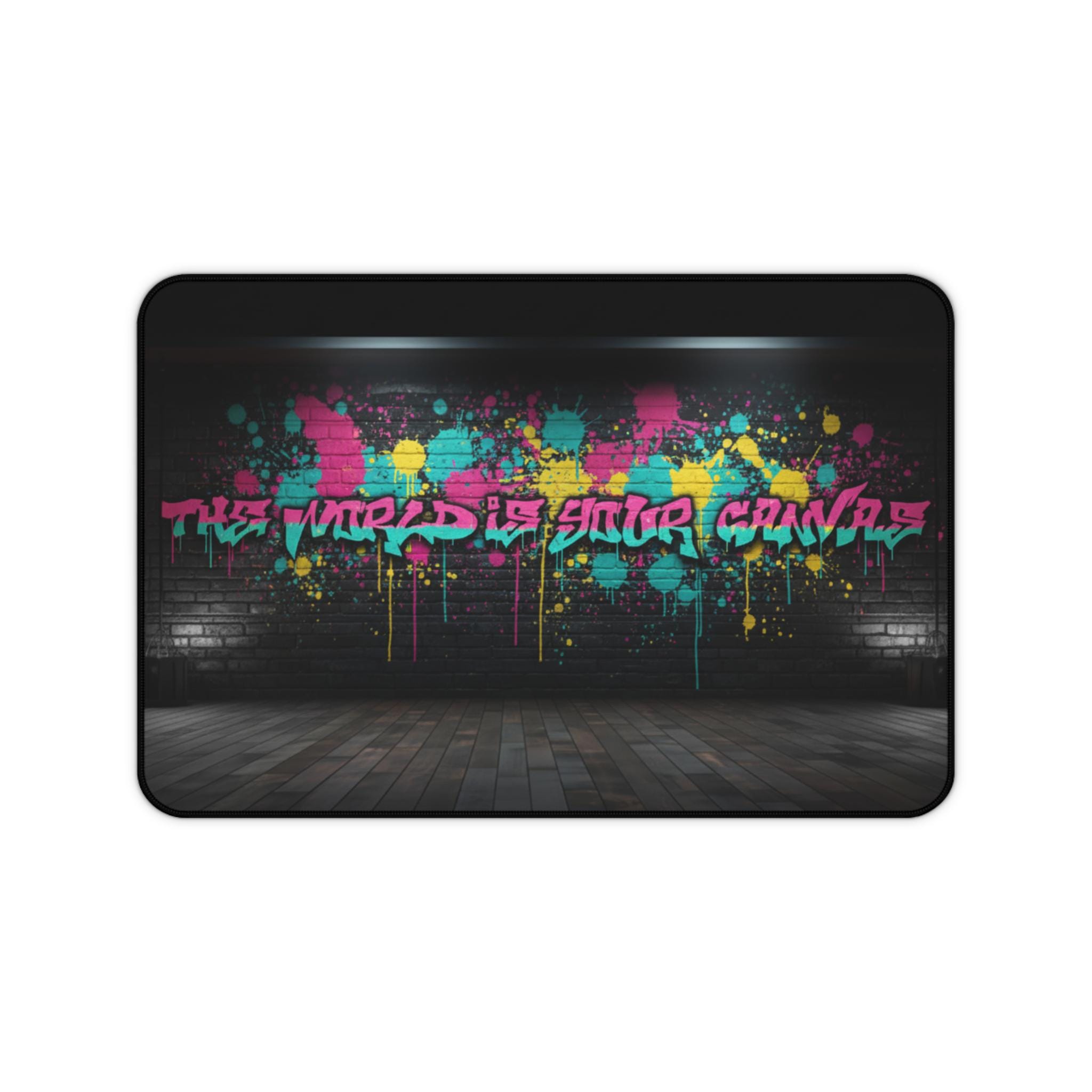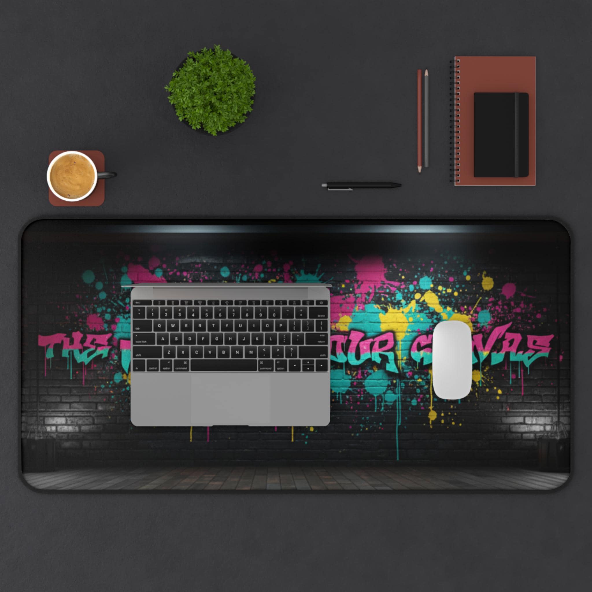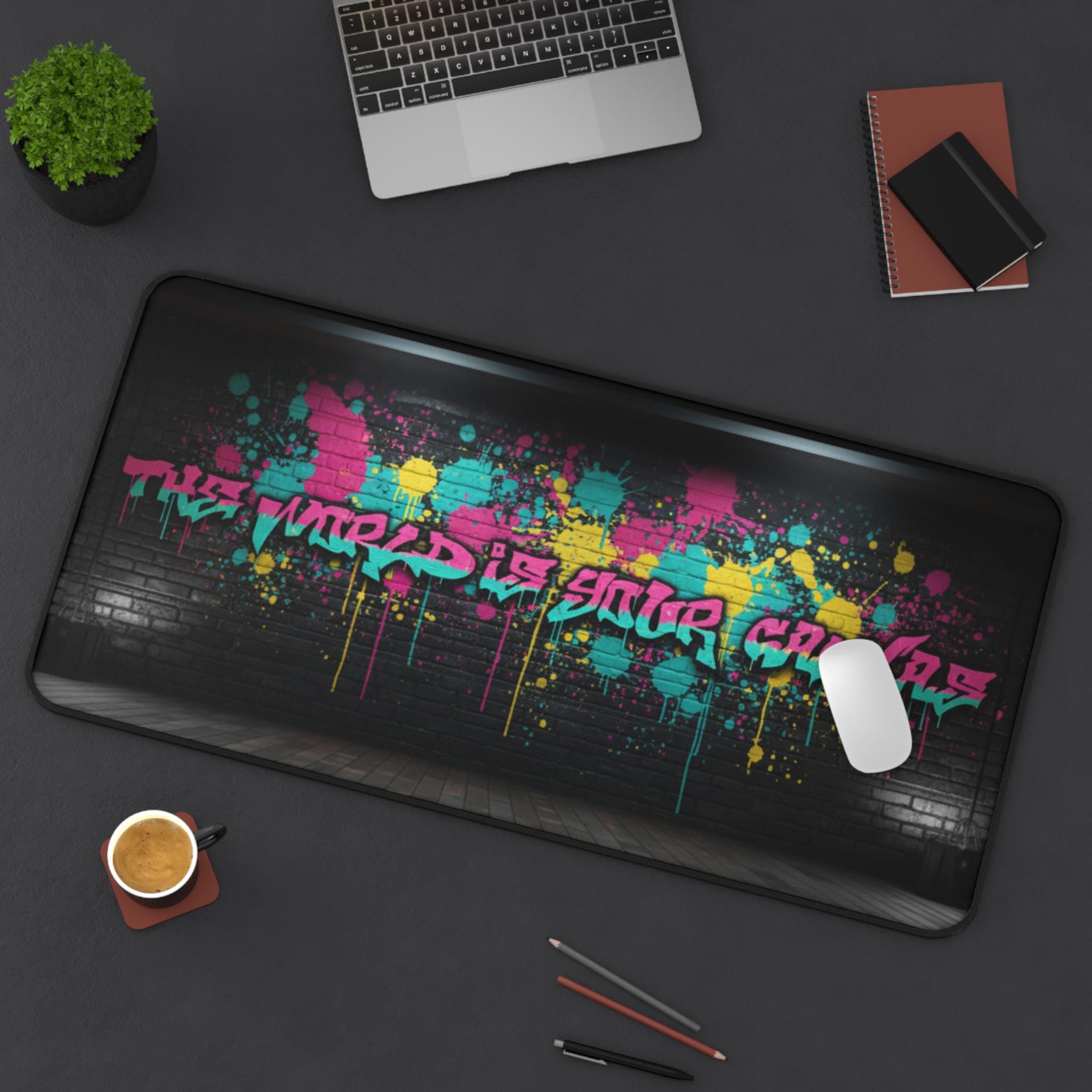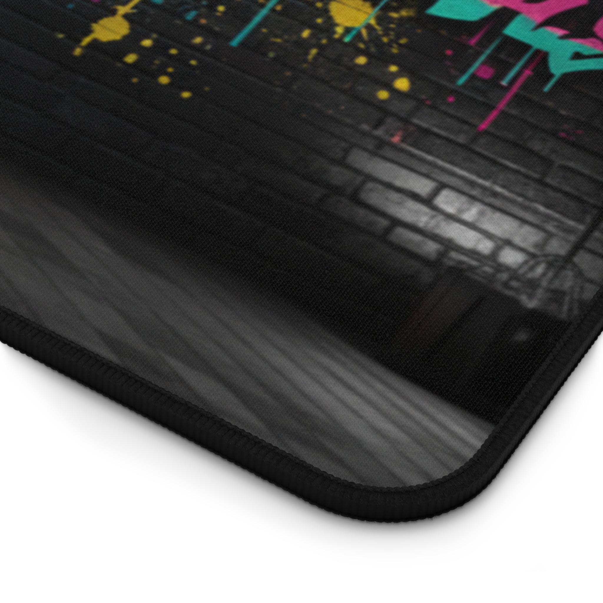Turn your workspace into a creative alley with this neoprene desk mat. The mural-like graffiti print—dripping neon cyan, magenta, and yellow against a shadowy brick backdrop—brings energy without overwhelming the room. Smooth, vibrant print on a durable surface makes writing, typing, and crafting feel deliberate and comfortable. The anti-slip neoprene base and hemmed edges hold everything steady and keep the mat looking sharp through long hours and daily use. Choose a size that fits your setup and let the scene anchor your focus while you work, play, or design.