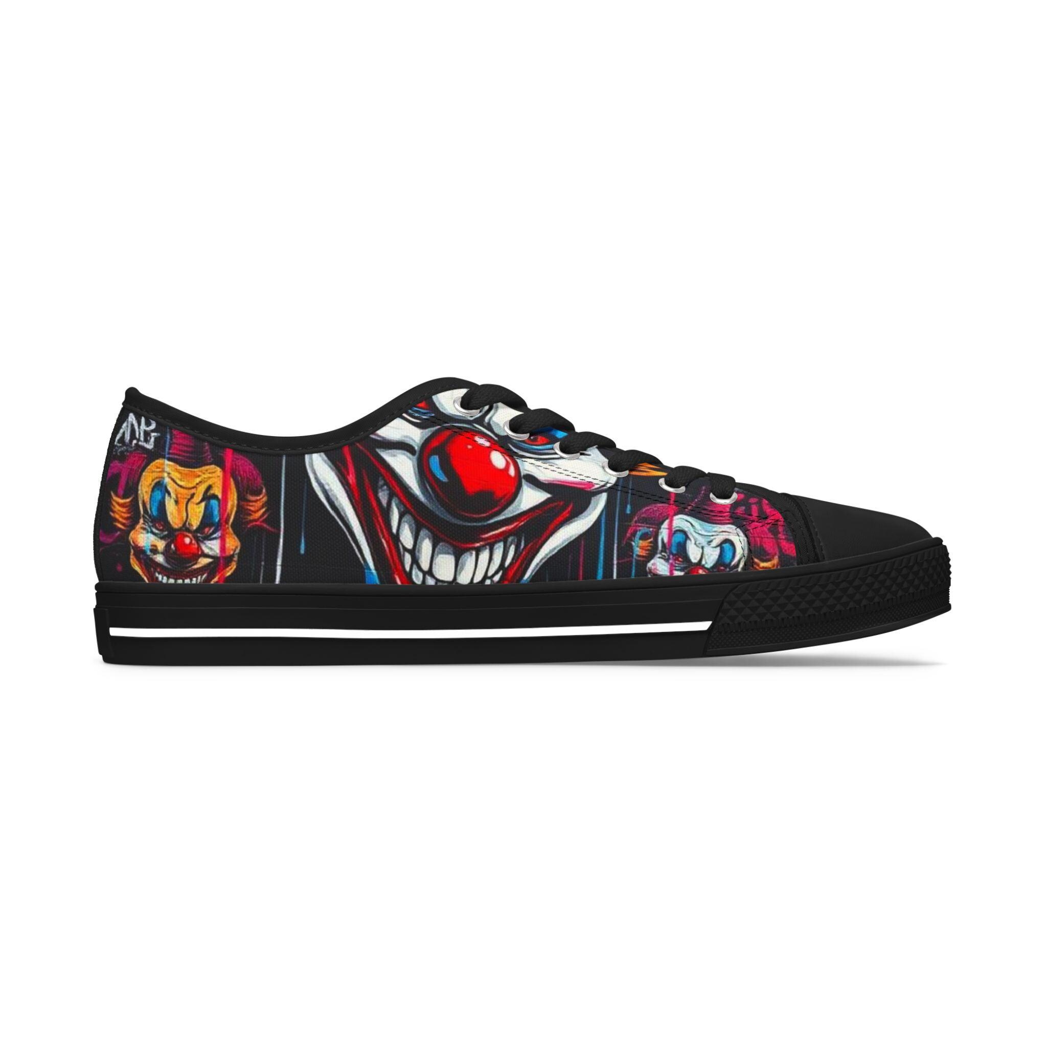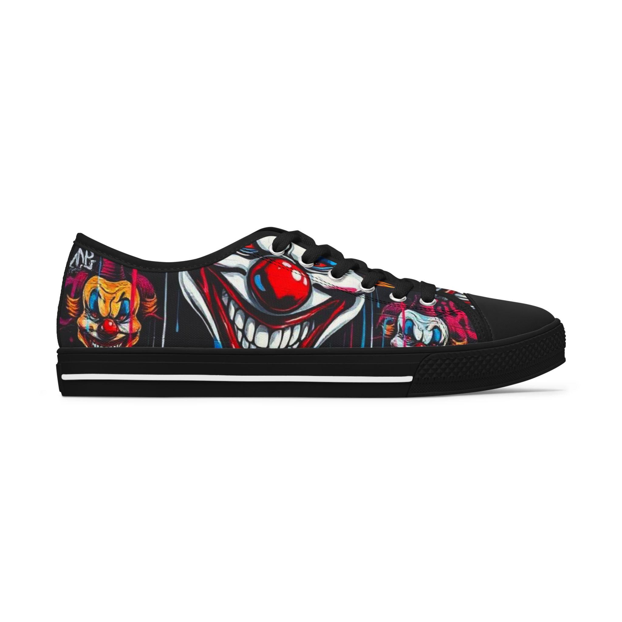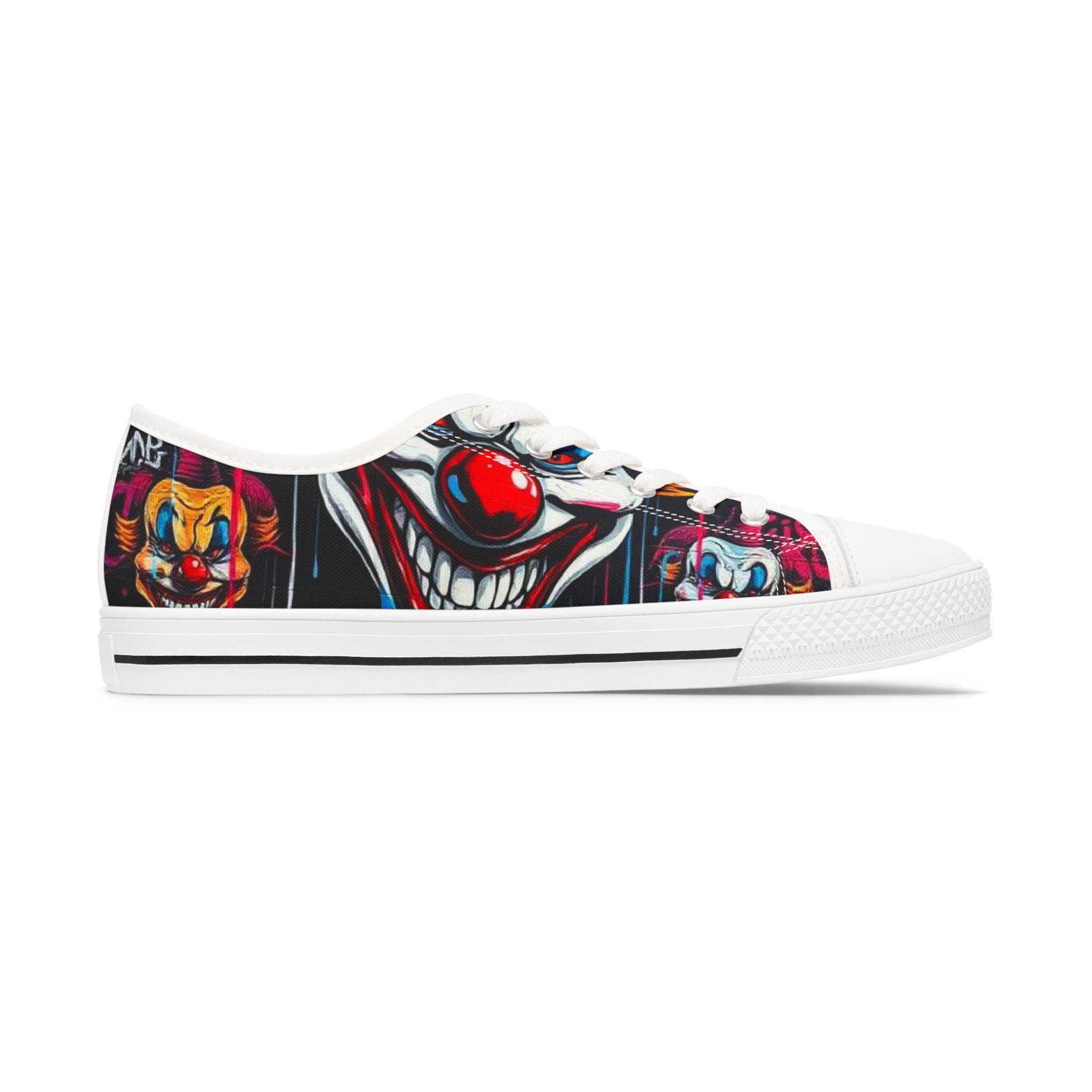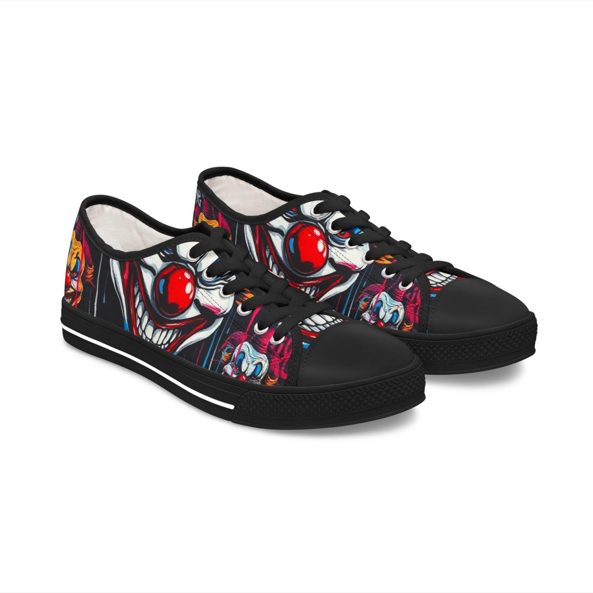 Step into a bold, playful world with these low-top sneakers that turn every sidewalk into a stage. The wraparound print features vibrant, mischievous clown art—bright reds, deep shadows, and pops of color that draw the eye from toe to heel. Built on lightweight EVA soles and cushioned memory-foam insoles, they feel springy on the first step and stay comfortable through long days out. The black pleather toe and metal eyelets add toughness where shoes take the most wear, while breathable polyester canvas keeps feet cool. These sneakers bring personality to festival outfits, late-night city walks, or any day you want to wear something with attitude and character.