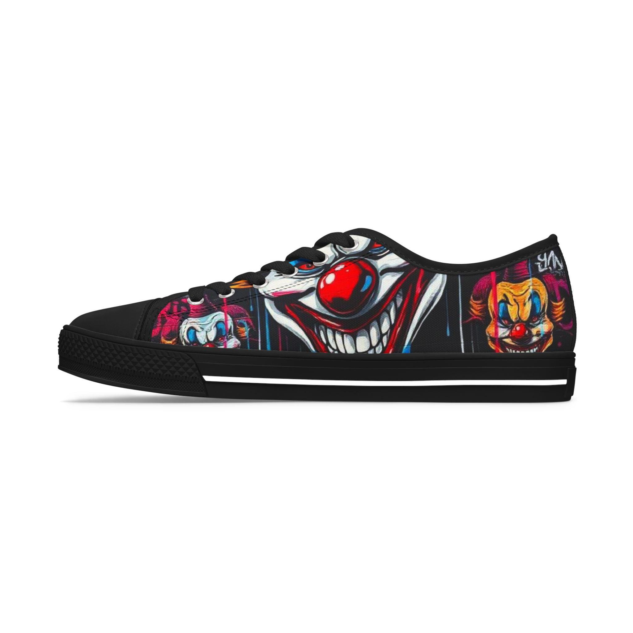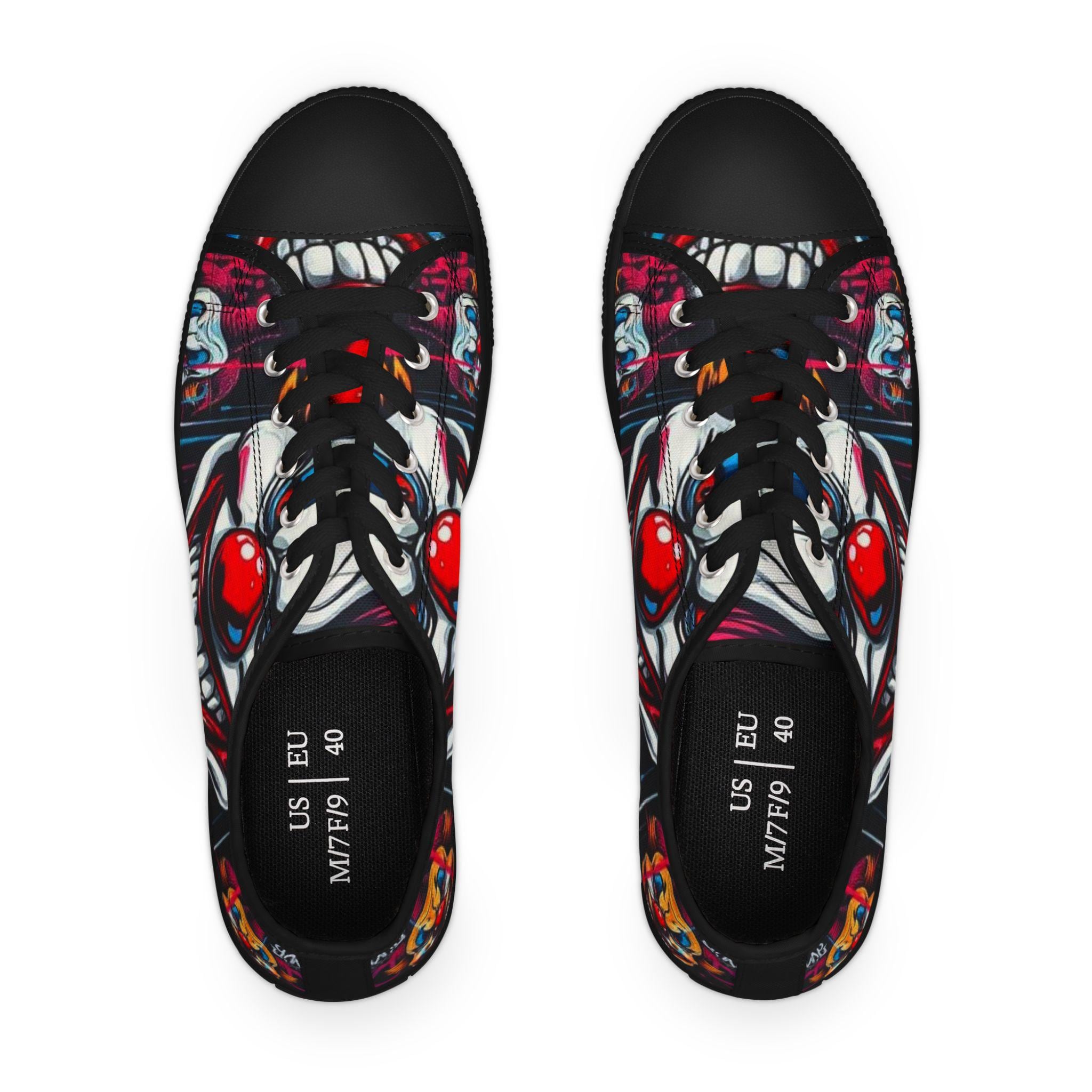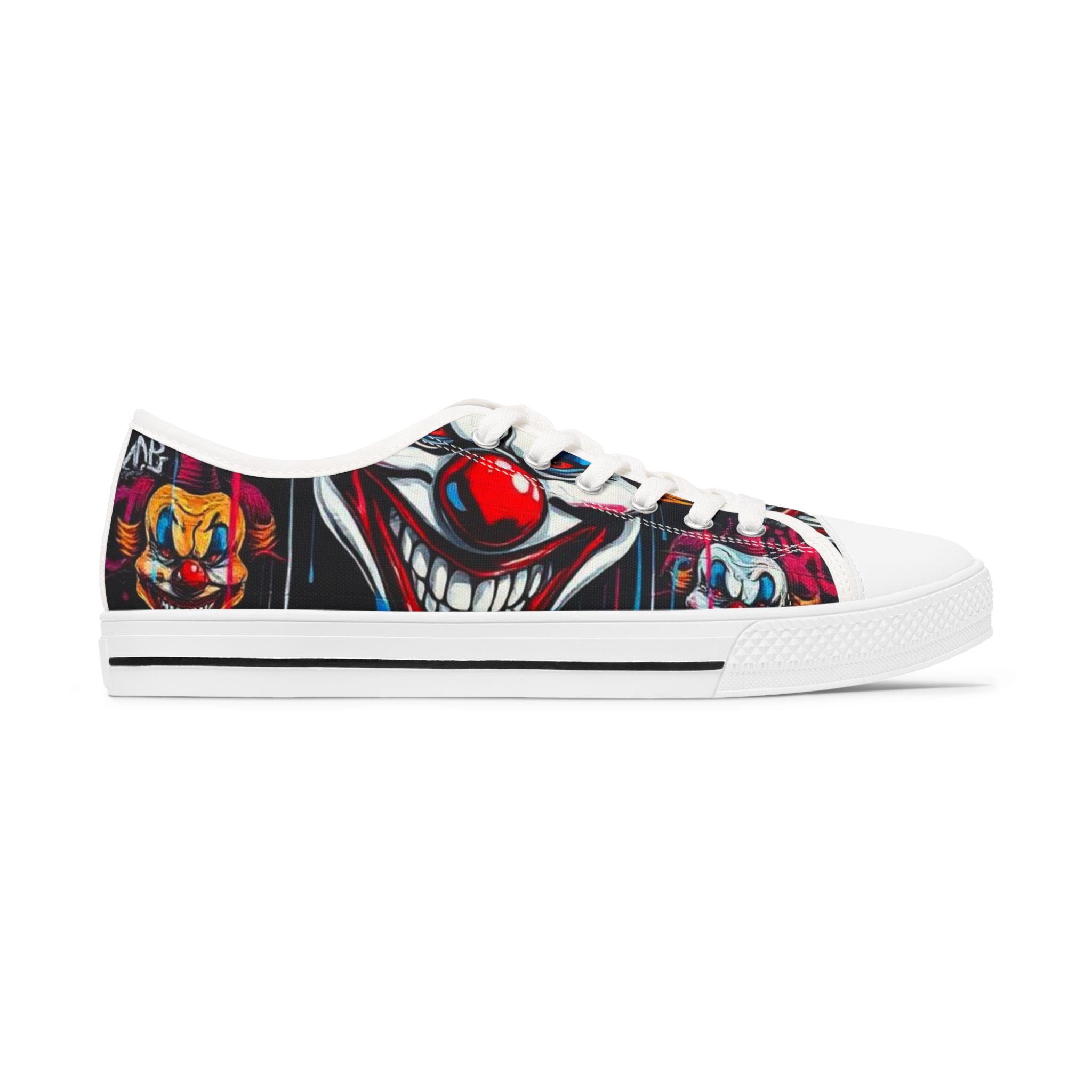 Step into a bold, playful world with these low-top sneakers that turn every sidewalk into a stage. The wraparound print features vibrant, mischievous clown art—bright reds, deep shadows, and pops of color that draw the eye from toe to heel. Built on lightweight EVA soles and cushioned memory-foam insoles, they feel springy on the first step and stay comfortable through long days out. The black pleather toe and metal eyelets add toughness where shoes take the most wear, while breathable polyester canvas keeps feet cool. These sneakers bring personality to festival outfits, late-night city walks, or any day you want to wear something with attitude and character.