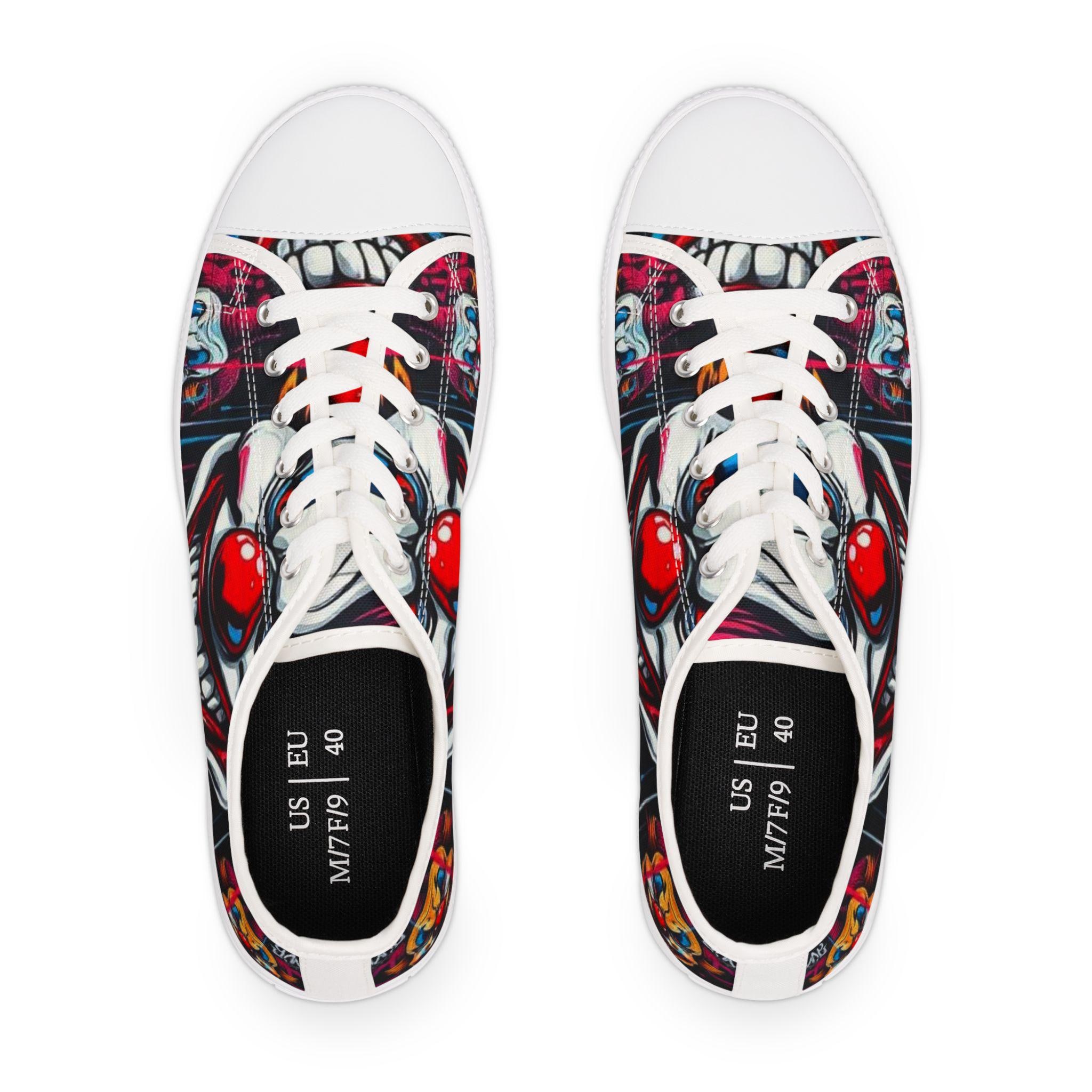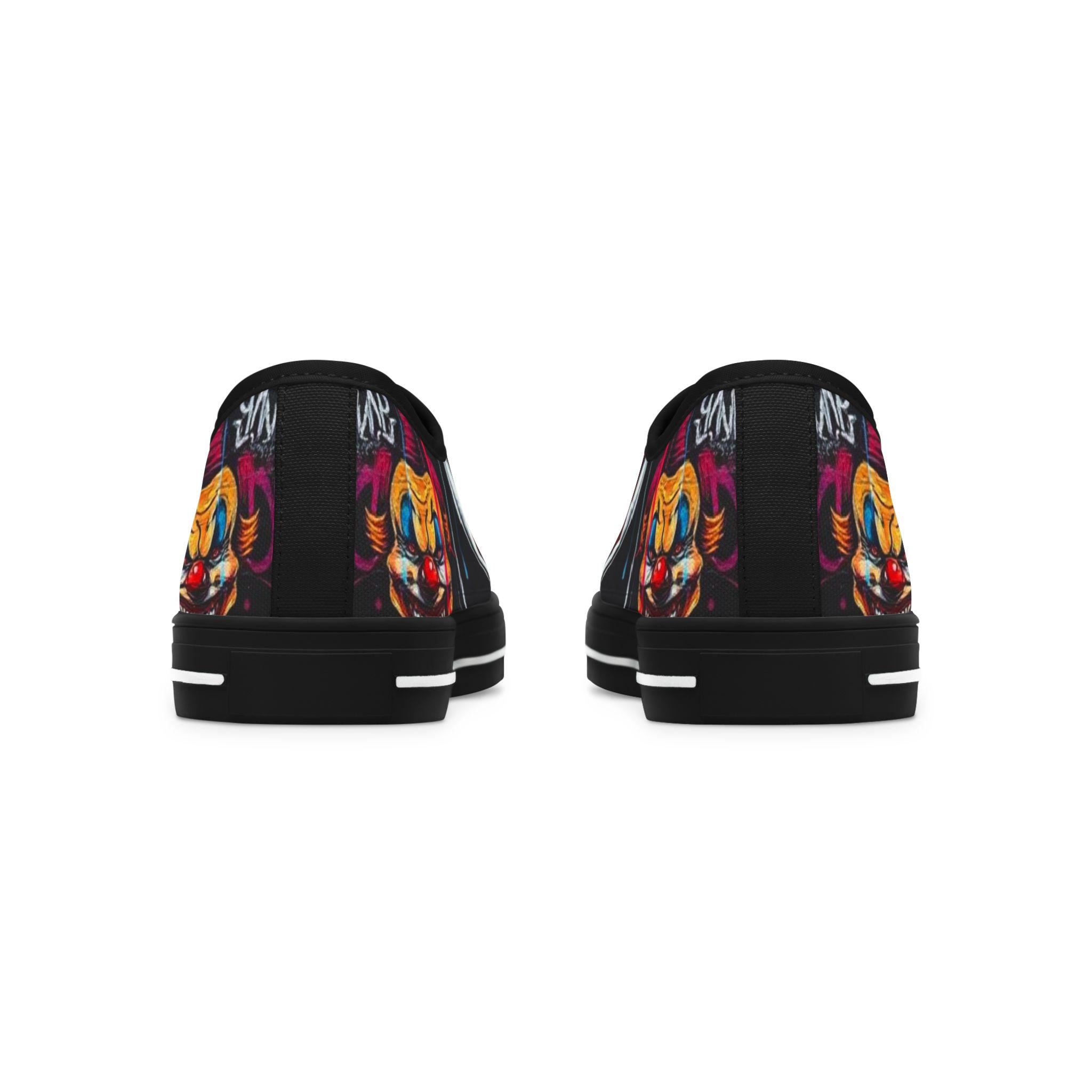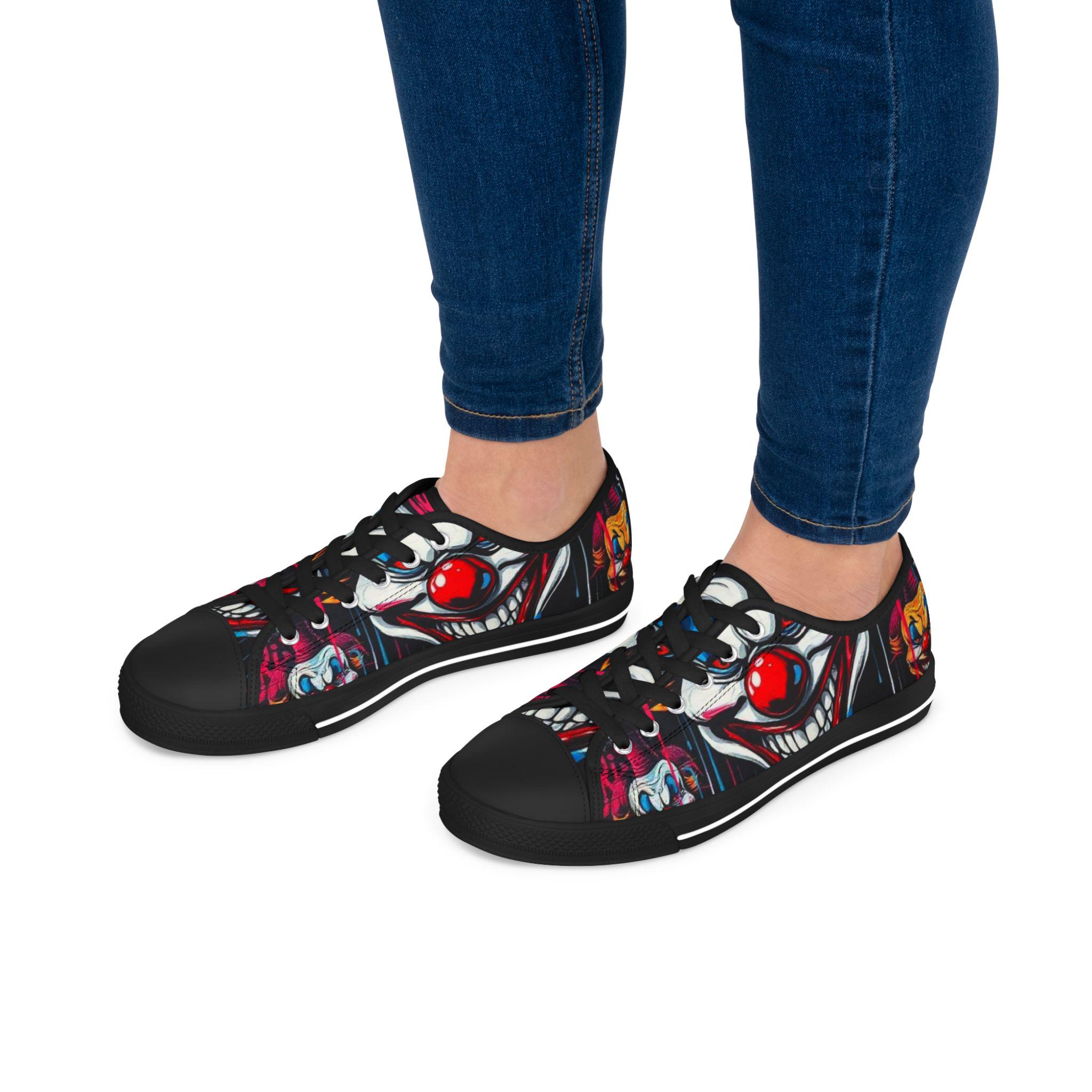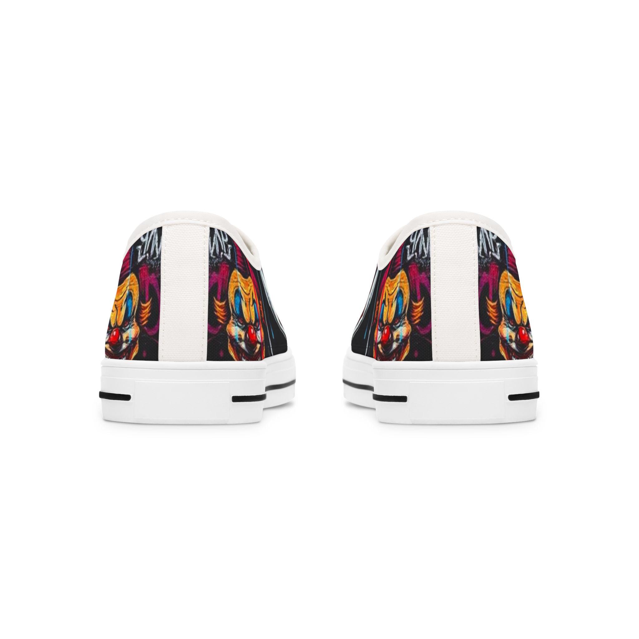 Step into a bold, playful world with these low-top sneakers that turn every sidewalk into a stage. The wraparound print features vibrant, mischievous clown art—bright reds, deep shadows, and pops of color that draw the eye from toe to heel. Built on lightweight EVA soles and cushioned memory-foam insoles, they feel springy on the first step and stay comfortable through long days out. The black pleather toe and metal eyelets add toughness where shoes take the most wear, while breathable polyester canvas keeps feet cool. These sneakers bring personality to festival outfits, late-night city walks, or any day you want to wear something with attitude and character.