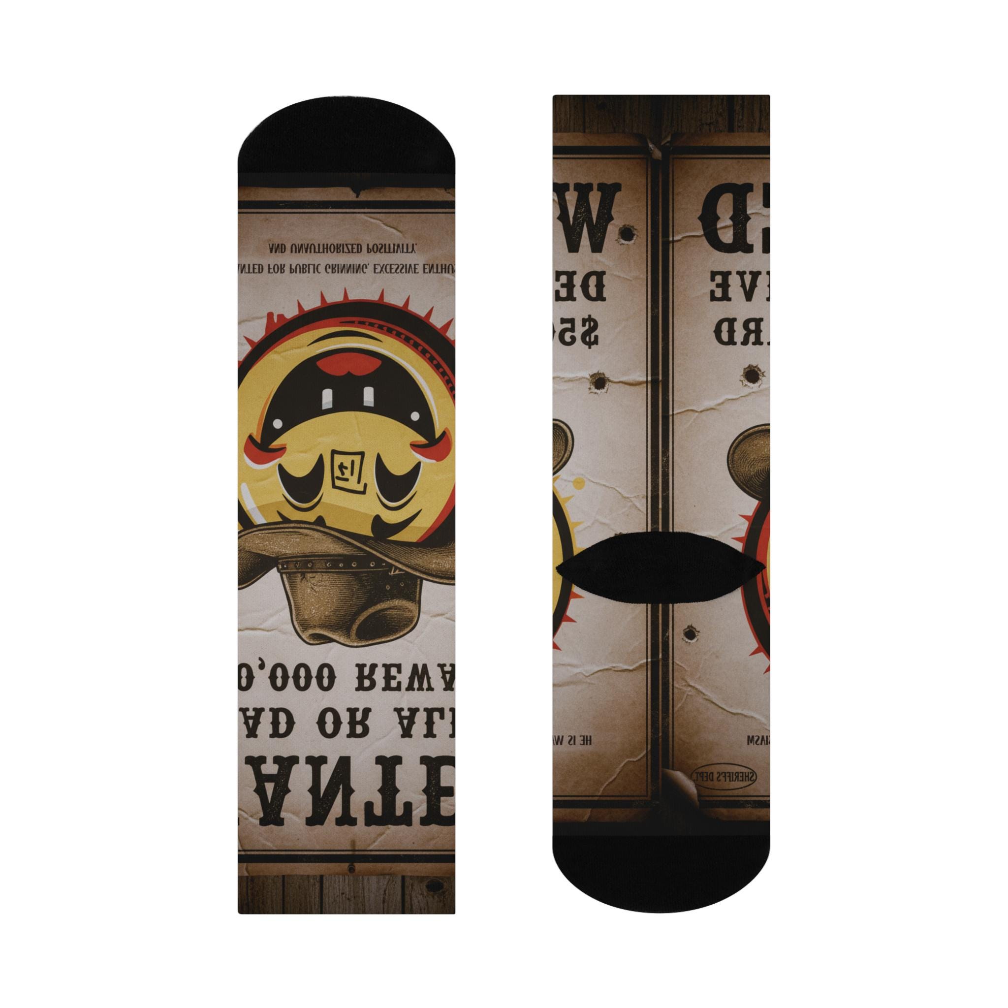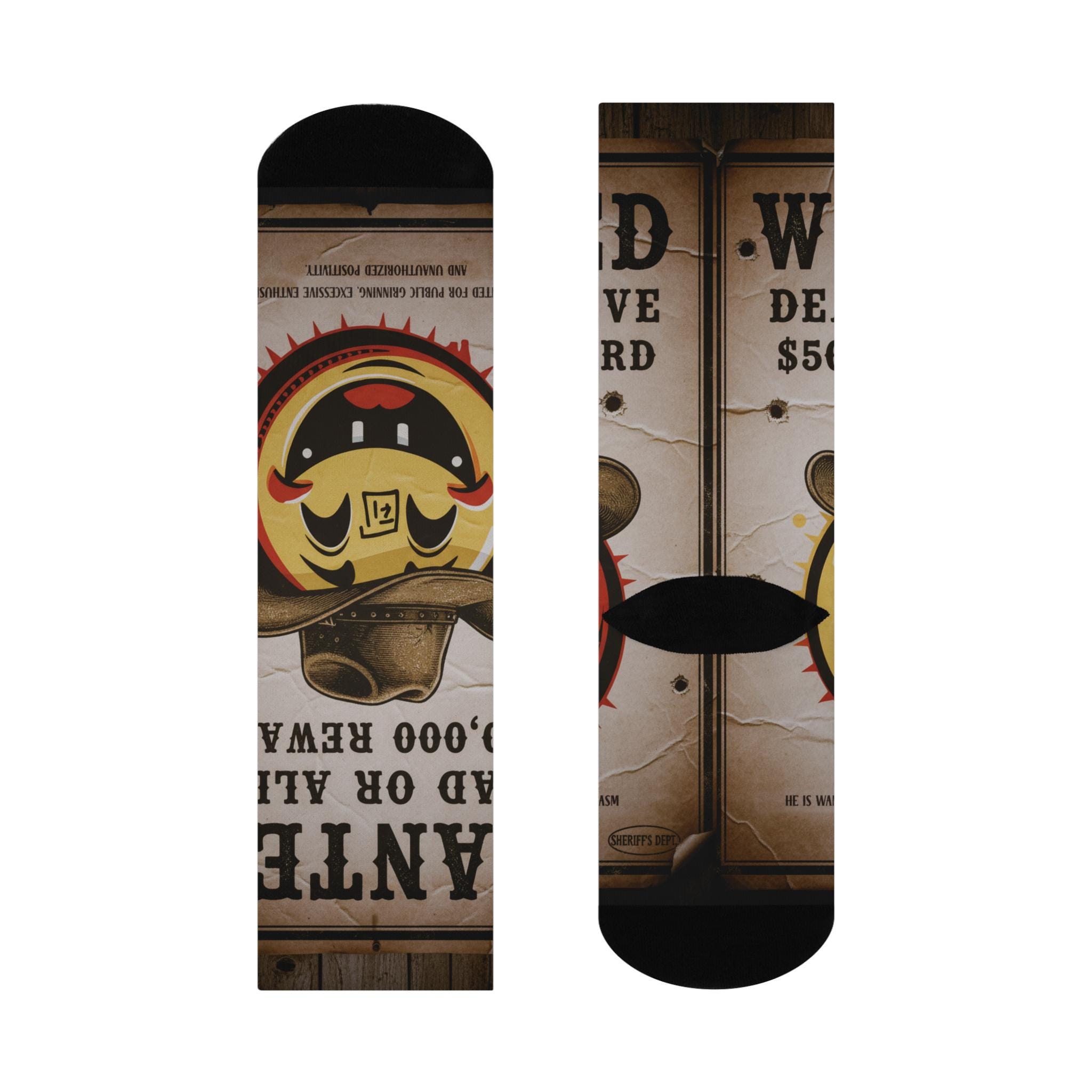 These cushioned crew socks bring playful vintage western energy to your everyday rotation. The all-over print shows a weathered “WANTED” poster backdrop and a grinning cowboy mascot, rendered in rich, sun-faded tones that pop against the black toe and heel. Soft, stretchy knit hugs the calf while a padded sole keeps steps comfortable through long days or late-night hangs. Wear them with rolled jeans, boots, or your favorite shorts to add a wink of personality and a touch of rugged nostalgia to casual and dressier looks alike.