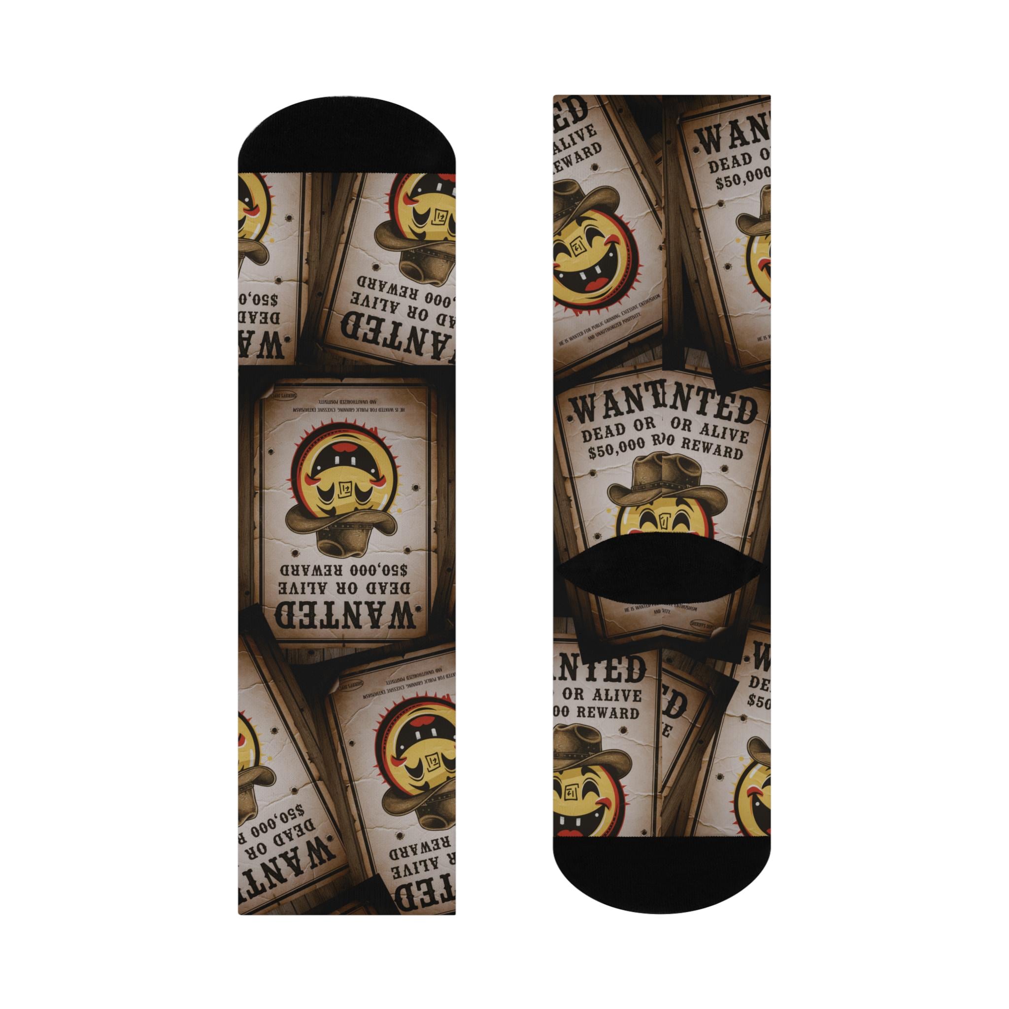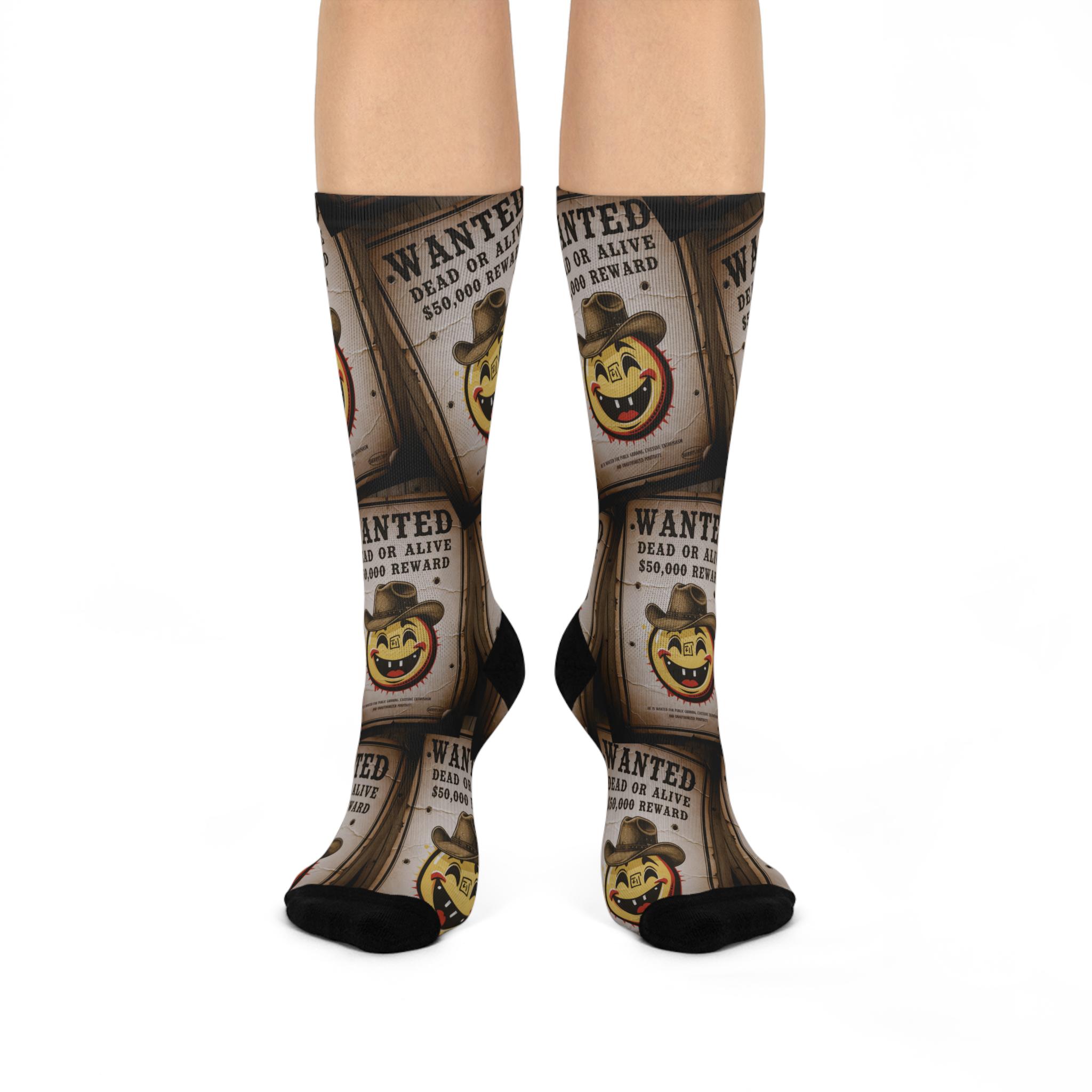 These cushioned crew socks bring a playful western-horror vibe to everyday wear. The all-over print repeats a vintage “wanted” poster motif with a grinning jack-o’-lantern sheriff—faded paper tones and crisp black accents give the design old saloon charm while the vibrant printing keeps the artwork lively. Soft, stretchy fabric hugs the calf and the cushioned bottoms add comfort for long days on your feet. Wear them under boots for a tongue-in-cheek statement, or let them peek out with rolled jeans for a campy, seasonal touch that nods to spooky nights and roadside motels.