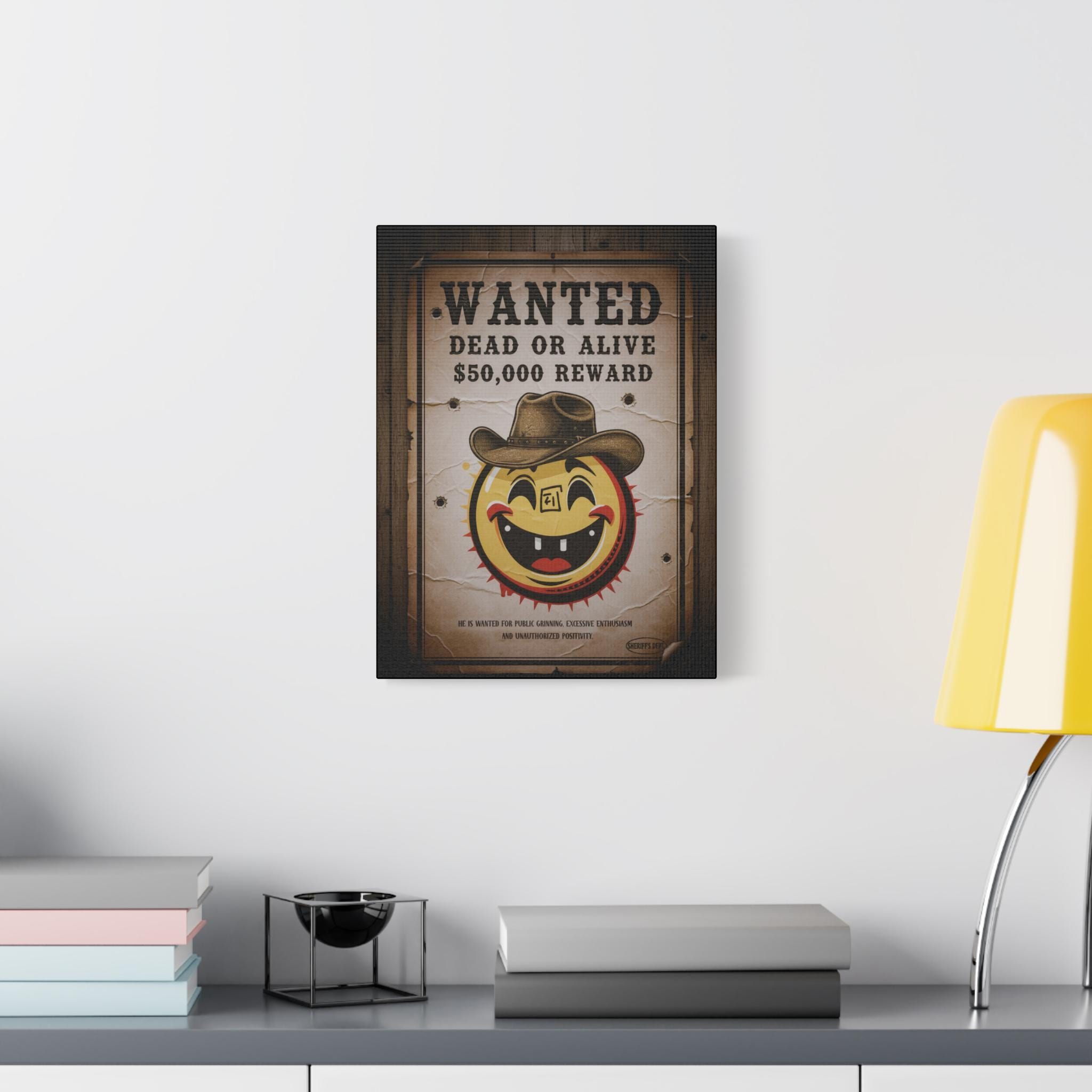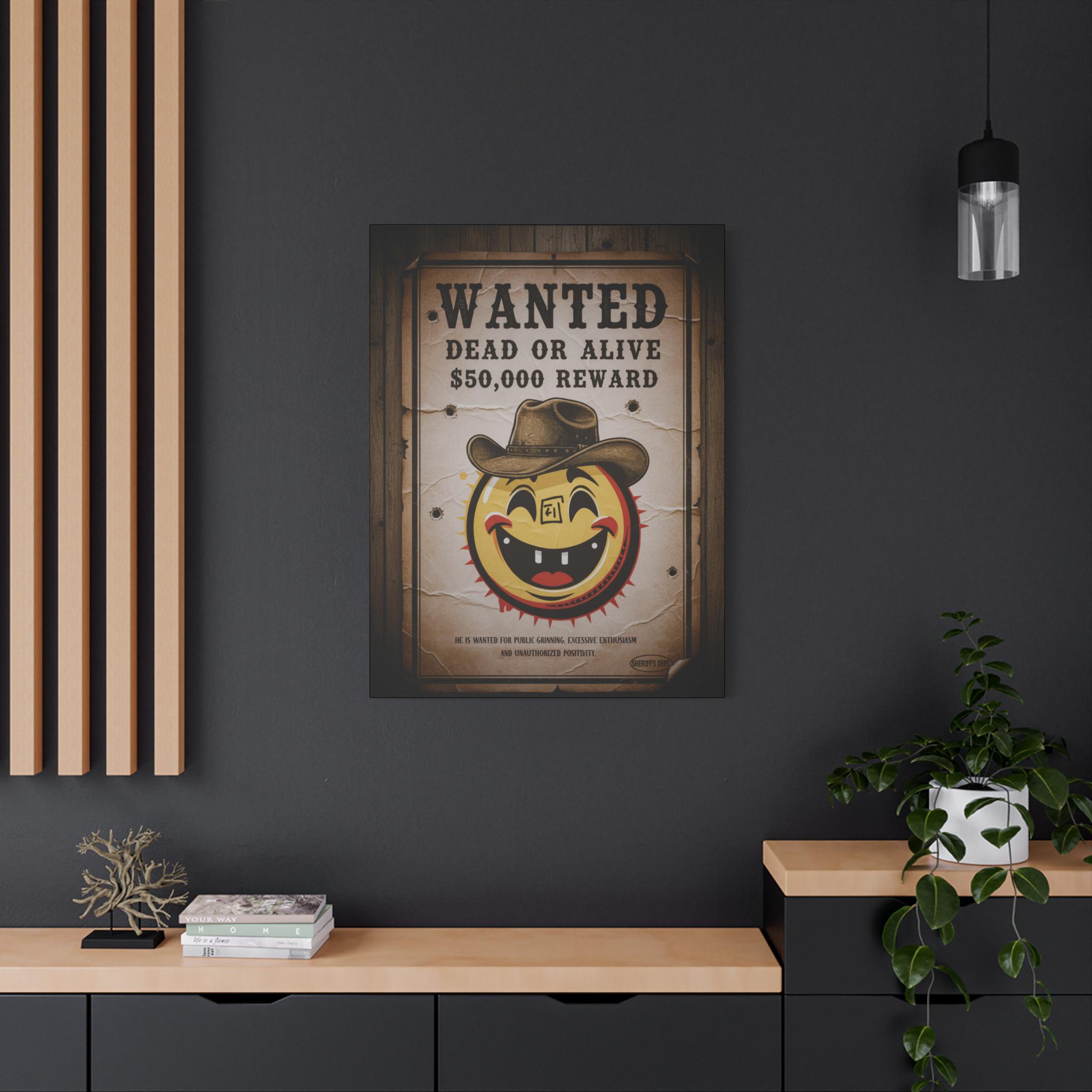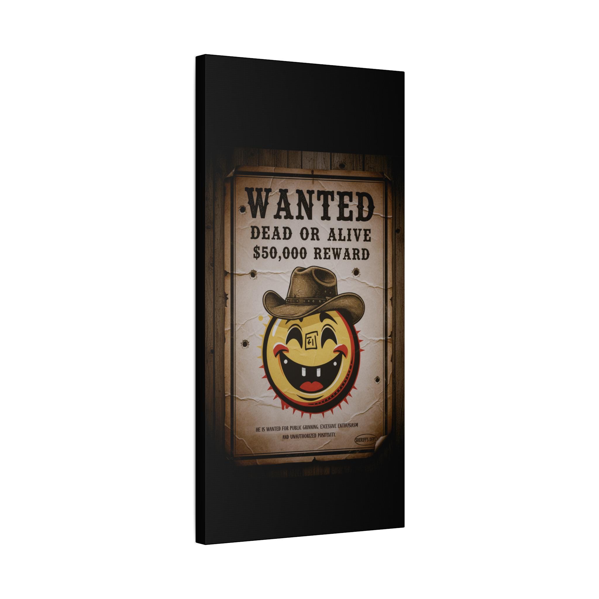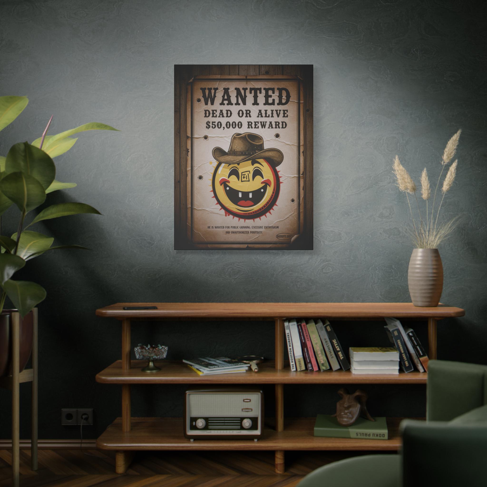 This stretched matte canvas brings playful vintage western energy to any wall. A weathered “WANTED: Dead or Alive” poster surrounds a cheerful, sun-like smiley wearing a cowboy hat — a quirky mash-up of rustic Americana and pop-art humor. The textured cotton-poly canvas and muted sepia tones create an aged look that reads like a found artifact, while the solid pine stretcher frame keeps the piece gallery-ready. Hang it in an entryway, above a mantel, or in a game room to spark conversation and add a warm, nostalgic mood.