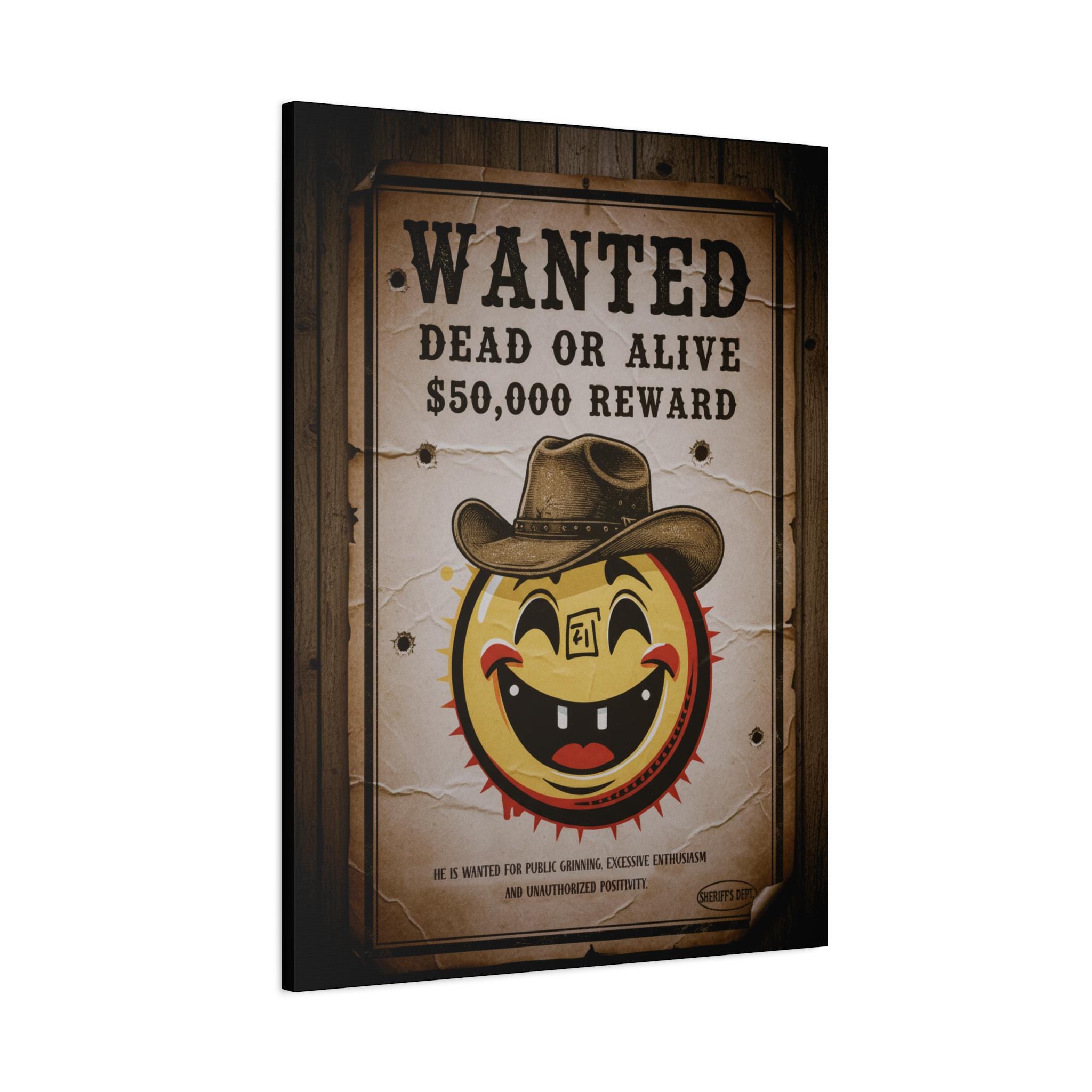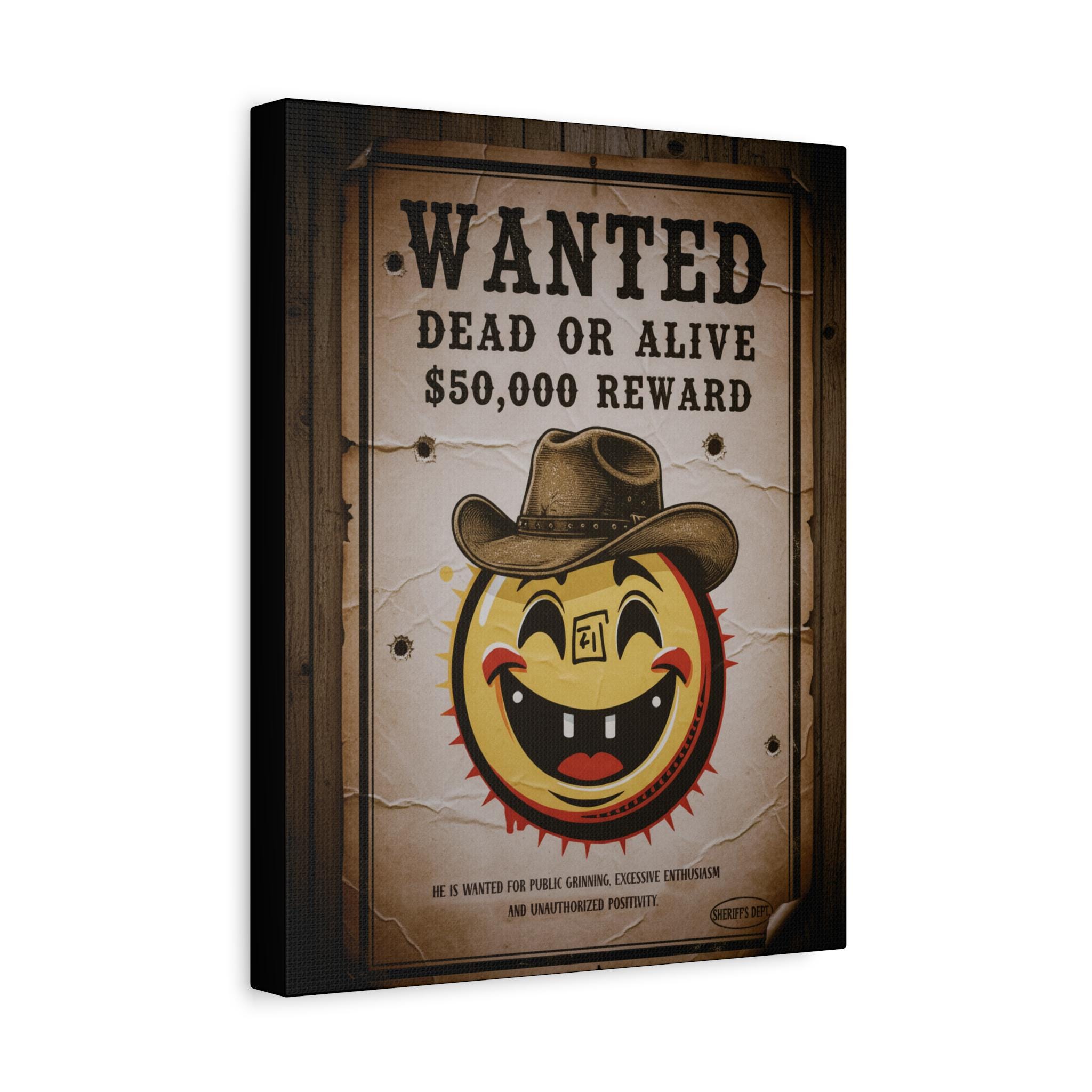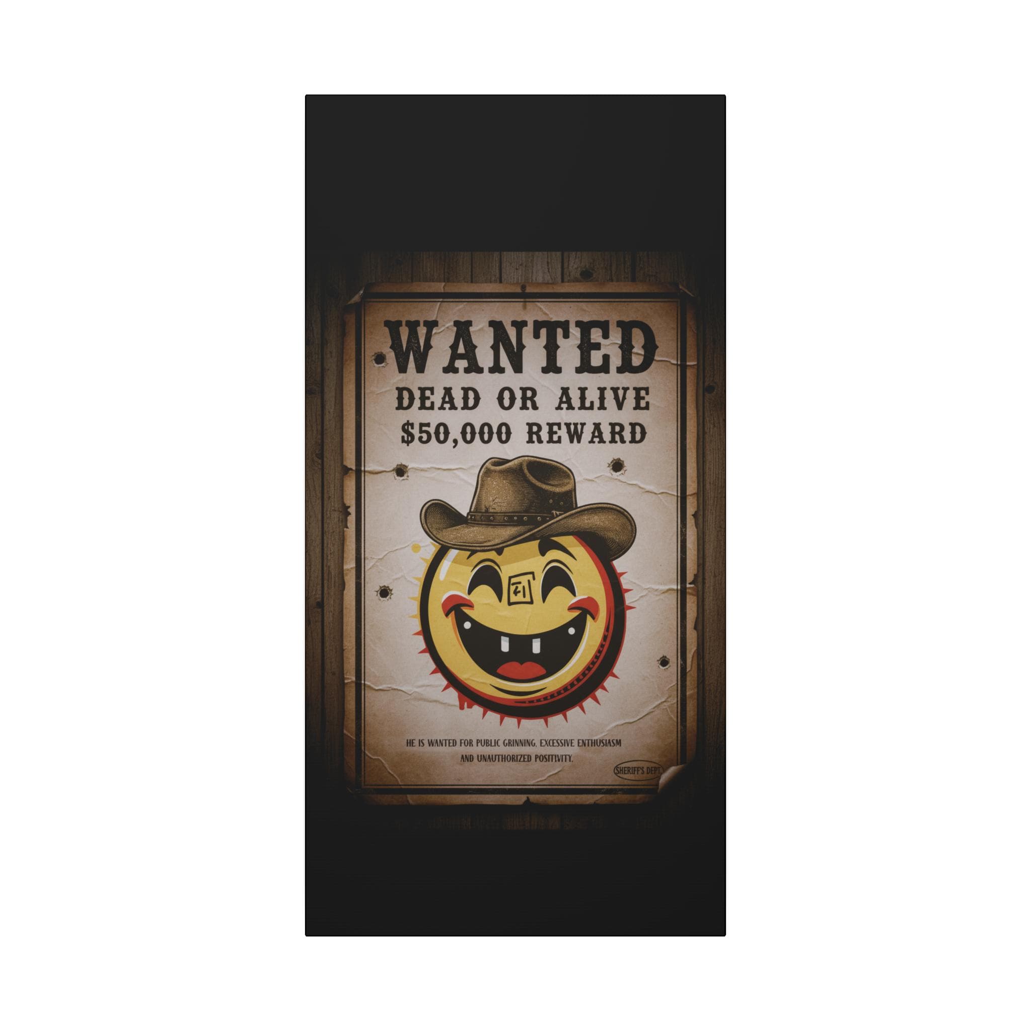 This stretched matte canvas brings playful vintage western energy to any wall. A weathered “WANTED: Dead or Alive” poster surrounds a cheerful, sun-like smiley wearing a cowboy hat — a quirky mash-up of rustic Americana and pop-art humor. The textured cotton-poly canvas and muted sepia tones create an aged look that reads like a found artifact, while the solid pine stretcher frame keeps the piece gallery-ready. Hang it in an entryway, above a mantel, or in a game room to spark conversation and add a warm, nostalgic mood.