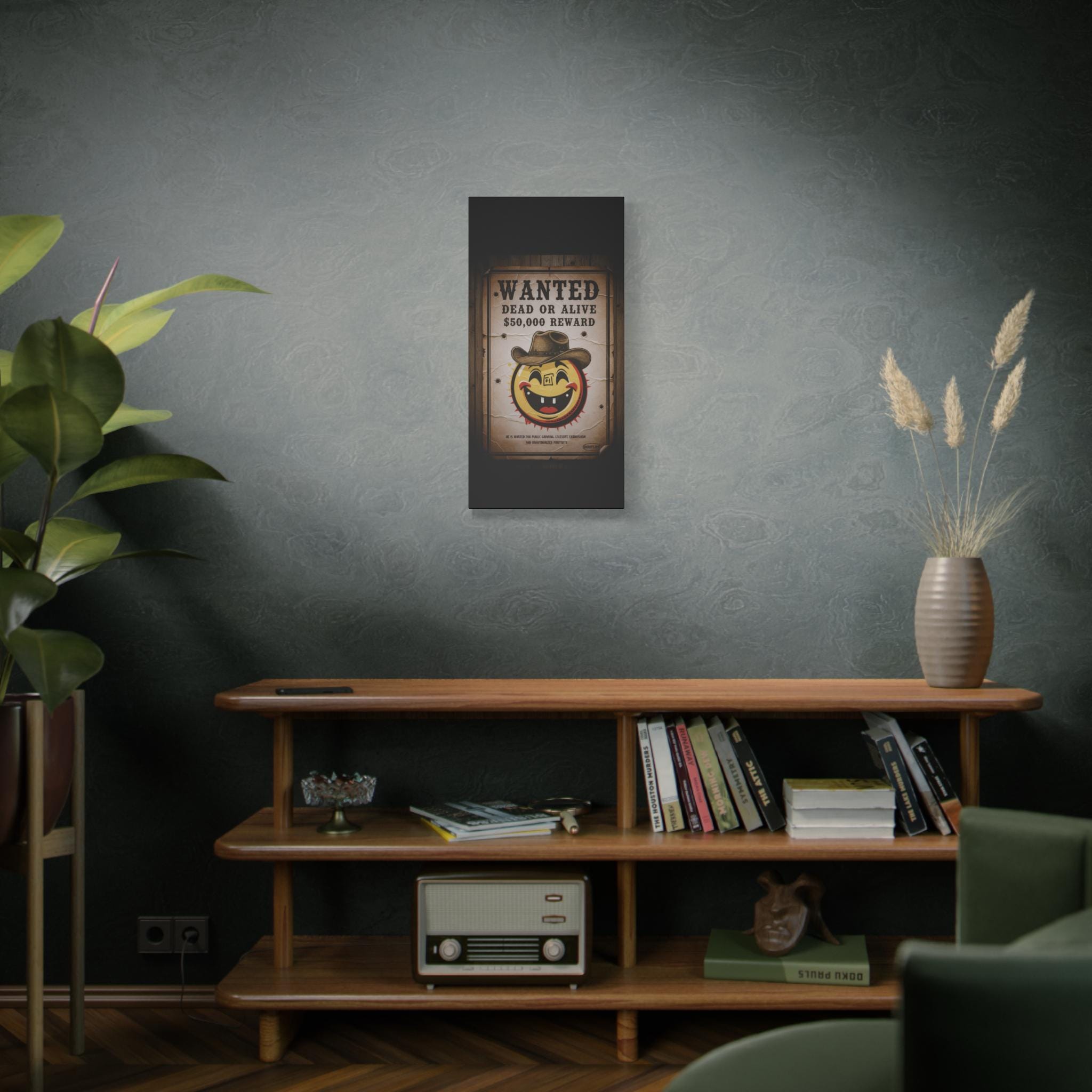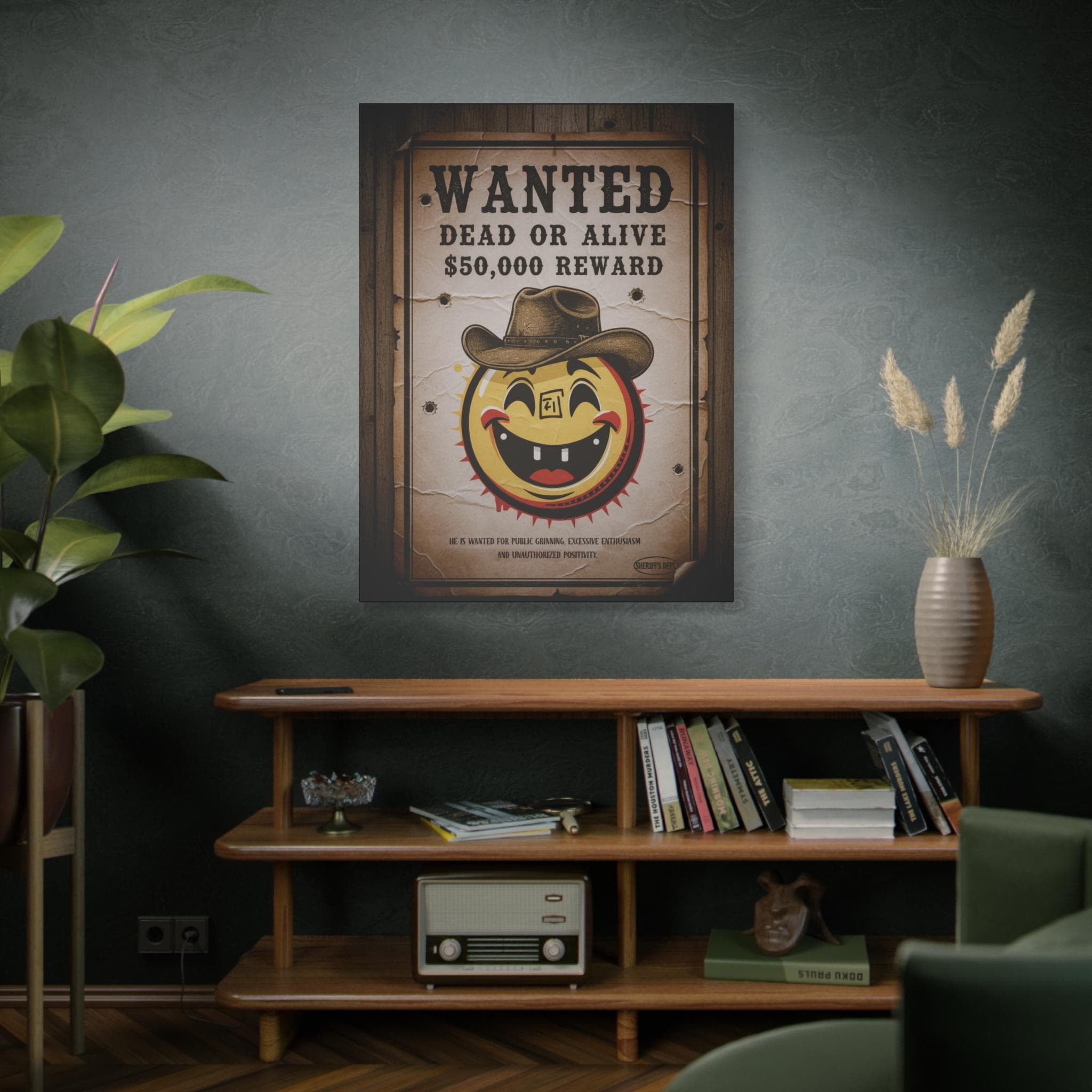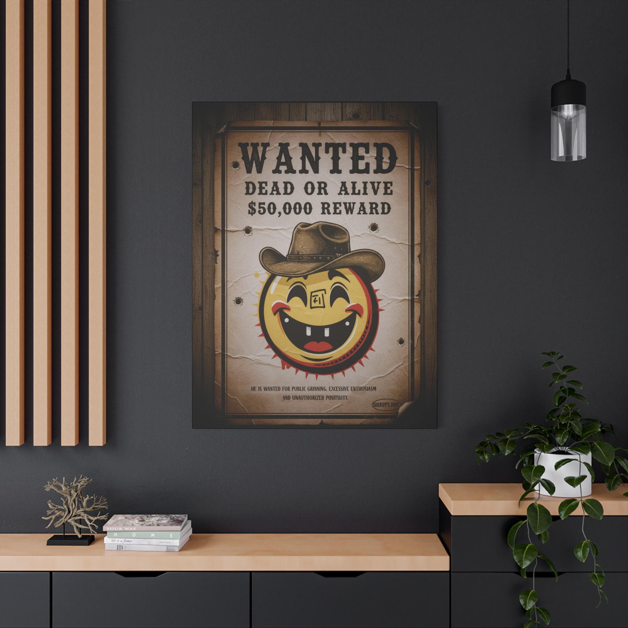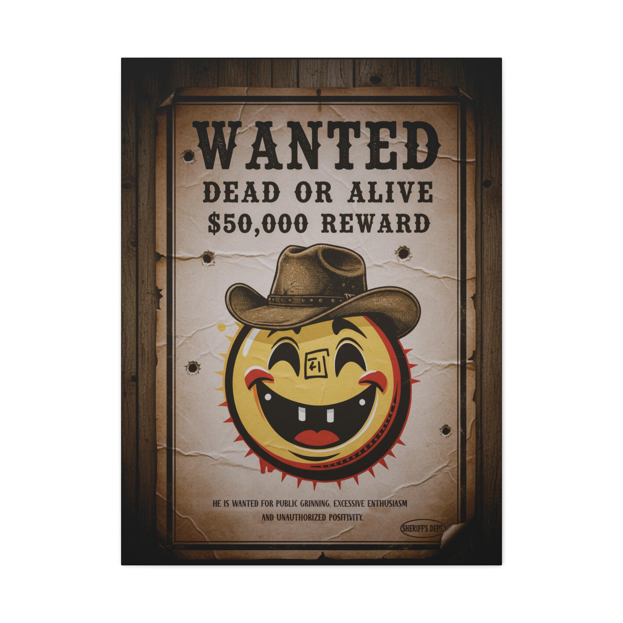 This stretched matte canvas brings playful vintage western energy to any wall. A weathered “WANTED: Dead or Alive” poster surrounds a cheerful, sun-like smiley wearing a cowboy hat — a quirky mash-up of rustic Americana and pop-art humor. The textured cotton-poly canvas and muted sepia tones create an aged look that reads like a found artifact, while the solid pine stretcher frame keeps the piece gallery-ready. Hang it in an entryway, above a mantel, or in a game room to spark conversation and add a warm, nostalgic mood.