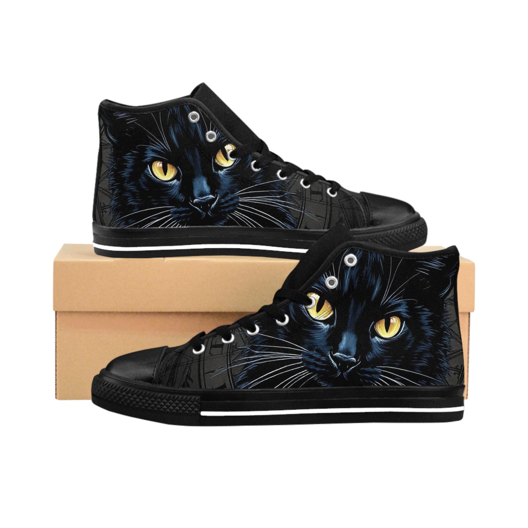 These high-top canvas sneakers bring a touch of midnight mystery to everyday wear. The print showcases a striking black cat with golden eyes that seem to glow against the deep black background, giving each step a quietly confident edge. Built with a fine-weave nylon canvas and cushioned foam insole, they move with you—breathable, slightly springy, and comfortably snug. Reinforced pleather at the rounded toe and a durable rubber outsole stand up to daily streets and late-night alley wanderings. Silver metal eyelets, black stitching, and a 5" calf height silhouette complete the look, making these sneakers a bold, wearable statement for anyone who lives a little closer to dusk than dawn.