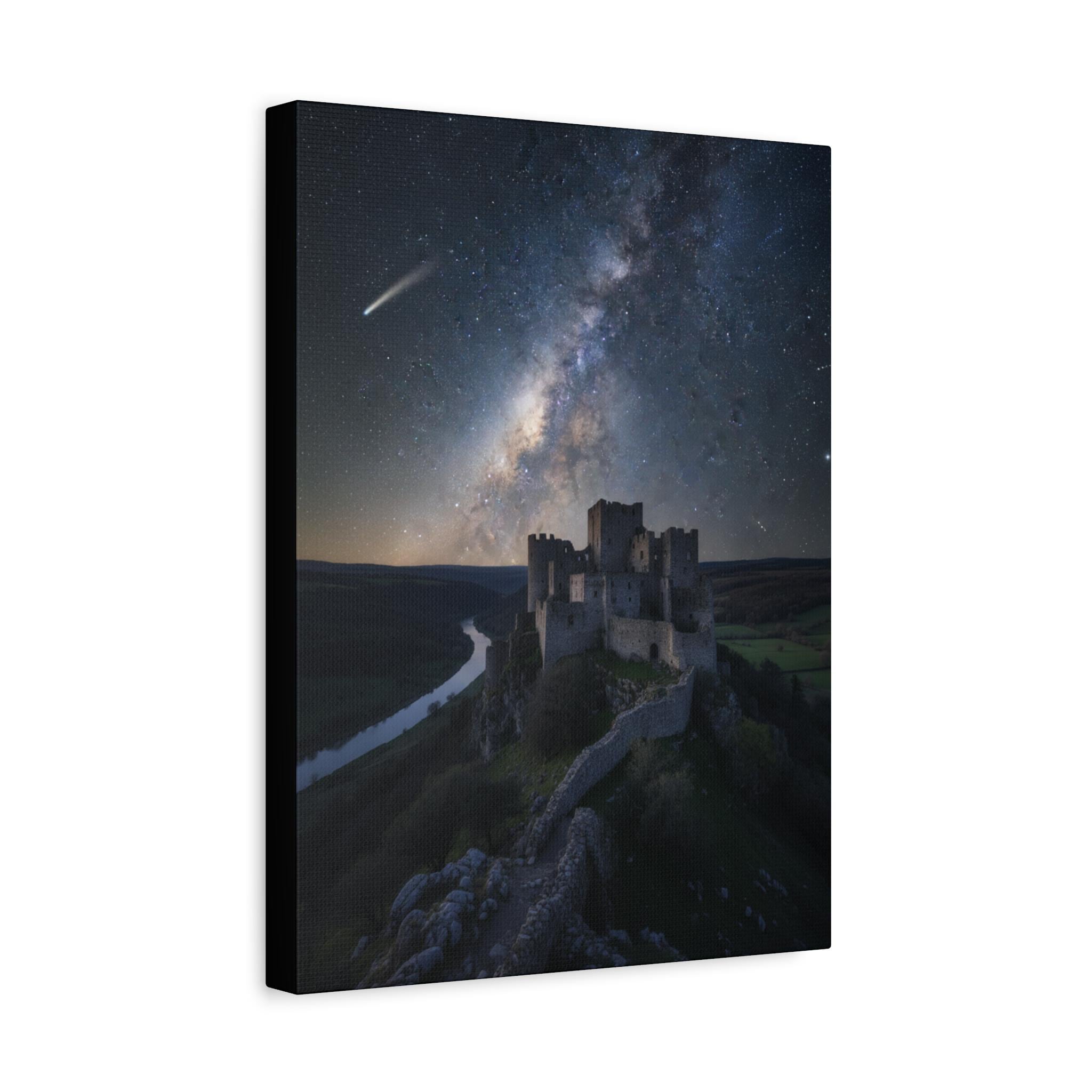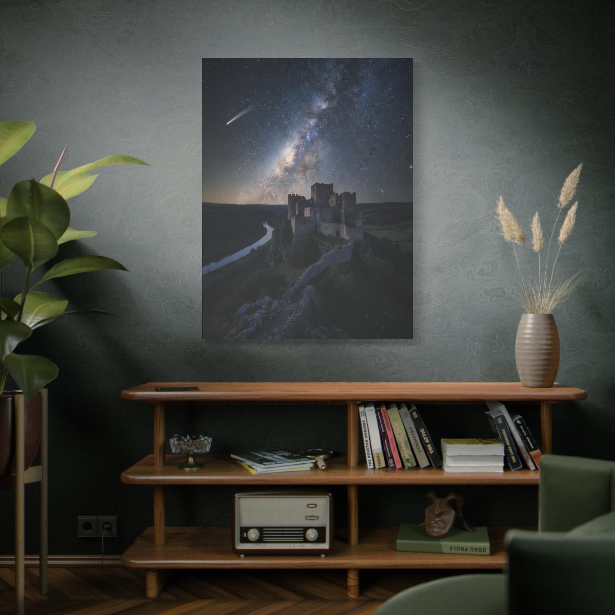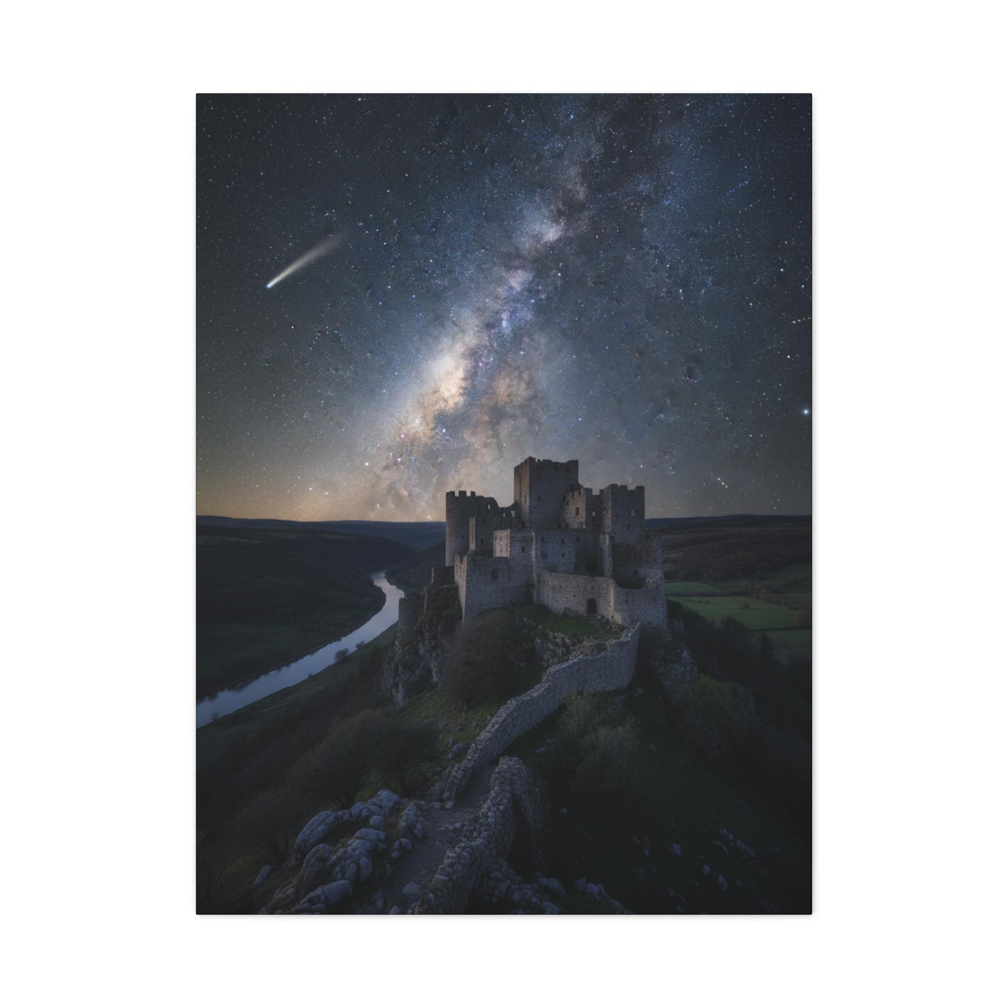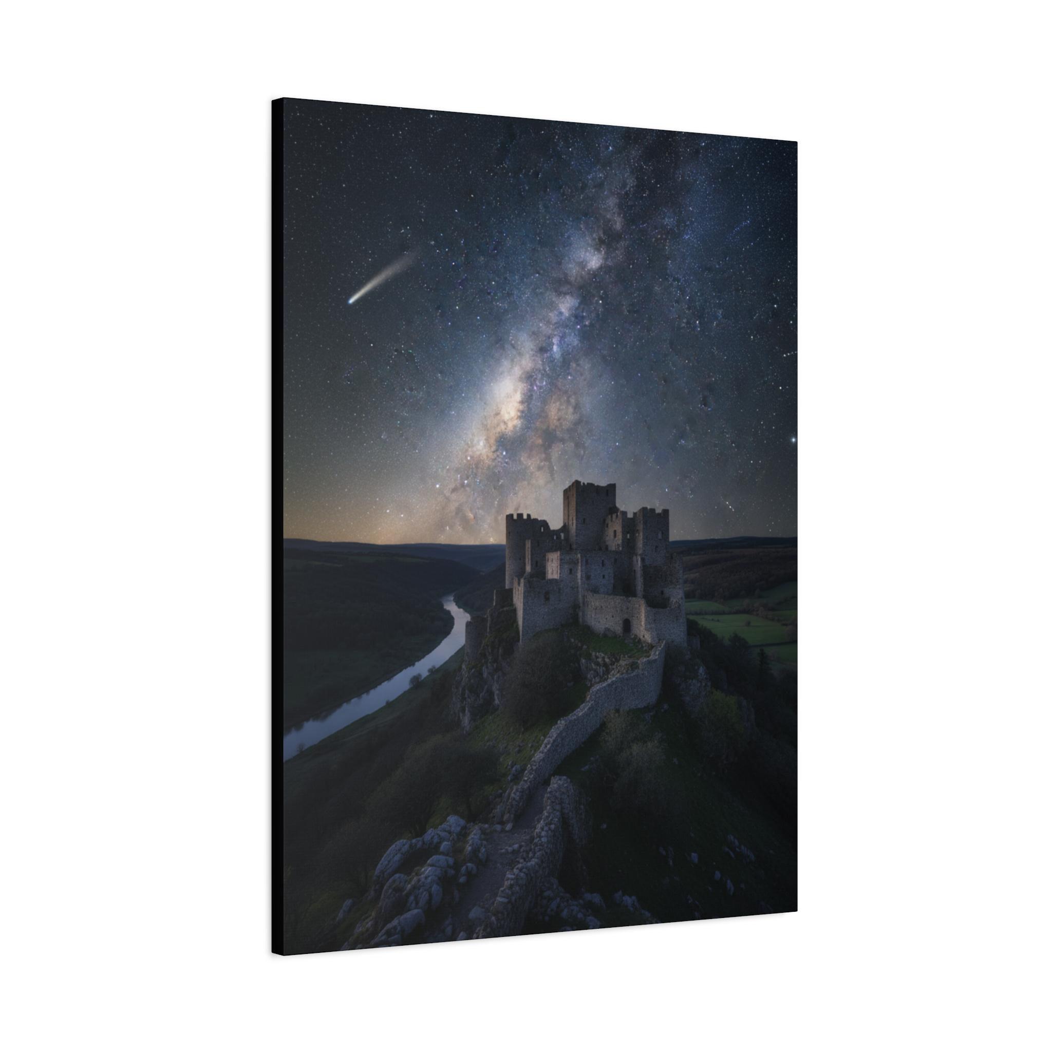A matte stretched canvas that brings quiet night skies and ancient stone to your wall. Printed with ultra-clear Greenguard Gold inks on a cotton-poly canvas and stretched over sustainably sourced radiata pine, this print holds deep, velvety blacks and soft star-glow without glare. The scene—a ruined castle under the Milky Way with a comet streaking above—pulls a room into stillness. Hang it above a reading nook, over a mantel, or in a study to anchor late-night thoughts and long conversations. Soft rubber dots on the back keep it steady; back-hanging hardware is included so the piece sits true and ready.