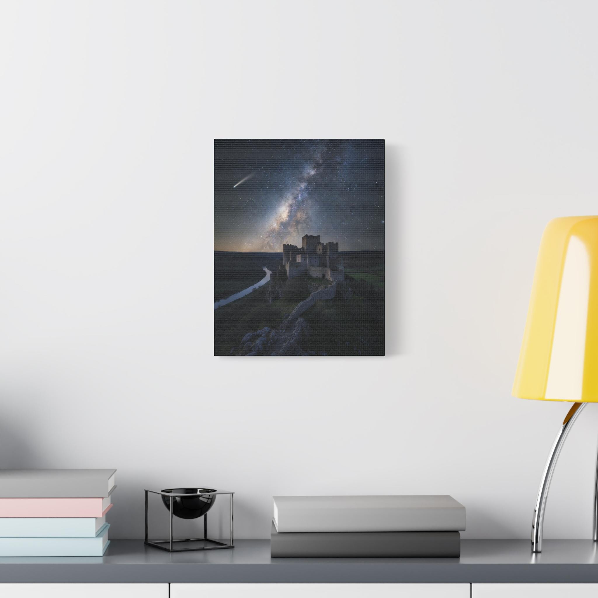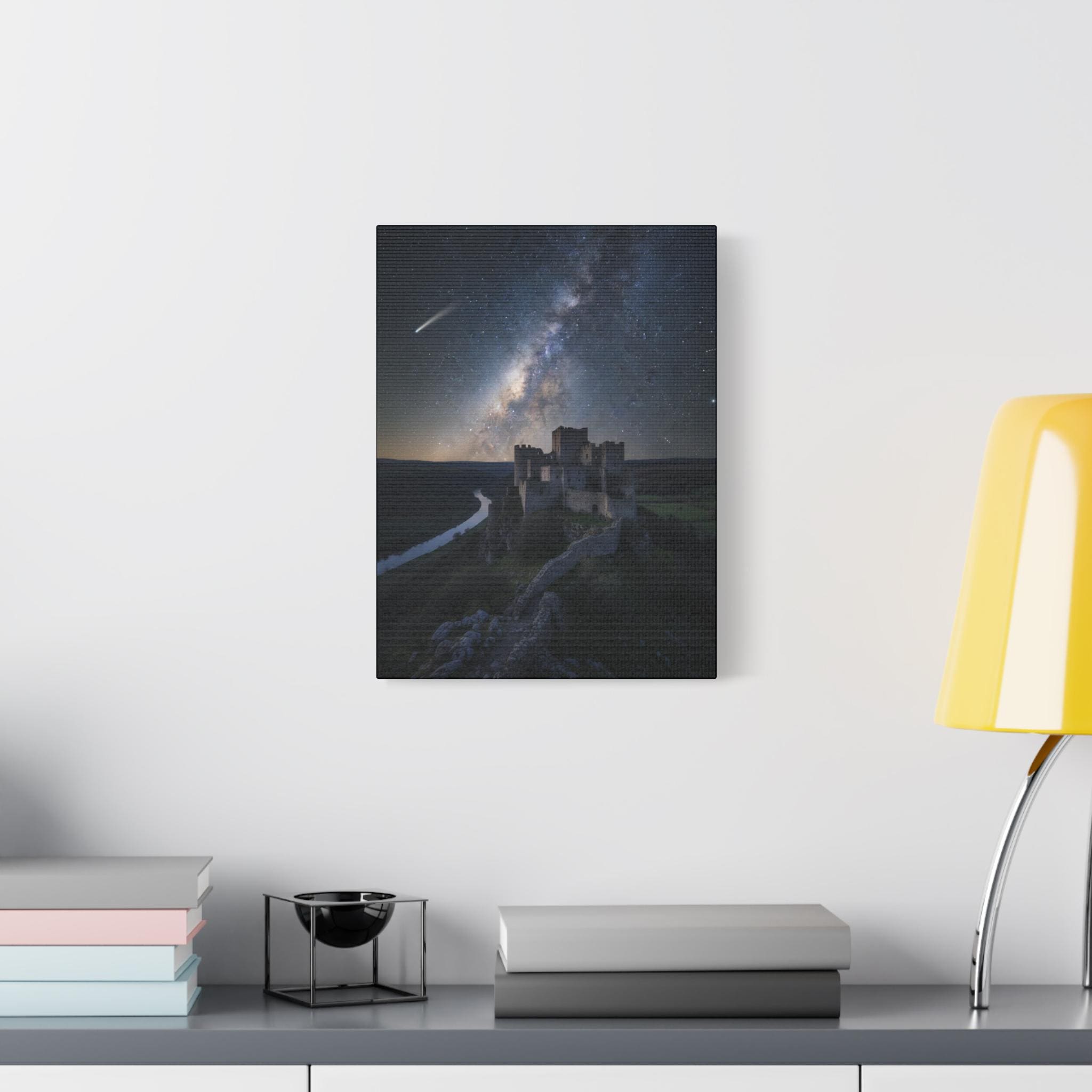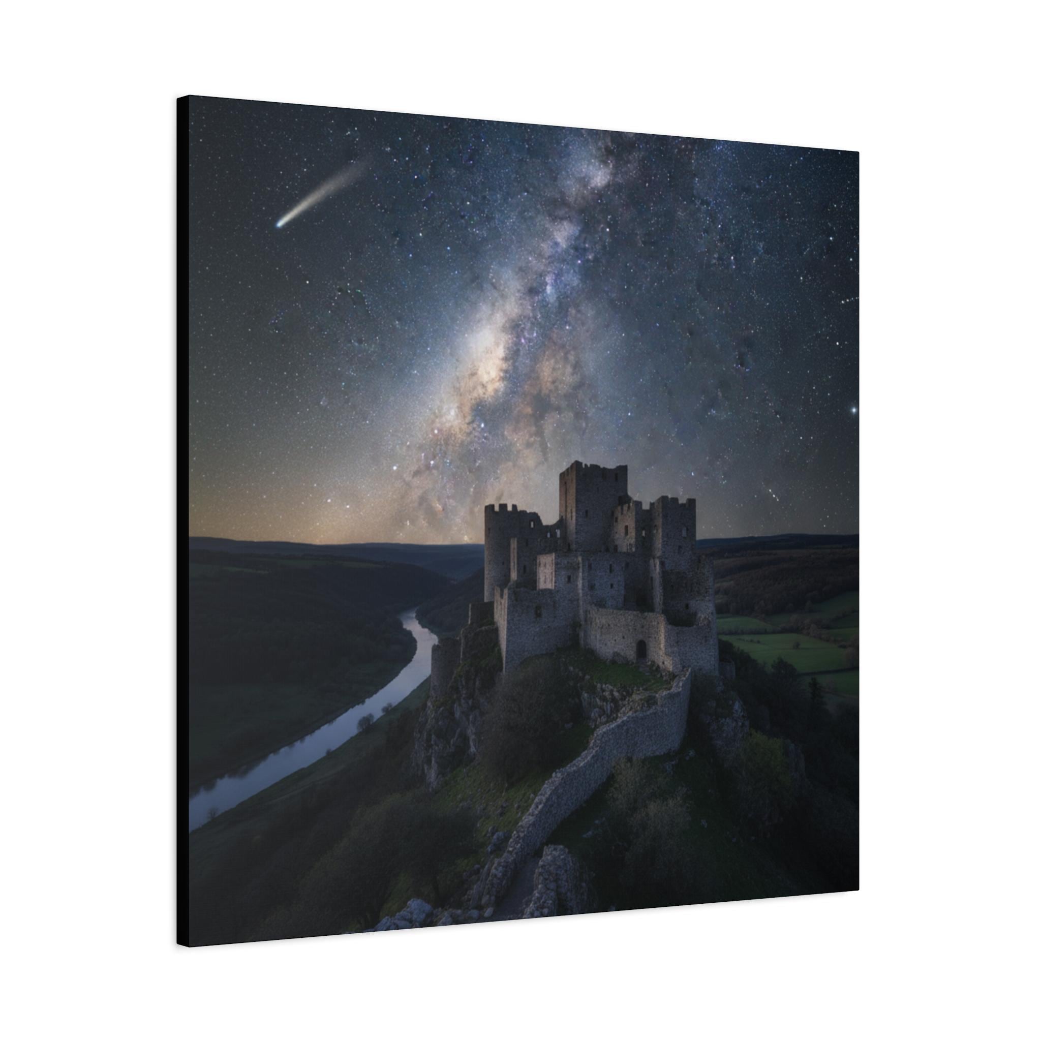 A matte stretched canvas that brings quiet night skies and ancient stone to your wall. Printed with ultra-clear Greenguard Gold inks on a cotton-poly canvas and stretched over sustainably sourced radiata pine, this print holds deep, velvety blacks and soft star-glow without glare. The scene—a ruined castle under the Milky Way with a comet streaking above—pulls a room into stillness. Hang it above a reading nook, over a mantel, or in a study to anchor late-night thoughts and long conversations. Soft rubber dots on the back keep it steady; back-hanging hardware is included so the piece sits true and ready.