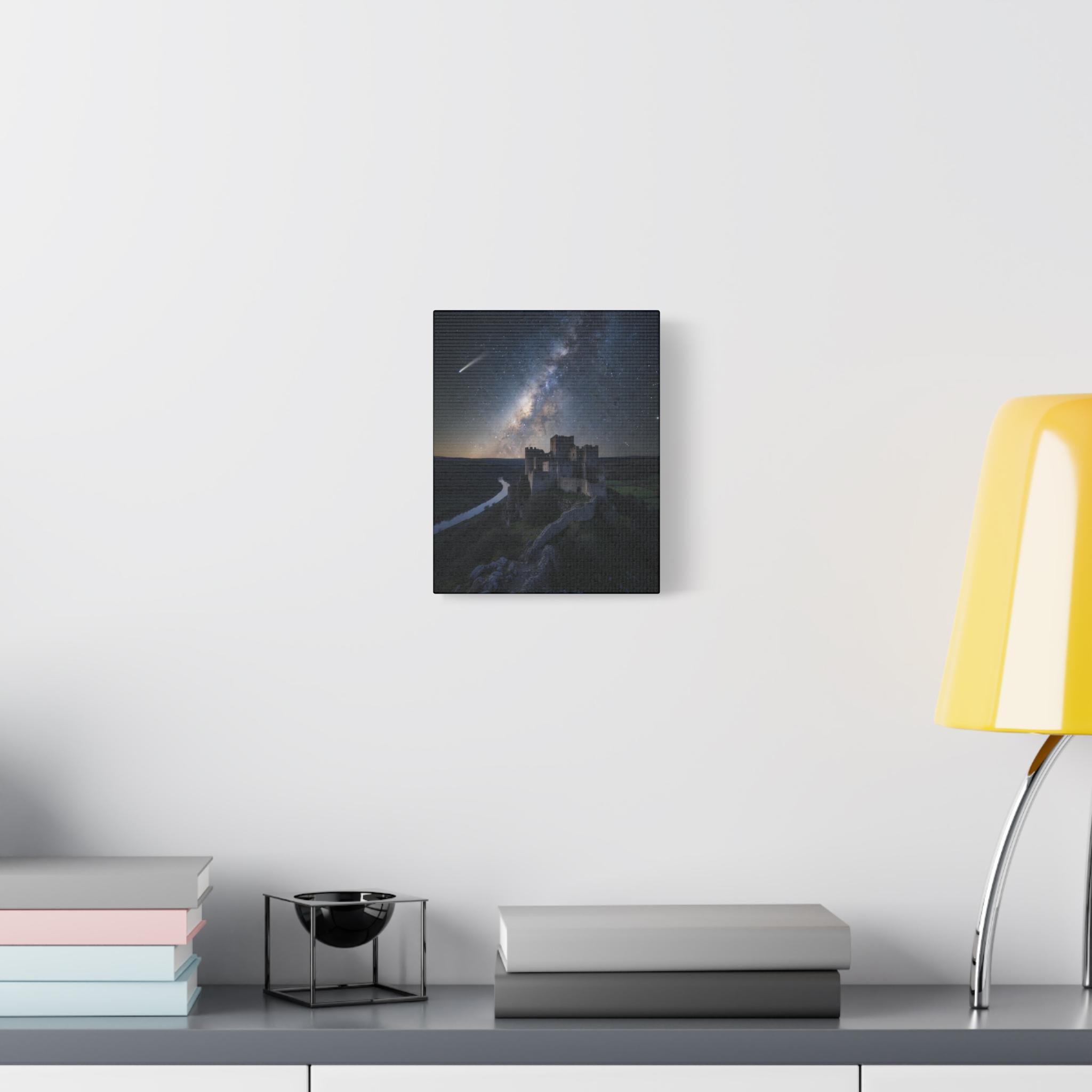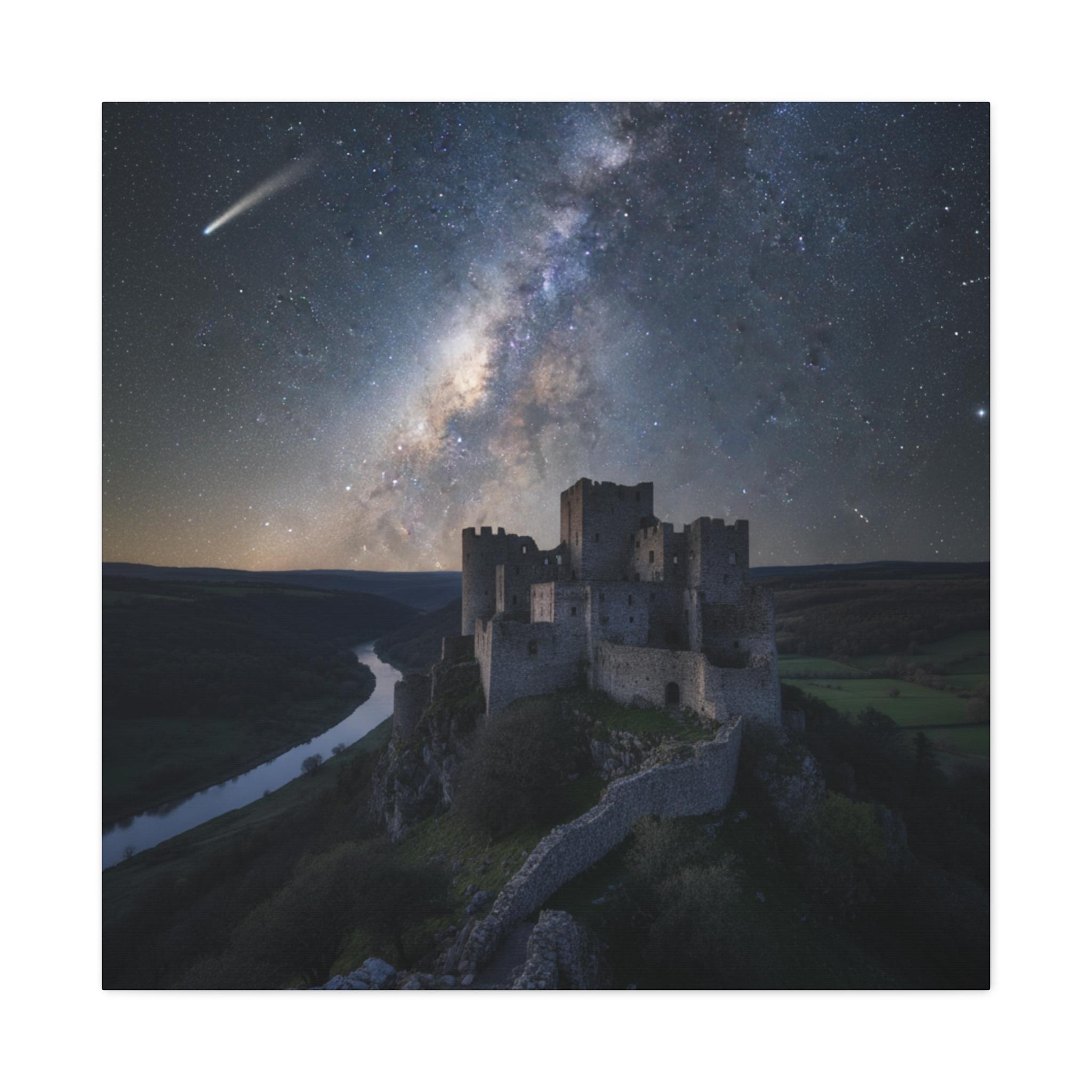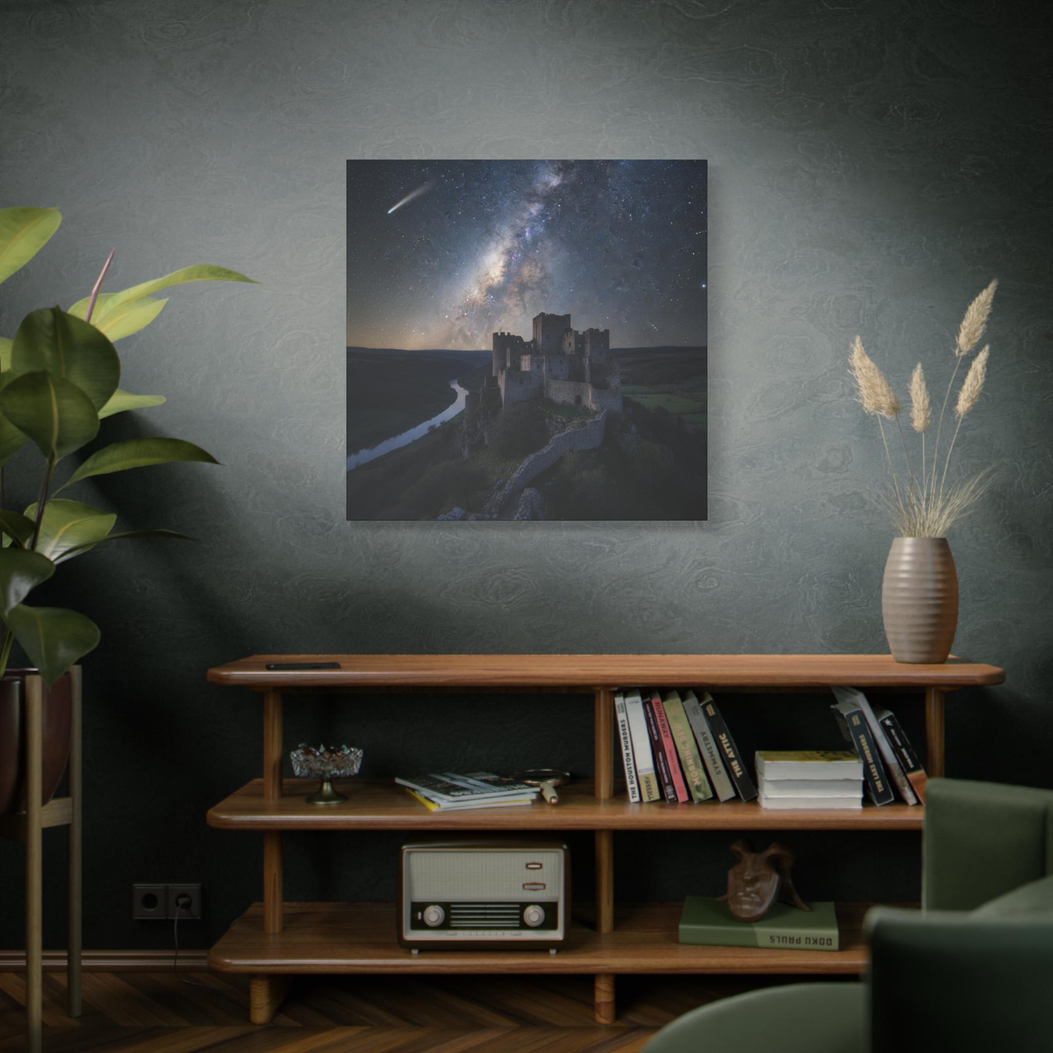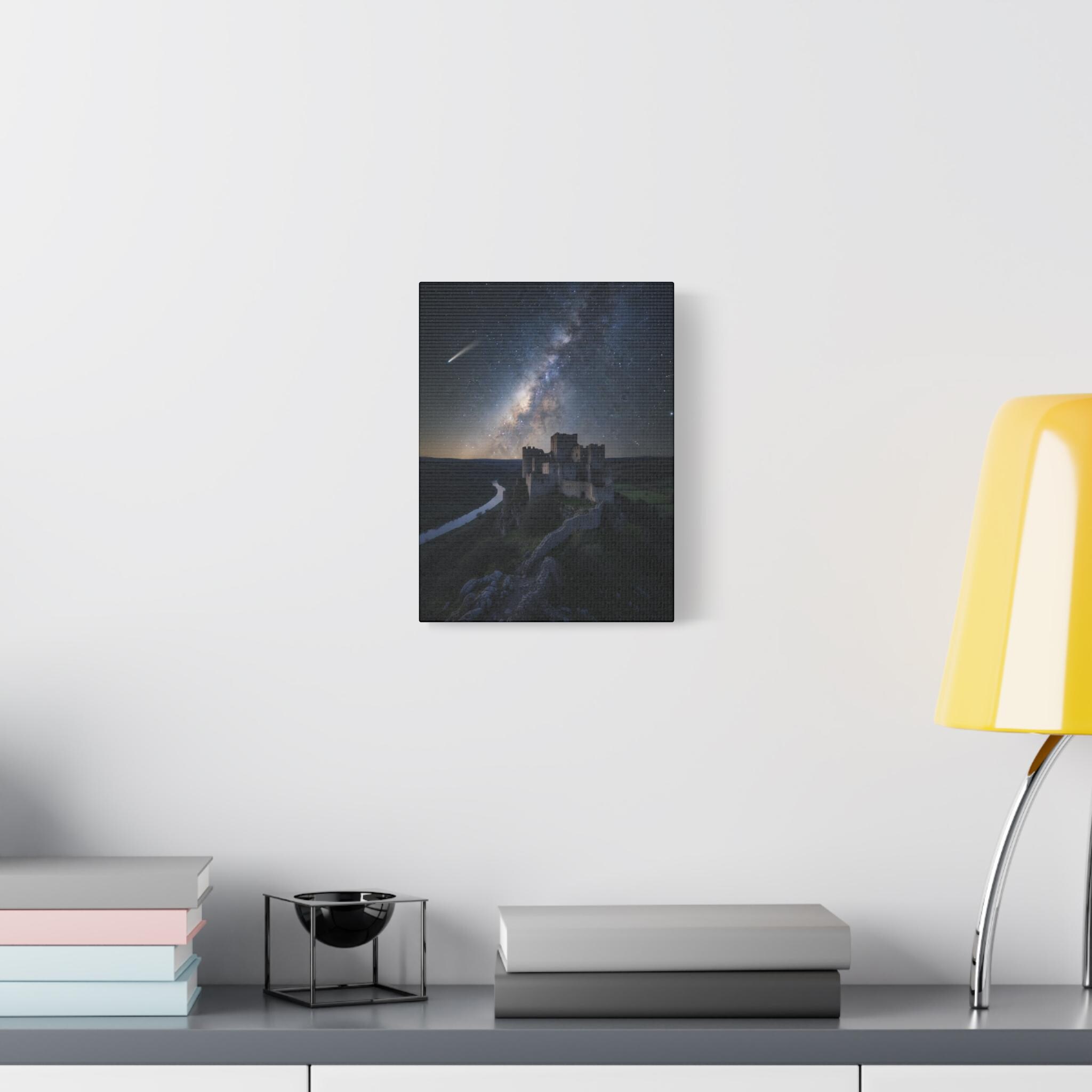 A matte stretched canvas that brings quiet night skies and ancient stone to your wall. Printed with ultra-clear Greenguard Gold inks on a cotton-poly canvas and stretched over sustainably sourced radiata pine, this print holds deep, velvety blacks and soft star-glow without glare. The scene—a ruined castle under the Milky Way with a comet streaking above—pulls a room into stillness. Hang it above a reading nook, over a mantel, or in a study to anchor late-night thoughts and long conversations. Soft rubber dots on the back keep it steady; back-hanging hardware is included so the piece sits true and ready.