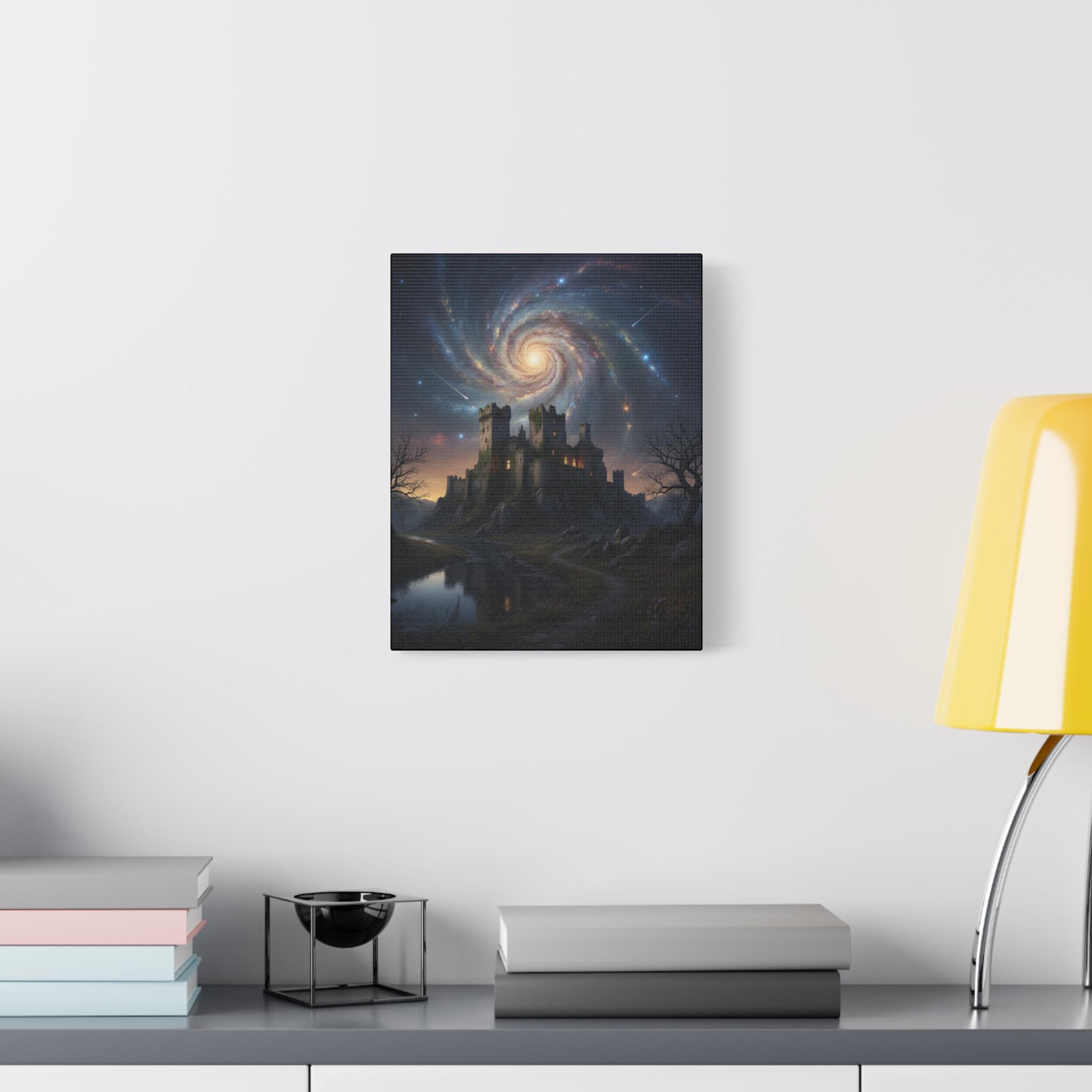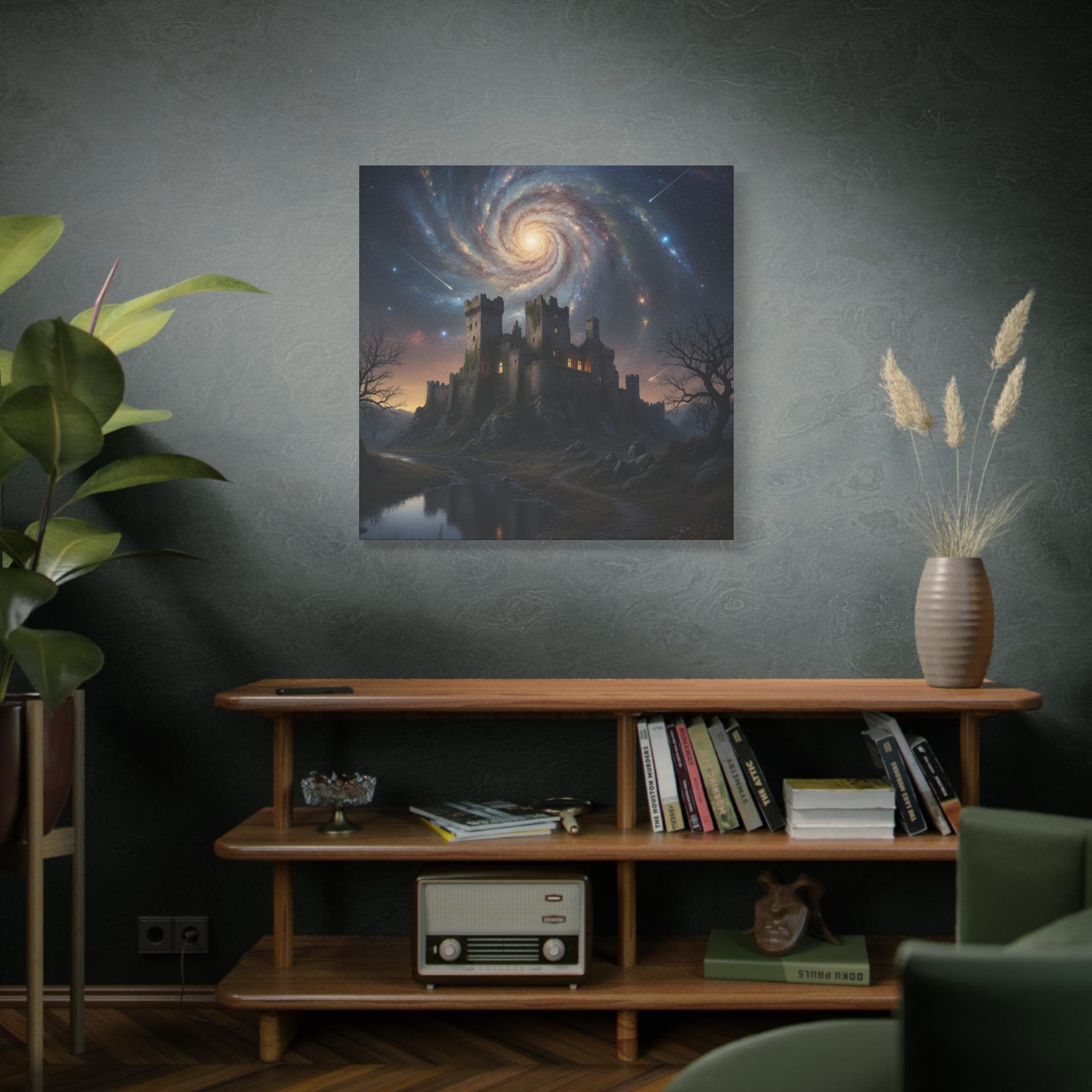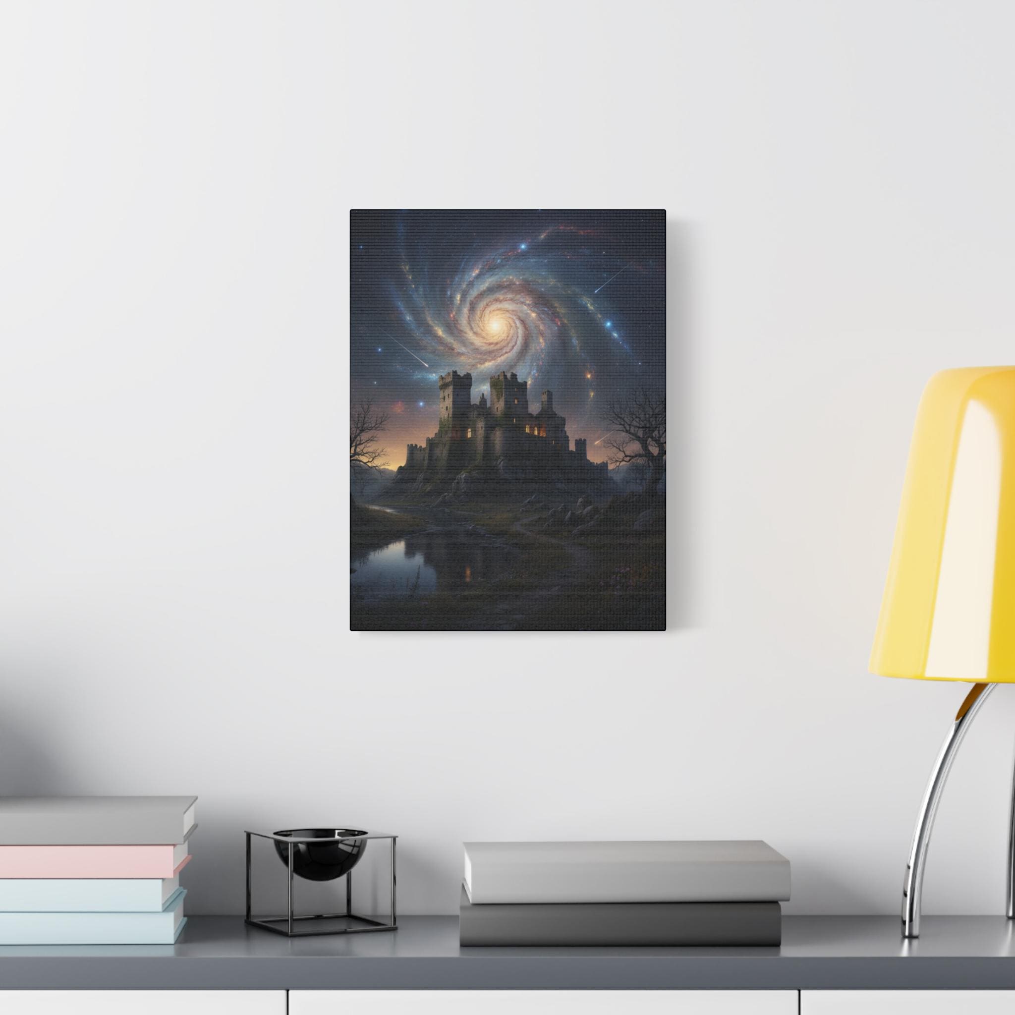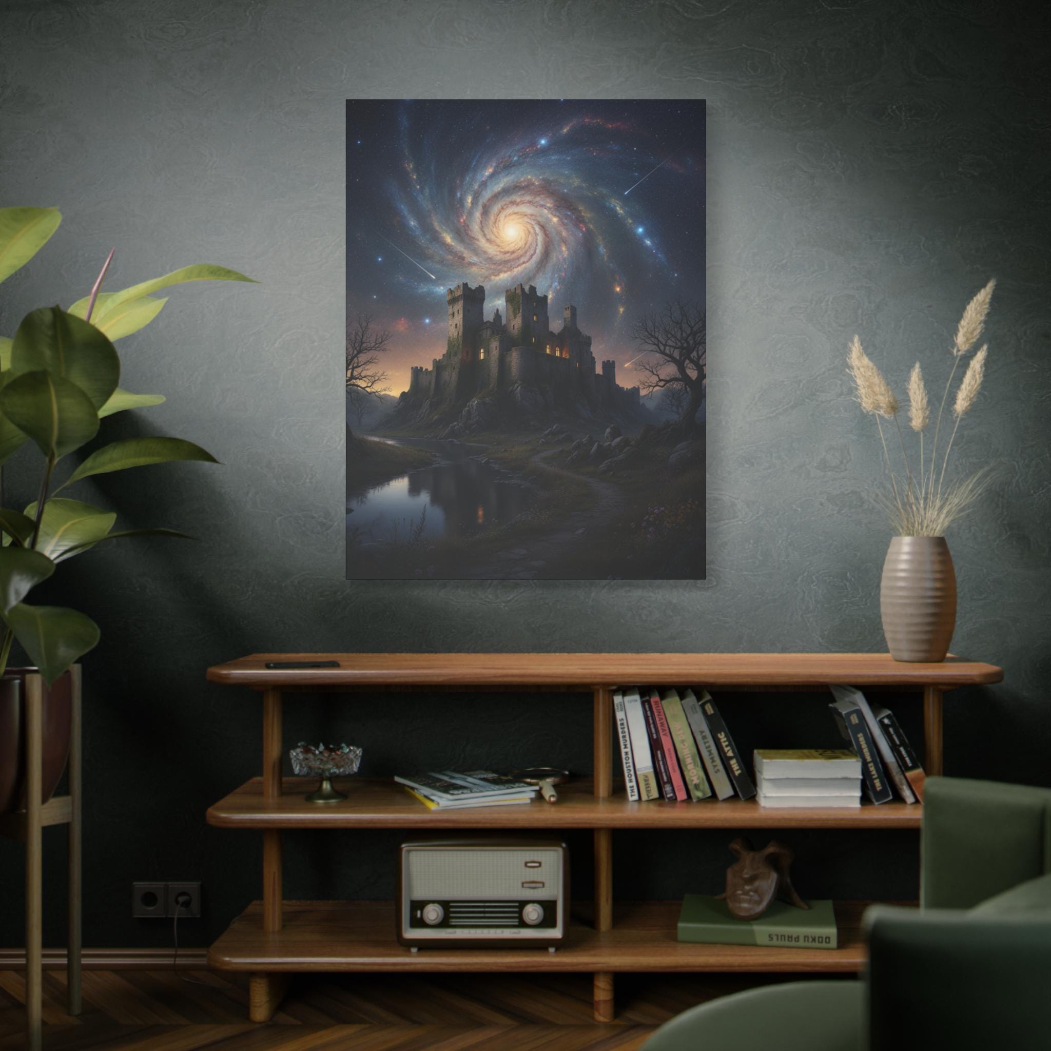 A matte stretched canvas print that brings a quiet, otherworldly castle scene into your home. Deep, velvety tones and a soft, non-reflective finish draw the eye into the moody landscape — a ruined keep beside a reflective pool beneath a spiraling galaxy of stars. The 1.25" gallery-style profile gives the piece presence on the wall while preserving fine detail, and the black-stretched edges create a seamless floating effect. Hang it in a reading nook, above a mantel, or in a dimly lit hallway to deepen an atmosphere of wonder and contemplative calm.