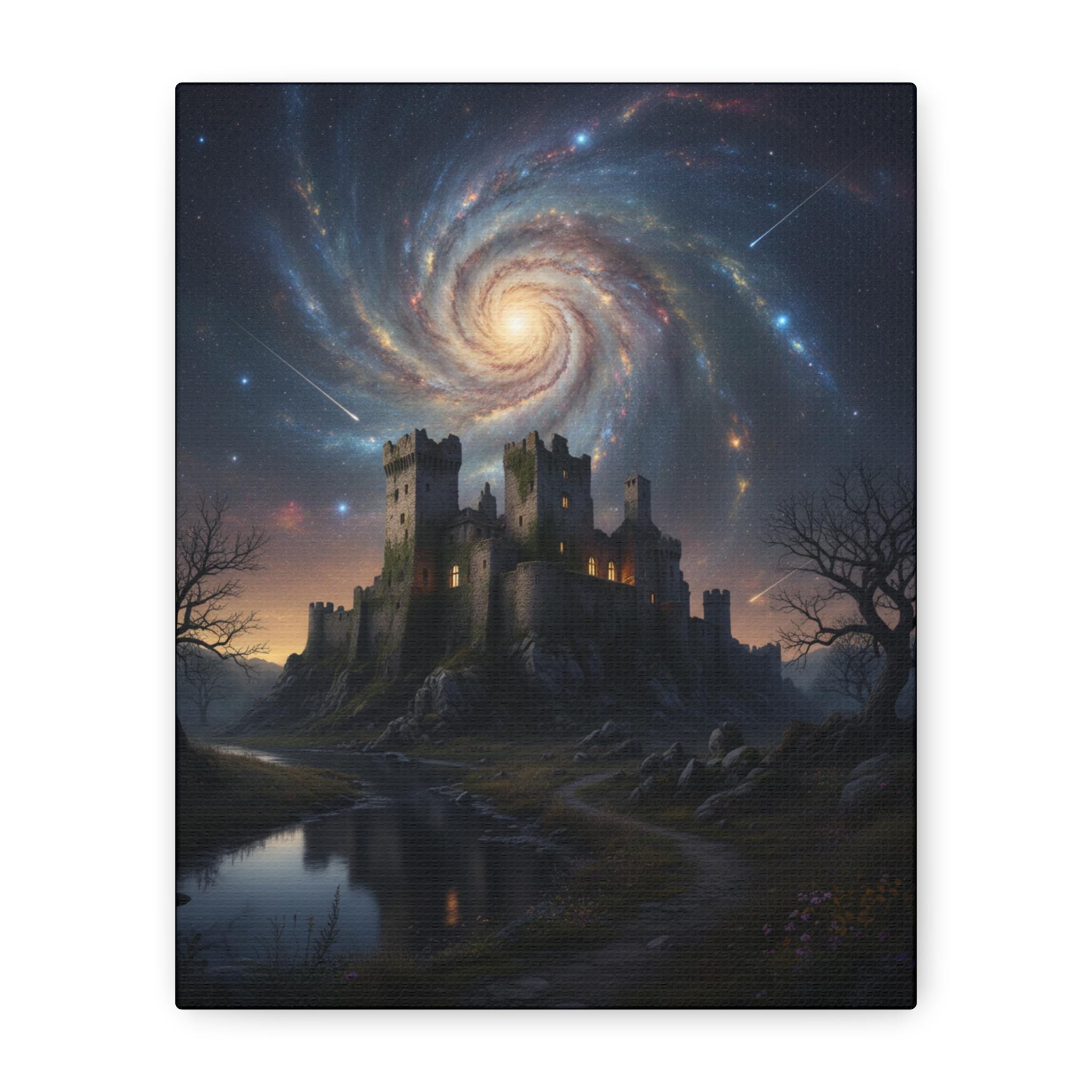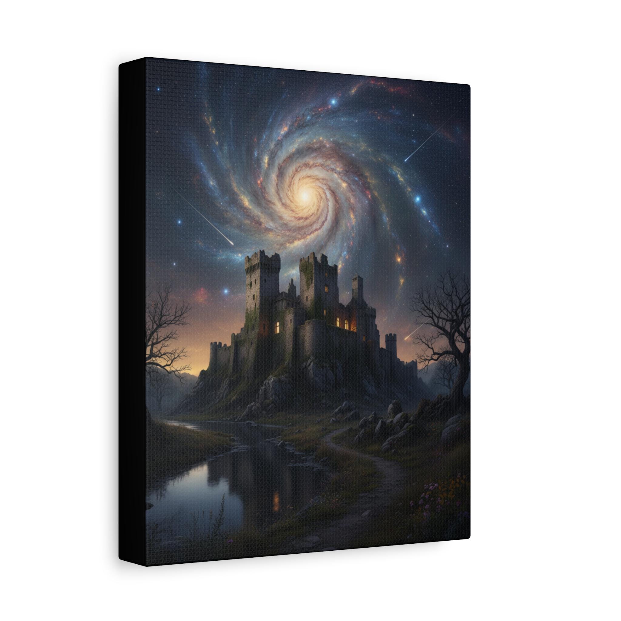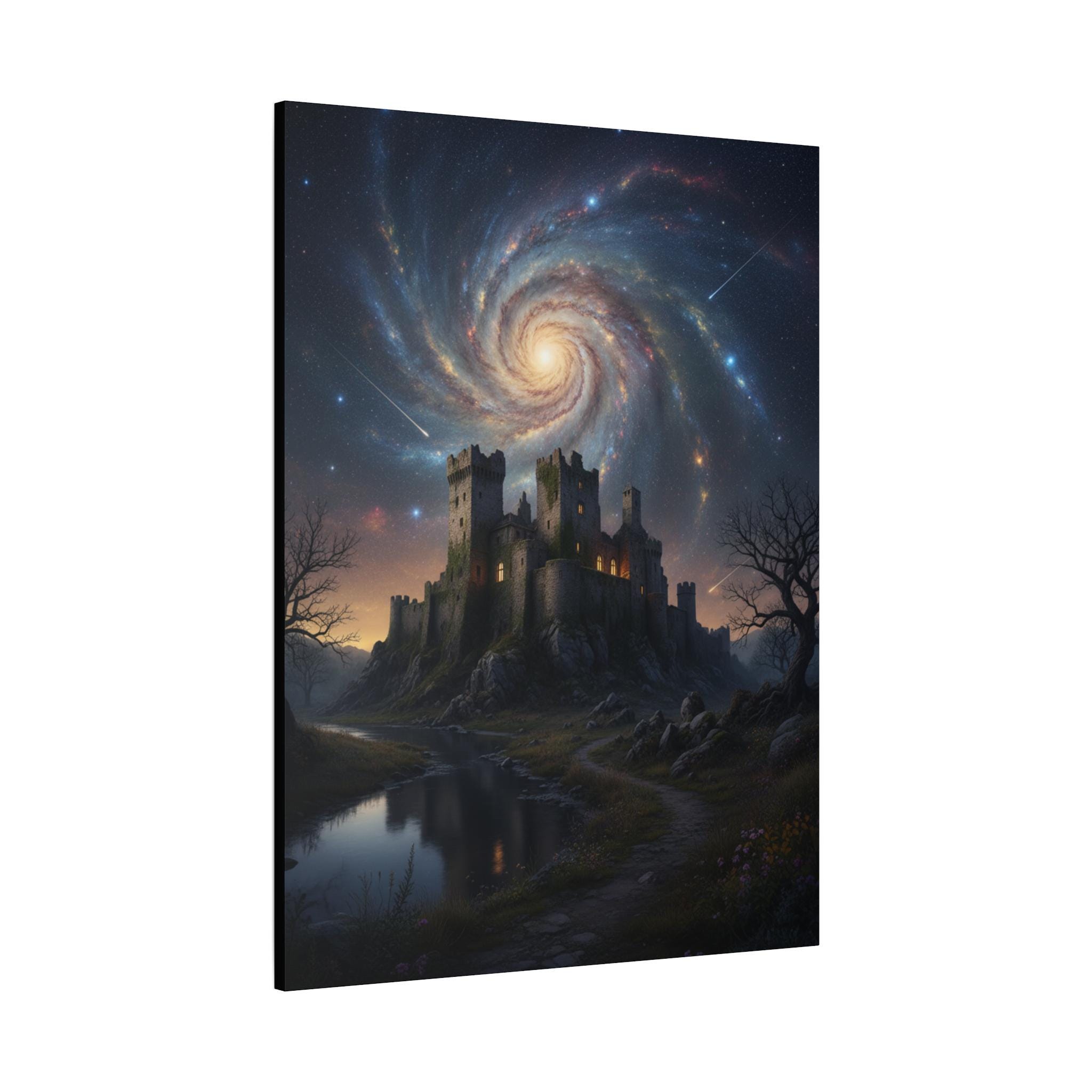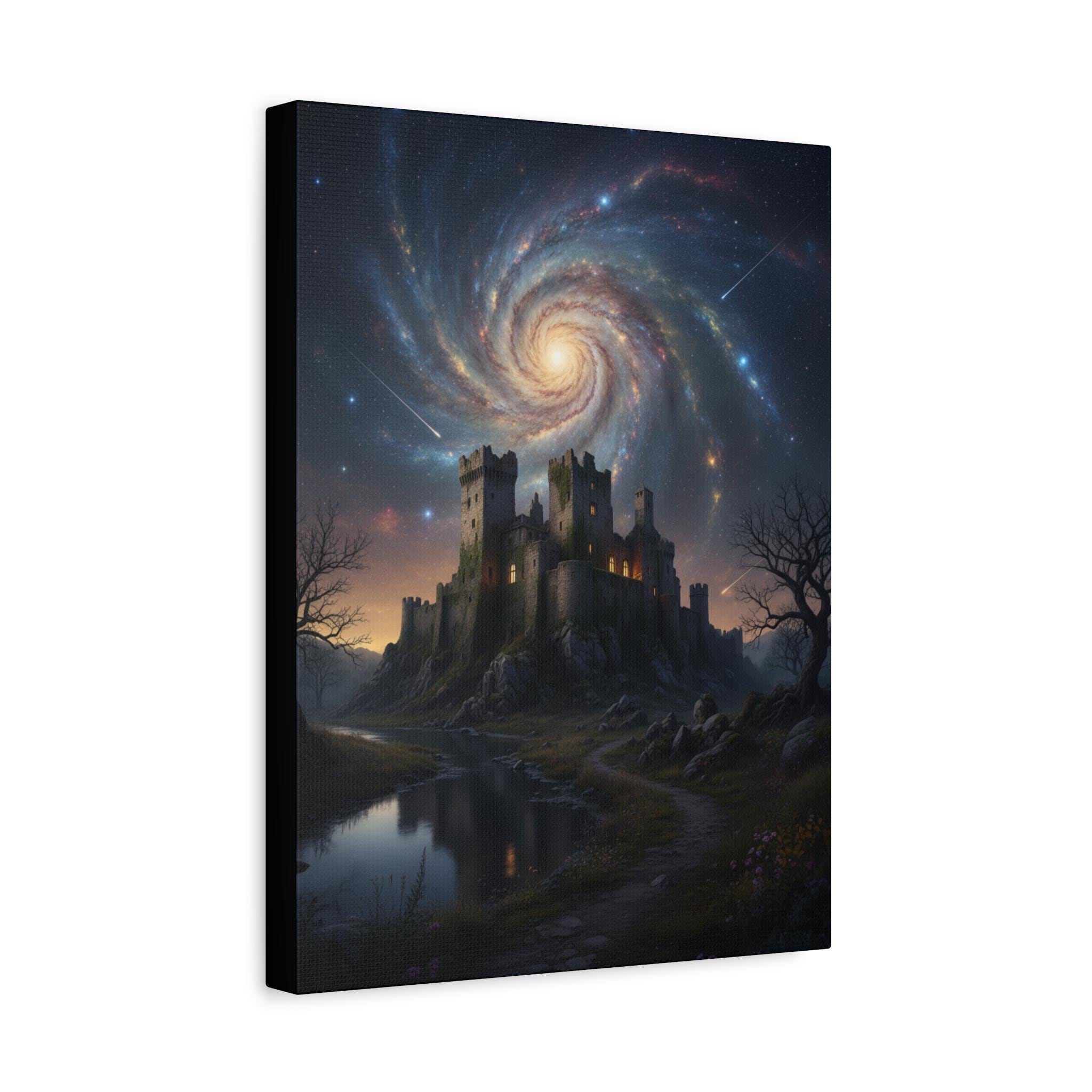 A matte stretched canvas print that brings a quiet, otherworldly castle scene into your home. Deep, velvety tones and a soft, non-reflective finish draw the eye into the moody landscape — a ruined keep beside a reflective pool beneath a spiraling galaxy of stars. The 1.25" gallery-style profile gives the piece presence on the wall while preserving fine detail, and the black-stretched edges create a seamless floating effect. Hang it in a reading nook, above a mantel, or in a dimly lit hallway to deepen an atmosphere of wonder and contemplative calm.