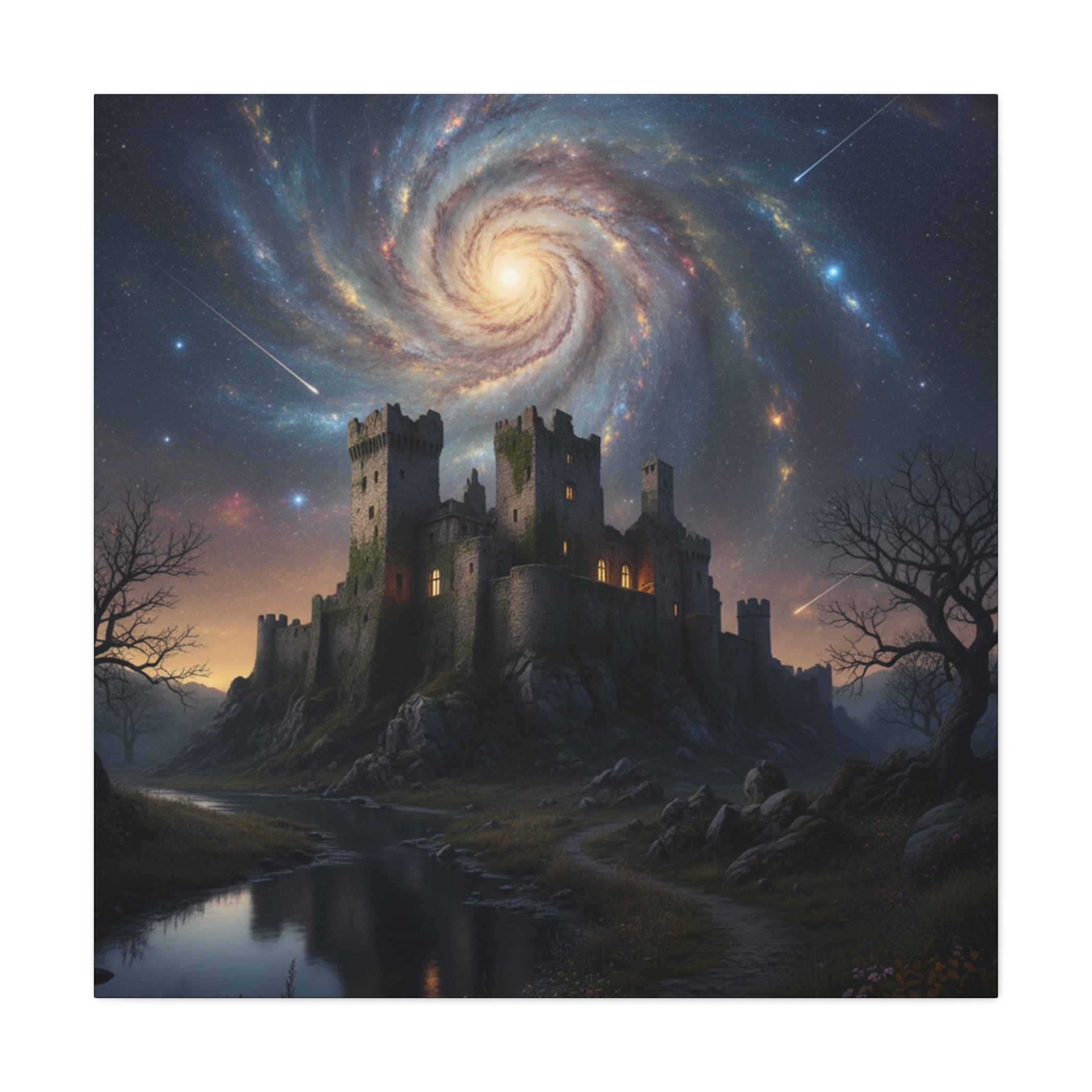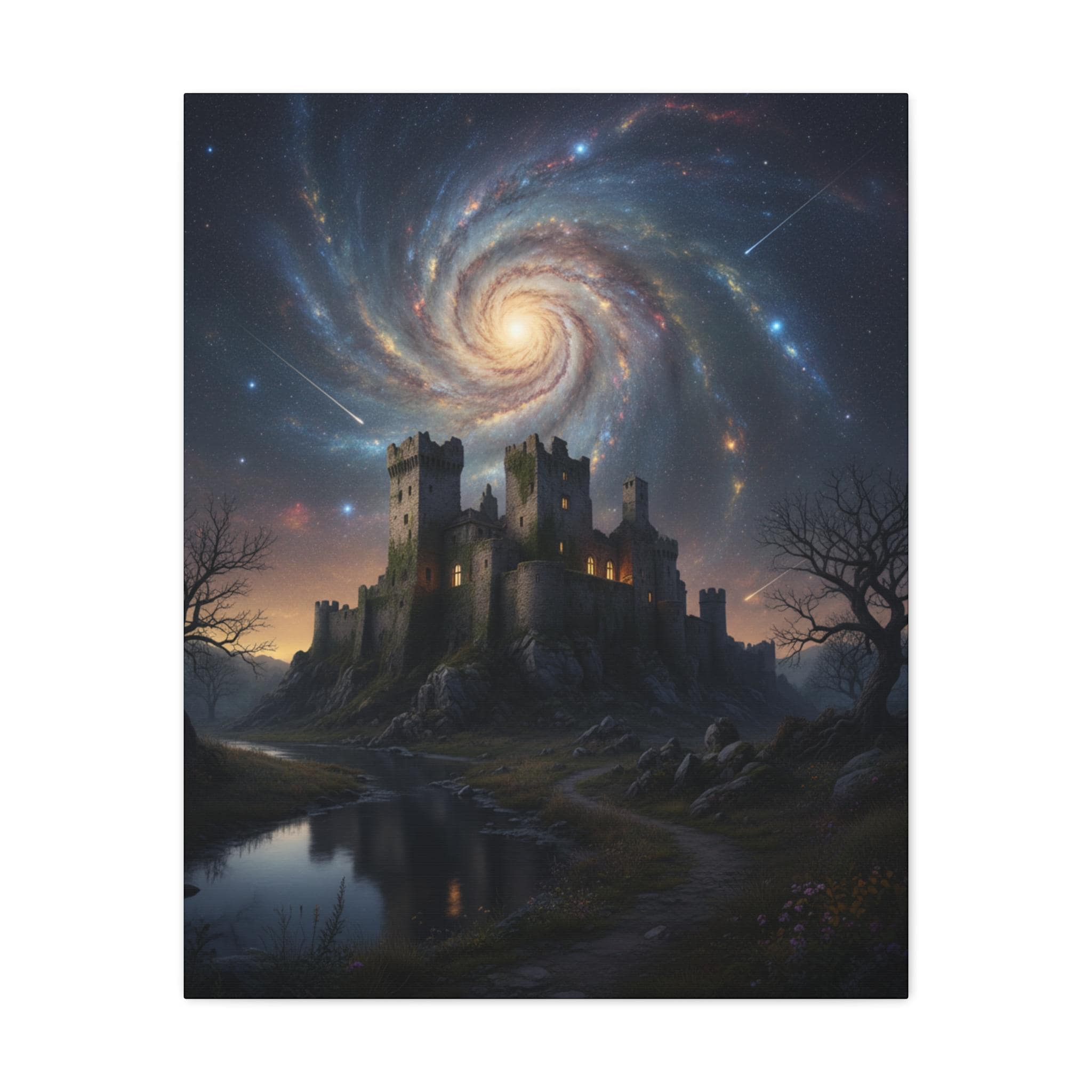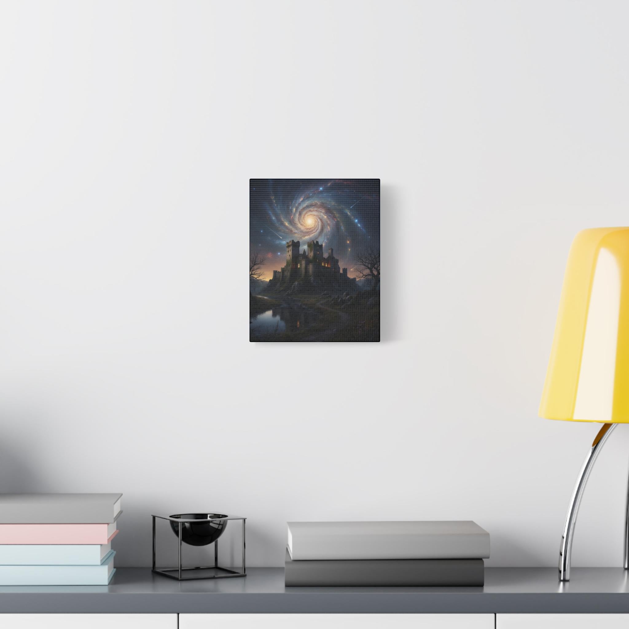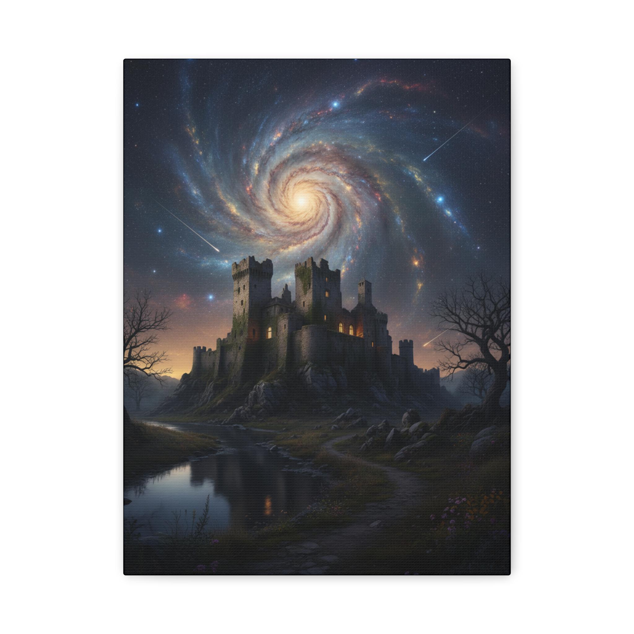 A matte stretched canvas print that brings a quiet, otherworldly castle scene into your home. Deep, velvety tones and a soft, non-reflective finish draw the eye into the moody landscape — a ruined keep beside a reflective pool beneath a spiraling galaxy of stars. The 1.25" gallery-style profile gives the piece presence on the wall while preserving fine detail, and the black-stretched edges create a seamless floating effect. Hang it in a reading nook, above a mantel, or in a dimly lit hallway to deepen an atmosphere of wonder and contemplative calm.