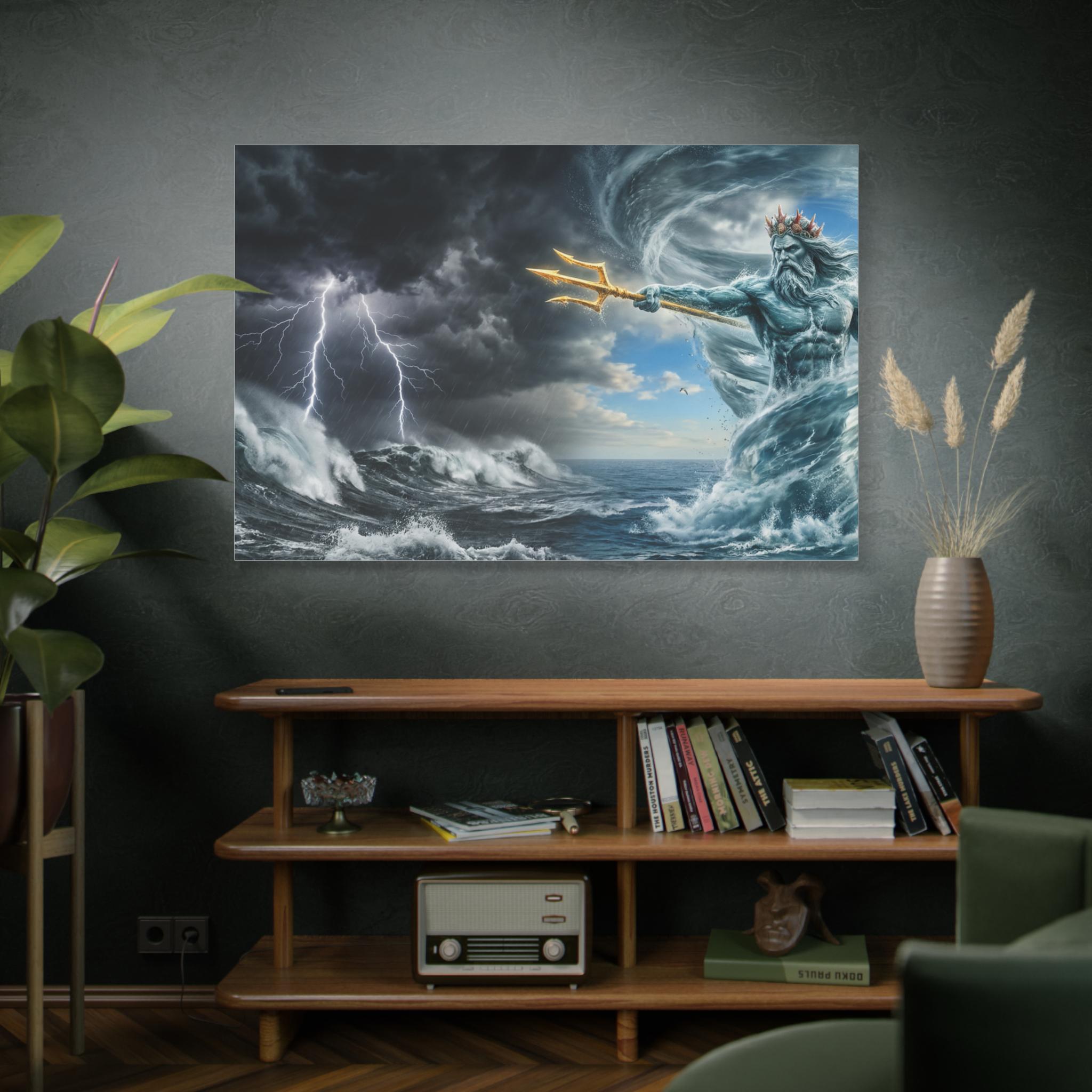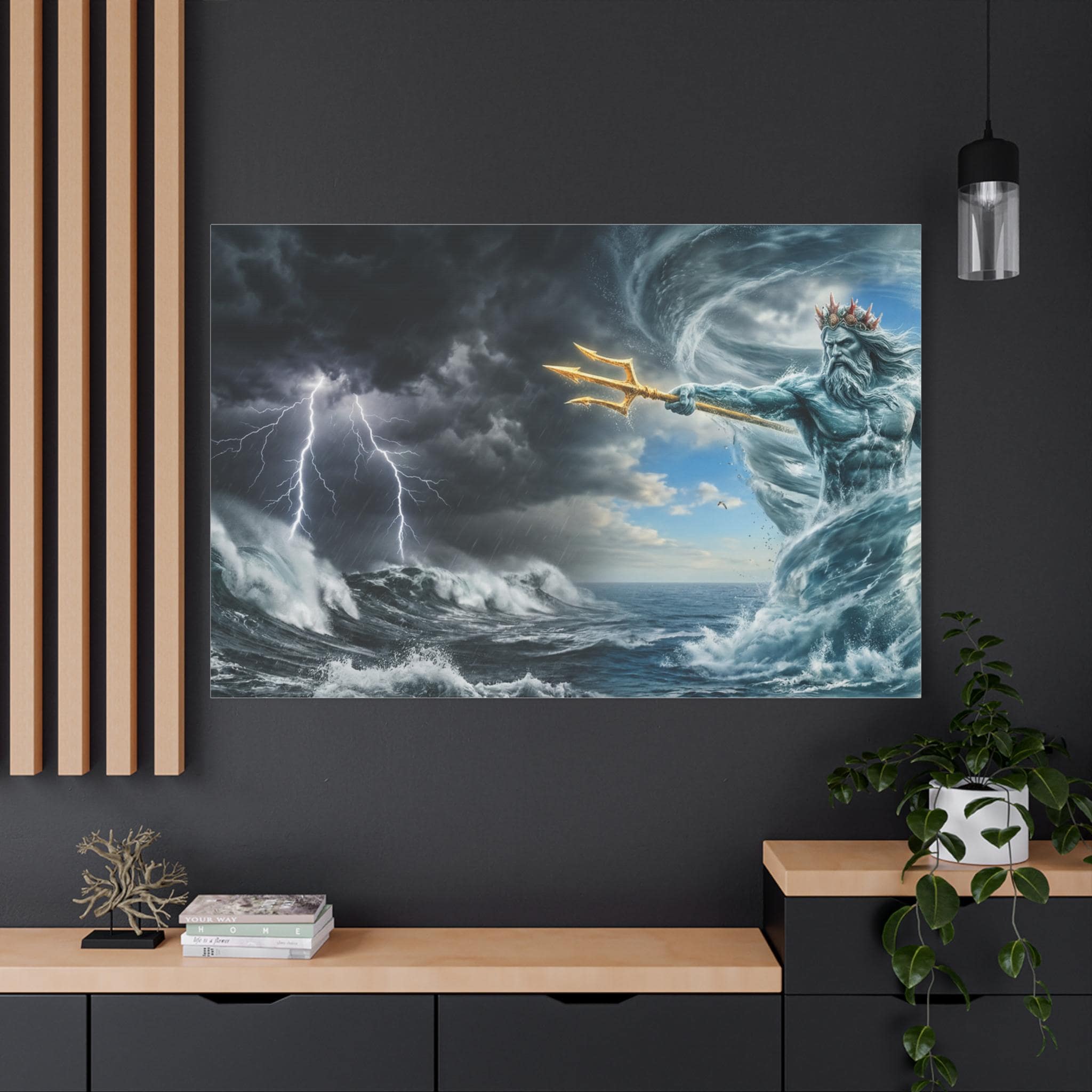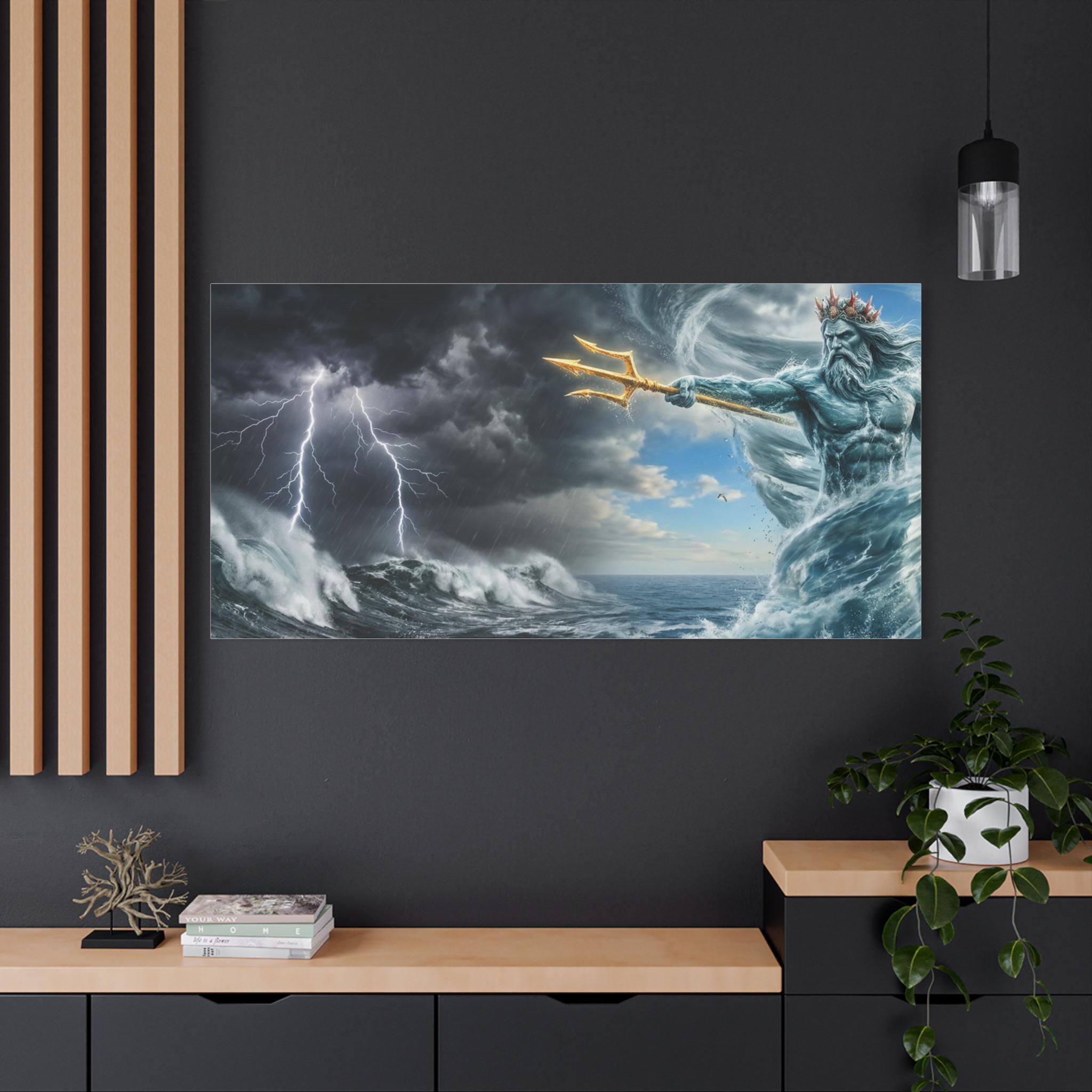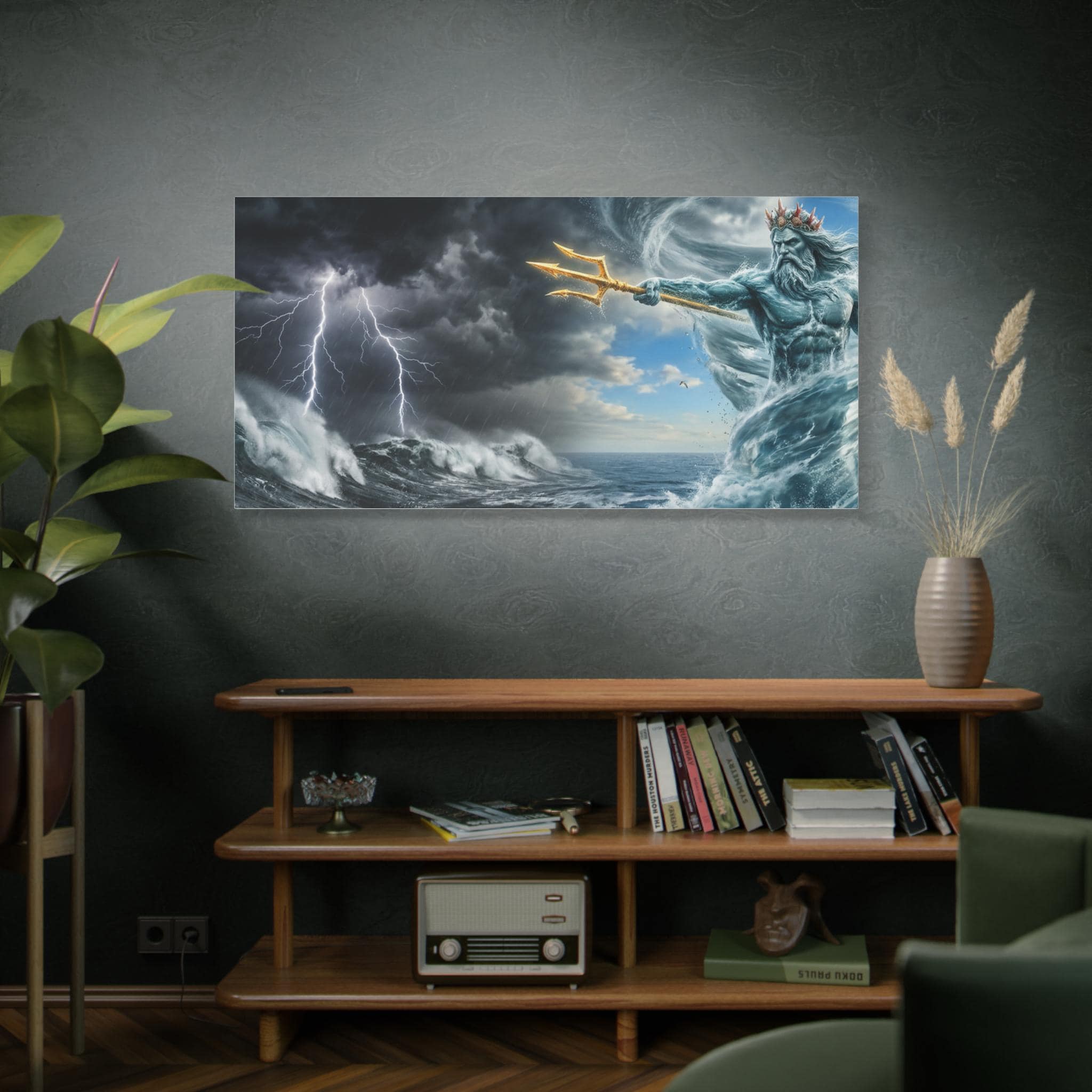 A dramatic matte canvas print that captures the raw power of the sea and a mythic sea god commanding storm and surf. Deep, stormy grays and electric highlights bring movement and tension to any wall. Stretched on a 1.25" pine profile, the artwork sits flush from the edge for a modern gallery look while the matte finish softens glare and emphasizes painterly detail. This piece settles into living rooms, dens, or creative spaces where bold, atmospheric art sets the mood — a visual anchor for ocean lovers, fantasy collectors, and storytellers who want walls that feel alive.