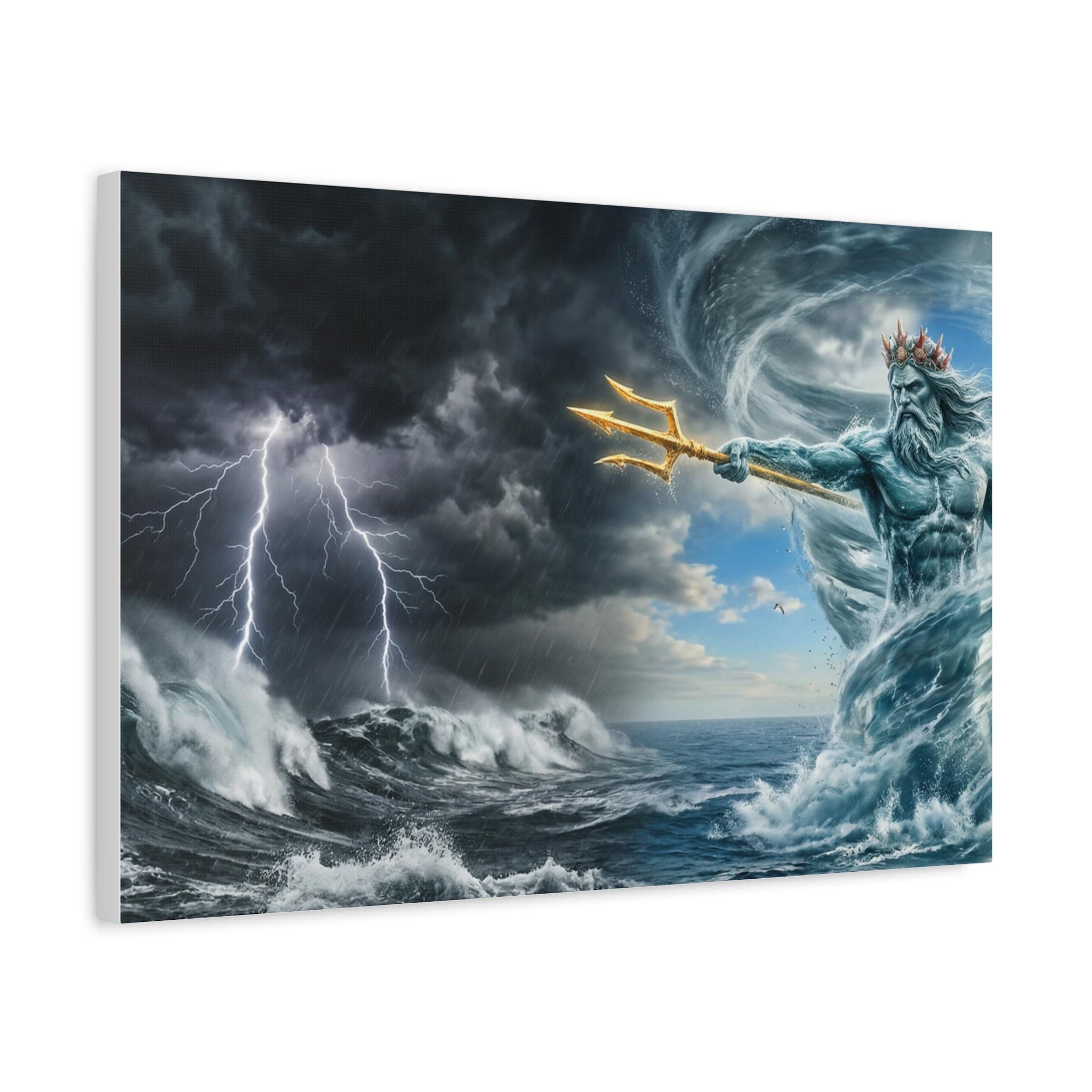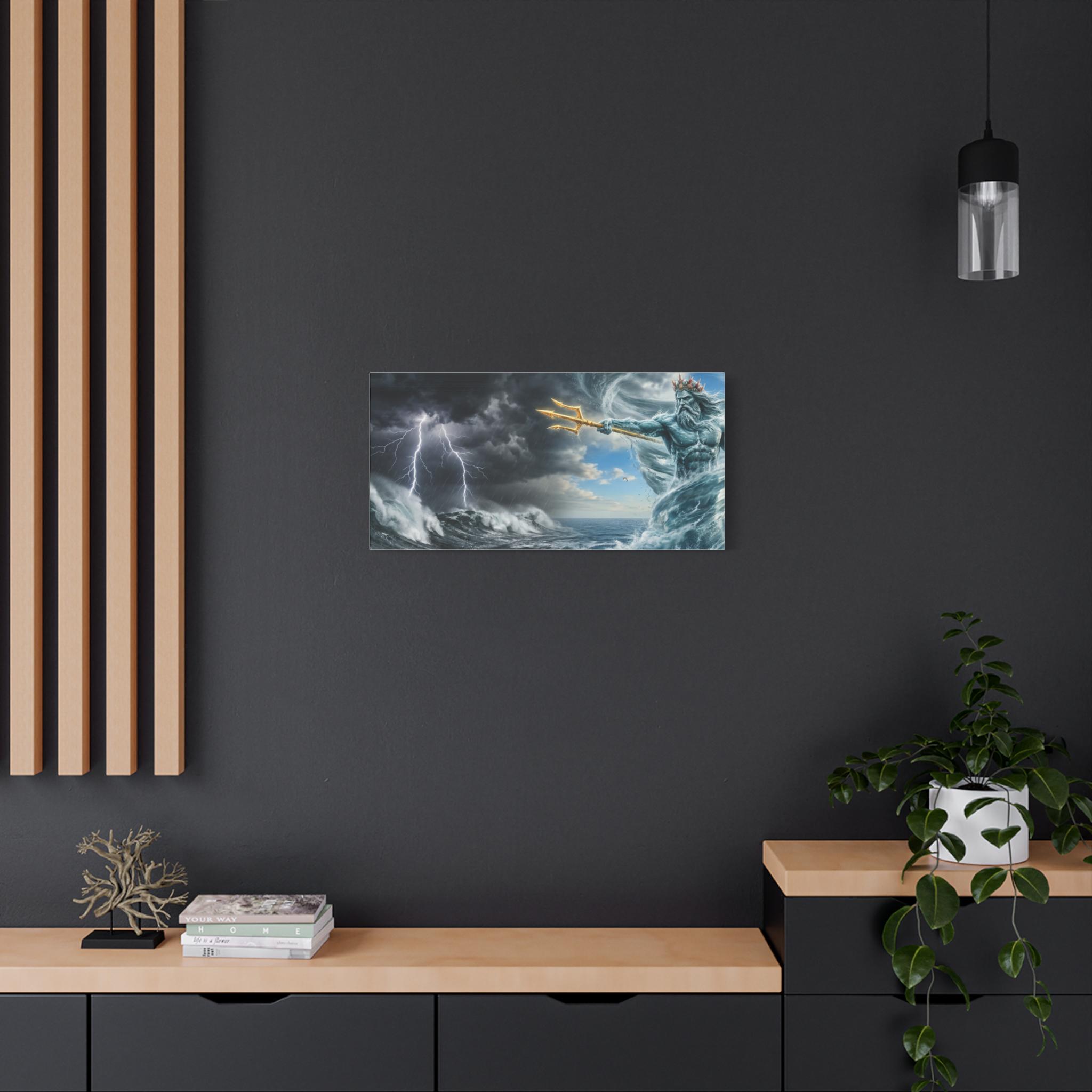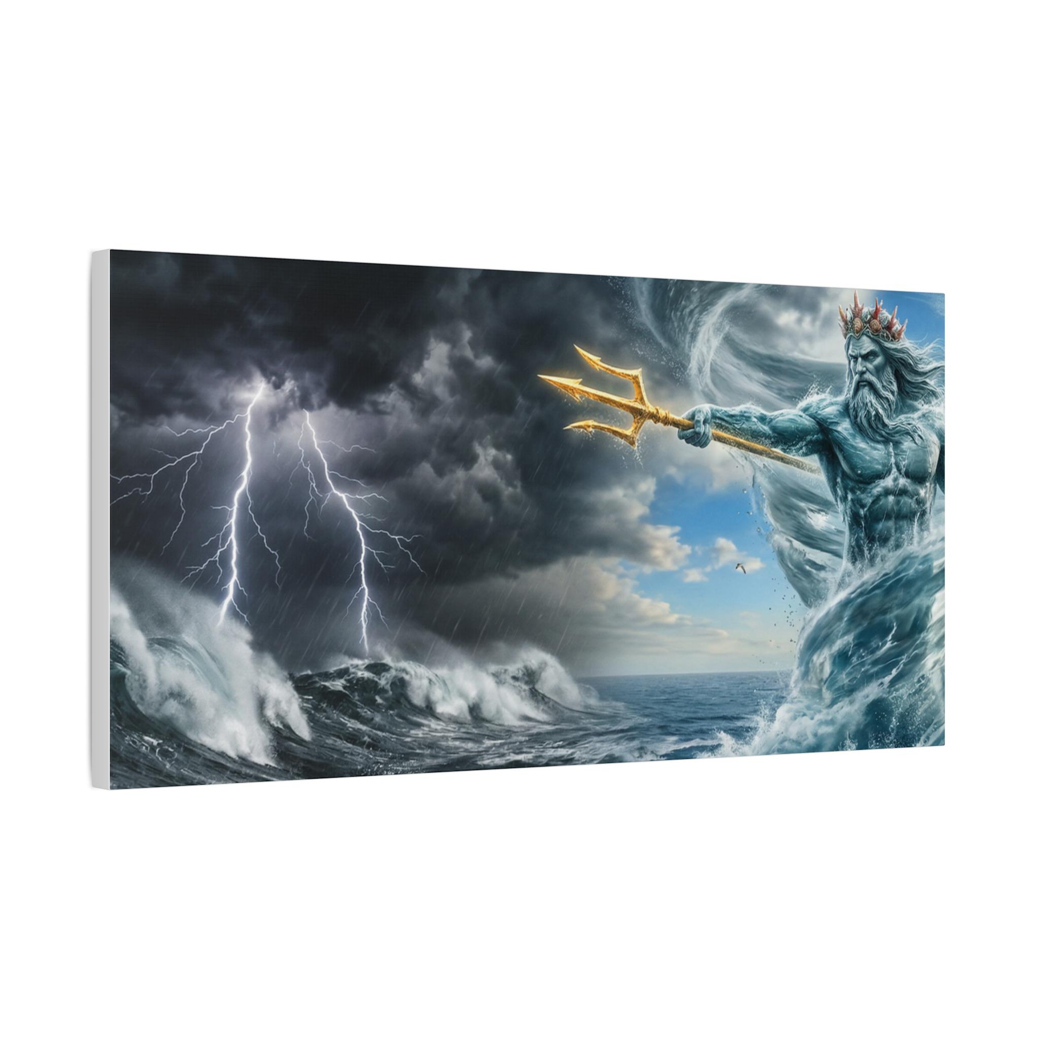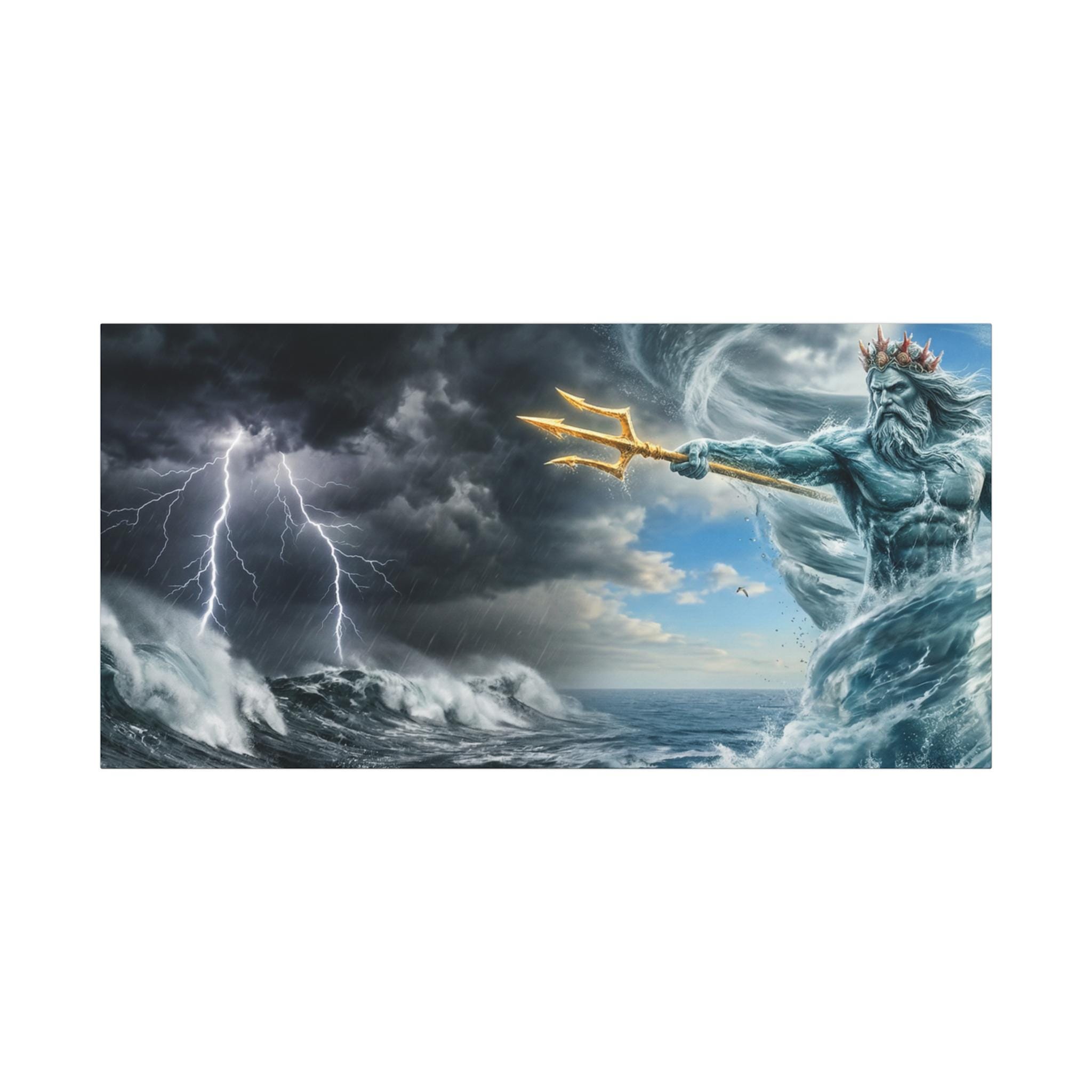A dramatic matte canvas print that captures the raw power of the sea and a mythic sea god commanding storm and surf. Deep, stormy grays and electric highlights bring movement and tension to any wall. Stretched on a 1.25" pine profile, the artwork sits flush from the edge for a modern gallery look while the matte finish softens glare and emphasizes painterly detail. This piece settles into living rooms, dens, or creative spaces where bold, atmospheric art sets the mood — a visual anchor for ocean lovers, fantasy collectors, and storytellers who want walls that feel alive.