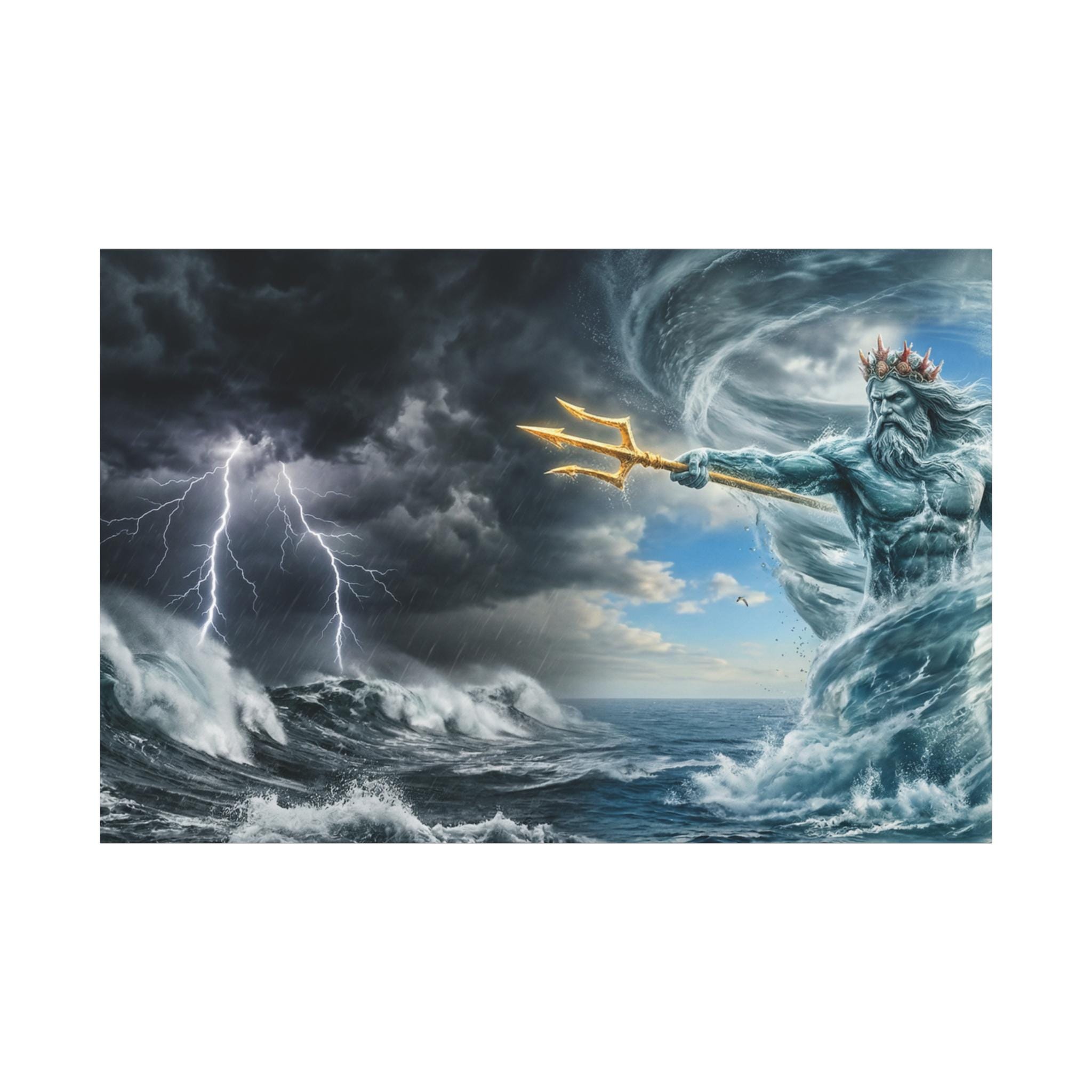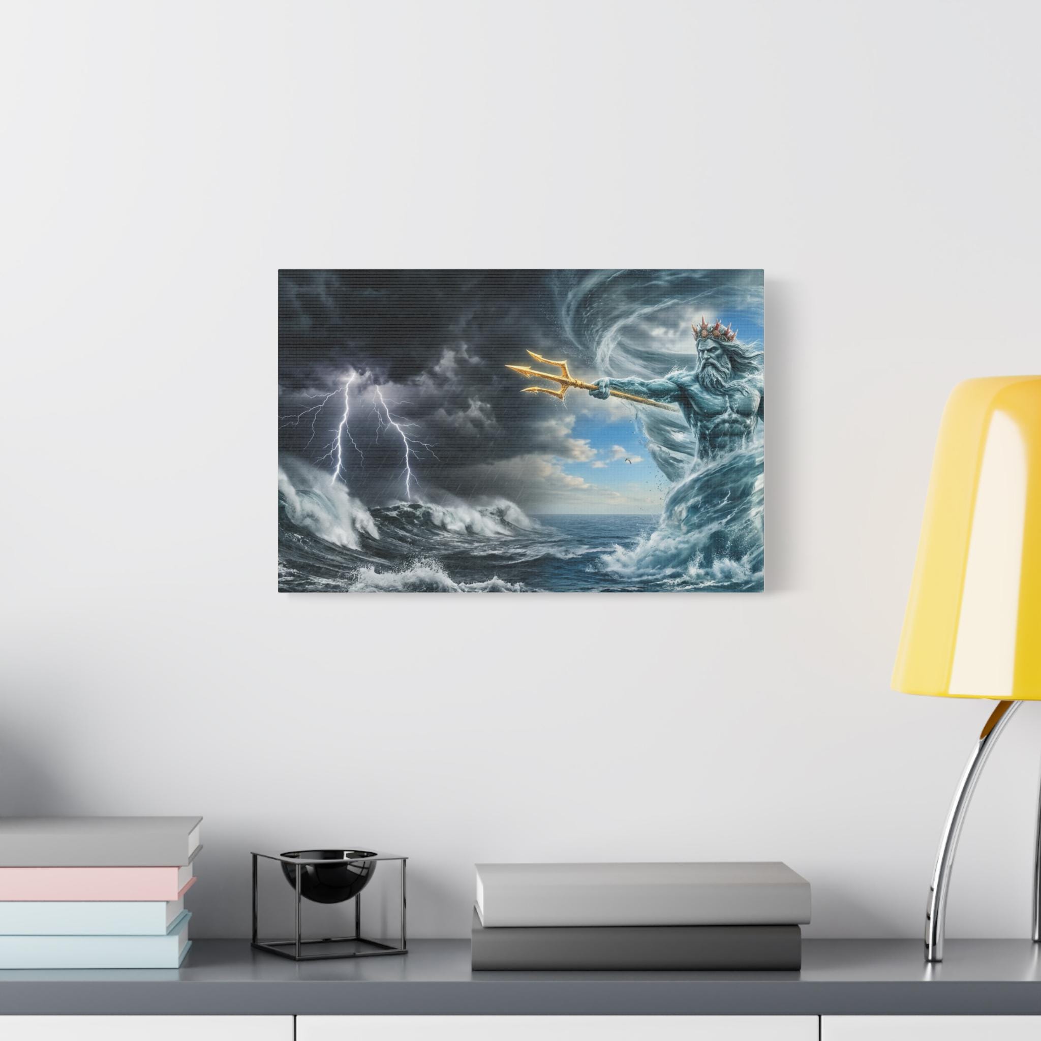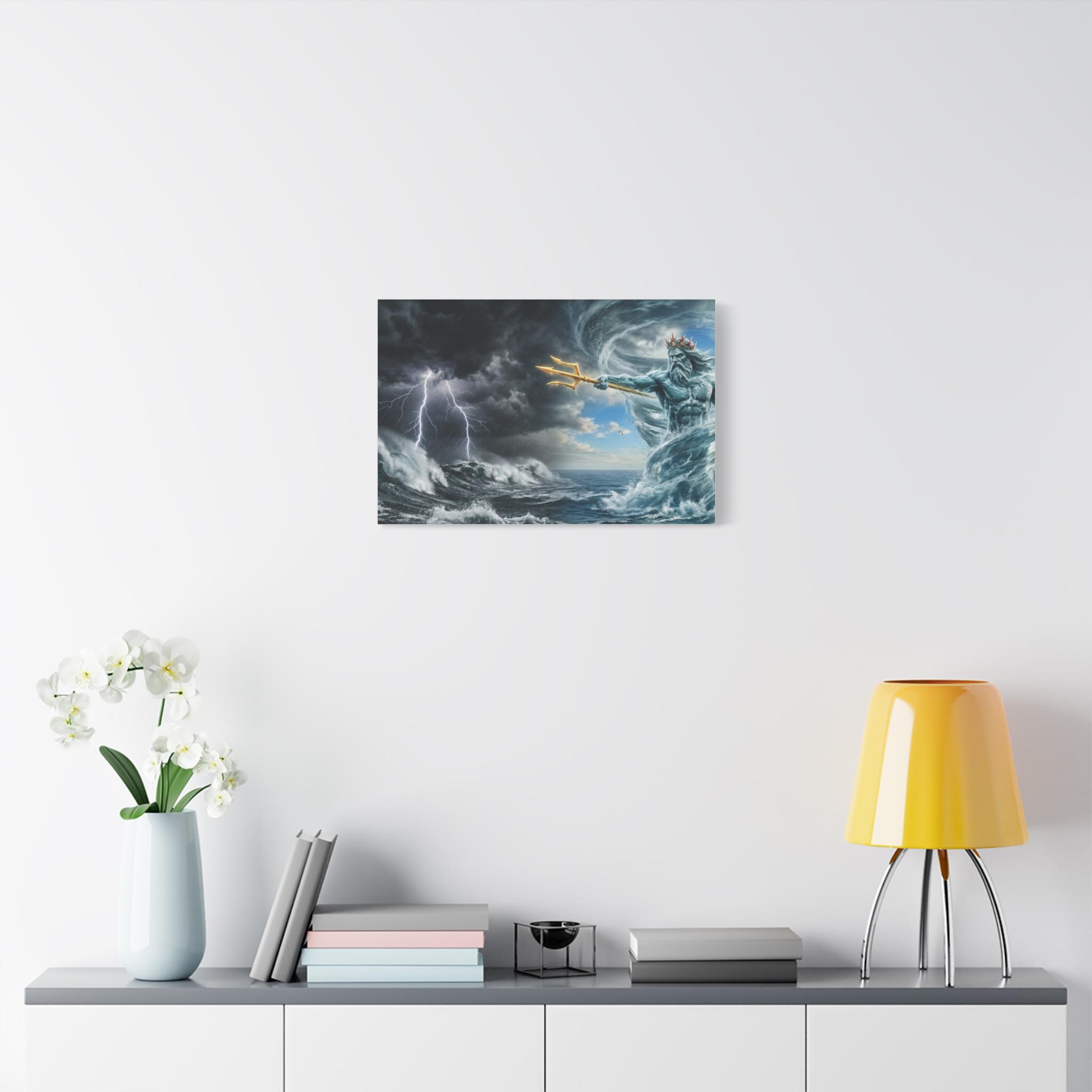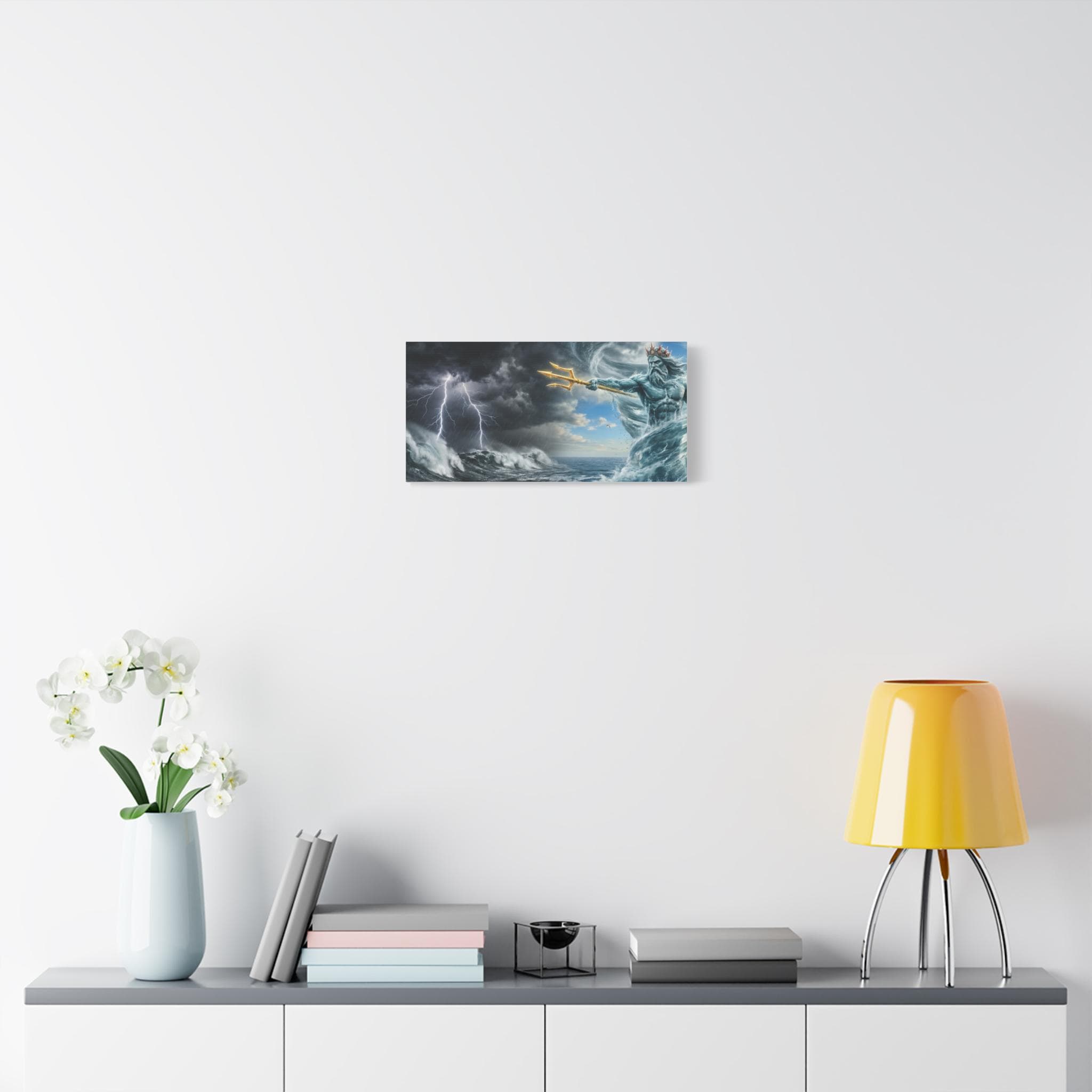 A dramatic matte canvas print that captures the raw power of the sea and a mythic sea god commanding storm and surf. Deep, stormy grays and electric highlights bring movement and tension to any wall. Stretched on a 1.25" pine profile, the artwork sits flush from the edge for a modern gallery look while the matte finish softens glare and emphasizes painterly detail. This piece settles into living rooms, dens, or creative spaces where bold, atmospheric art sets the mood — a visual anchor for ocean lovers, fantasy collectors, and storytellers who want walls that feel alive.