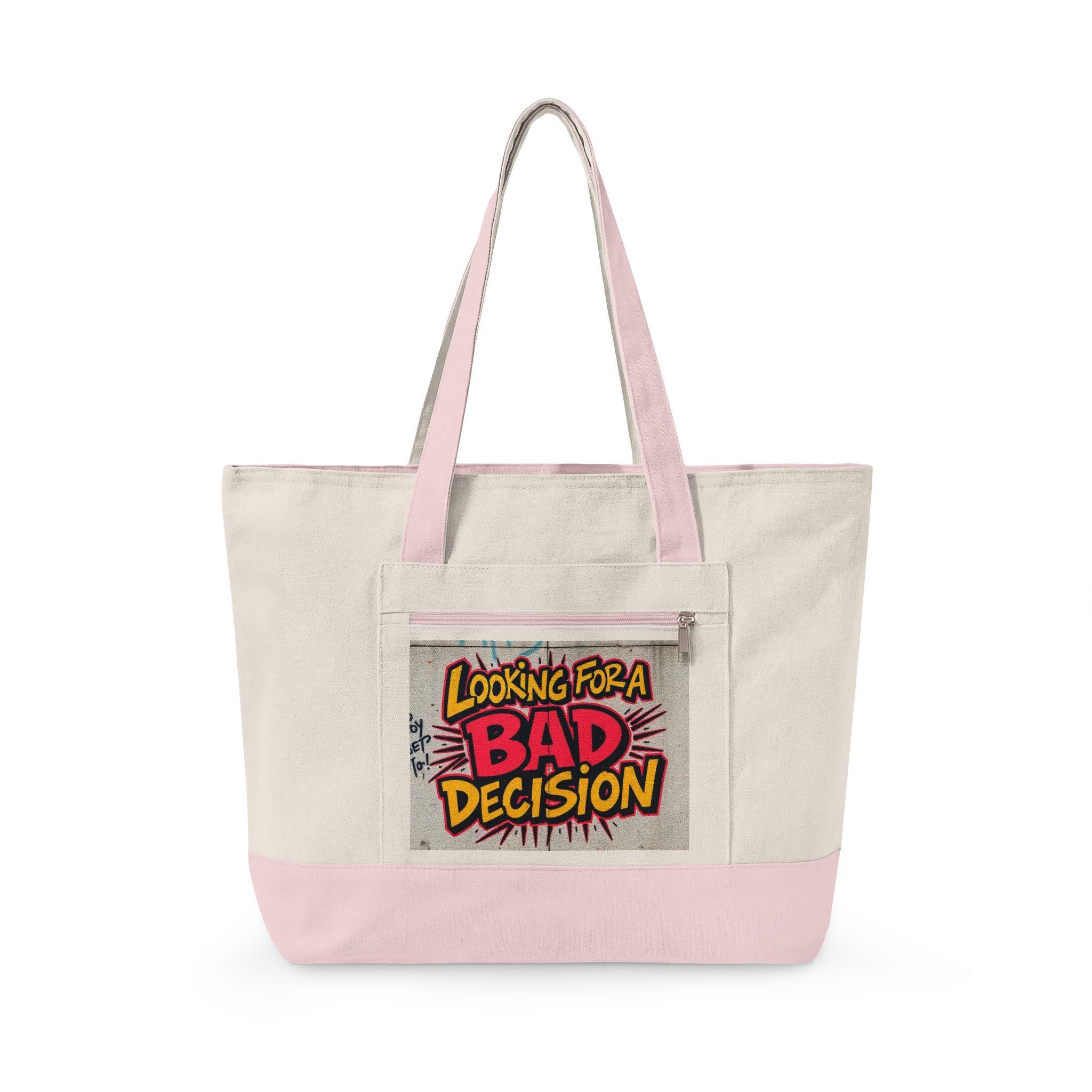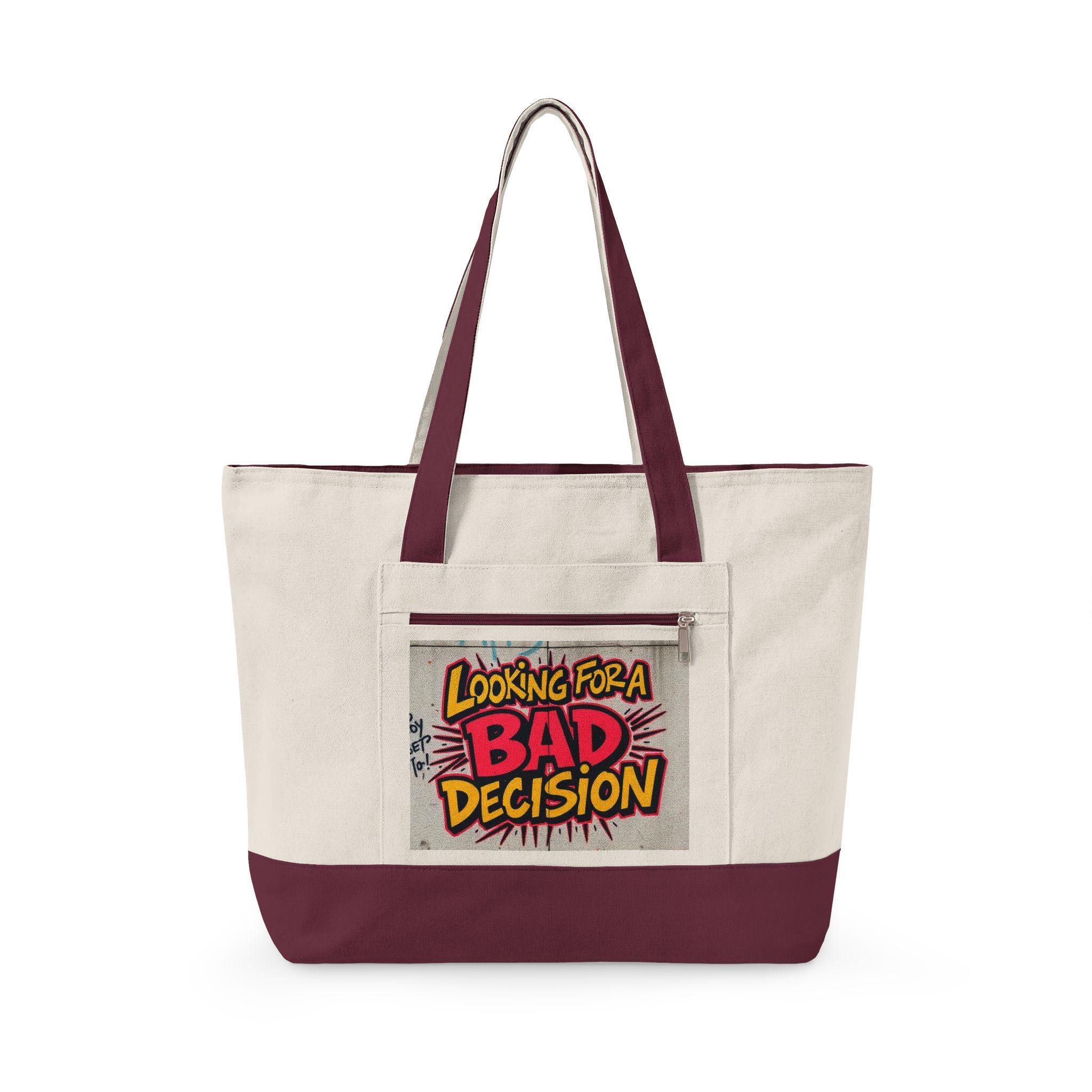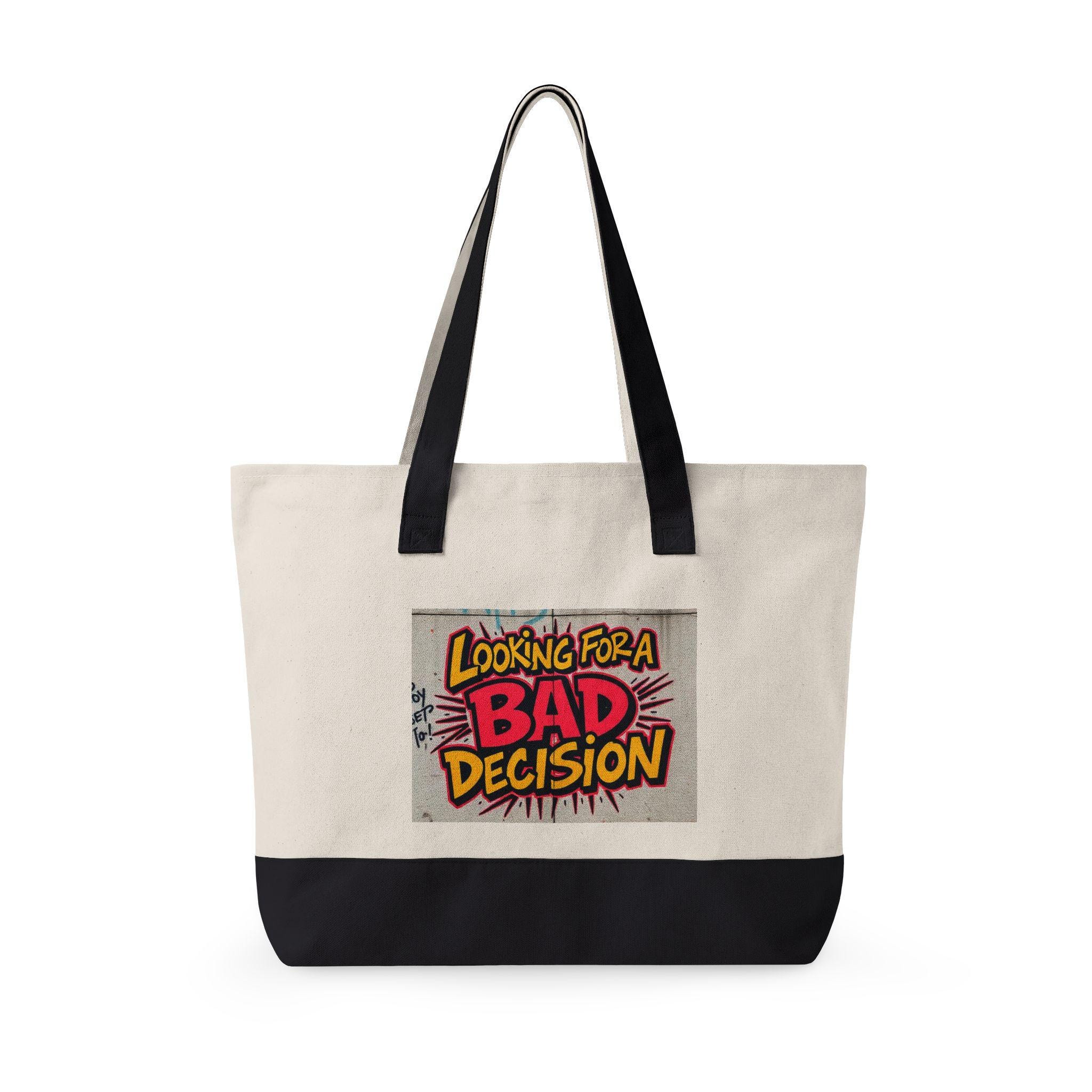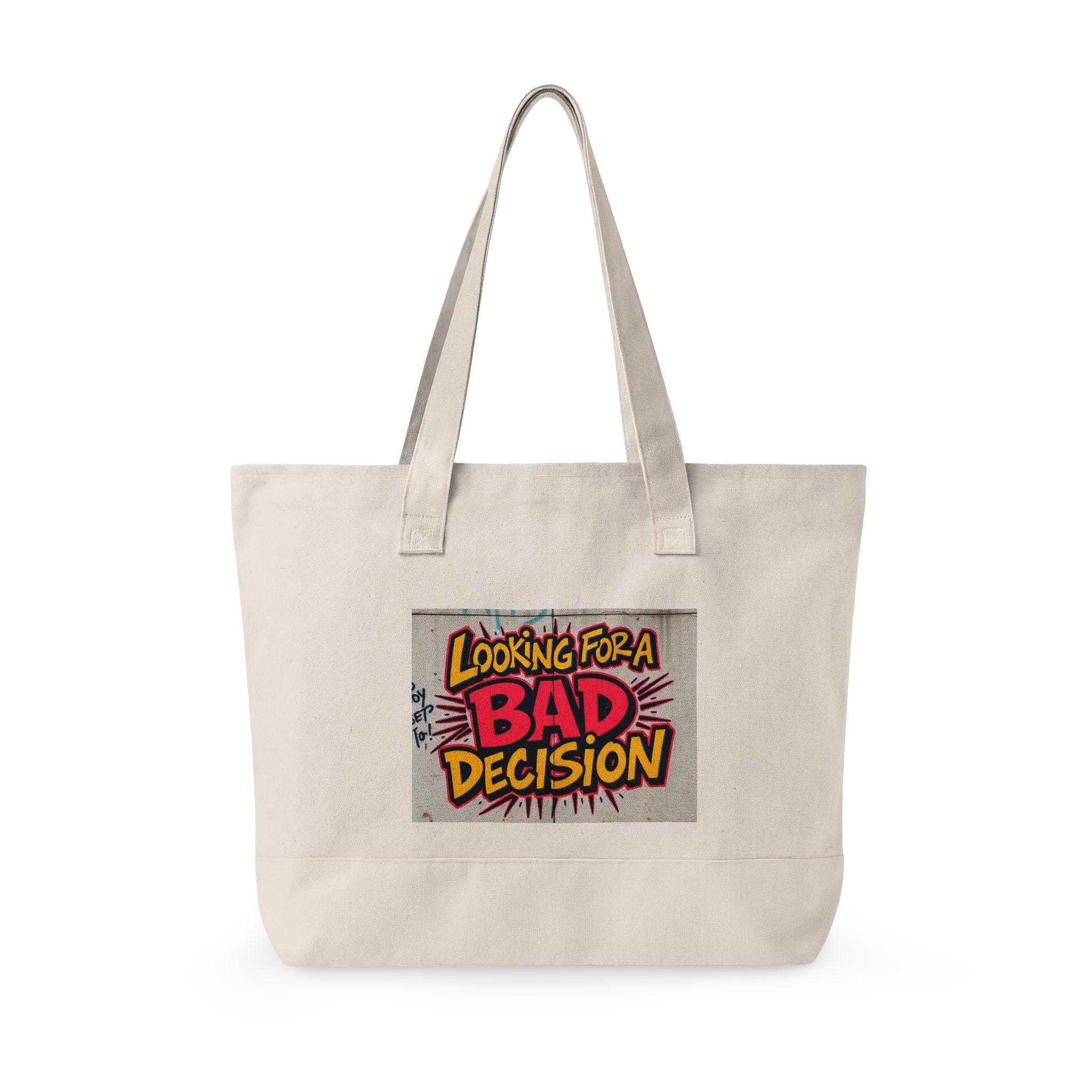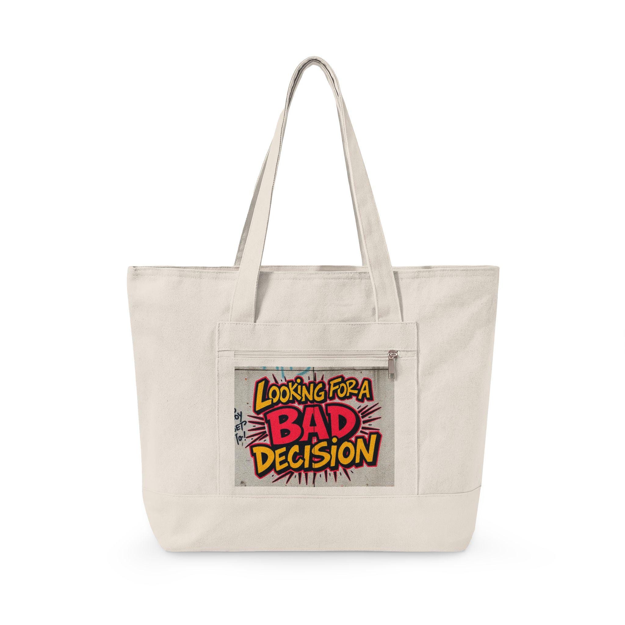 Lightweight grit with room for everything. This heavy cotton canvas tote carries a loud, playful patch — a comic-style “Looking for a BAD Decision” design — that turns everyday errands into a small act of self-expression. The wide, zippered main compartment keeps a laptop, notebooks, or market finds from spilling out, while the front zip pocket keeps keys, cards, and a phone within quick reach. Sturdy 24½" handles sit comfortably over the shoulder, and the oversized 19L capacity makes it a go-to companion for days when you want both function and attitude. Bring it to weekend markets, late-night hangouts, or city strolls when you’re in the mood for mischief and practicality.