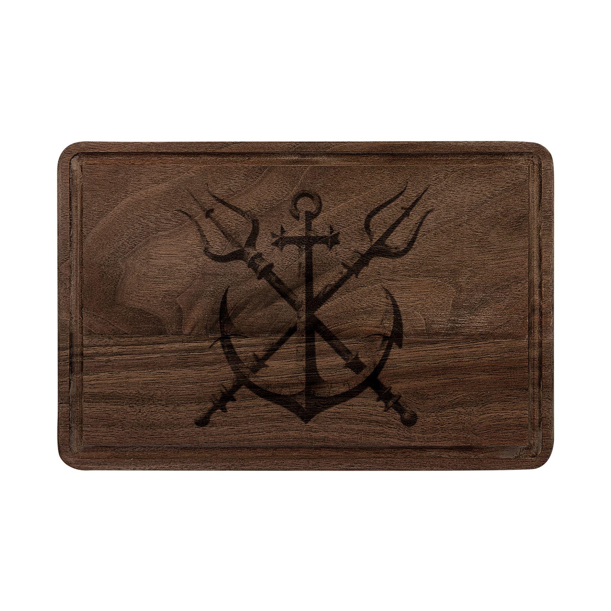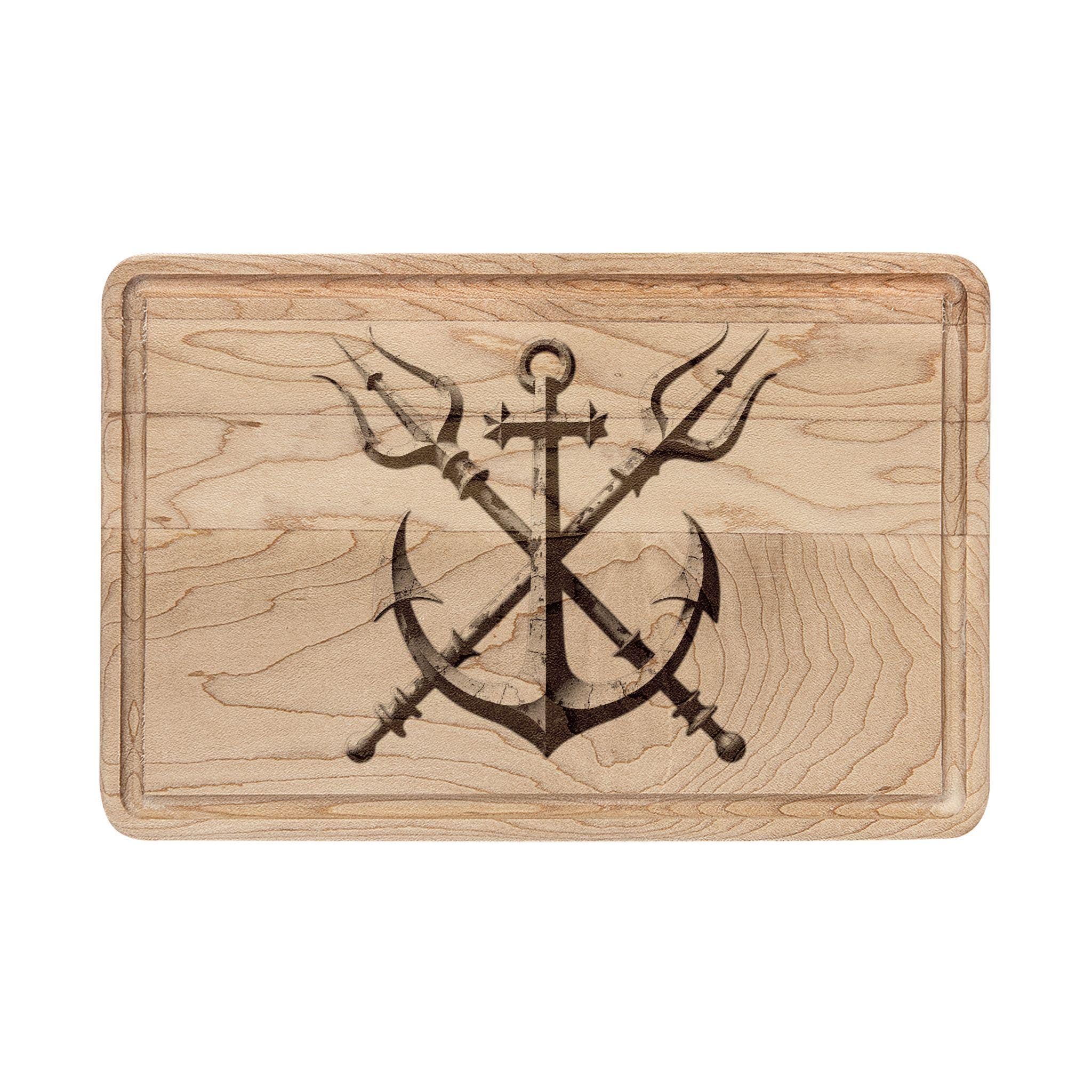 This hand-engraved wooden cutting board brings quiet coastal charm to everyday cooking. Crafted from premium walnut or maple, the board features a deep, textured anchor-and-trident motif that reads like a small piece of maritime art. The routed juice groove and smooth, finished surface make it useful at the counter and elegant on the table. It’s the kind of board you reach for when you want your kitchen to feel lived-in and warm — whether you’re slicing crusty bread after a seaside walk or carving a roast for a cozy dinner with friends. Each board is made in the USA and finished by hand, so the grain and engraving carry a subtle uniqueness that adds character to your home.