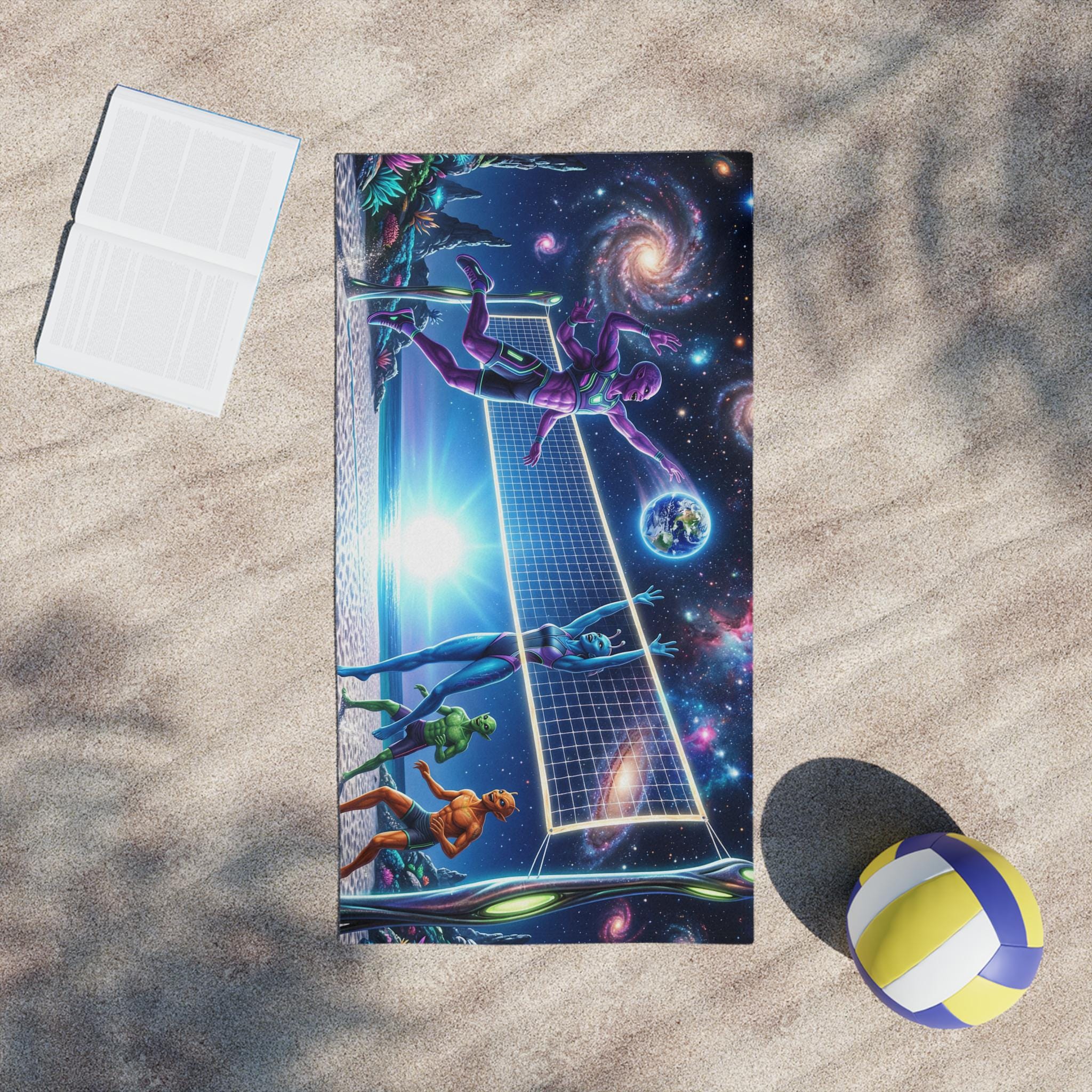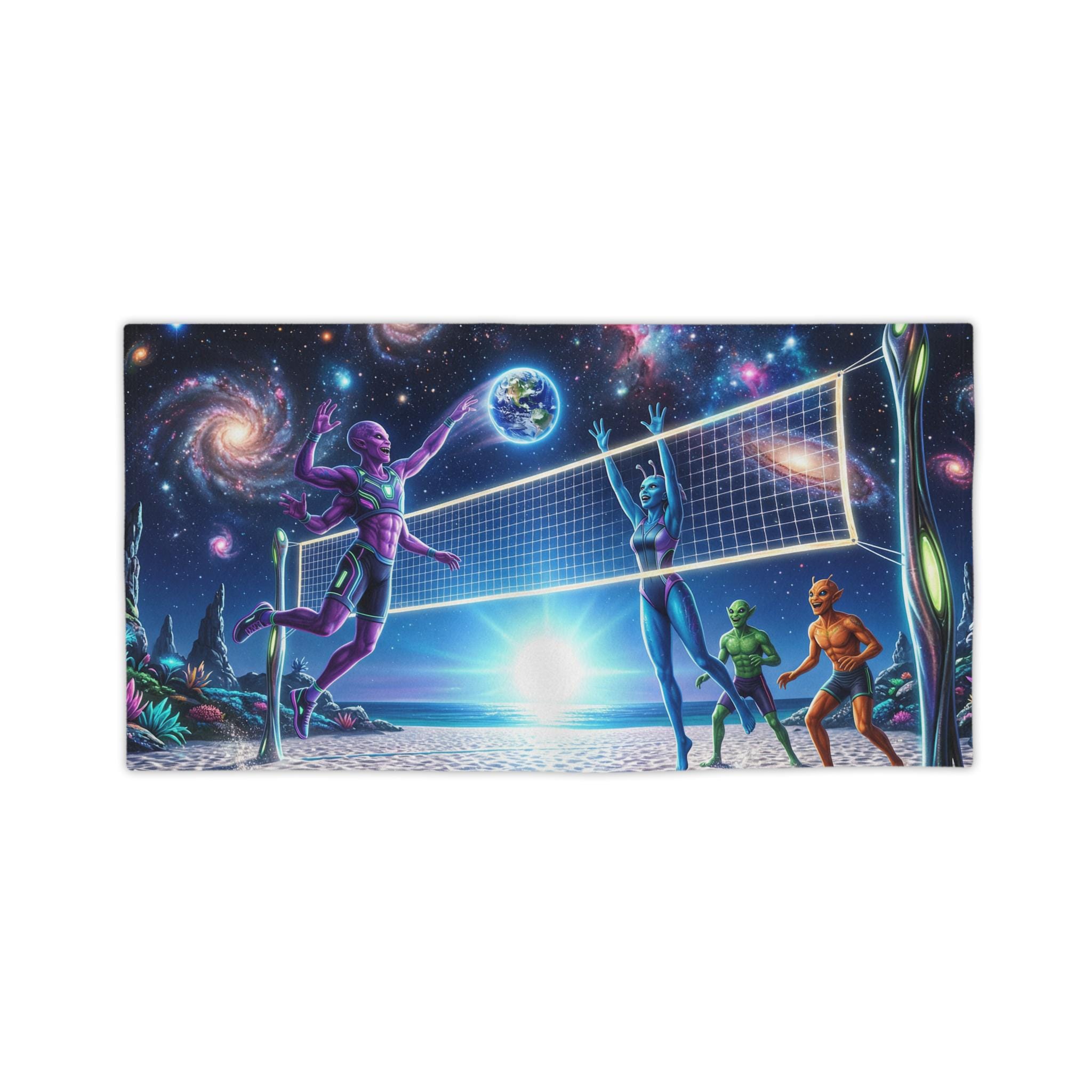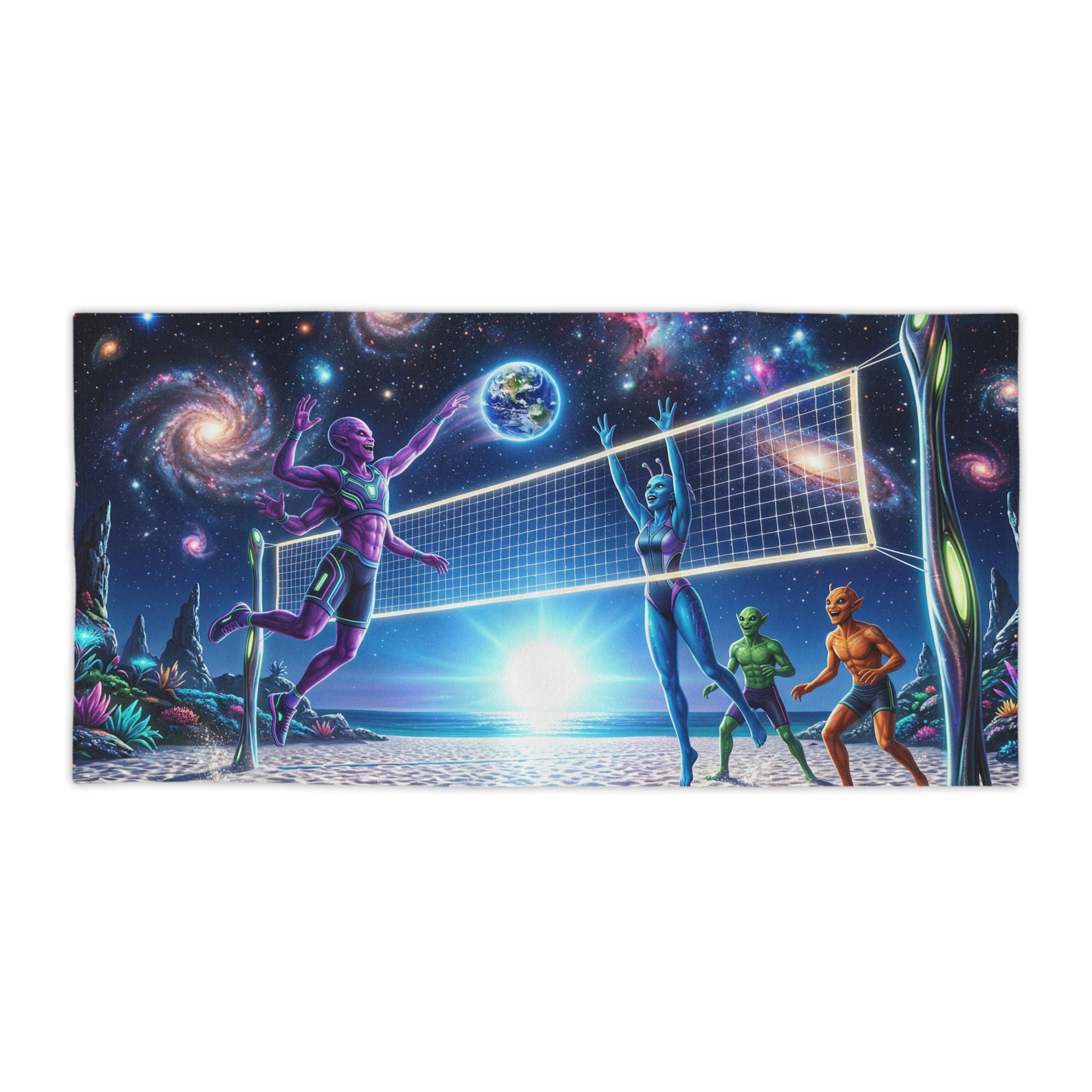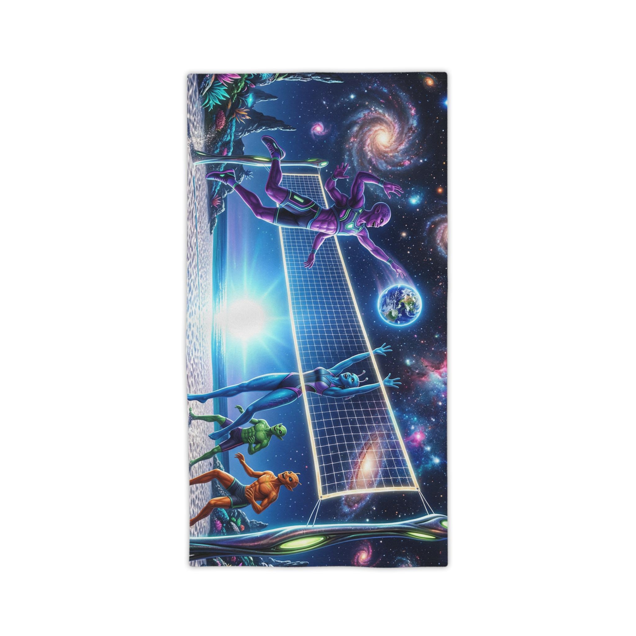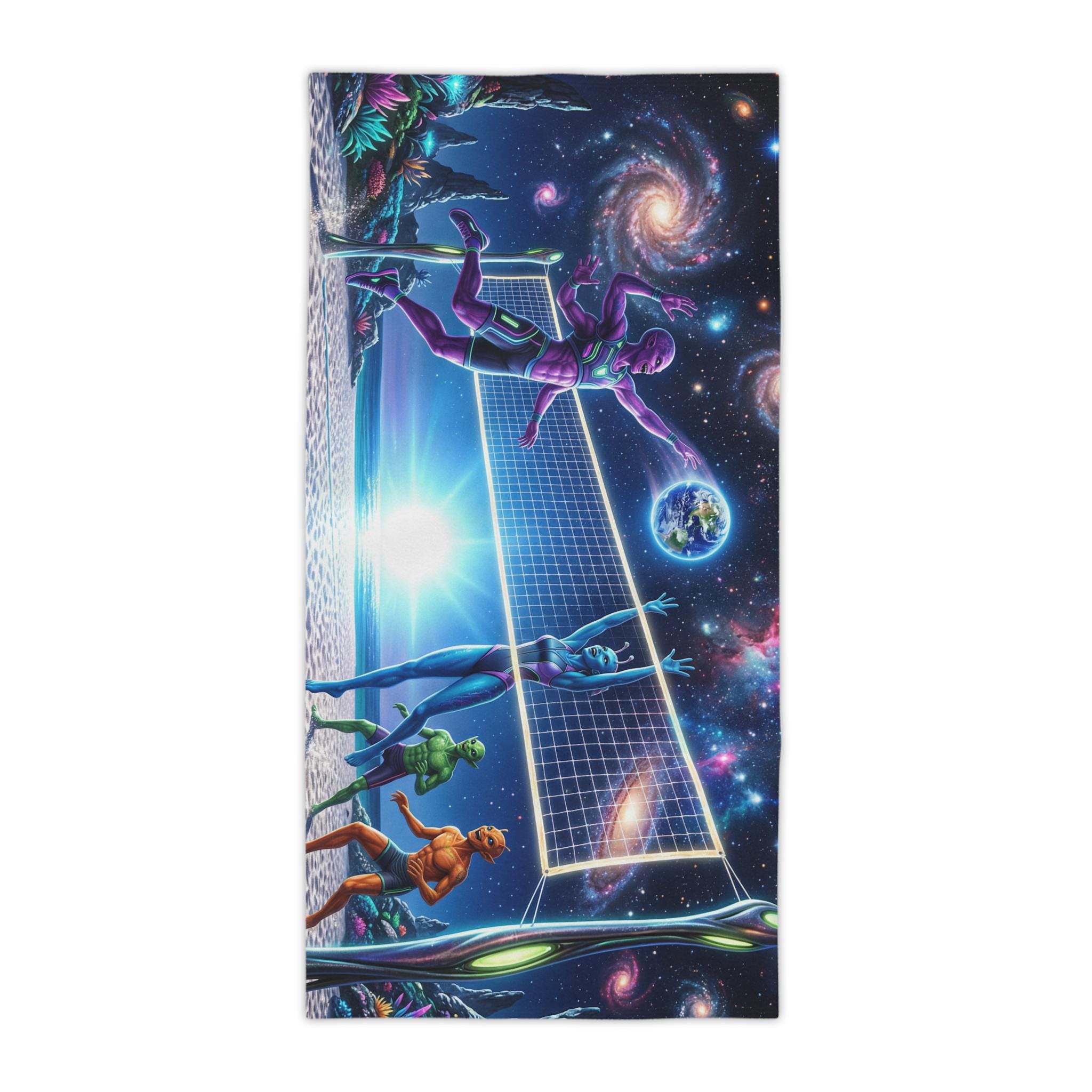 Lay this towel down and step into a neon-drenched daydream. Bright, edge-to-edge print brings an otherworldly beach volleyball scene to life: colorful players spike beneath a sunrise while galaxies swirl overhead and a tiny Earth hangs like a glowing ball. The soft cotton back feels gentle on sun-warmed skin; the quick-dry polyester face keeps the colors intense and the towel light for travel. Roll it into your kit for surf sessions, late-night bonfires, or a spontaneous rooftop hang — it reads like a playful, nostalgic nod to retro sci-fi and summer nights under the stars.