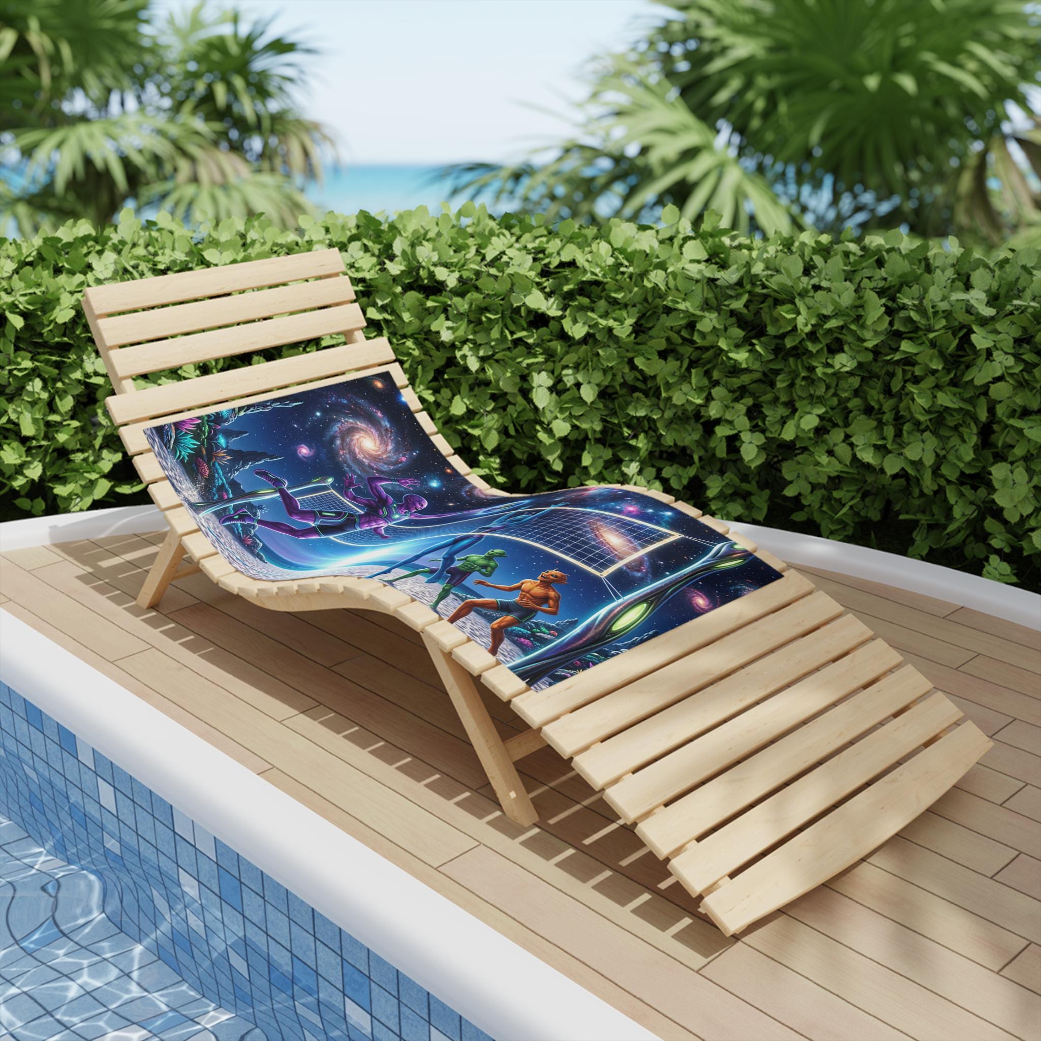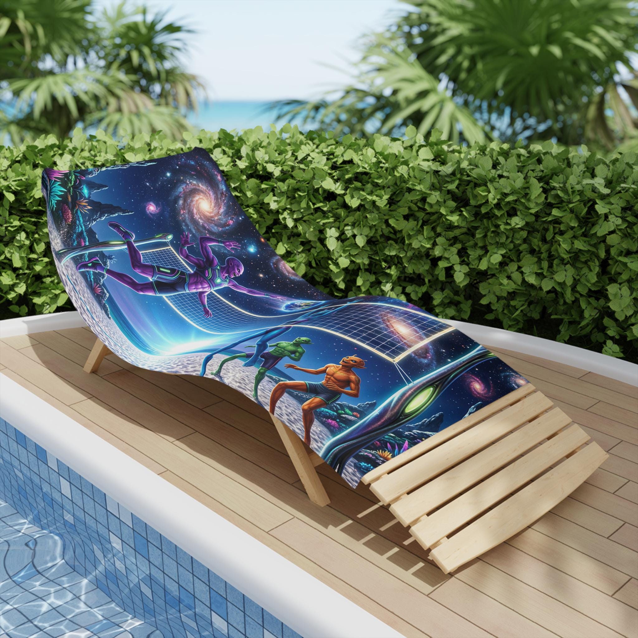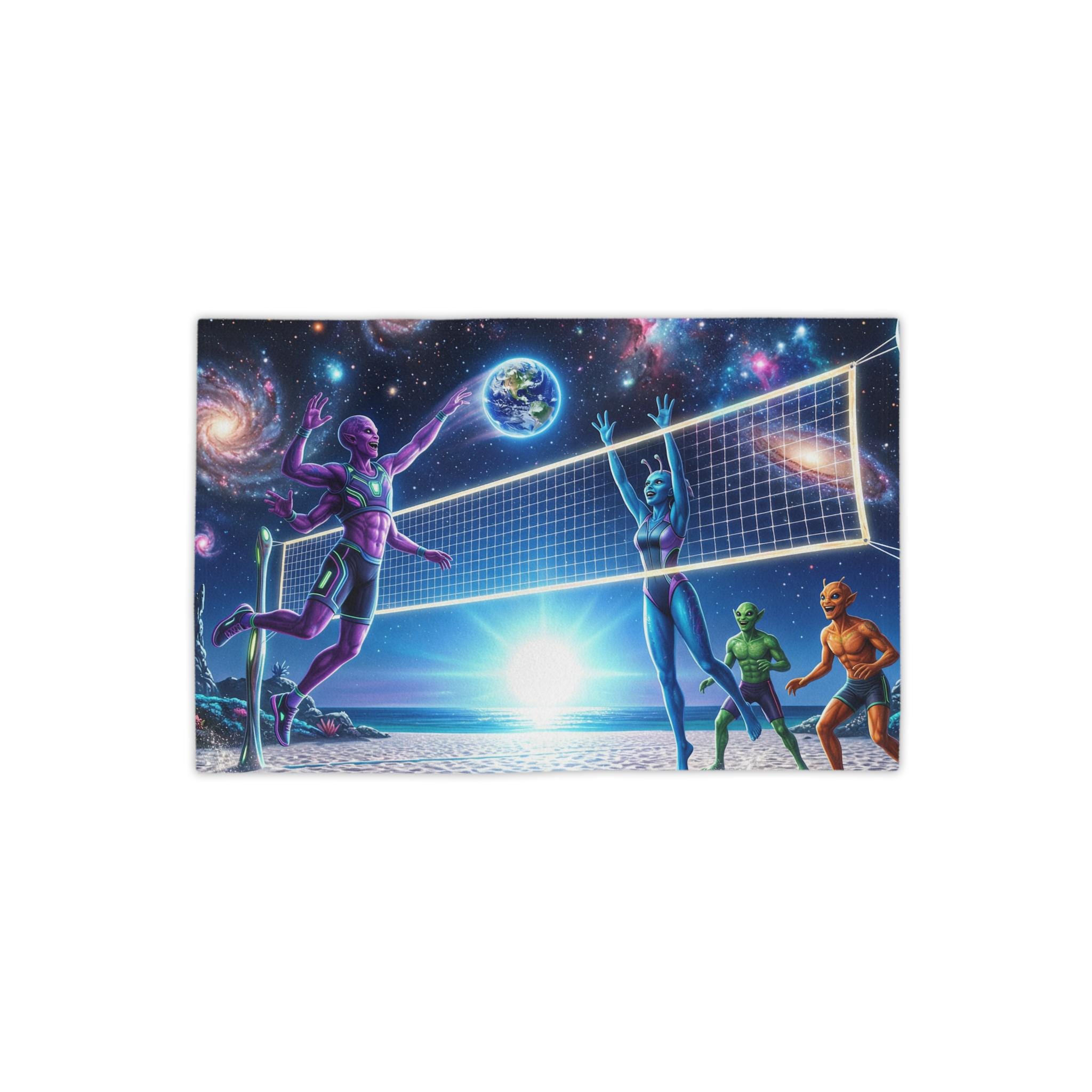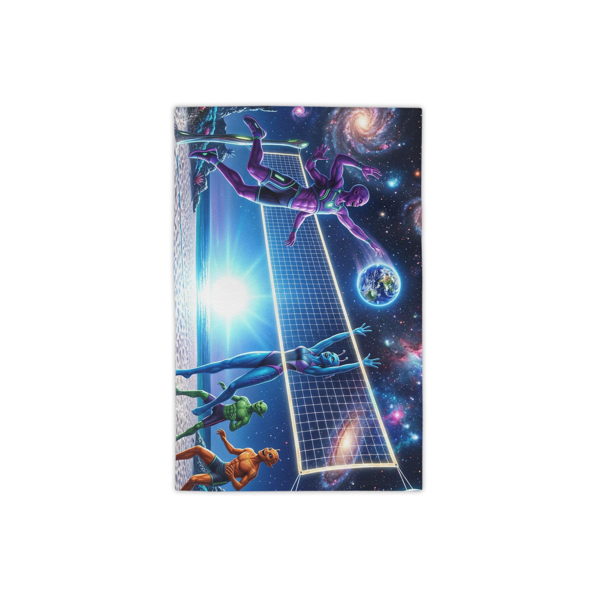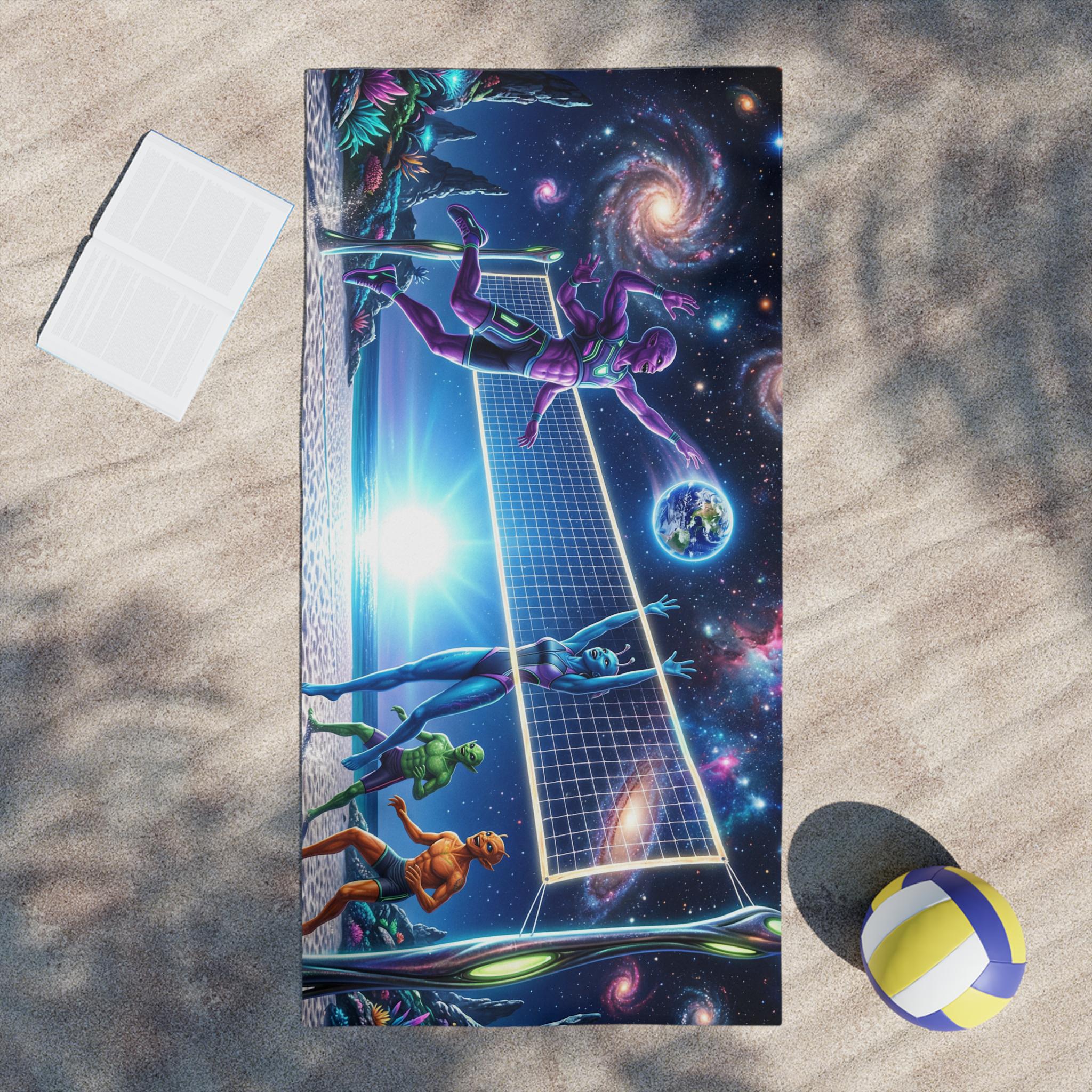 Lay this towel down and step into a neon-drenched daydream. Bright, edge-to-edge print brings an otherworldly beach volleyball scene to life: colorful players spike beneath a sunrise while galaxies swirl overhead and a tiny Earth hangs like a glowing ball. The soft cotton back feels gentle on sun-warmed skin; the quick-dry polyester face keeps the colors intense and the towel light for travel. Roll it into your kit for surf sessions, late-night bonfires, or a spontaneous rooftop hang — it reads like a playful, nostalgic nod to retro sci-fi and summer nights under the stars.
