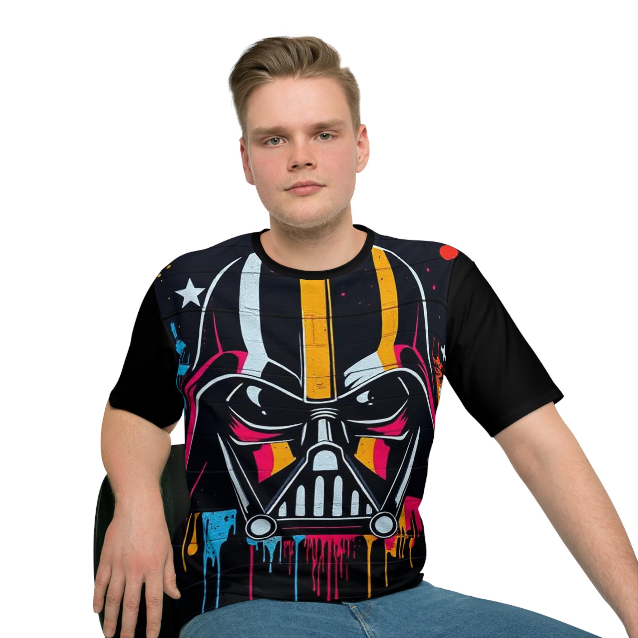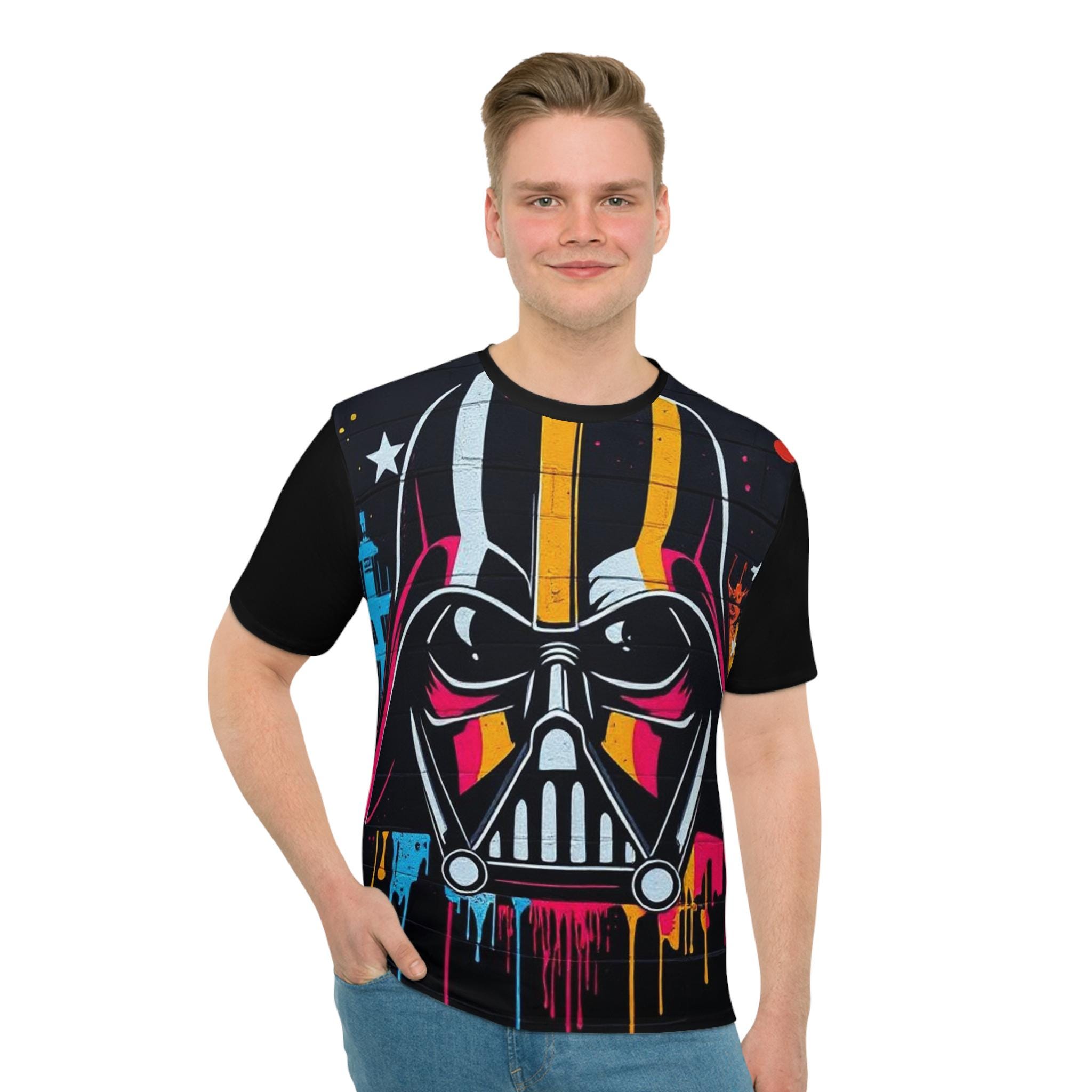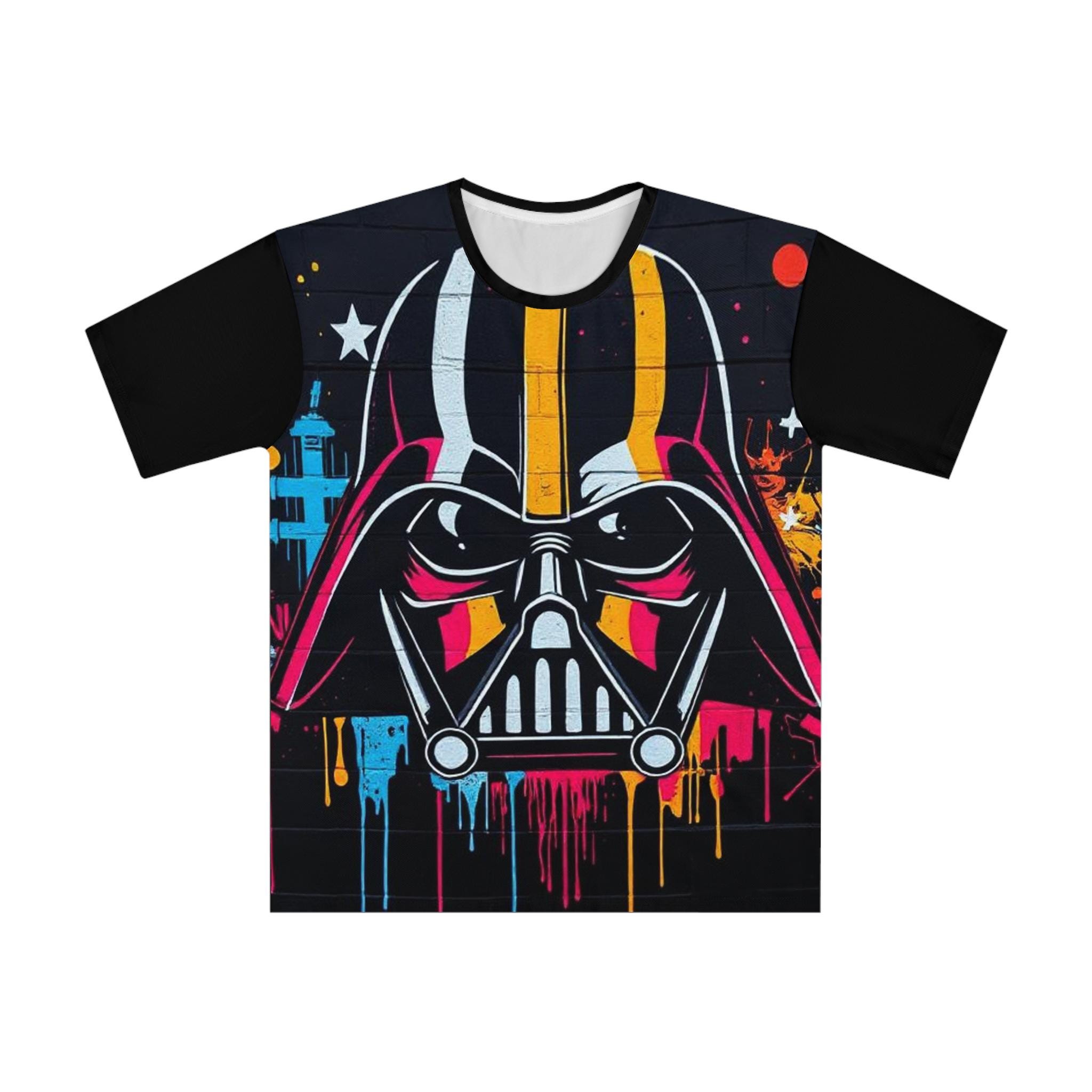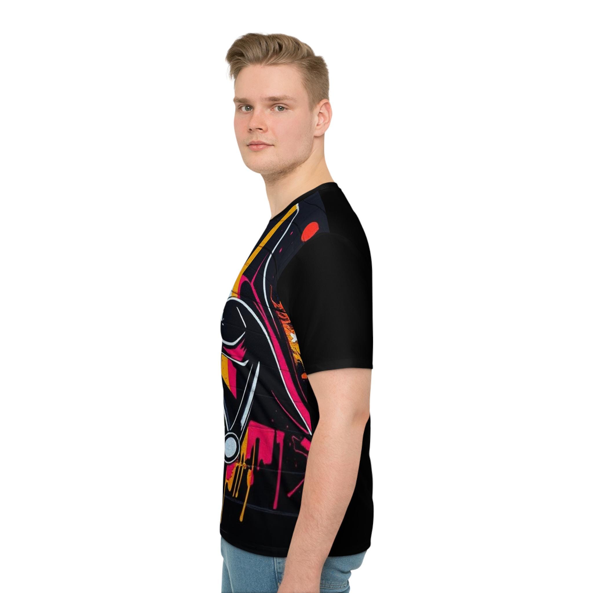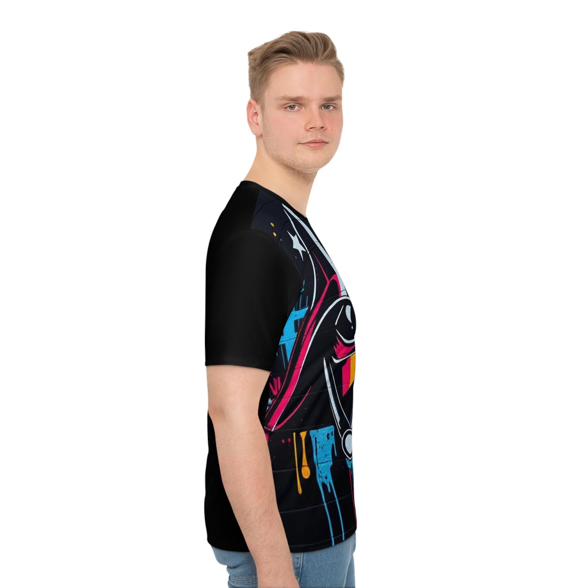 A bold, all-over print tee that brings street-art energy to a casual wardrobe. The front bursts with a dramatic, stylized helmet motif in neon yellow, pink and cyan against a dark, textured background — paint drips and star accents add gritty, urban flair. Lightweight and slightly stretchy, the shirt moves with you and sits comfortably in a regular cut so the artwork reads clearly whether you’re out with friends or layering under a jacket. Wear it when you want a statement piece that channels late-night city vibes and graphic rebellion.