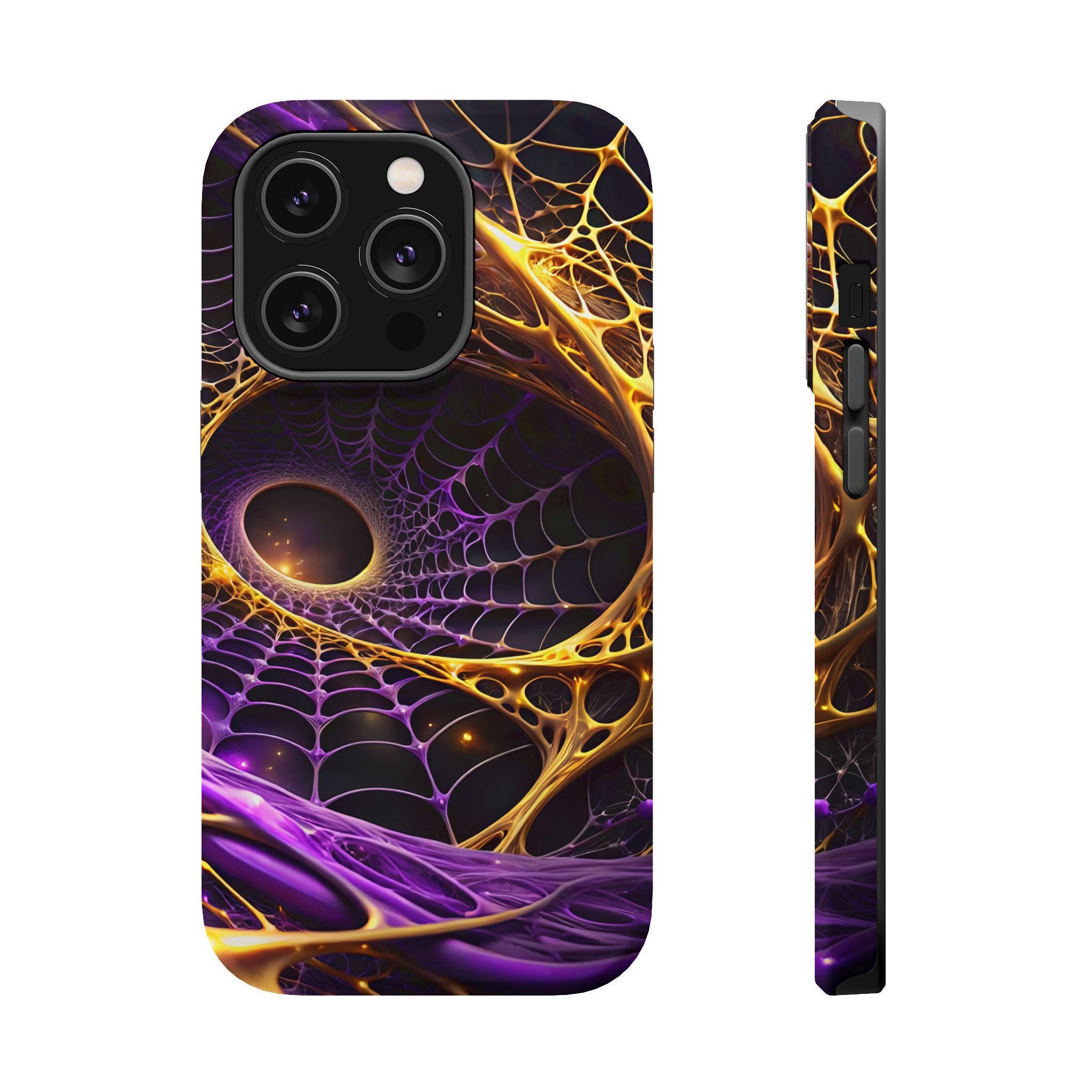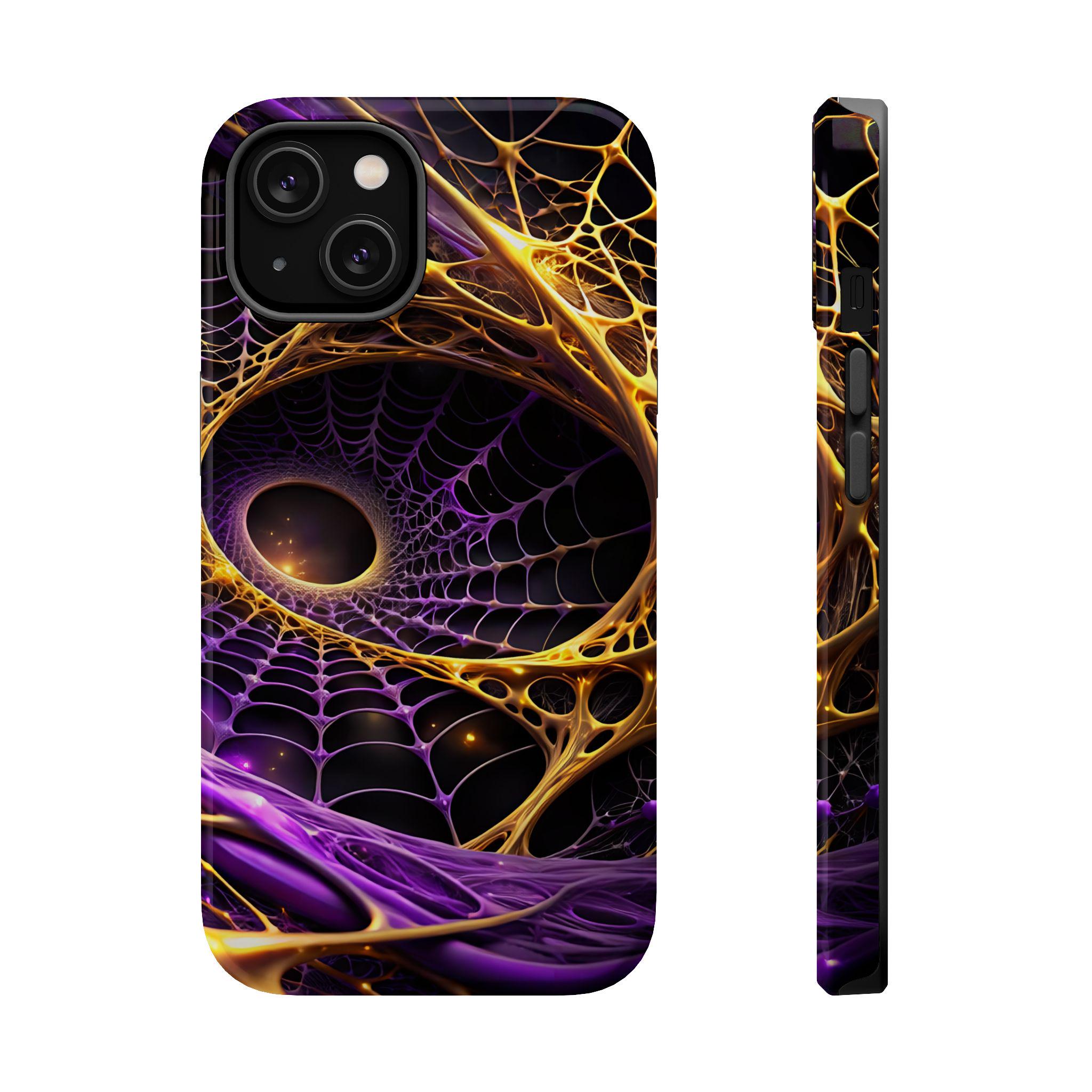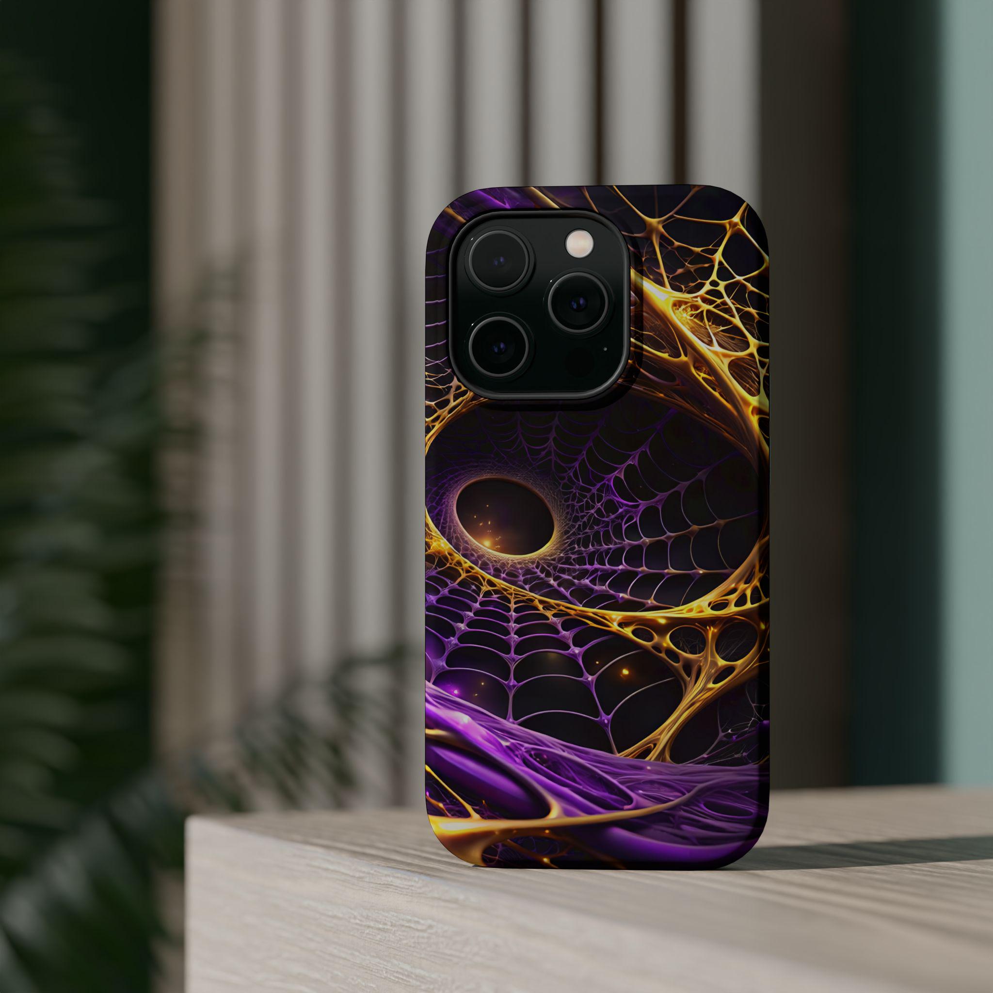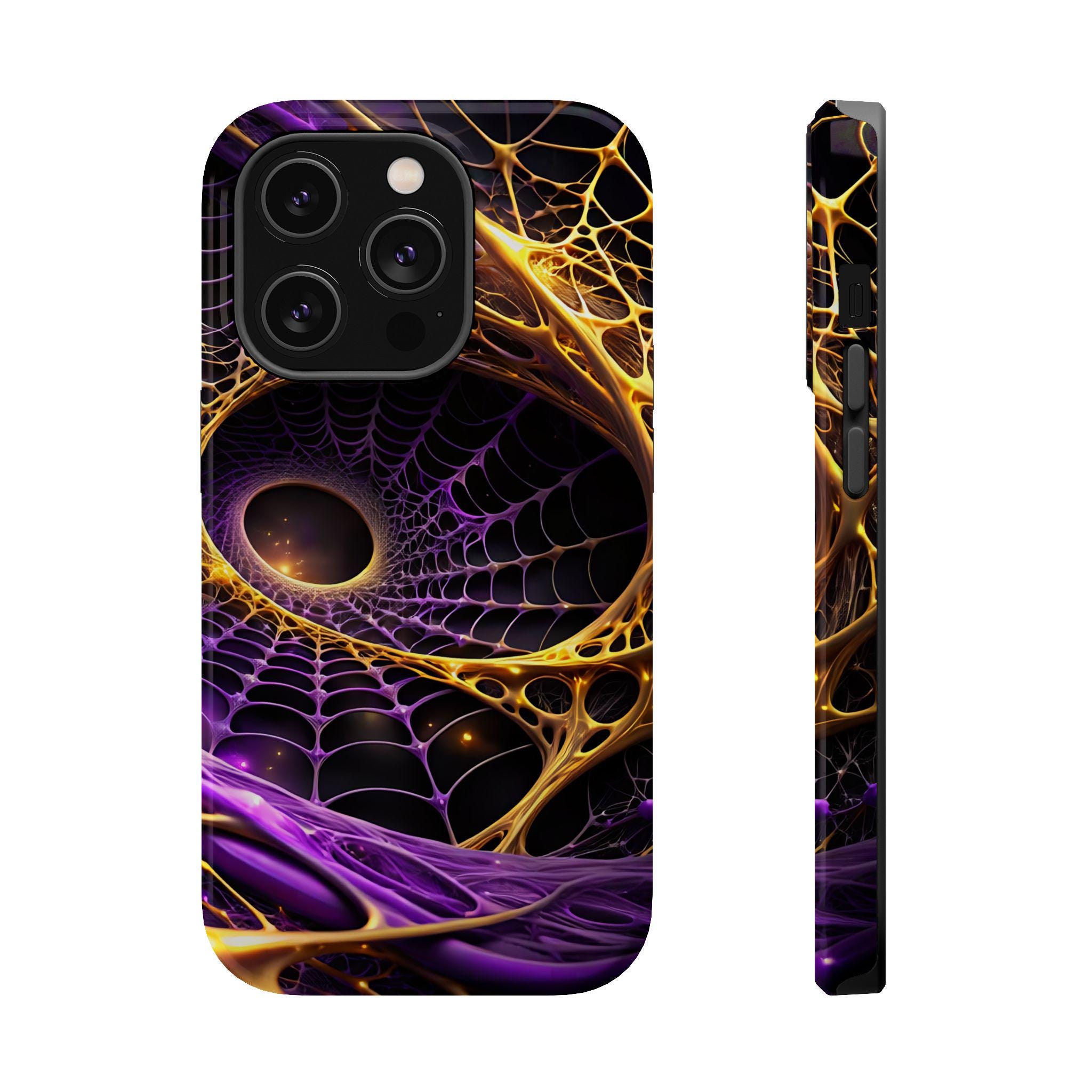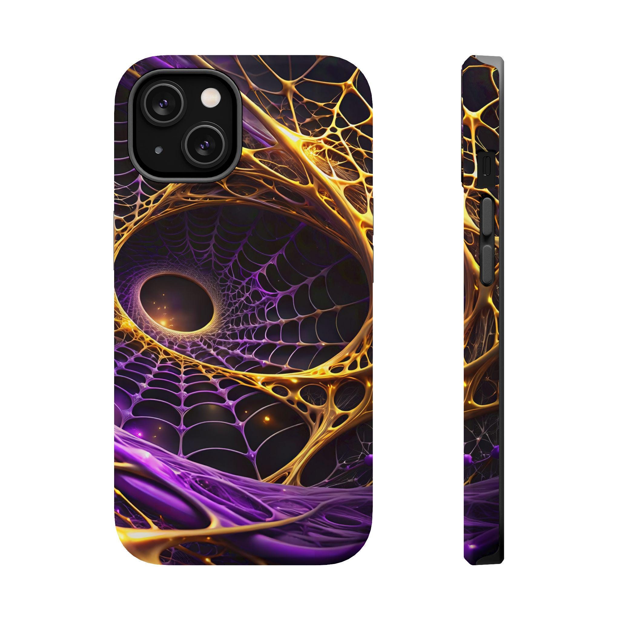 An impact-resistant phone case that brings bold, cosmic energy to your daily carry. The full-wrap, photo-realistic print blends deep purples with molten gold webbing for a dynamic, otherworldly look that stands out on the pocket or desk. Built with a rigid polycarbonate shell and a cushioned TPU inner liner, it absorbs shocks while keeping edges and camera openings protected. Interior magnets enhance MagSafe® compatibility so the case works smoothly with magnetic accessories and chargers. Choose glossy for a high-shine, vibrant finish or matte for a refined, anti-glare surface—both keep the design crisp and vivid at 300+ DPI.