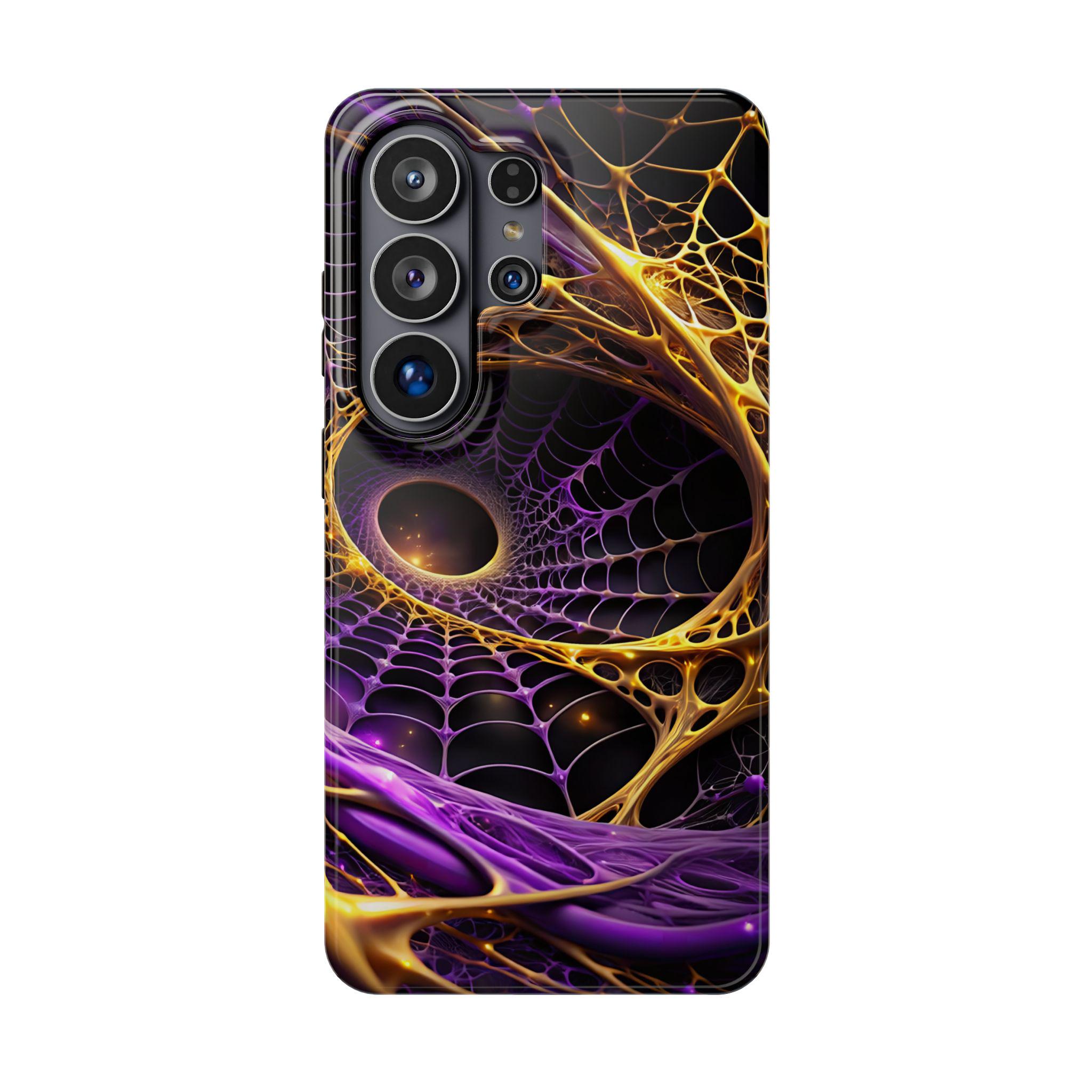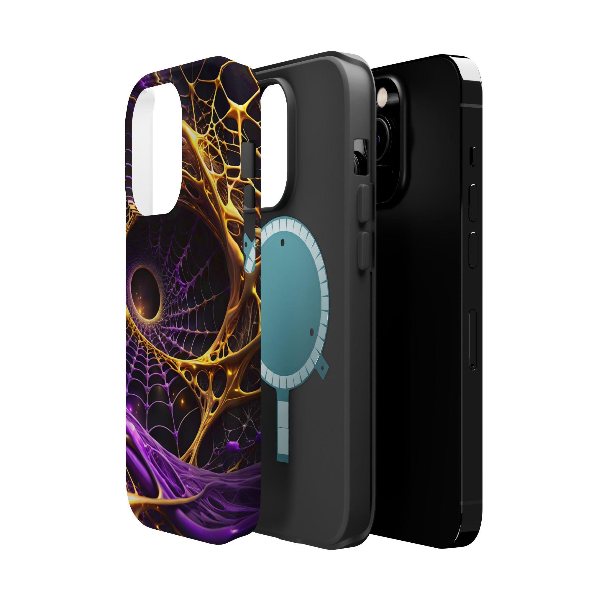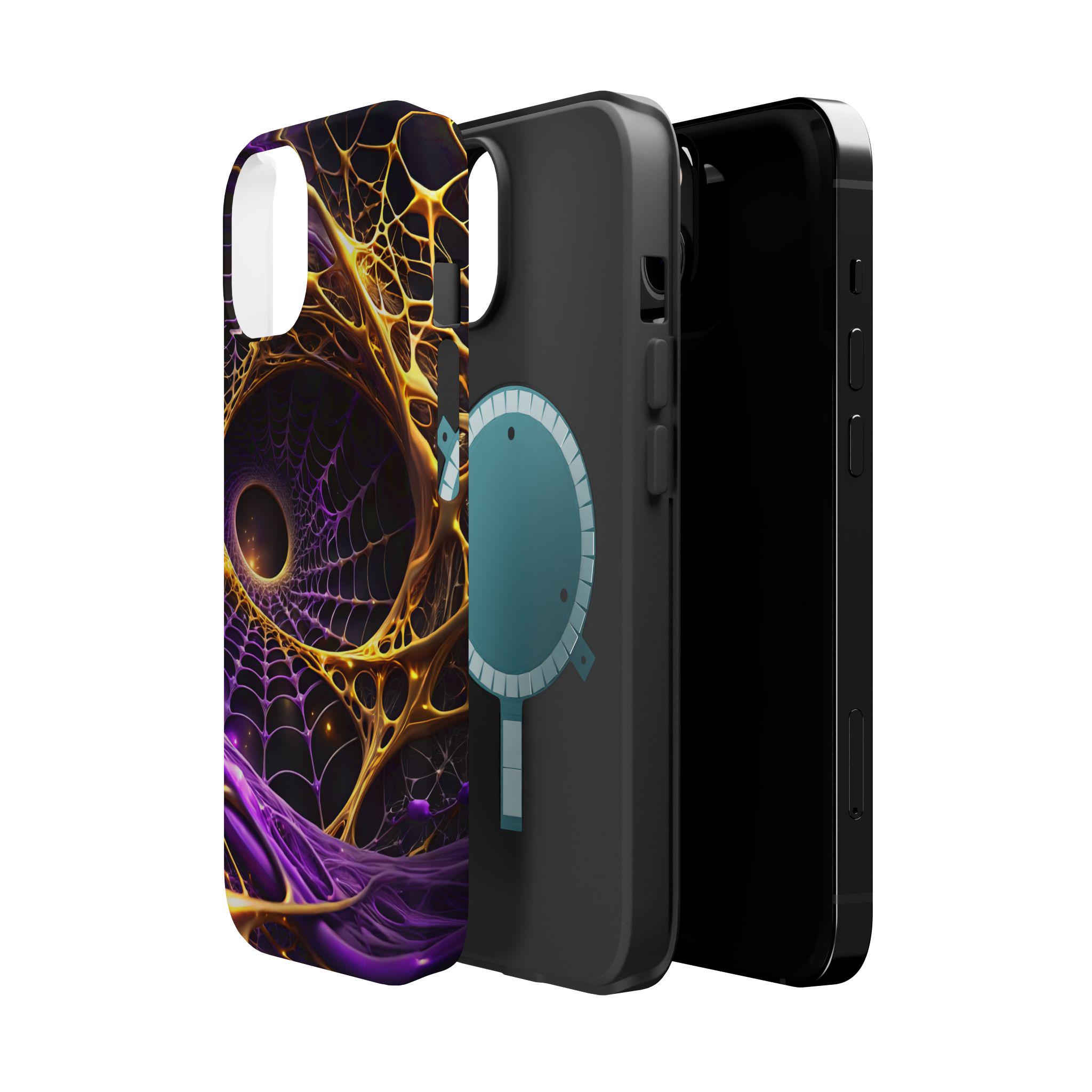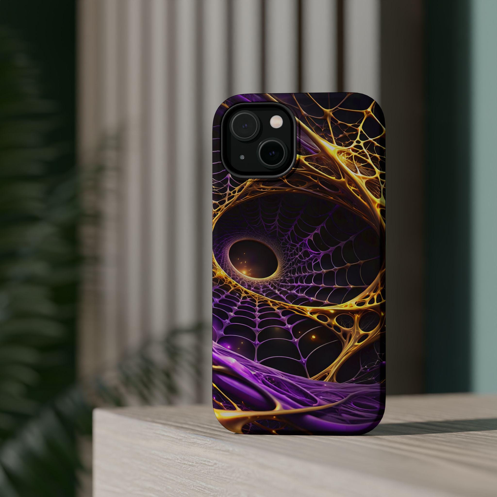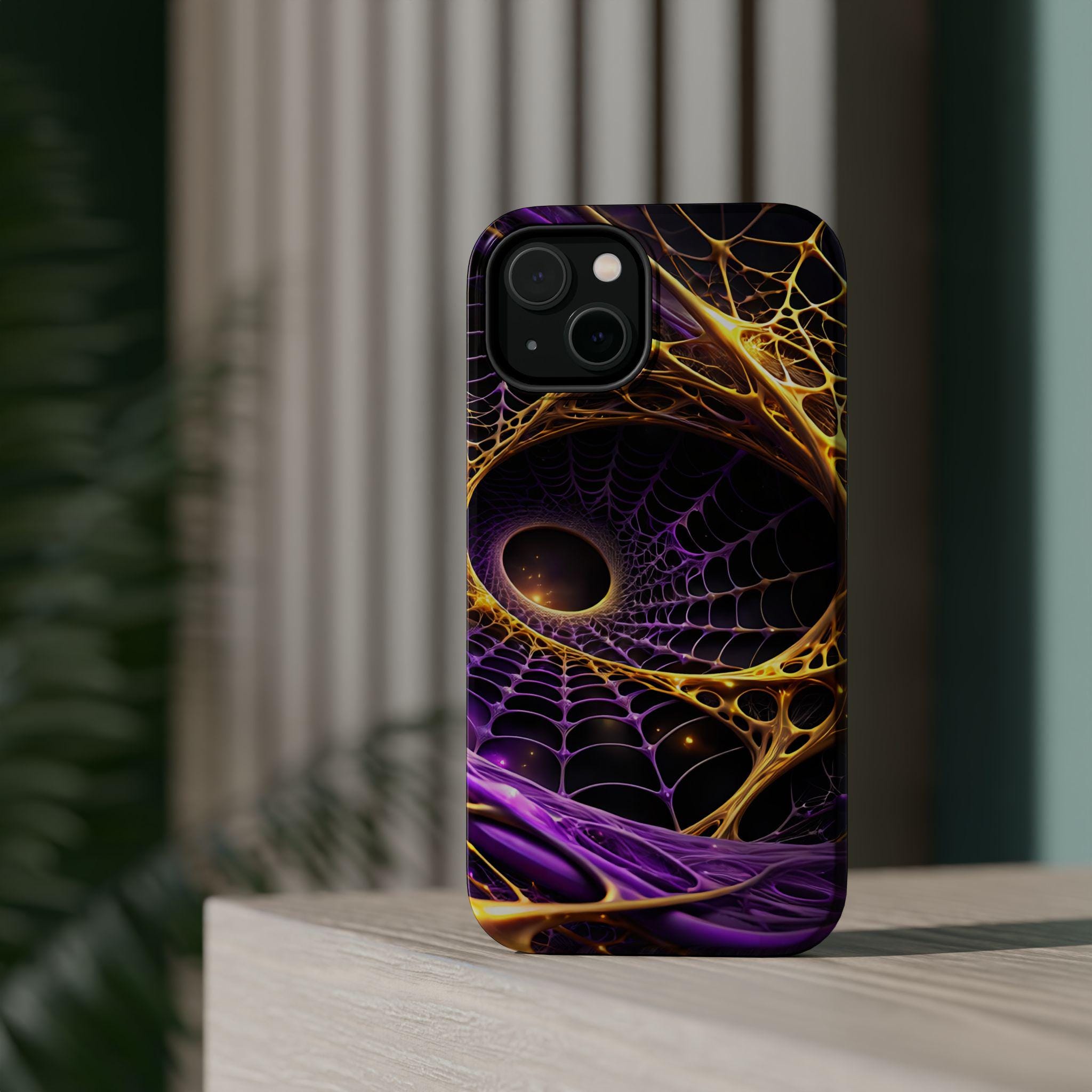 An impact-resistant phone case that brings bold, cosmic energy to your daily carry. The full-wrap, photo-realistic print blends deep purples with molten gold webbing for a dynamic, otherworldly look that stands out on the pocket or desk. Built with a rigid polycarbonate shell and a cushioned TPU inner liner, it absorbs shocks while keeping edges and camera openings protected. Interior magnets enhance MagSafe® compatibility so the case works smoothly with magnetic accessories and chargers. Choose glossy for a high-shine, vibrant finish or matte for a refined, anti-glare surface—both keep the design crisp and vivid at 300+ DPI.