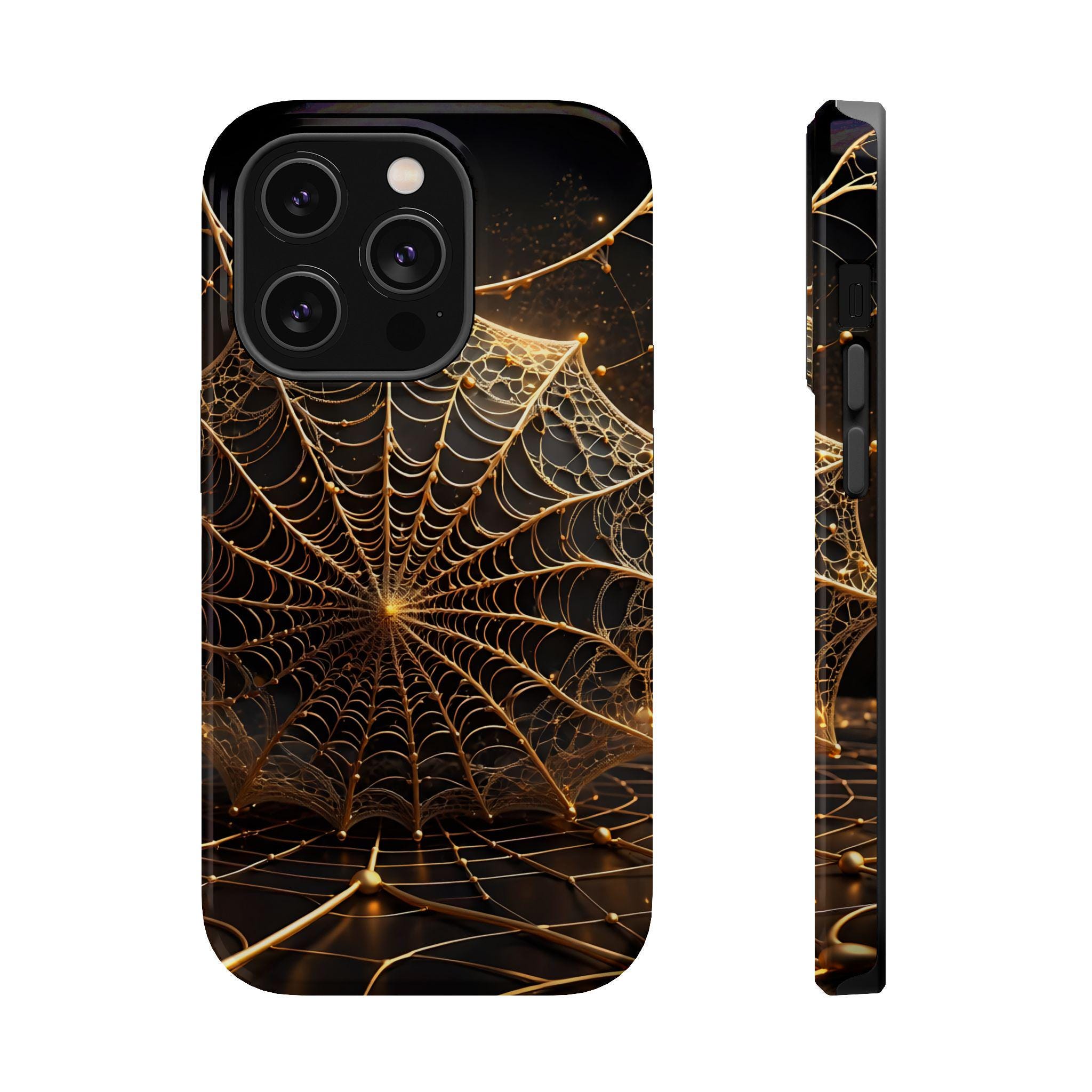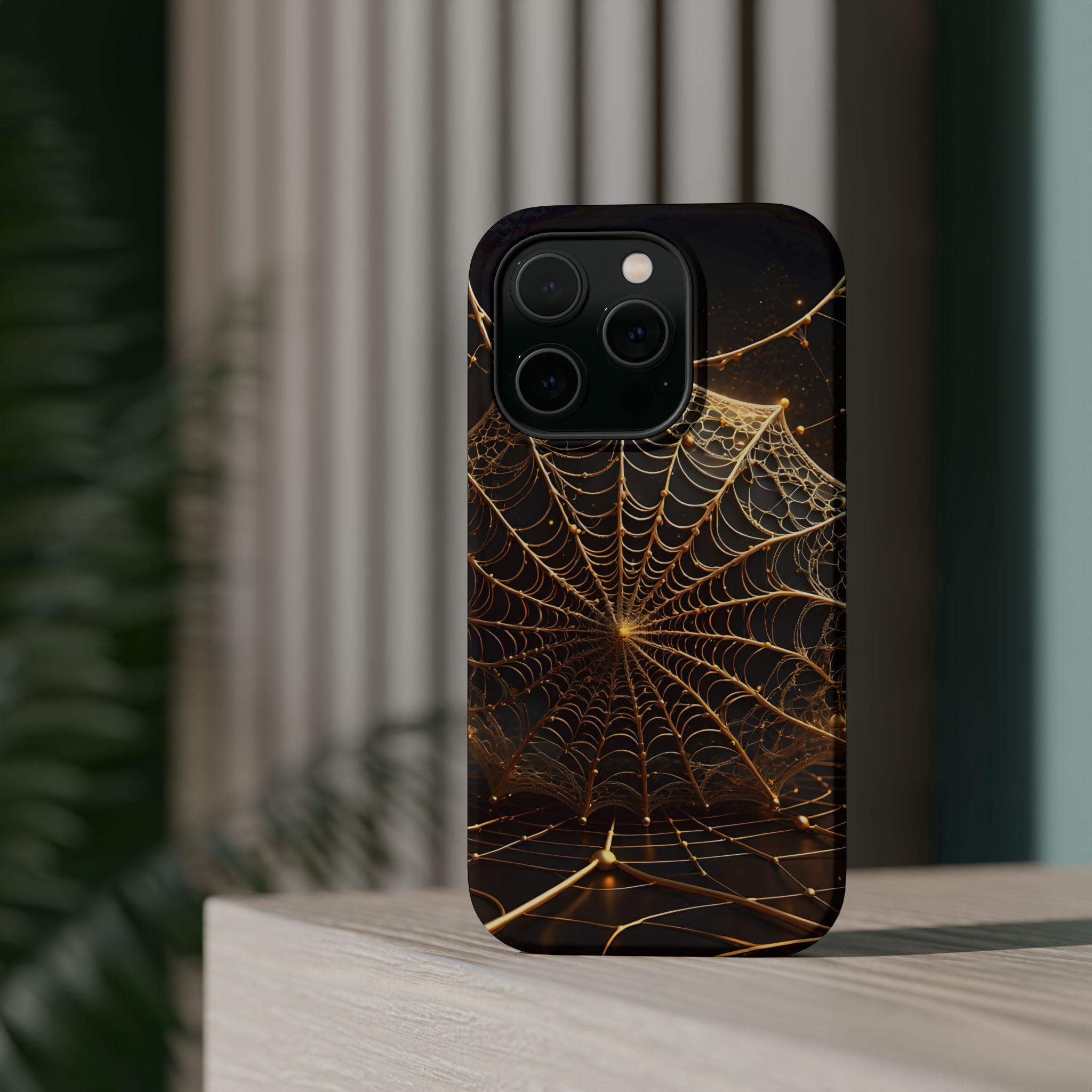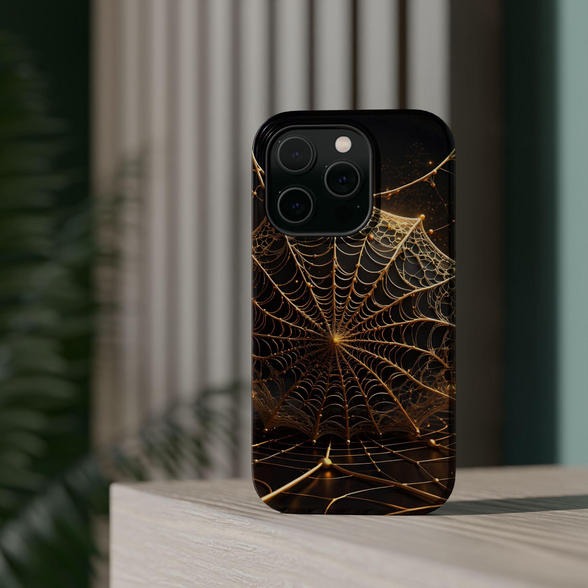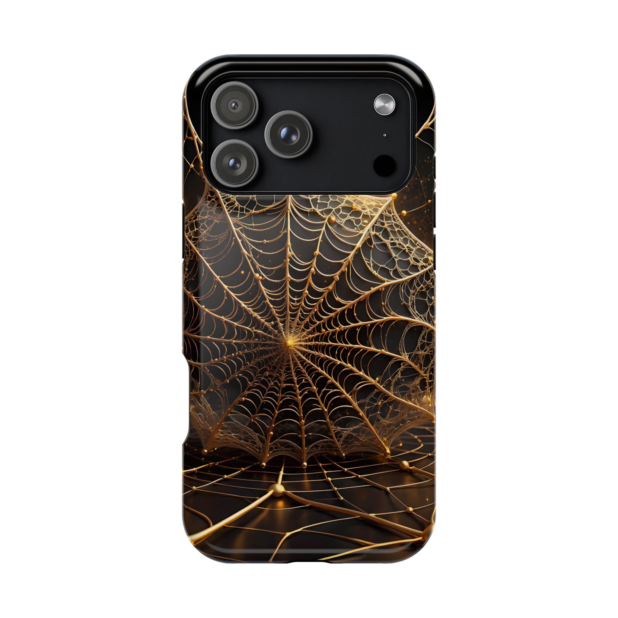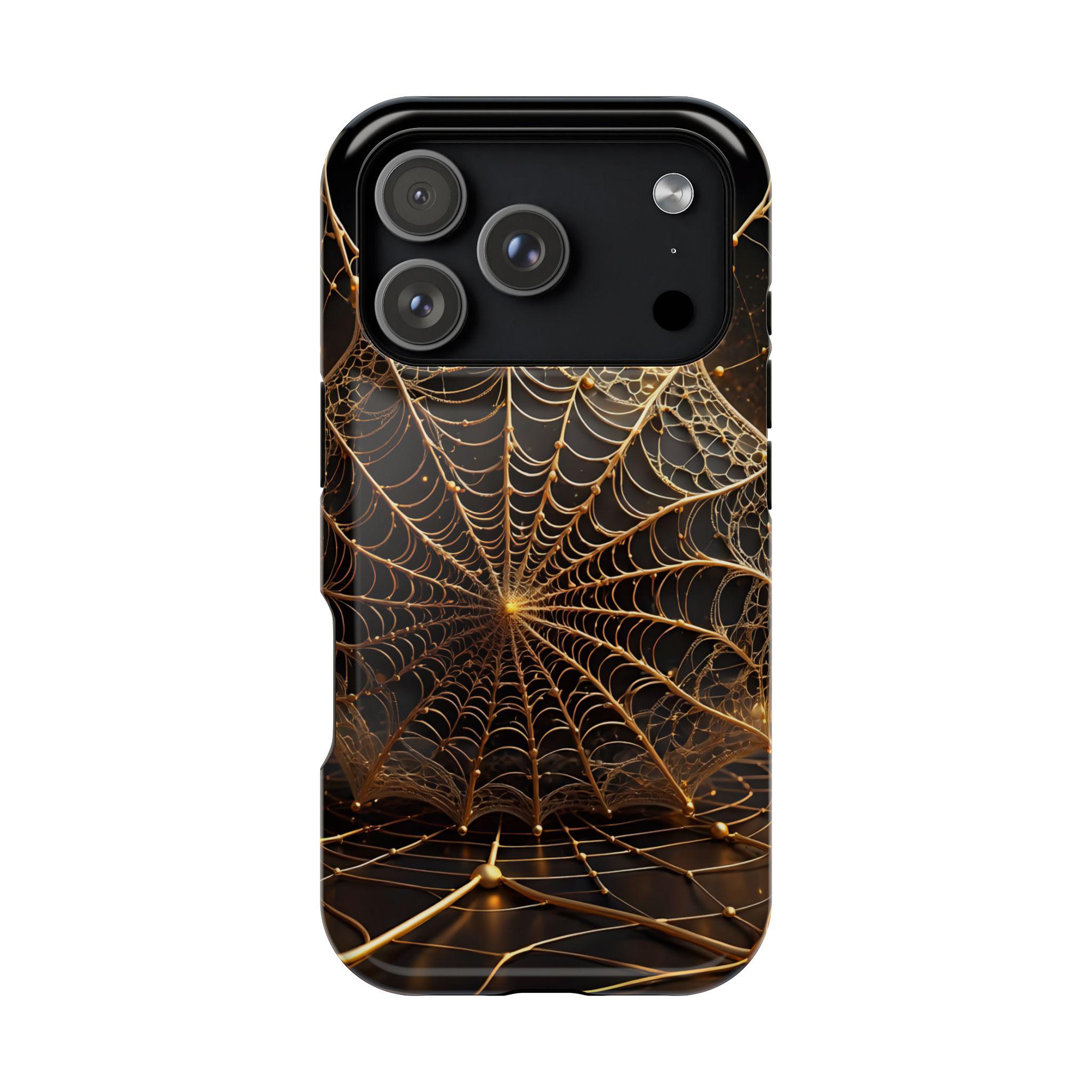 This magnetic, impact-resistant phone case blends protective performance with a moody, intricate design. The deep black background and shimmering gold web pattern catch light like a city at night, giving the case an artful, slightly mysterious feel. Built with a rigid polycarbonate shell and a cushioned TPU liner, it absorbs shocks and shields edges without adding bulk. The embedded magnet ring keeps MagSafe® accessories aligned for easier charging and attachments. Choose glossy for a reflective, jewel-like finish or matte for a satin, low-glare look. Lightweight and durable, this case slips into daily life — from late-night walks to crowded commutes — while reflecting a taste for craftsmanship and subtle drama.