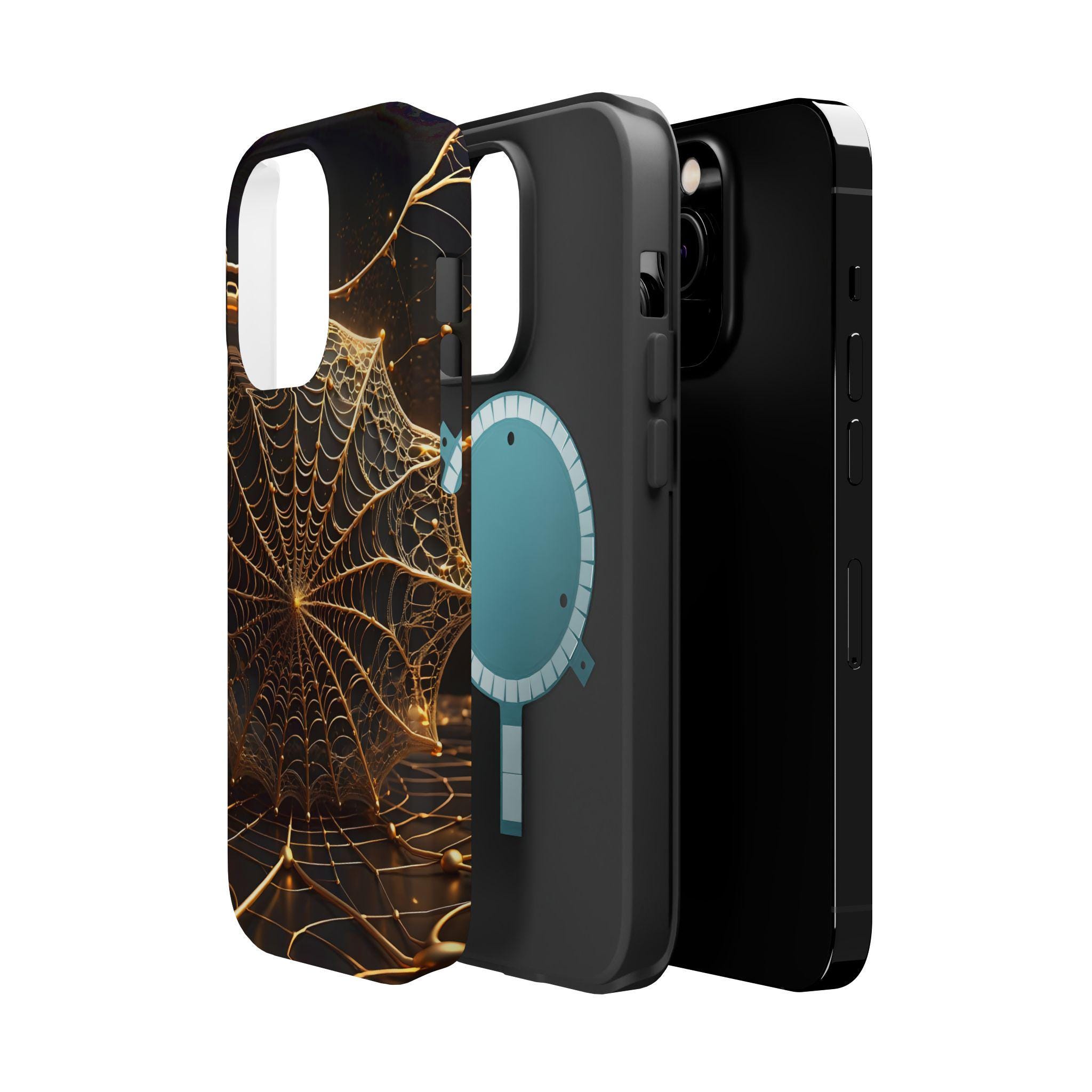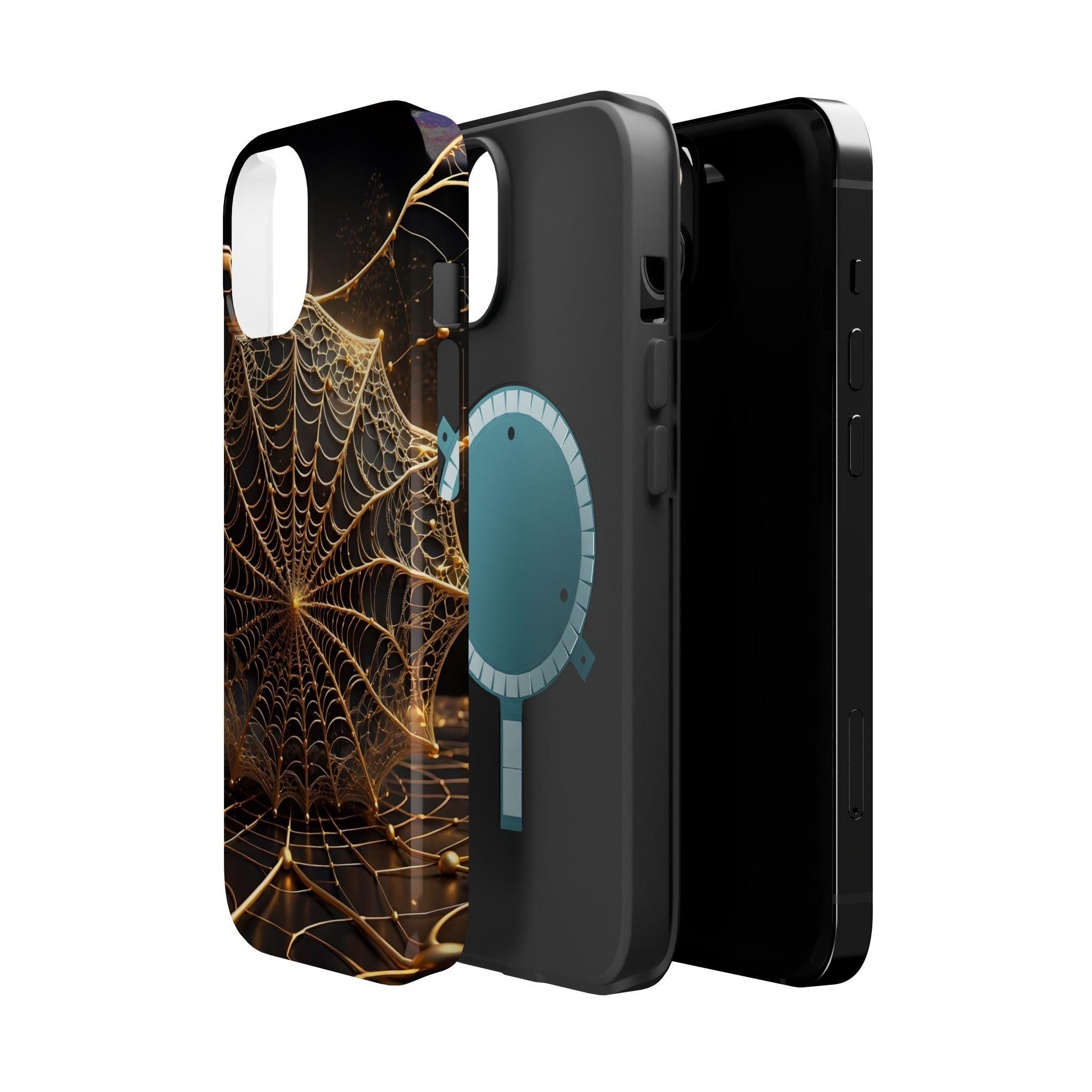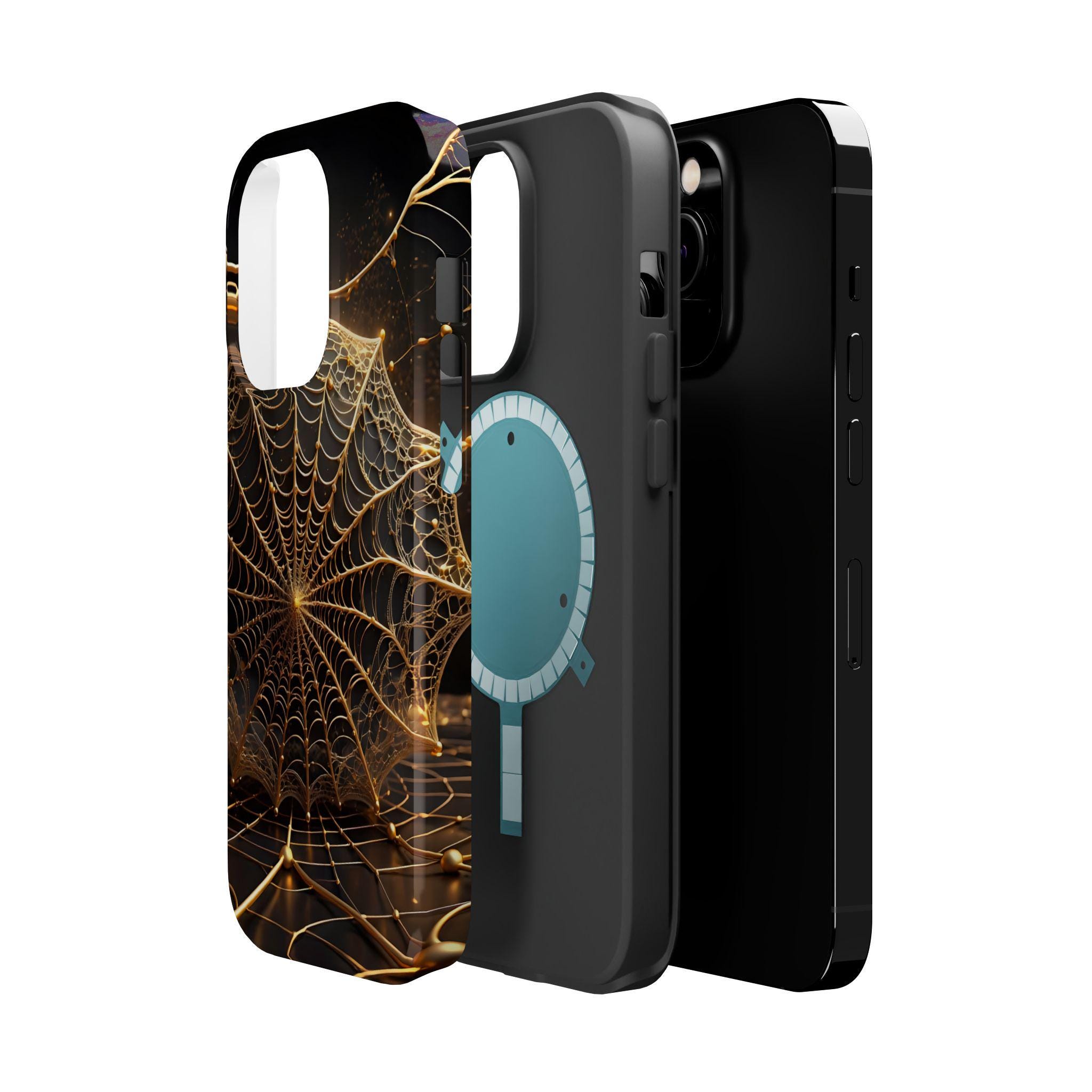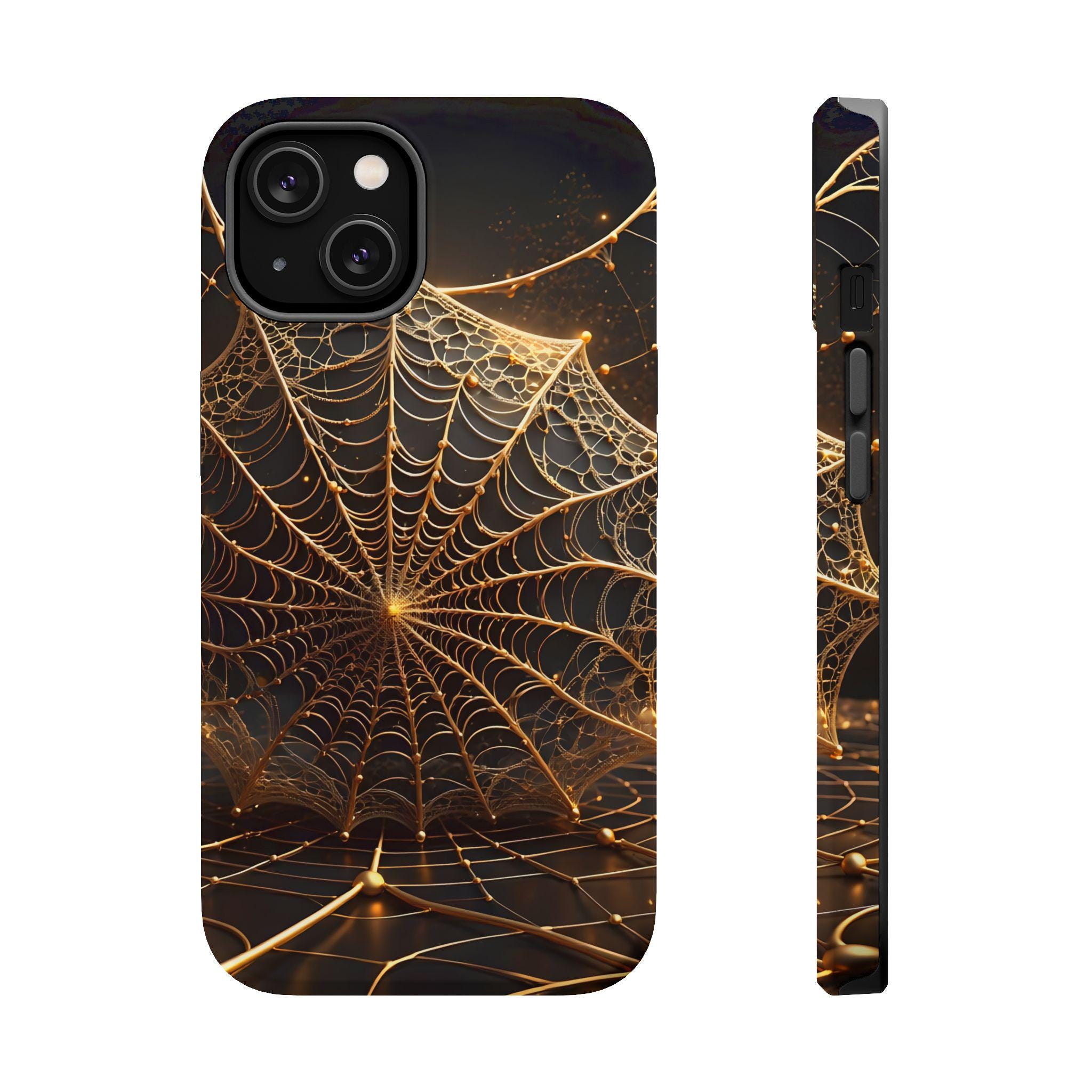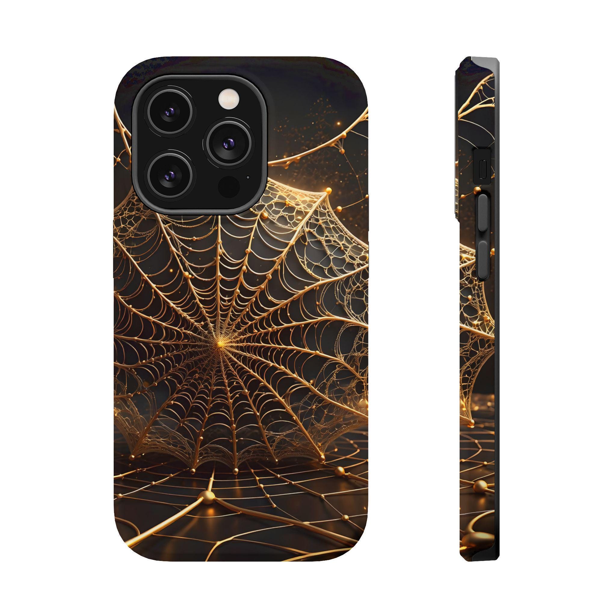 This magnetic, impact-resistant phone case blends protective performance with a moody, intricate design. The deep black background and shimmering gold web pattern catch light like a city at night, giving the case an artful, slightly mysterious feel. Built with a rigid polycarbonate shell and a cushioned TPU liner, it absorbs shocks and shields edges without adding bulk. The embedded magnet ring keeps MagSafe® accessories aligned for easier charging and attachments. Choose glossy for a reflective, jewel-like finish or matte for a satin, low-glare look. Lightweight and durable, this case slips into daily life — from late-night walks to crowded commutes — while reflecting a taste for craftsmanship and subtle drama.