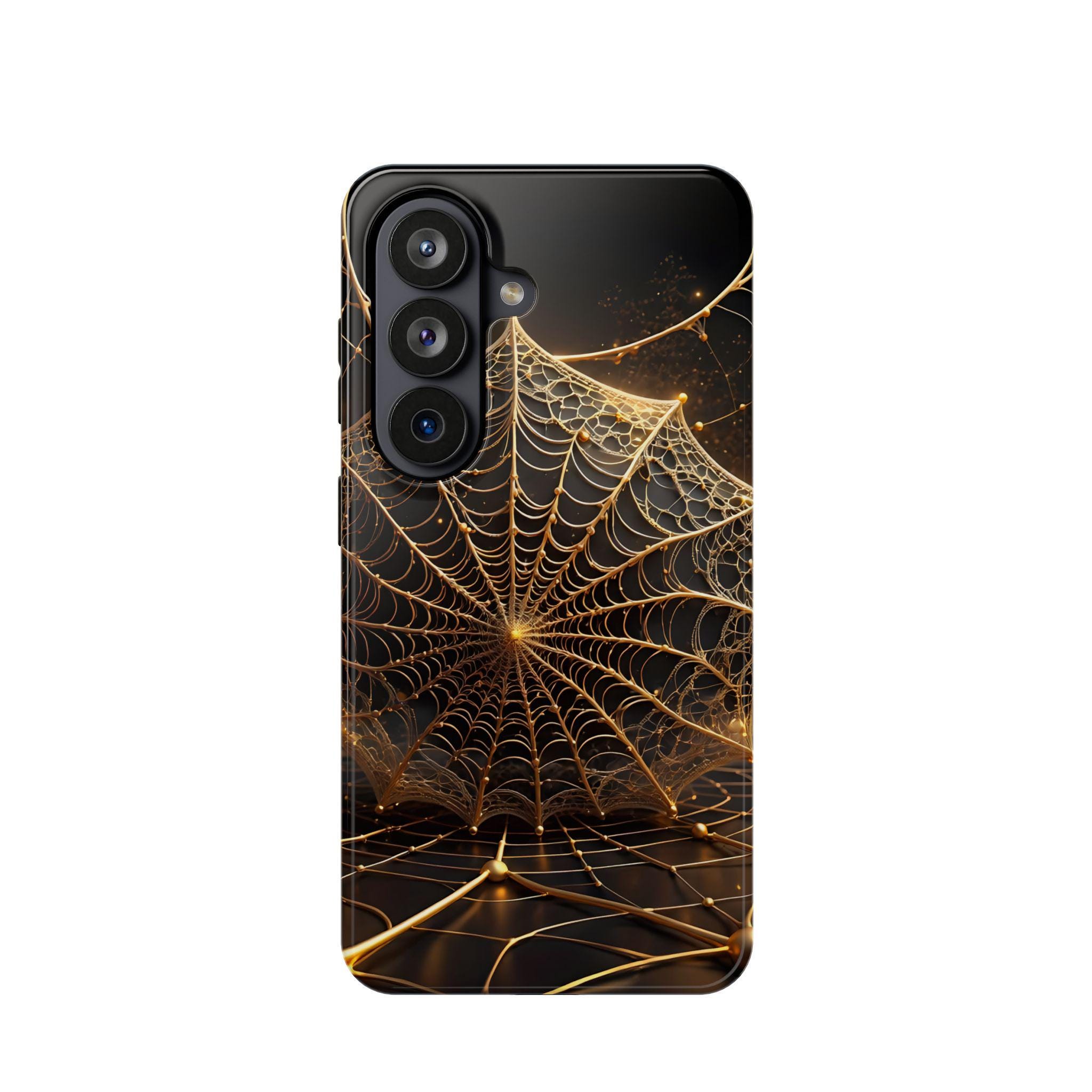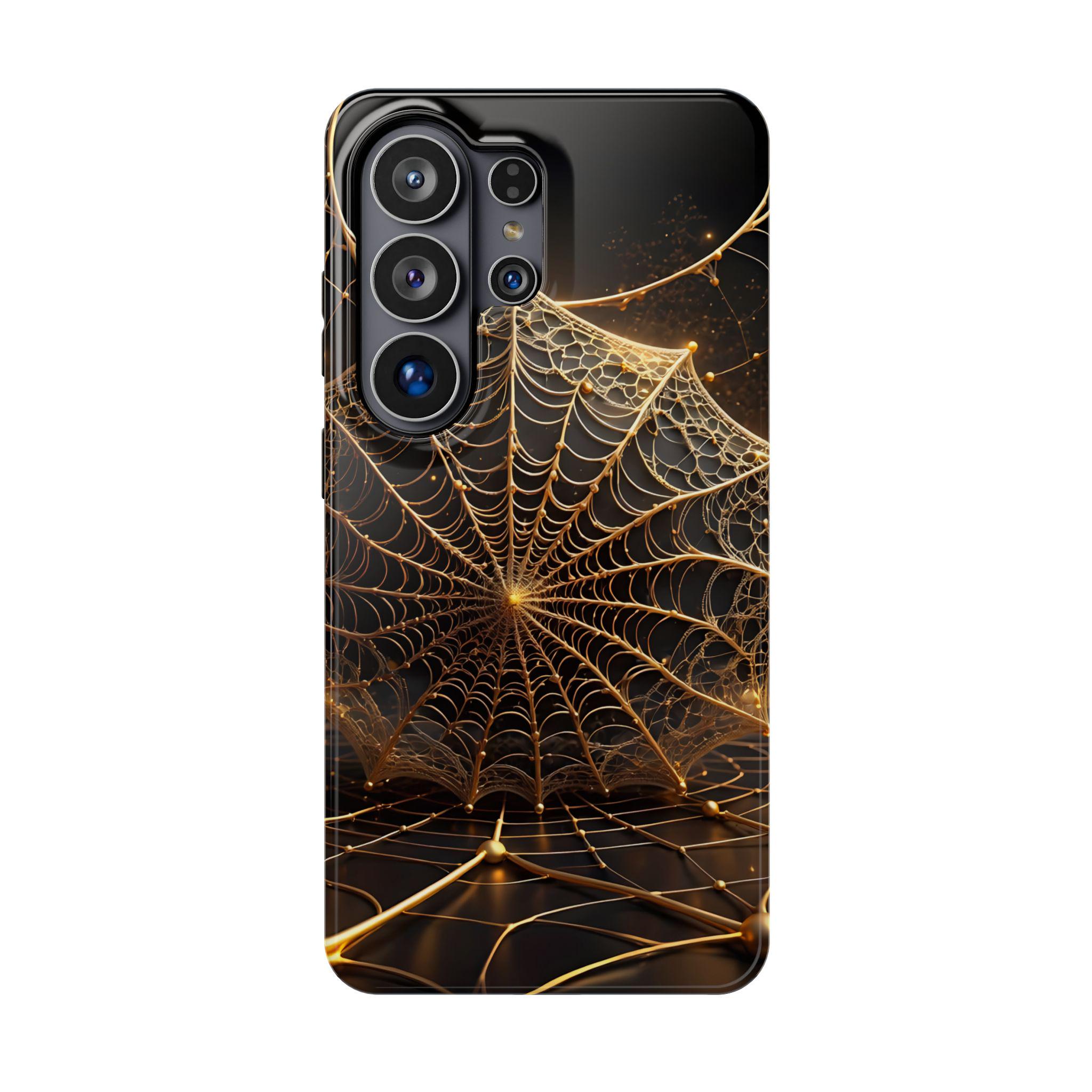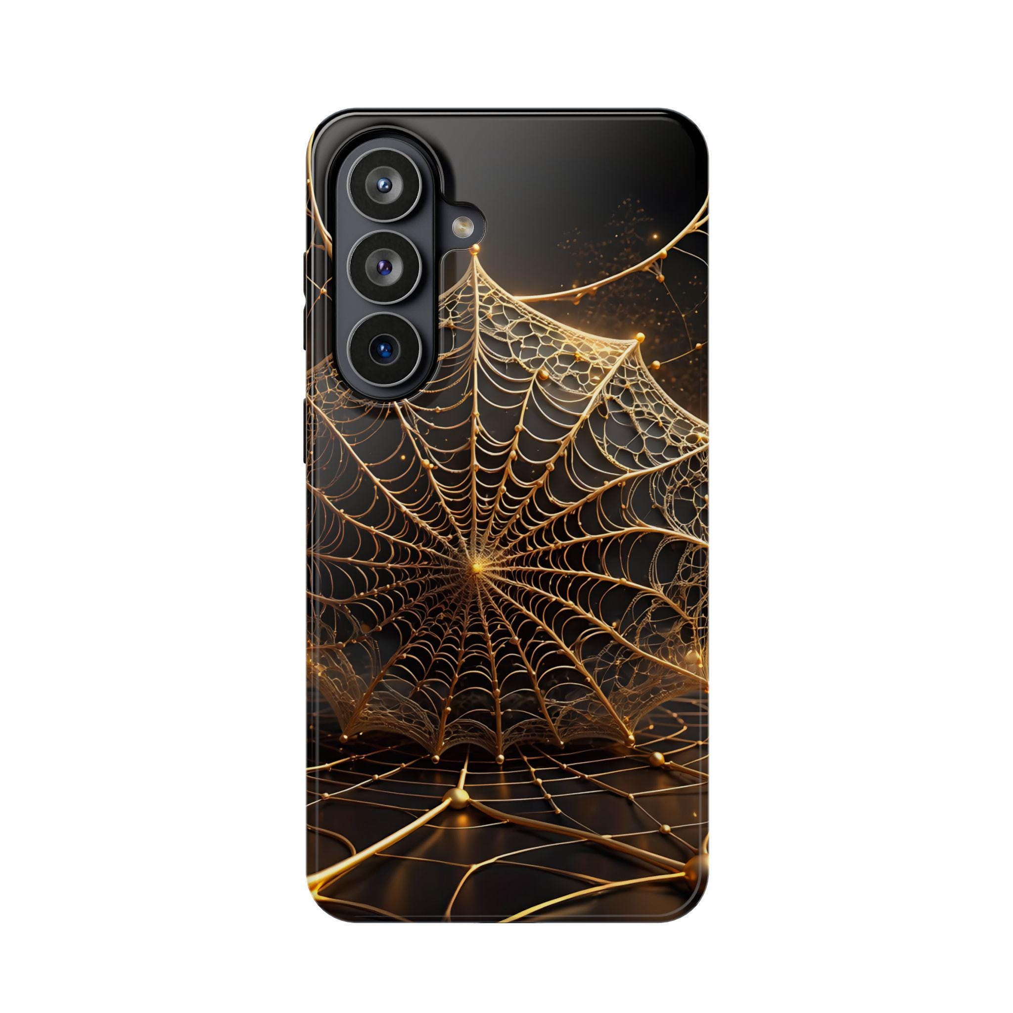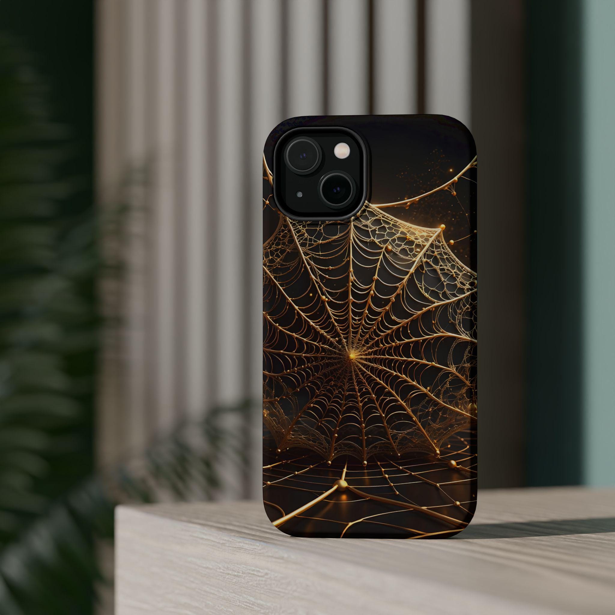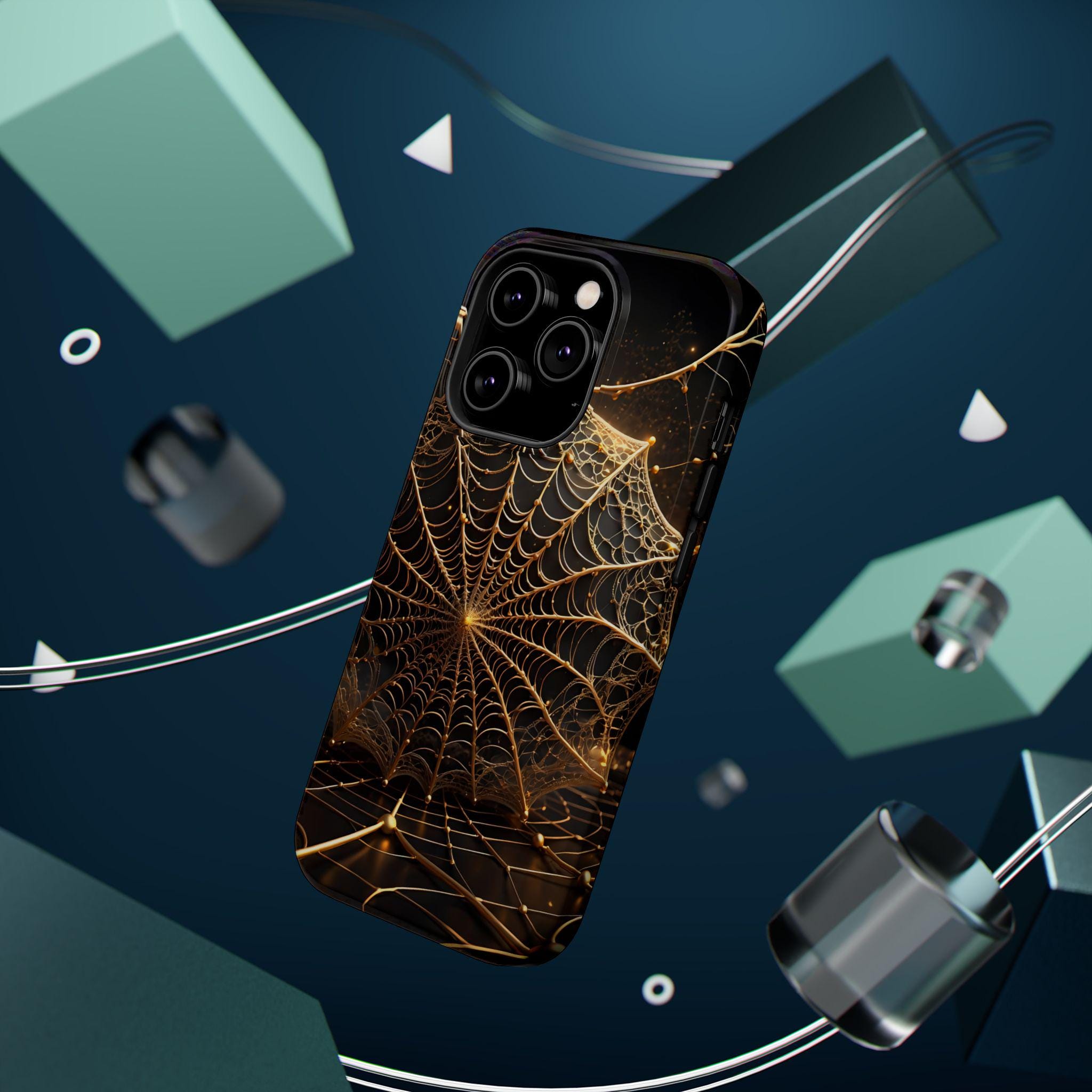 This magnetic, impact-resistant phone case blends protective performance with a moody, intricate design. The deep black background and shimmering gold web pattern catch light like a city at night, giving the case an artful, slightly mysterious feel. Built with a rigid polycarbonate shell and a cushioned TPU liner, it absorbs shocks and shields edges without adding bulk. The embedded magnet ring keeps MagSafe® accessories aligned for easier charging and attachments. Choose glossy for a reflective, jewel-like finish or matte for a satin, low-glare look. Lightweight and durable, this case slips into daily life — from late-night walks to crowded commutes — while reflecting a taste for craftsmanship and subtle drama.