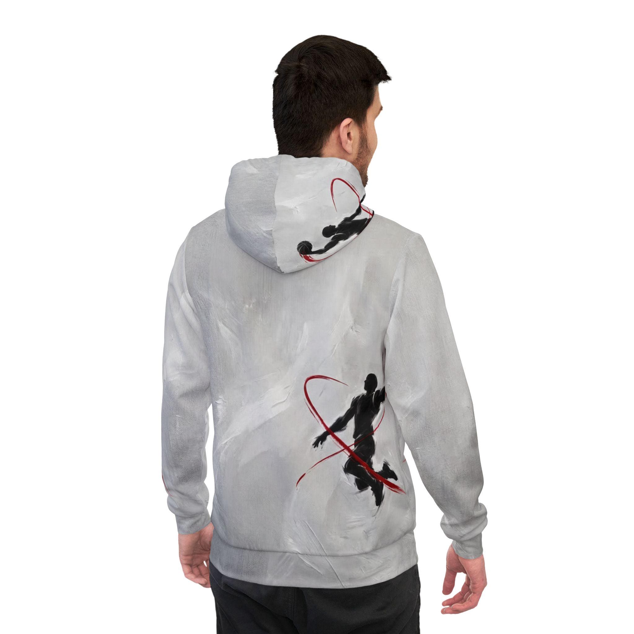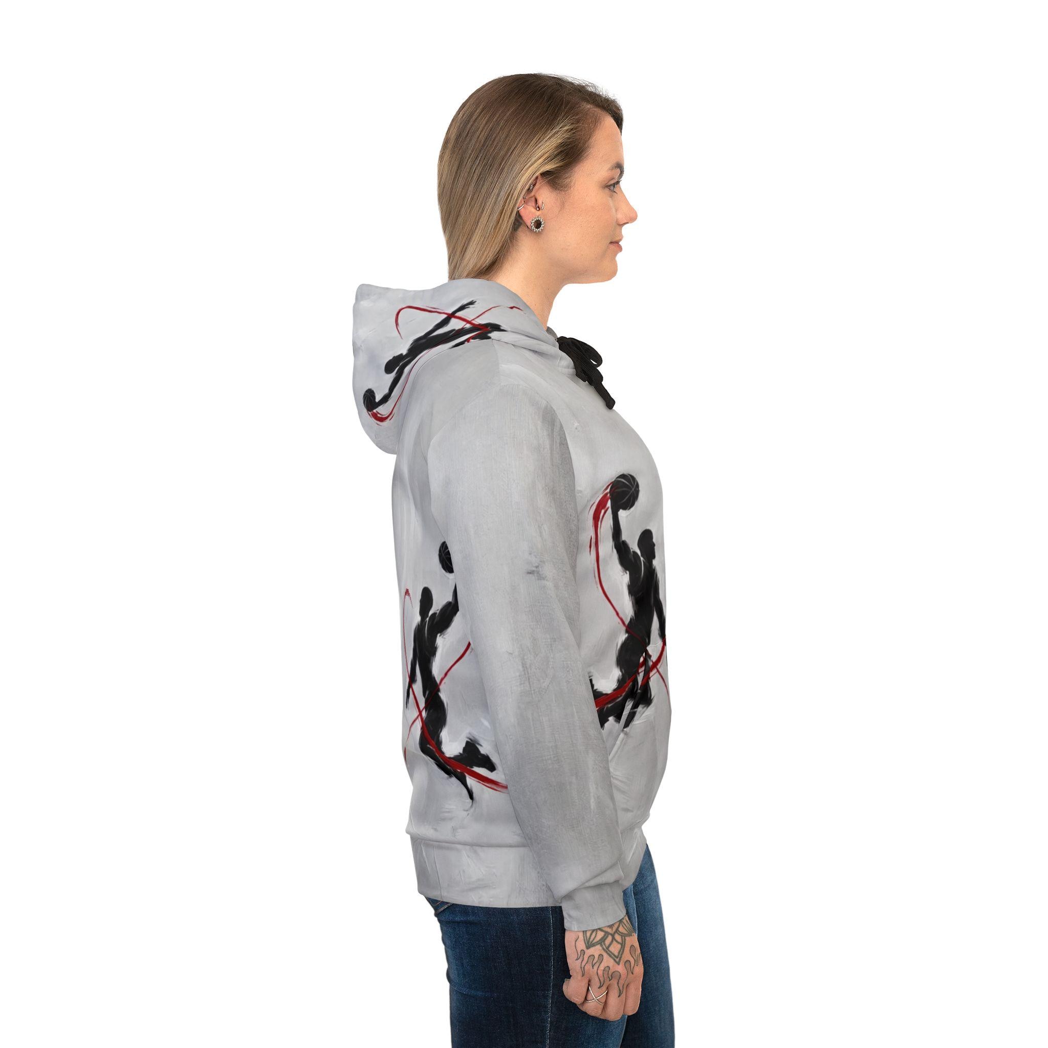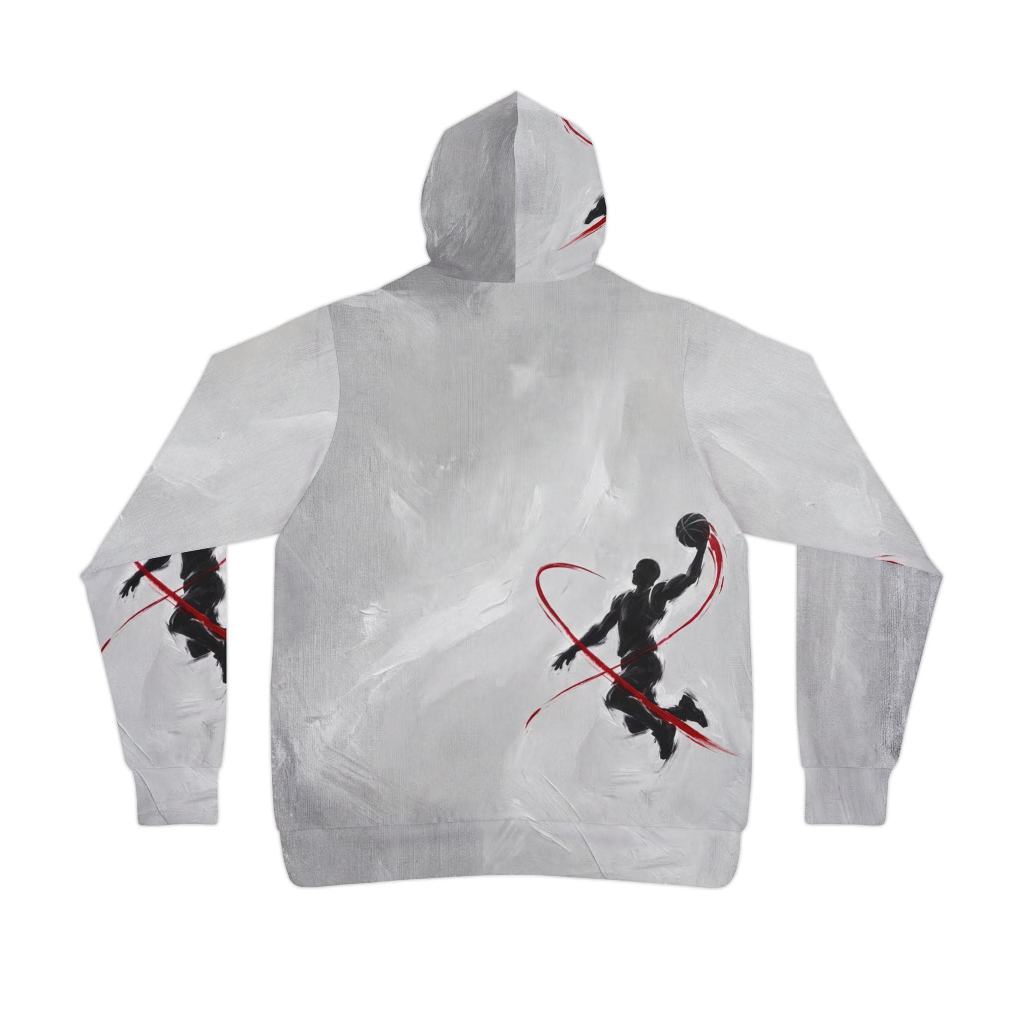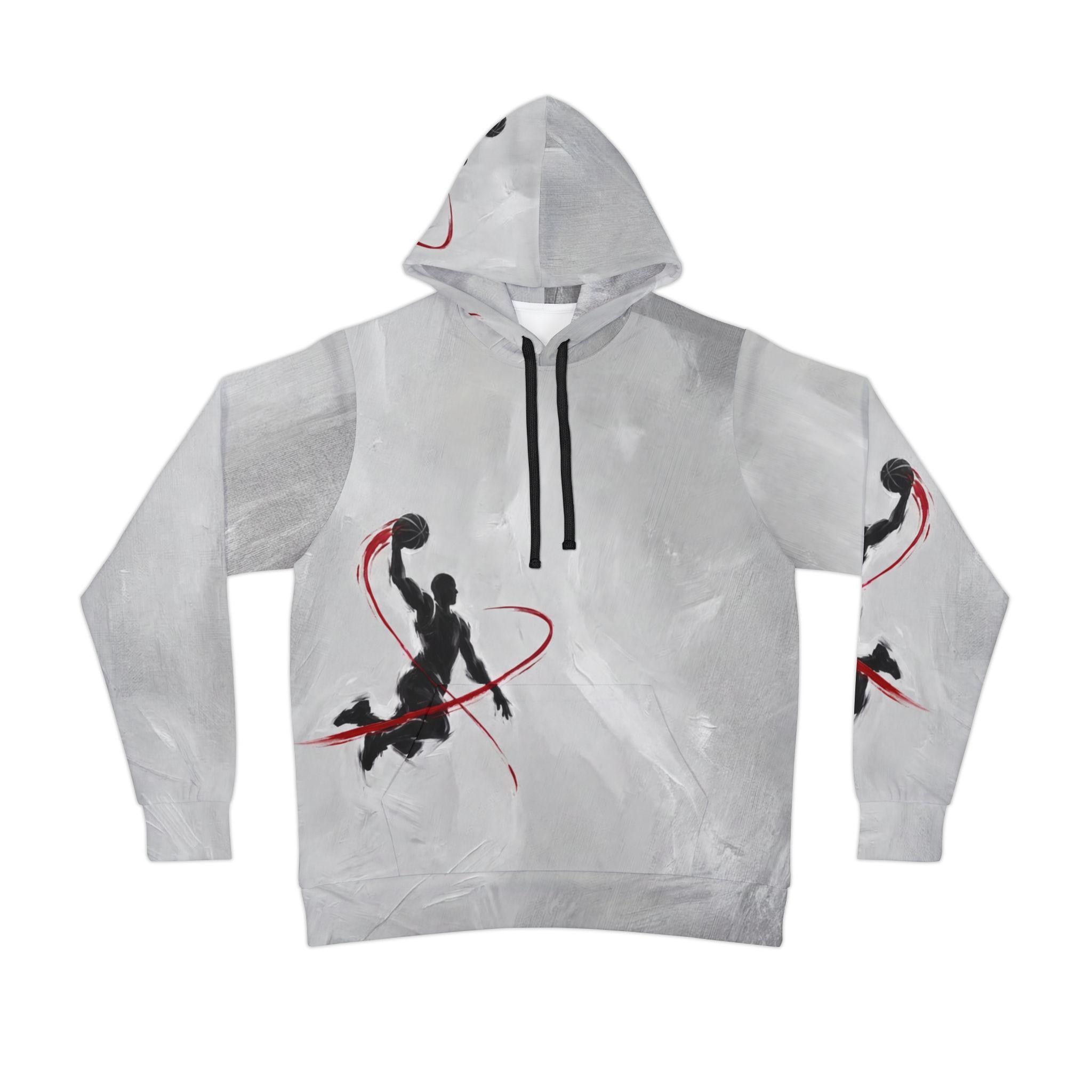 Lightweight athletic hoodie with an urban-sport vibe. A soft, slightly stretchy knit drapes easily during warmups or streetwear days, while the subtle smoky gray background keeps the bold silhouette artwork the focal point. The dynamic, mid-air basketball figure and swooping red trail bring motion to every angle—on the chest, sleeves, and back—so the hoodie reads like a continuous action scene. The adjustable hood with black drawstrings and clean, matched seams give it a finished, purposeful look. Wear it for early-morning drills, pick-up games, or layered over a tee when the evening cools; it moves with you and keeps the energy of the court close at hand.